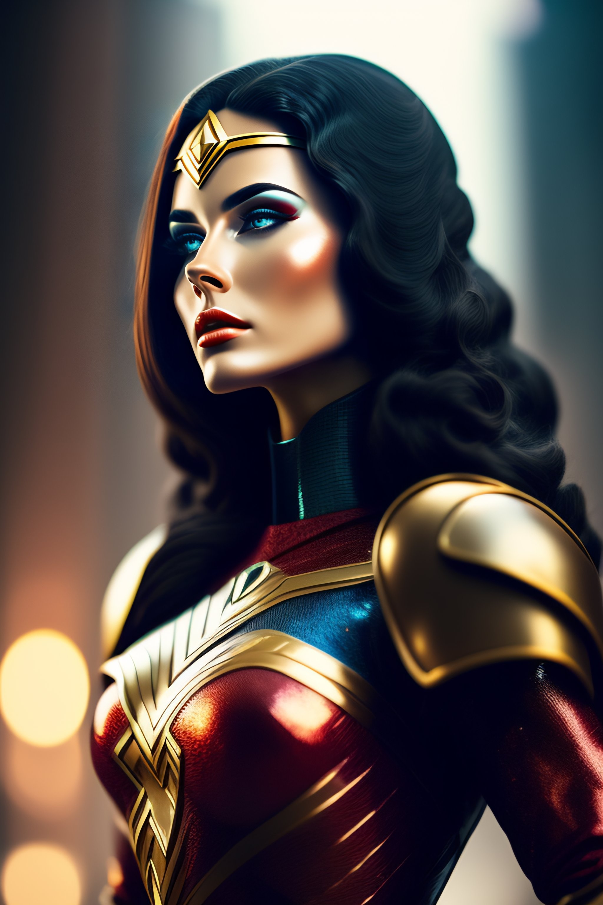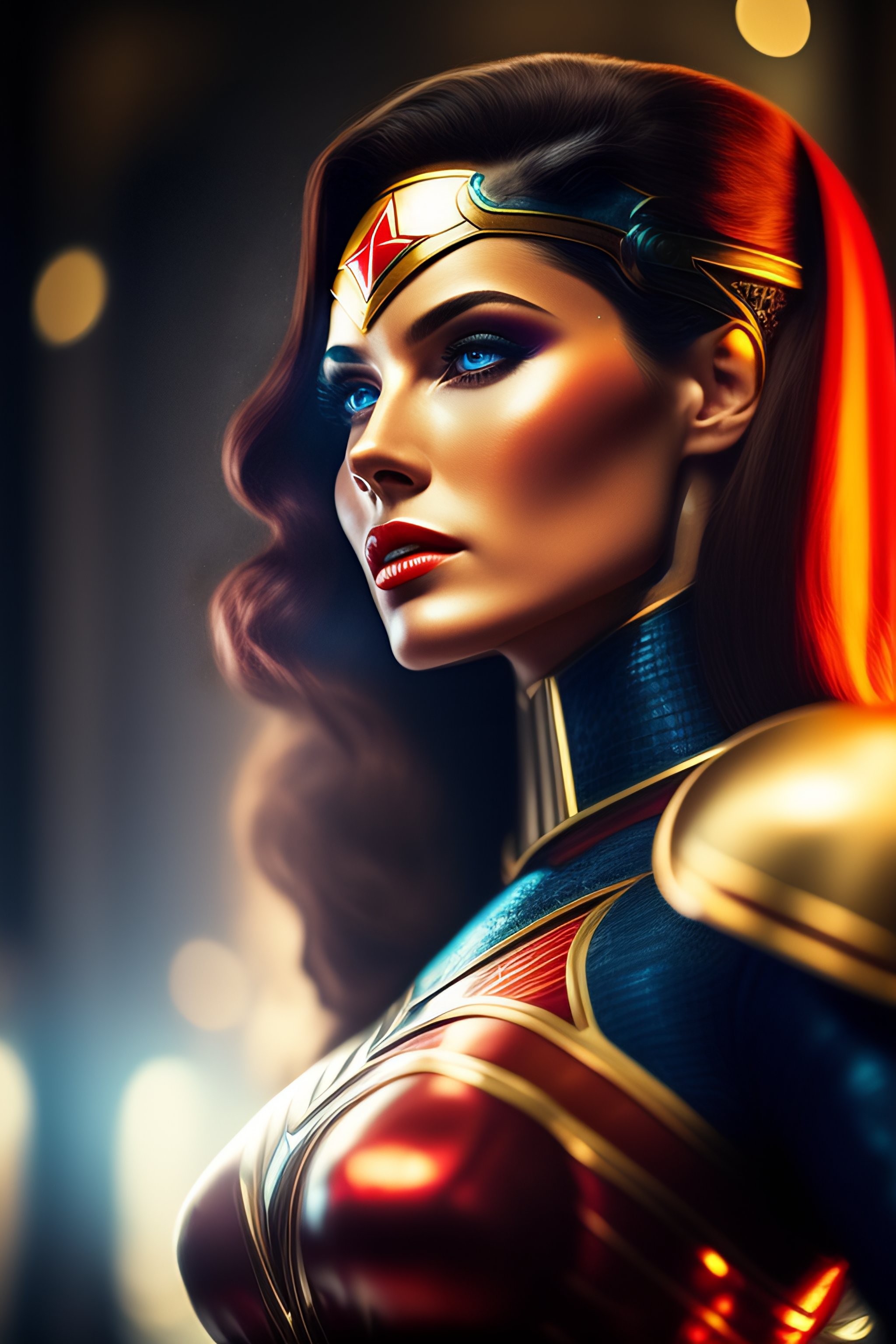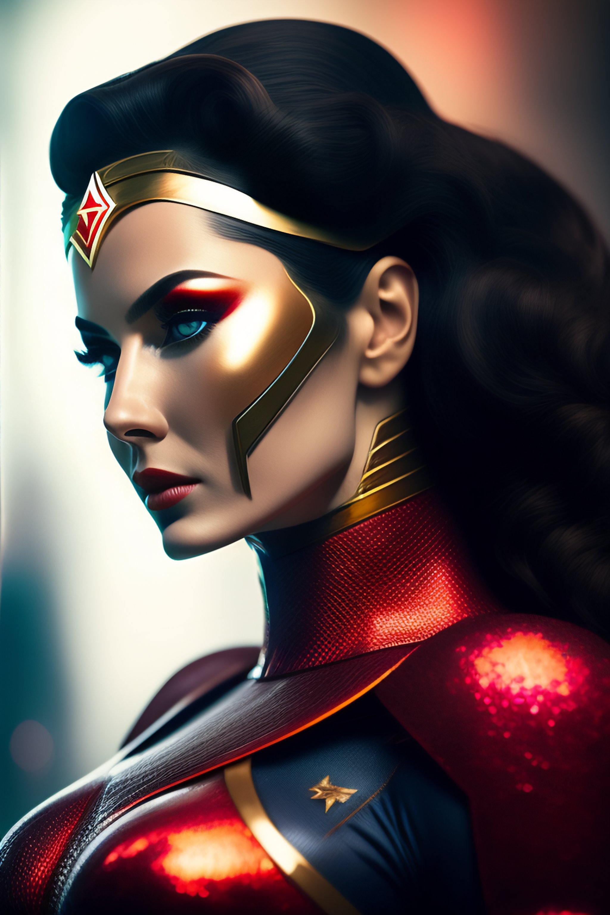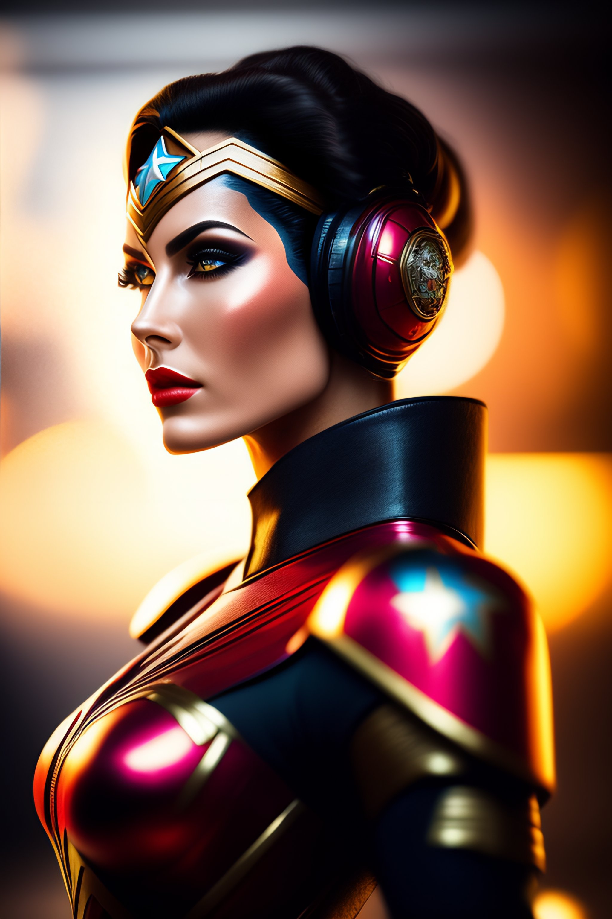 Soviet wonder woman techno magic robot, side portrait, realistic, half body shot, sharp focus, elegant