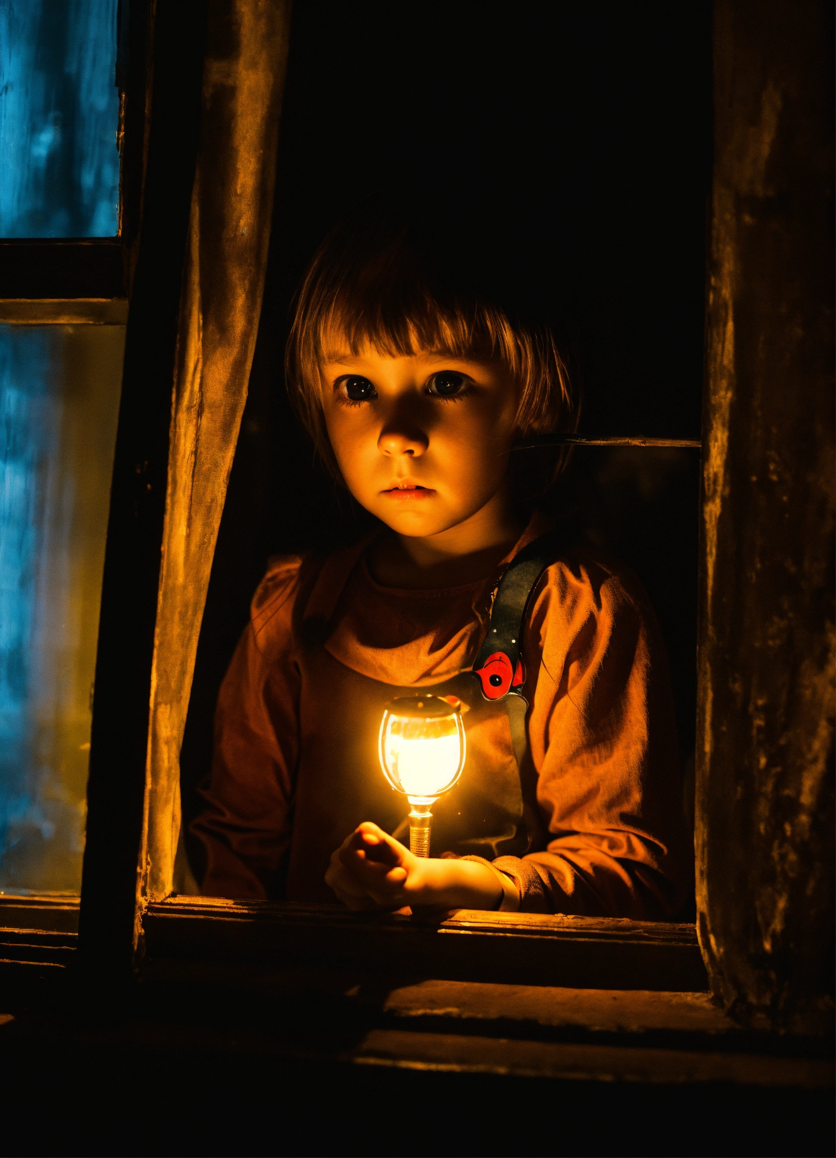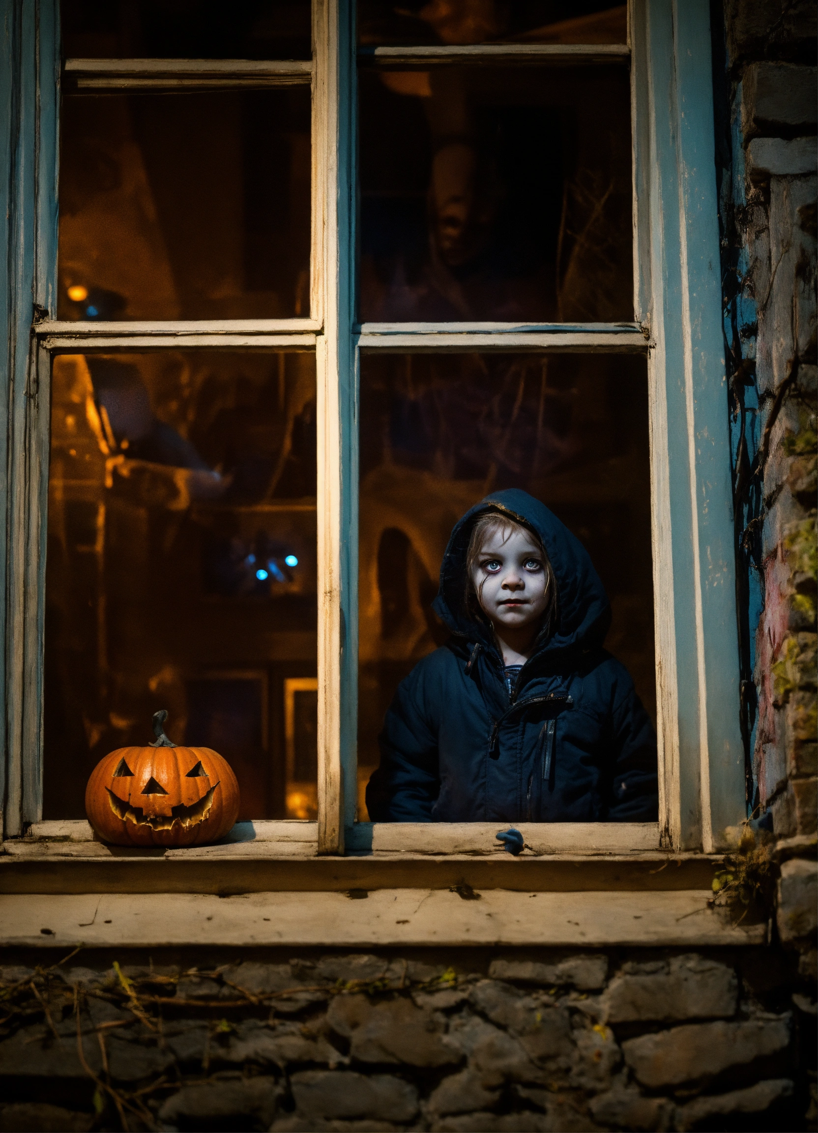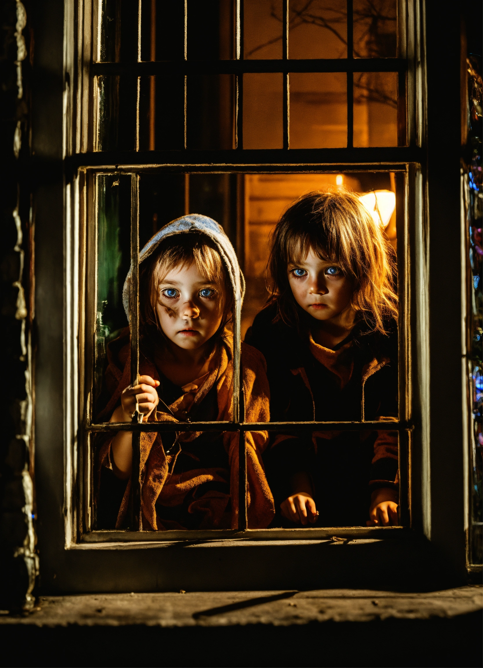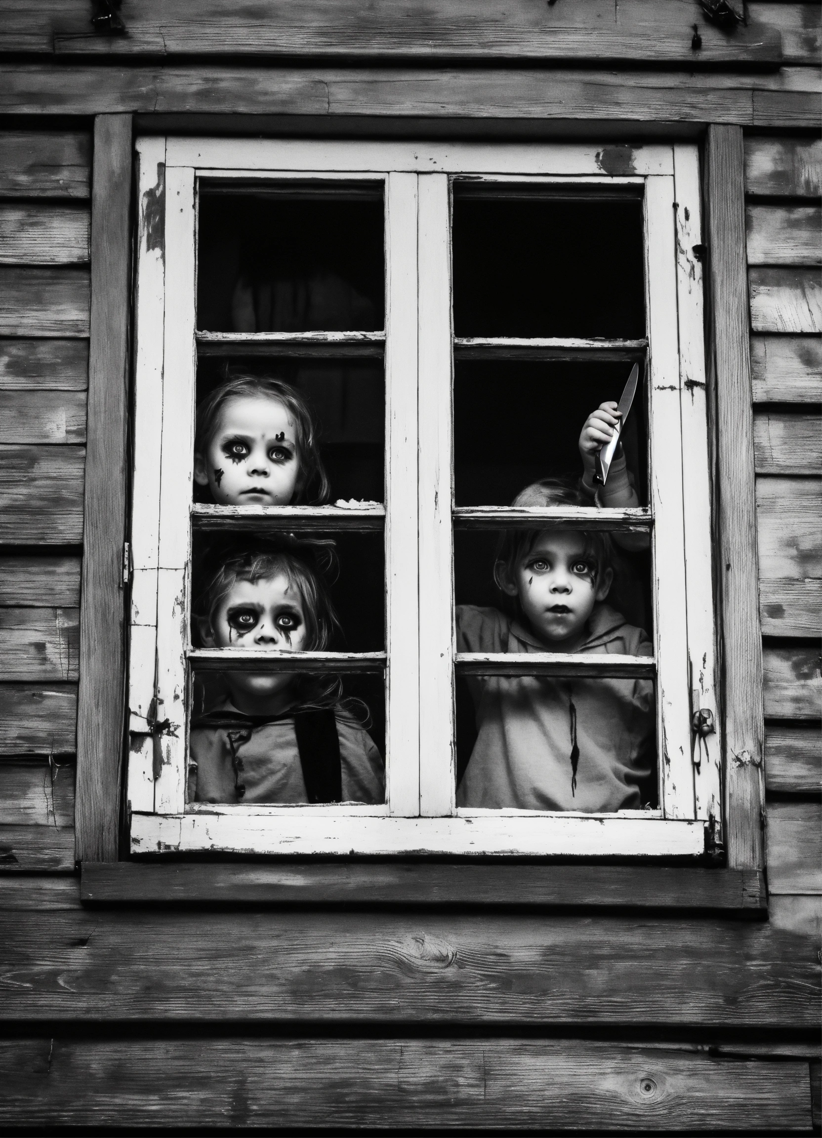 Scary black-eyed childrens from urban legends night whith knife looking in window