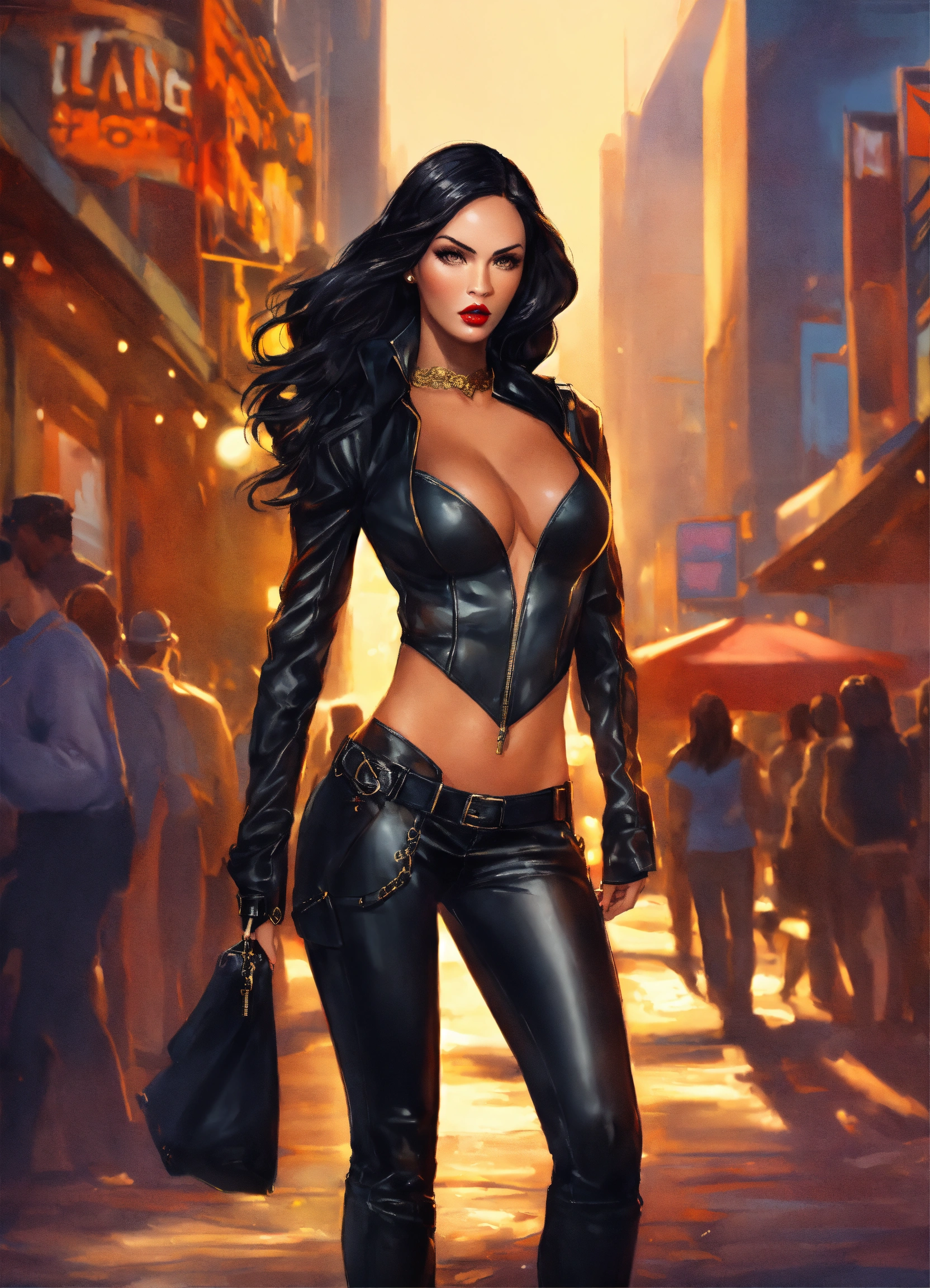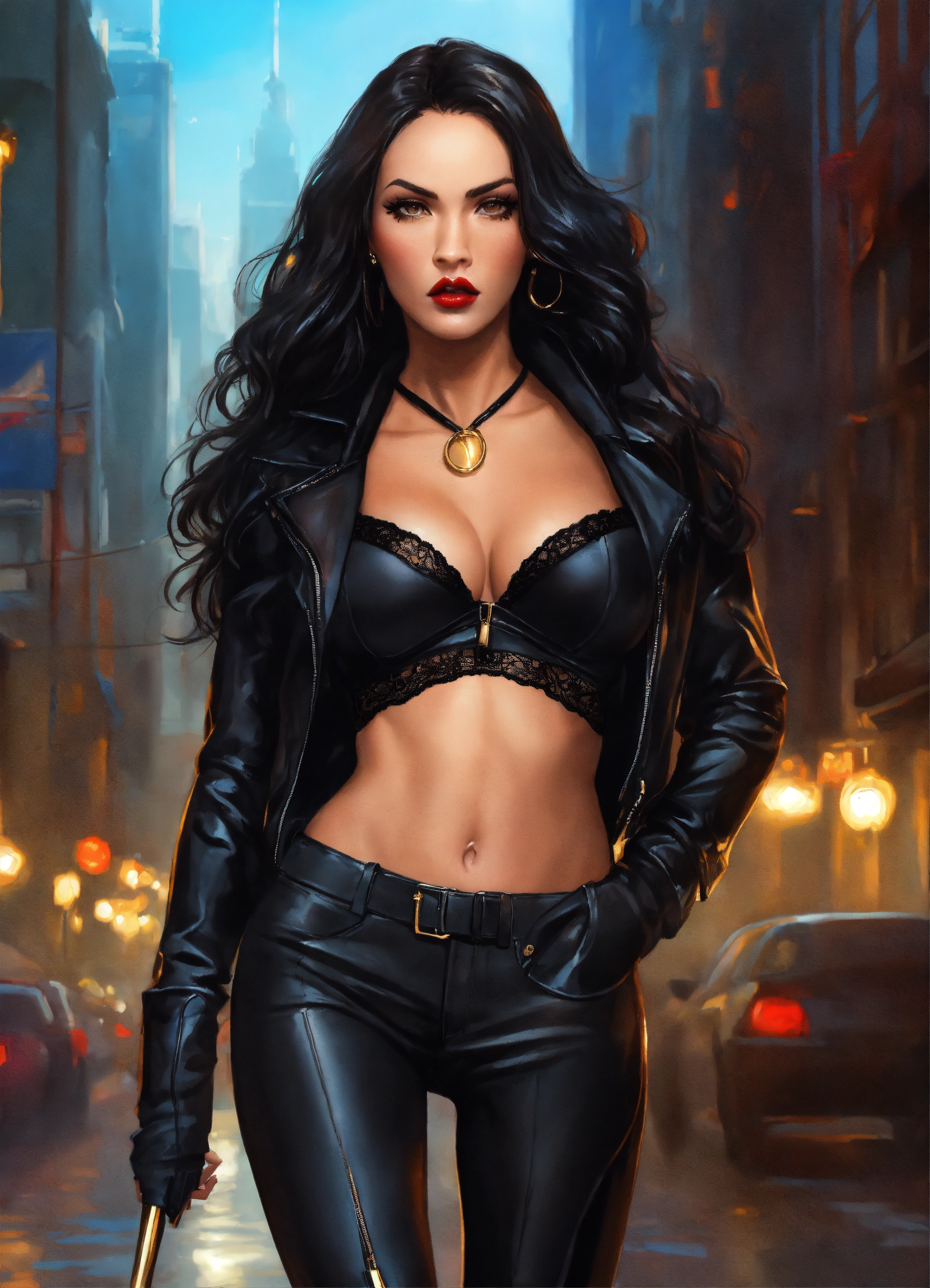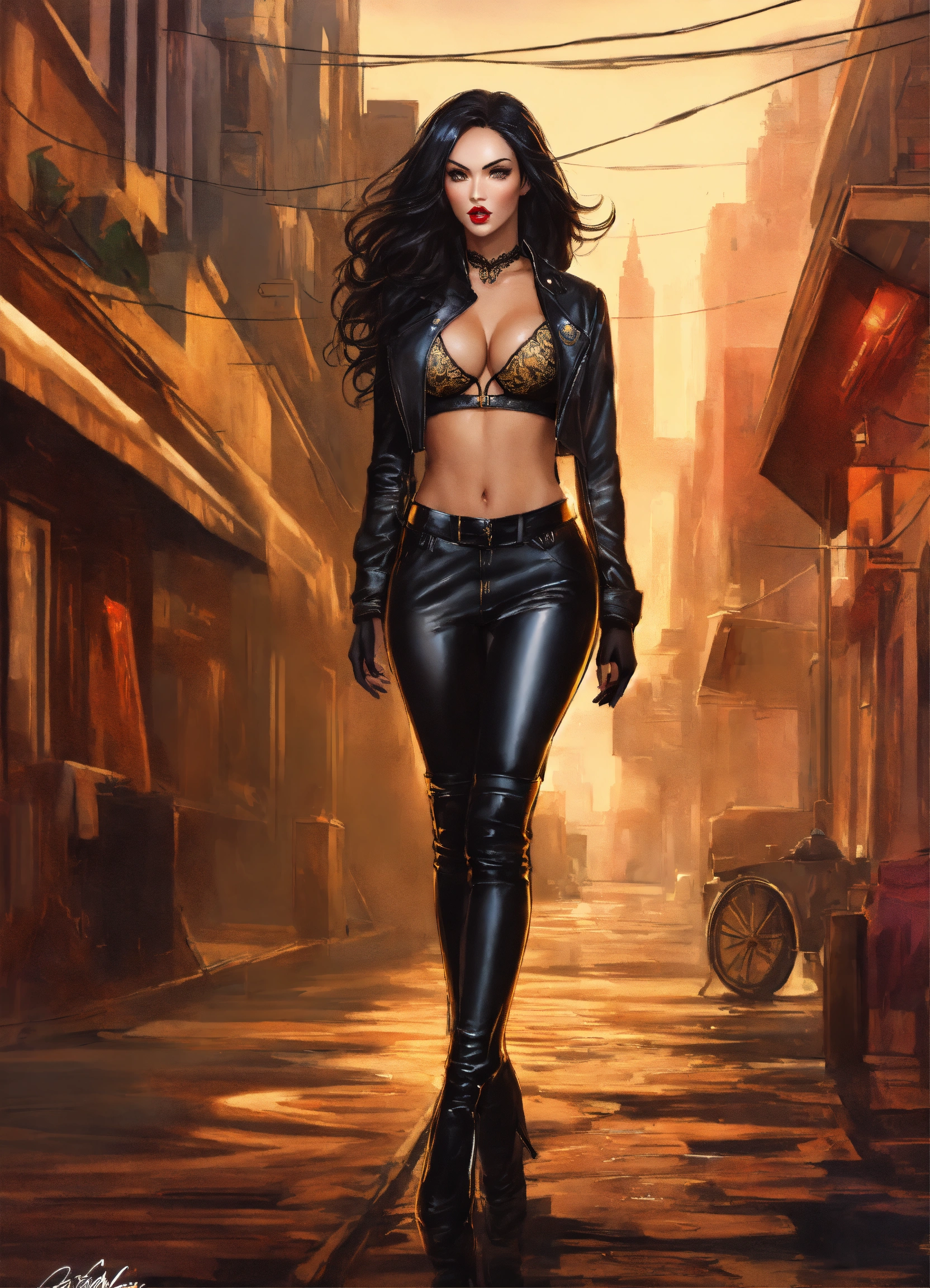 Concept art of beautiful woman, megan fox, tan skin, realistic, gold eyes, very long waist length long curled black hair, sabine rich, artgerm, j scott campbell, artgerm, full body, perfect body, black tight fitted leather jacket, detailed, intricate, beautiful, very low cut neckline, fitted, tight black pants, knee high black tight fitted stiletto high heel boots, round face, slim nose, long black eyelashes, red lips, perfect detailed face, realistic, cinematic, full body, low cut black lace crop top, very long loose curled hair, honey birdette, black lacy crop top, victoria secret top, attractive, lace, nightwear, yandy, black lace, honey birdette outfit, tight fitted, voluminous long flowing dark black hair, honey birdette top, bustier, tight black pants, knee high boots, city background, fitted, shimmer lace, baddie, selina kyle, honey birdette top, leather heel boots, mazikeen smith outfit, standing, walking down street