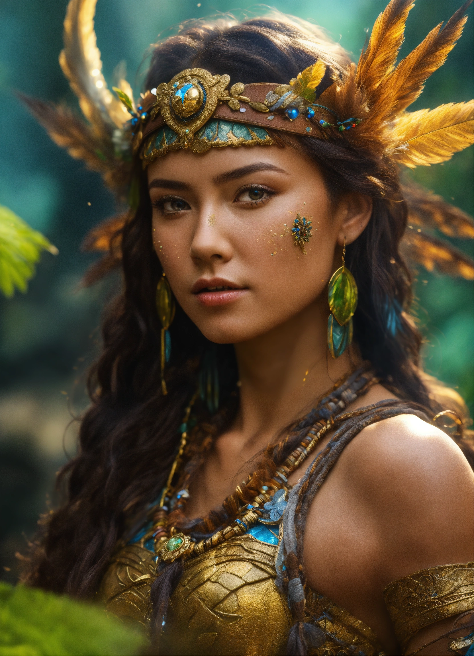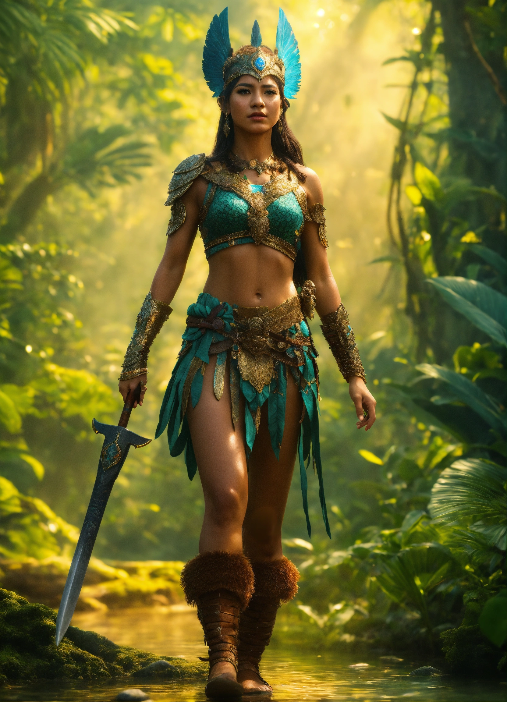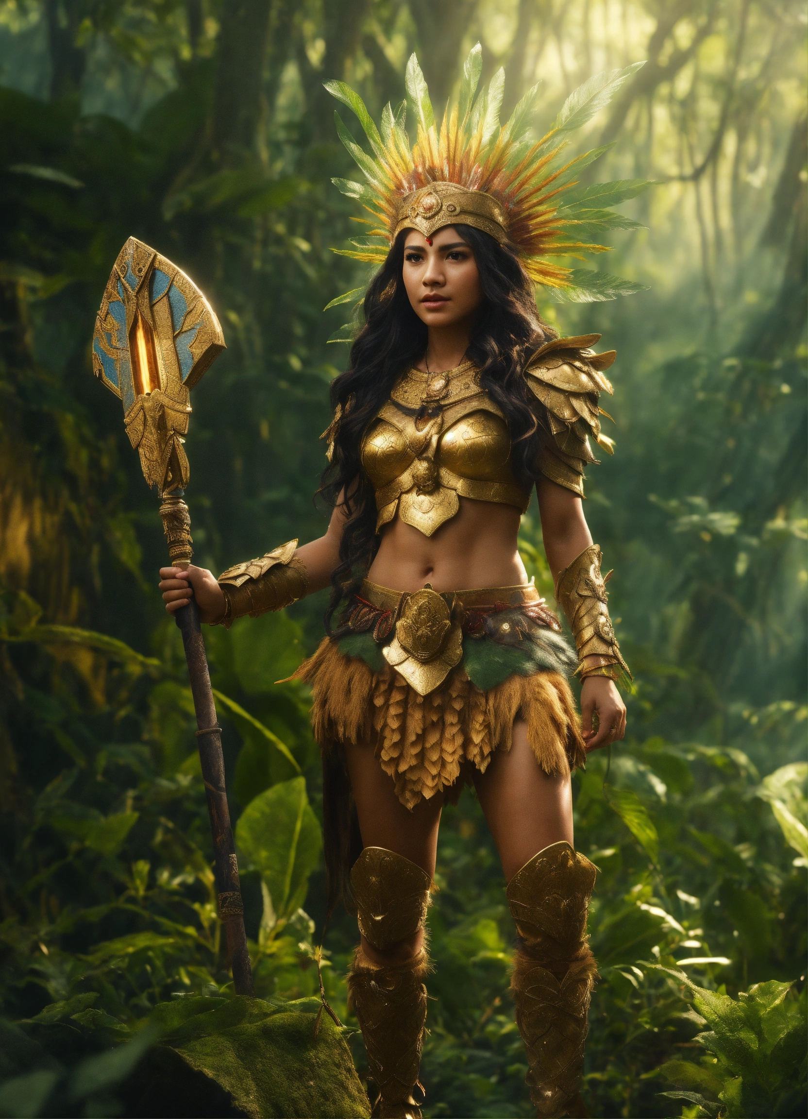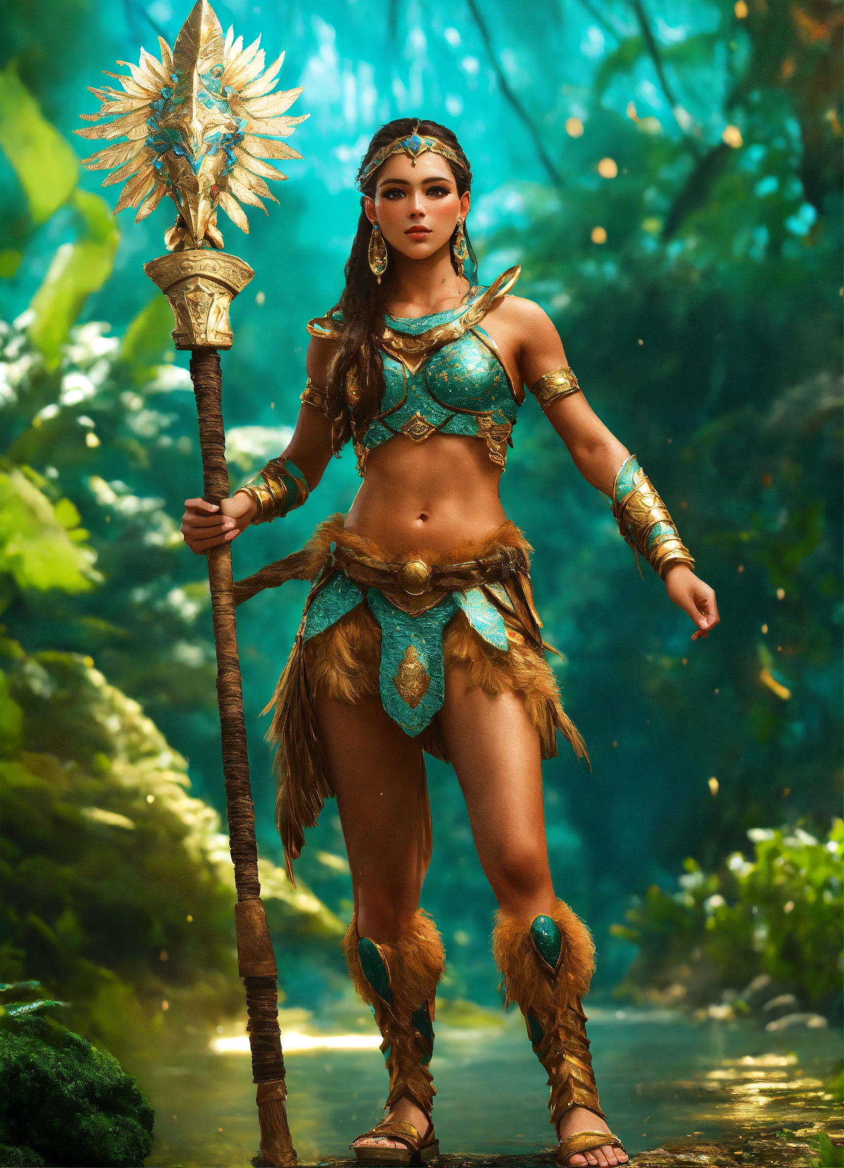 Ultra realistic beautiful amazon warrior full body in a mystical world full of little cute harry creatures perfect clarity photorealistic high definition beautiful quality 8k resolution