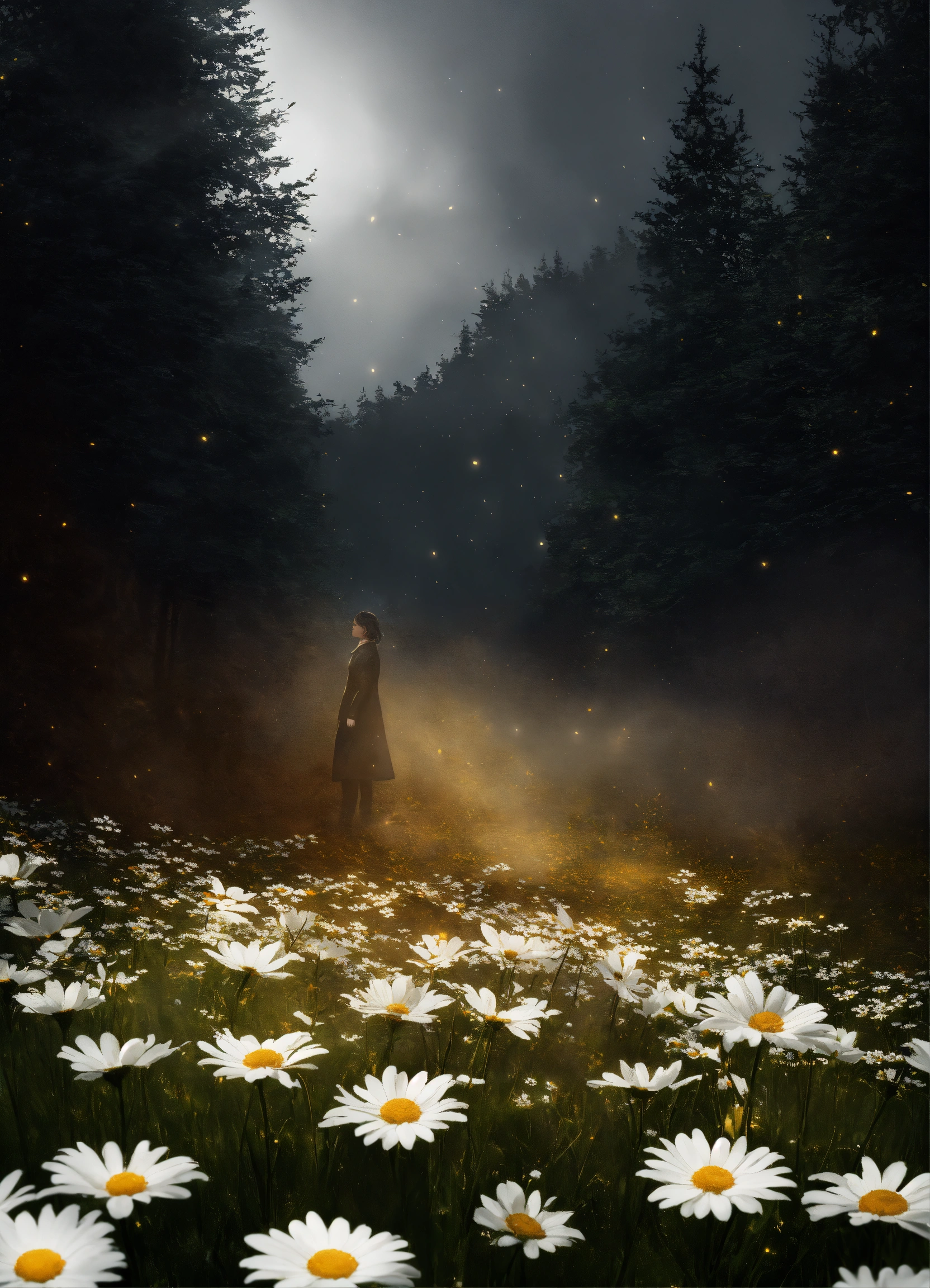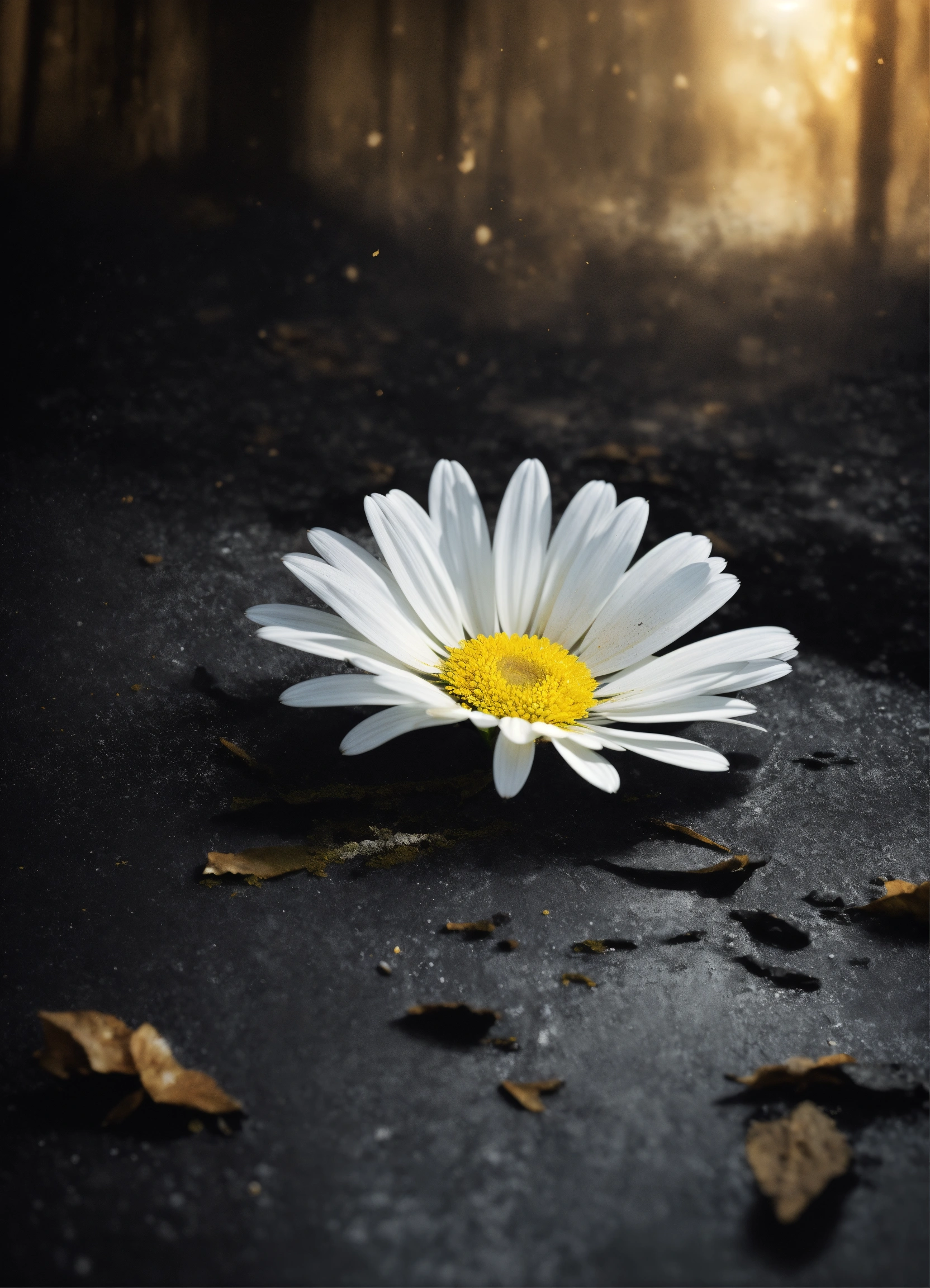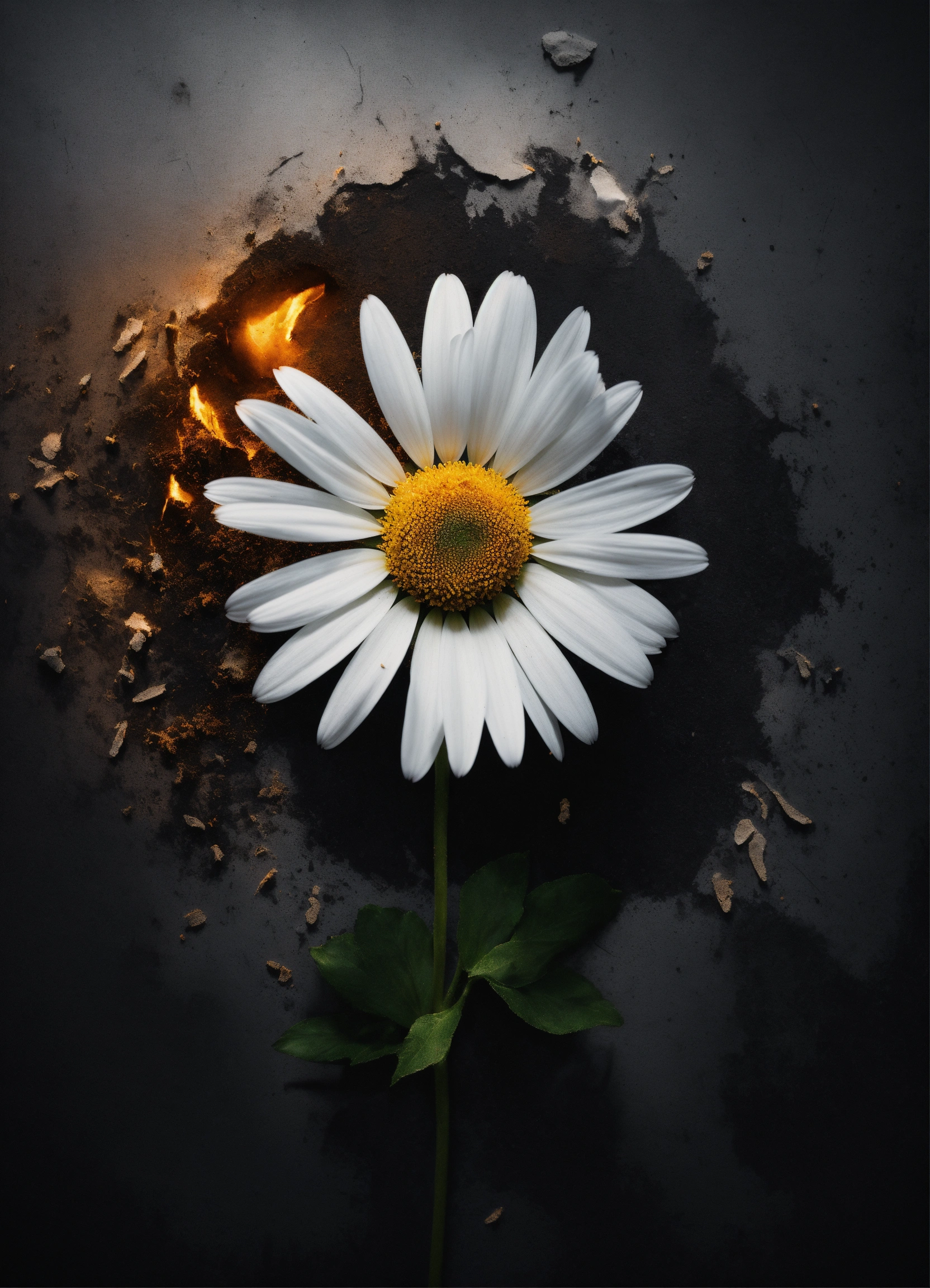 Create a captivating cover design that conveys the theme of mystery, thriller, and suspense i want the background with a white daisy covered in ash (not completely covered), black background, gray mystic, with effects, shadows, lighting, mystery, super realistic, photorealistic, photoreal, cover effect design with crack texture in the background, plain black background