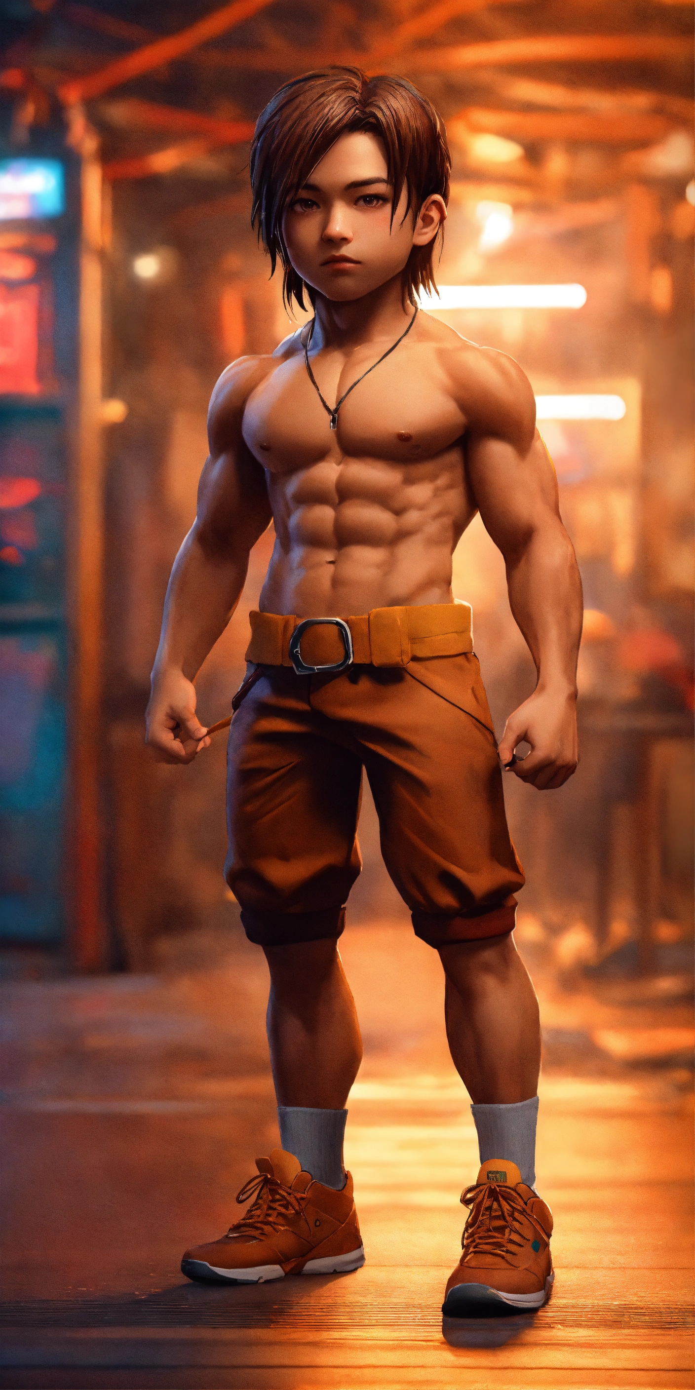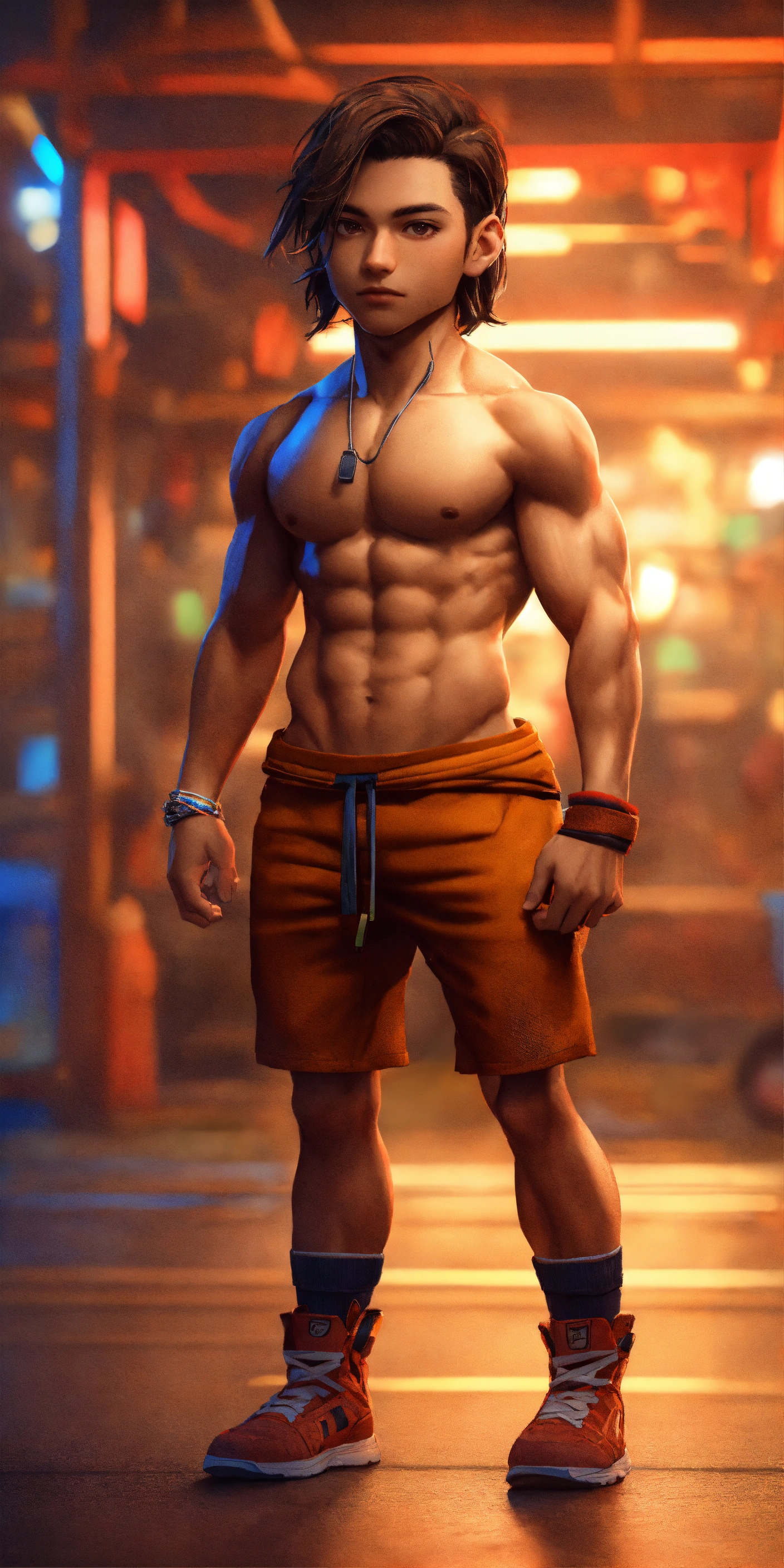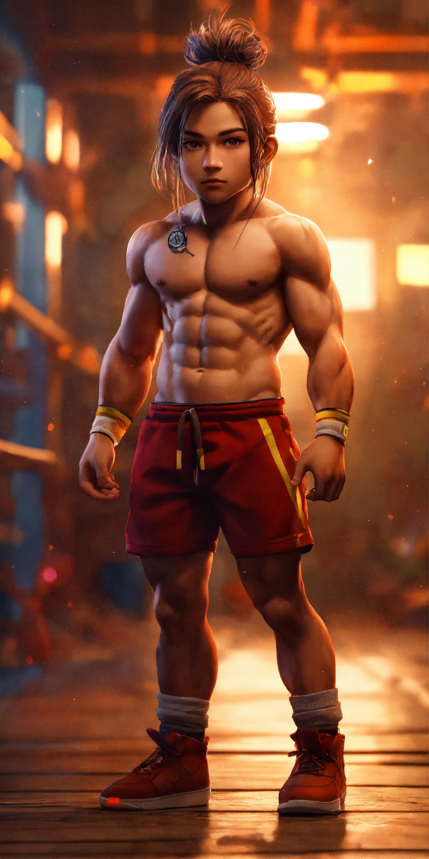 Full-body 4d photographic image without a shirt, muscular, of a cute chibi boy with very long hair, with a bun, brown hair color, realistic and vivid colors, rendered in octane, standing out on artstation, artistic photography, hyperrealistic concept art, soft, natural, and perfectly volumetric cinematic light, in ultra-high definition (uhd) with a background in a gym