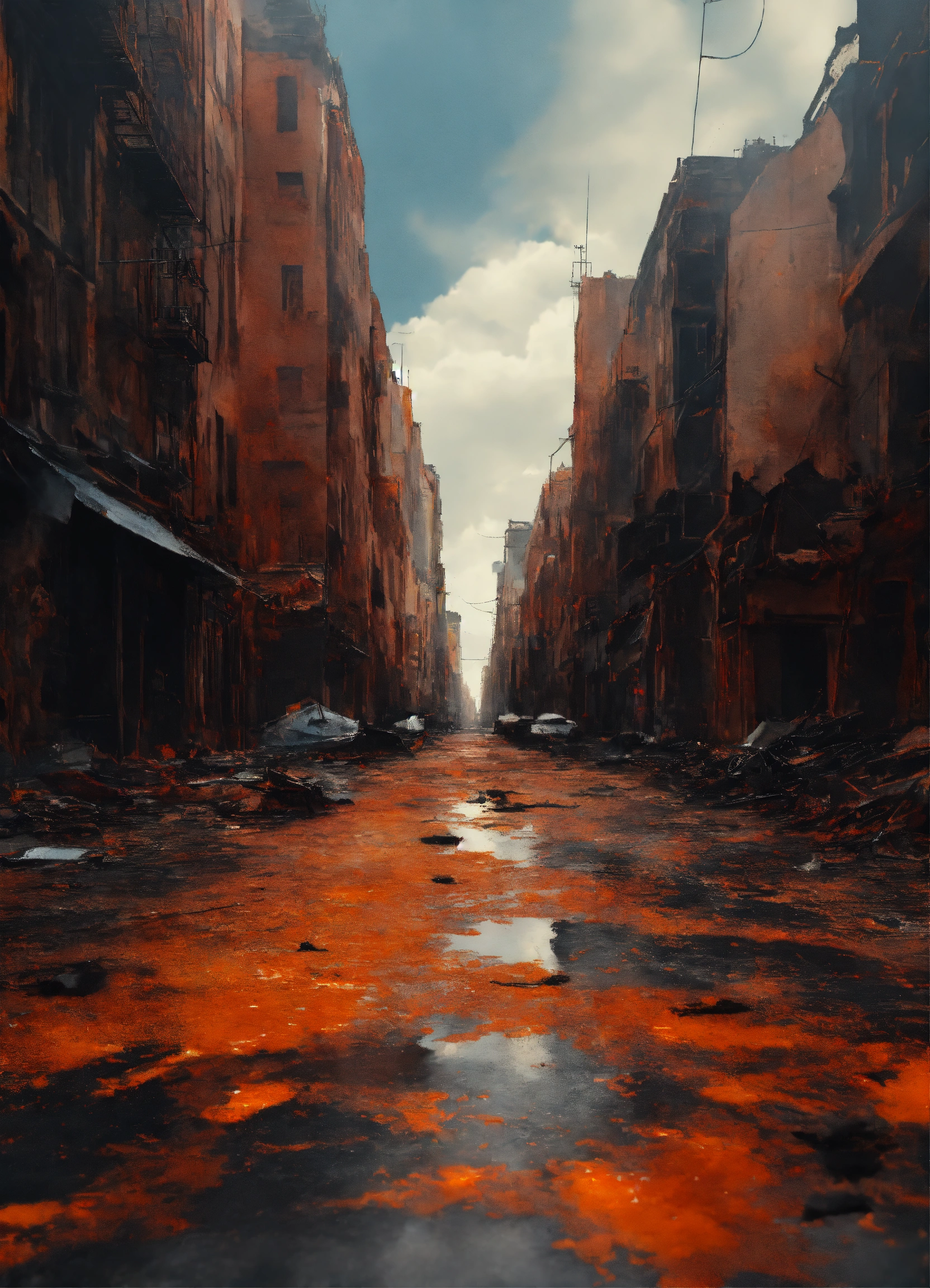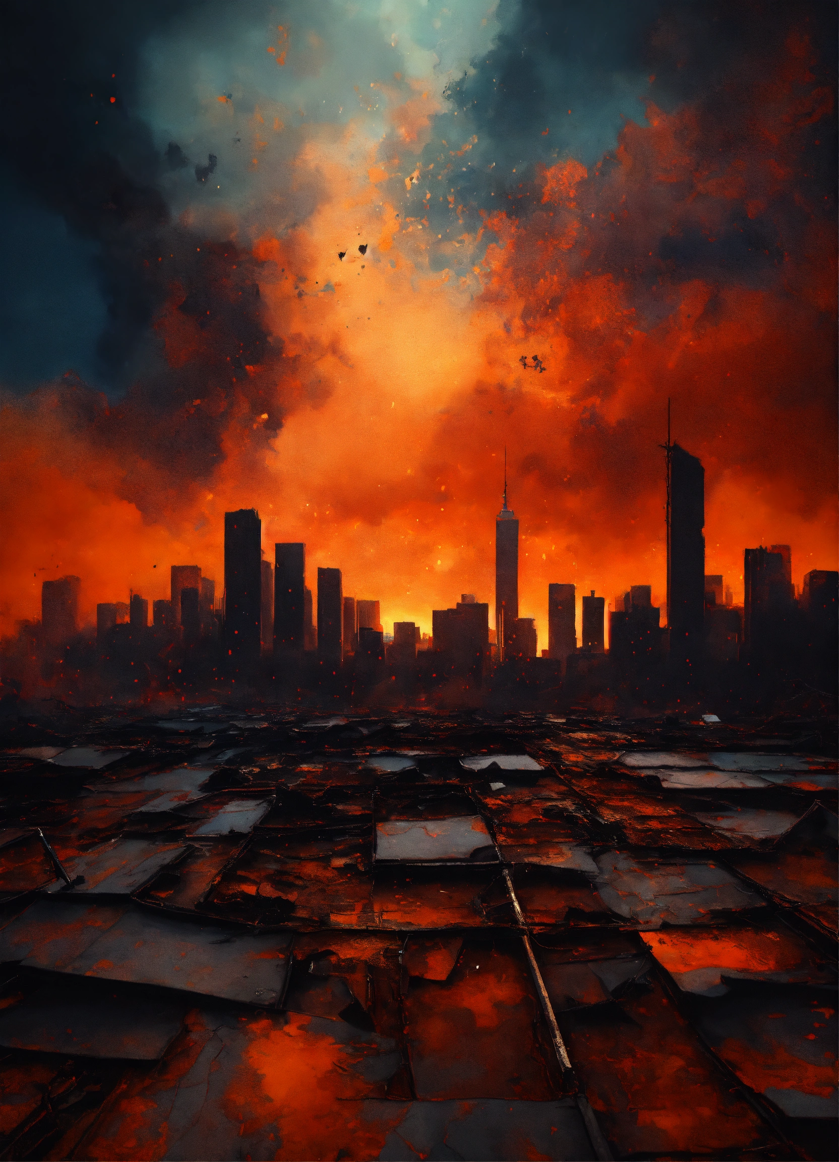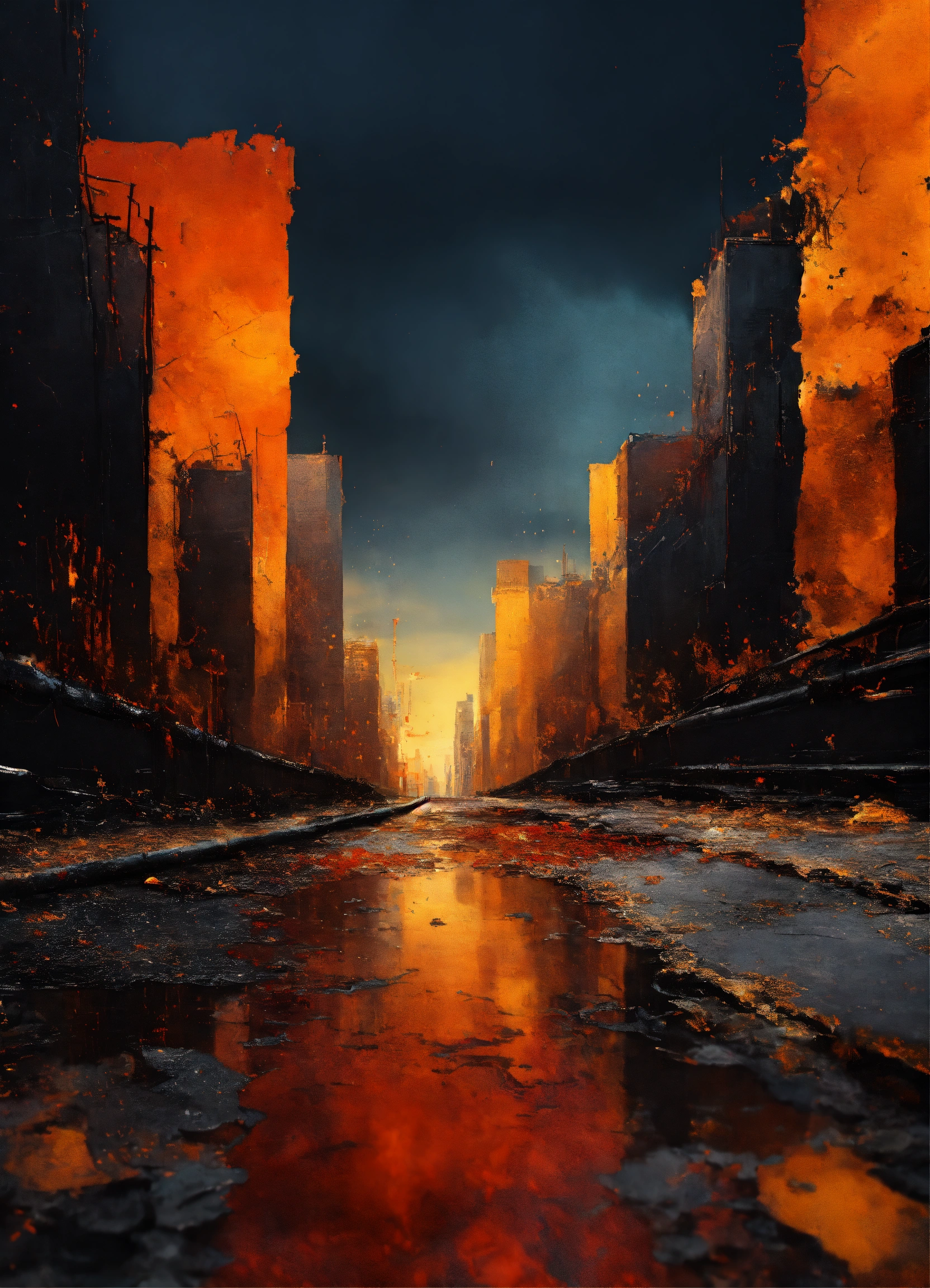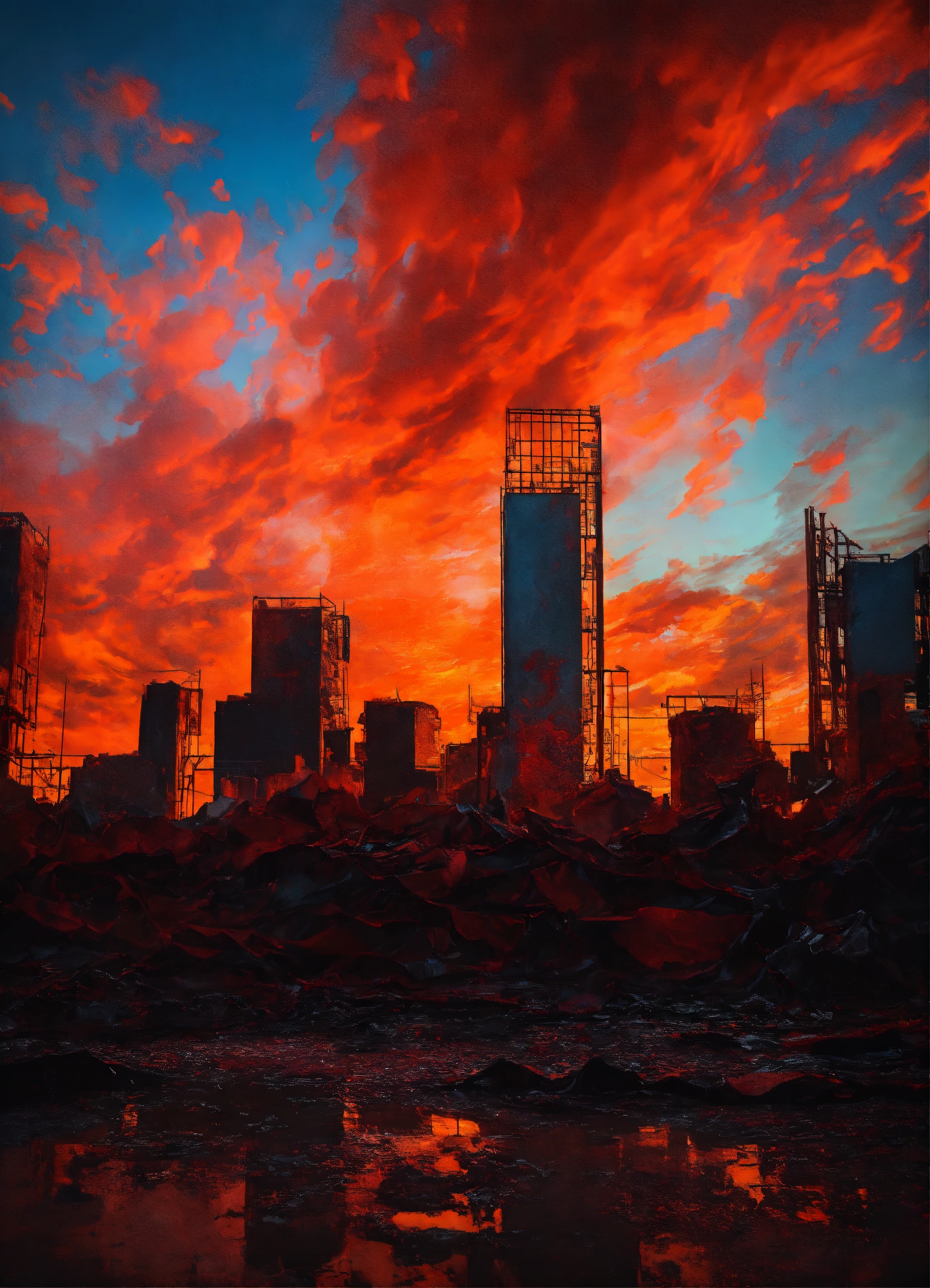 A abstract paint of a sky line of a city made by broken fabric, tomate sauce, black paint, rusted metal, fur, hd photo 4k, ultradetailed