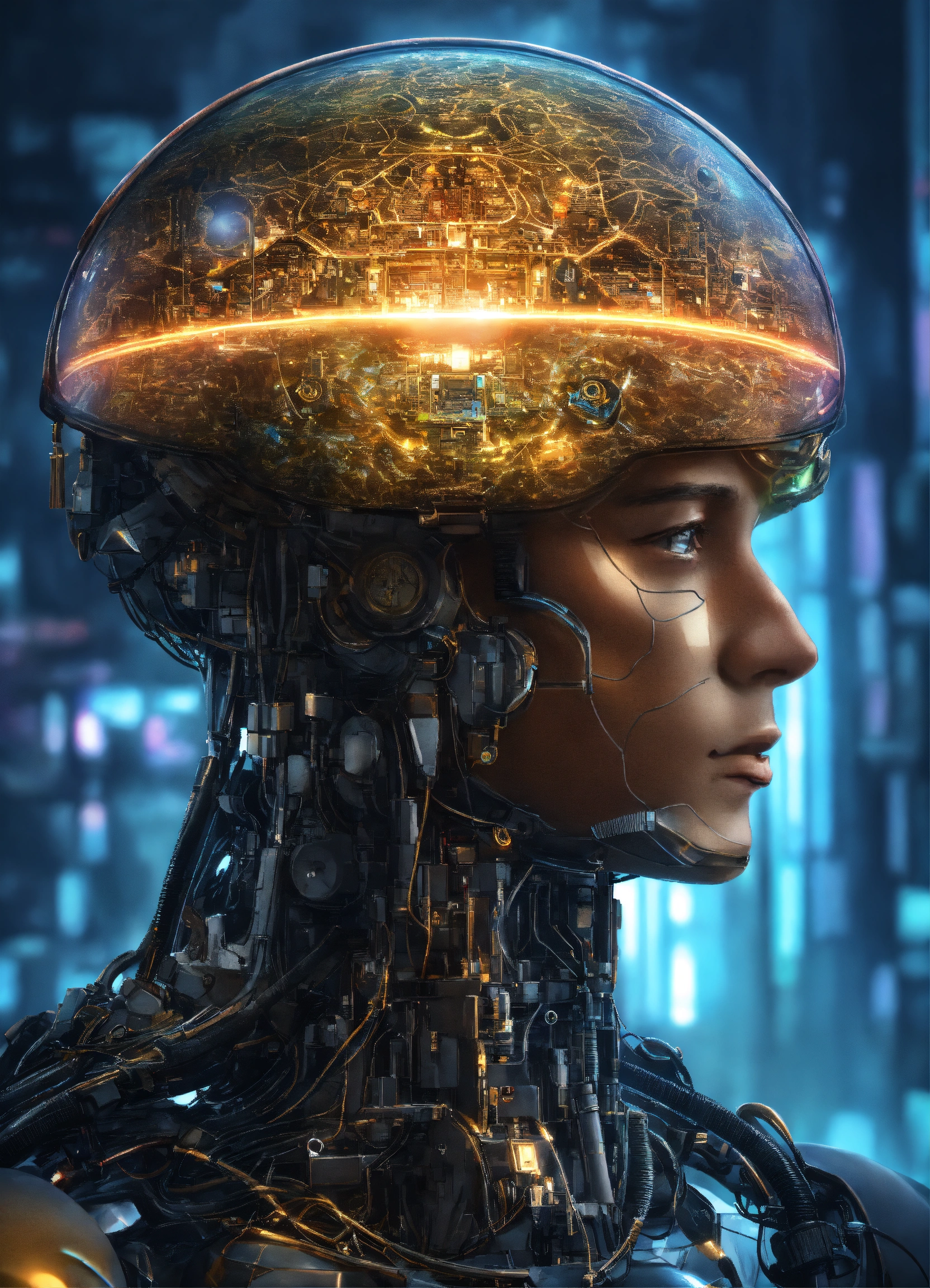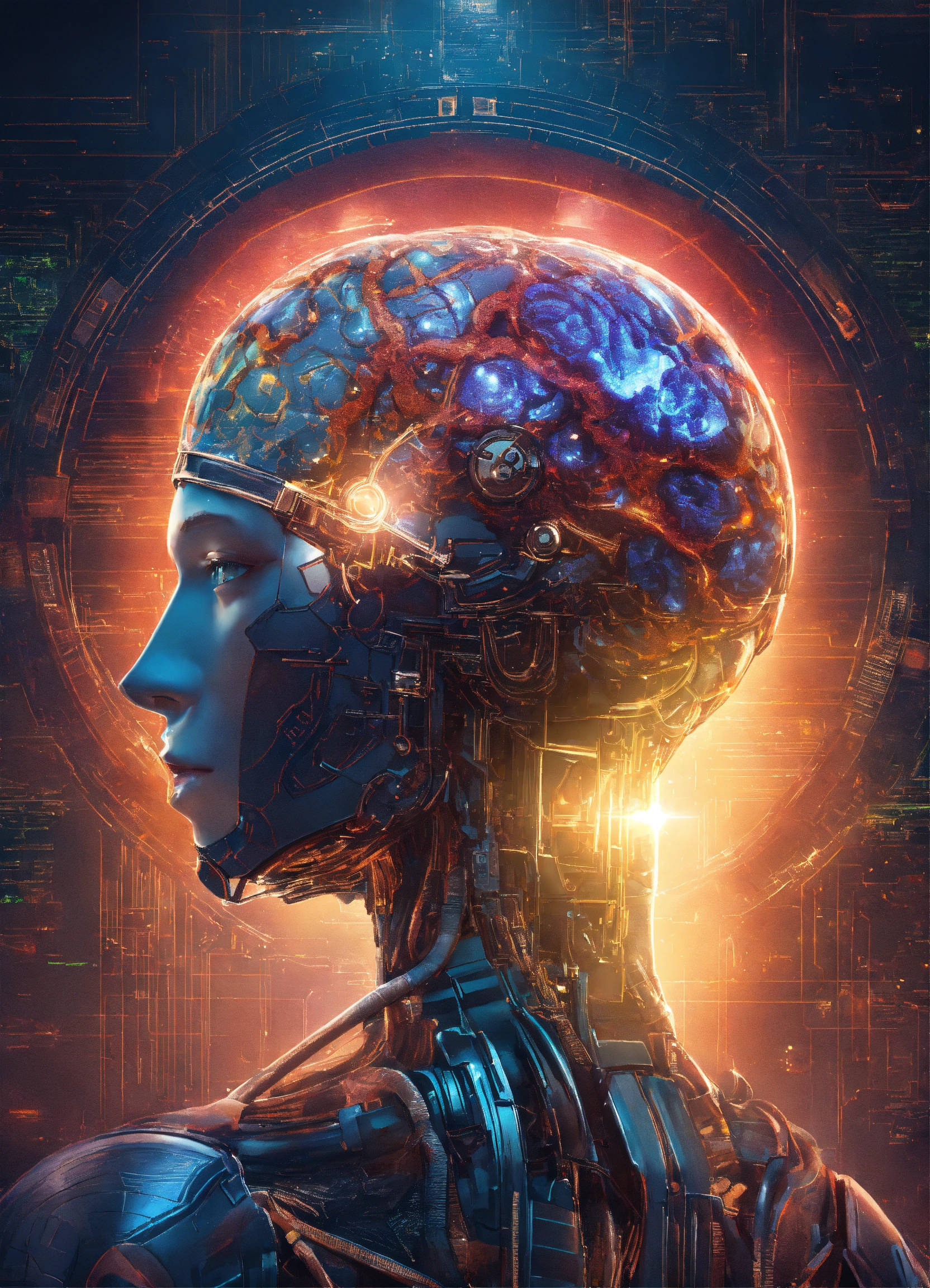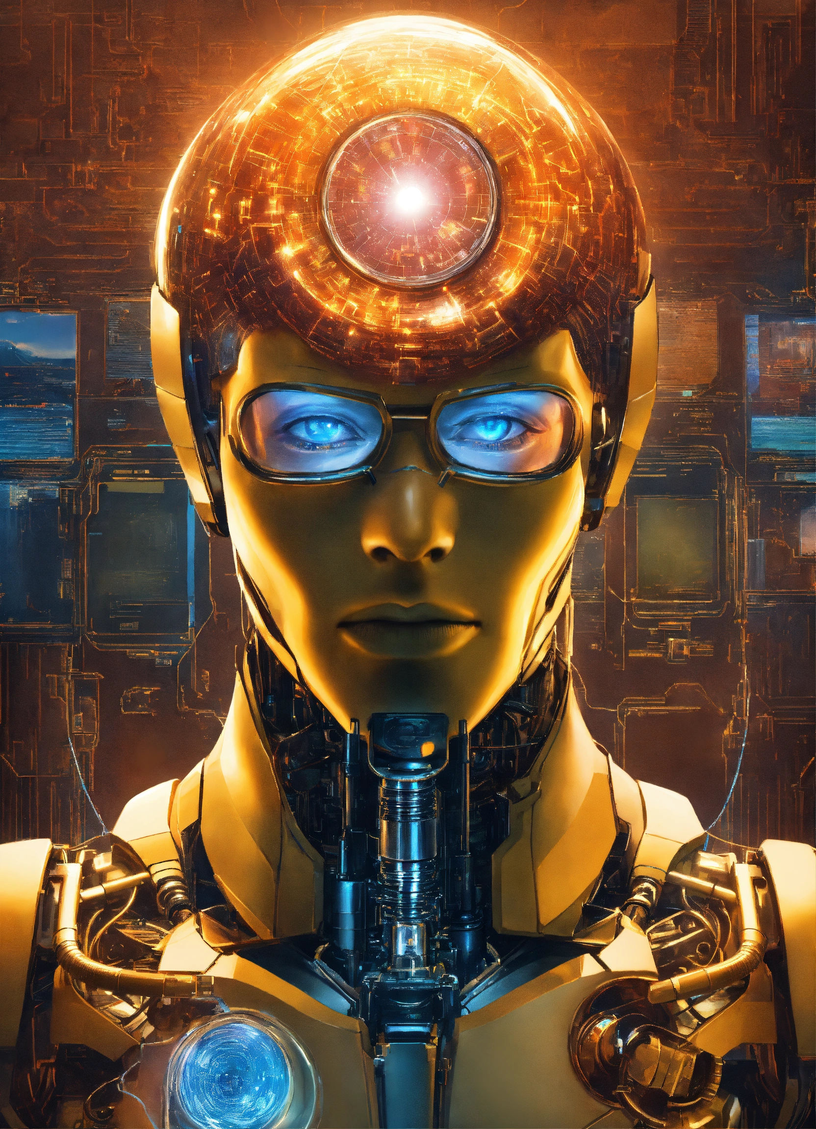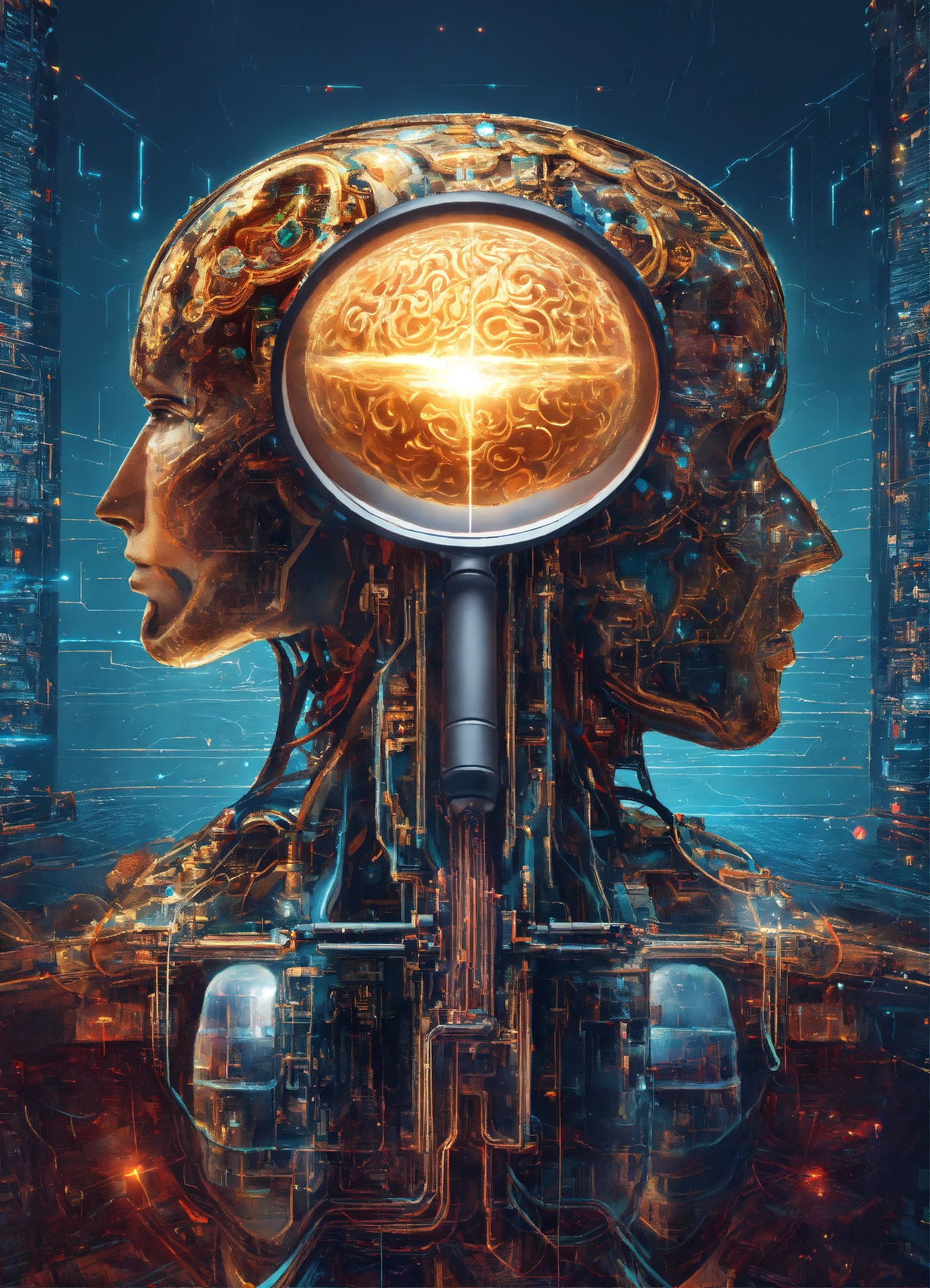 Ai omnipotent super ai mega god holding a magnifying glass above a human brain, super advanced technology, futuristic, hyper digital background, extremely detailed and realistic