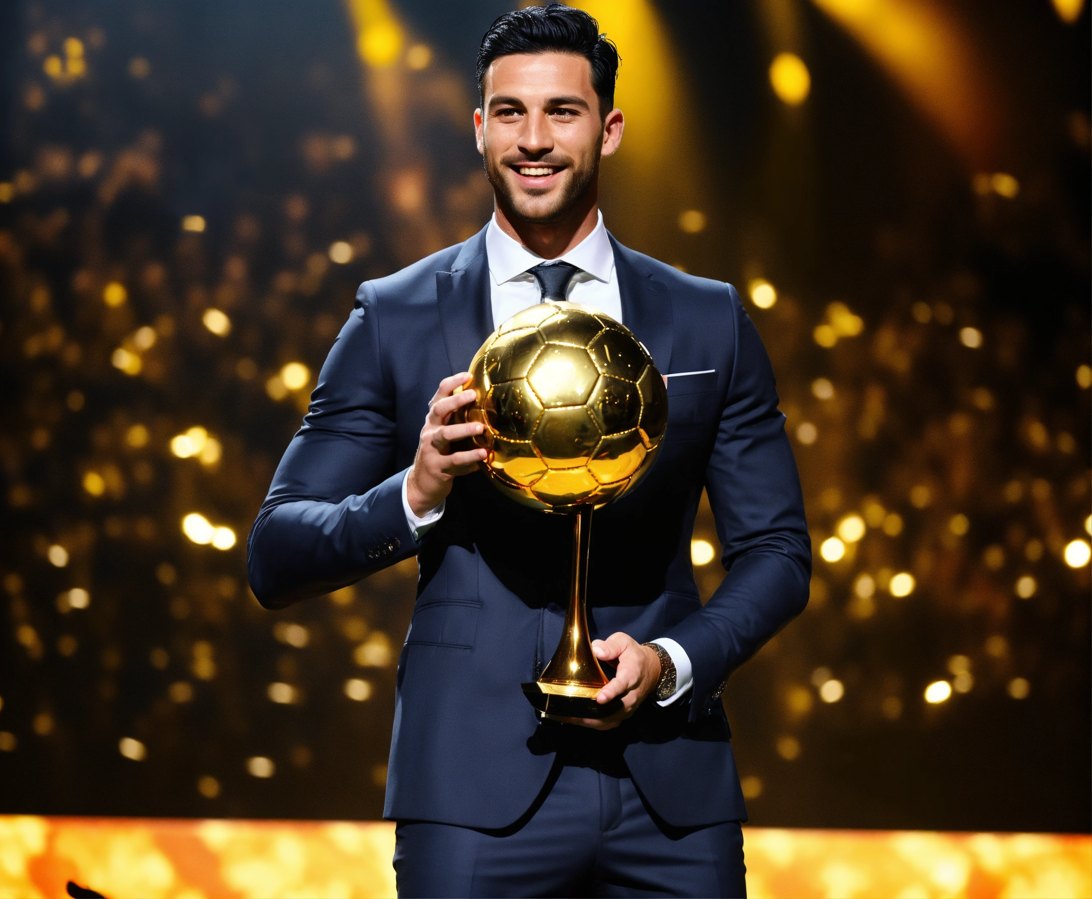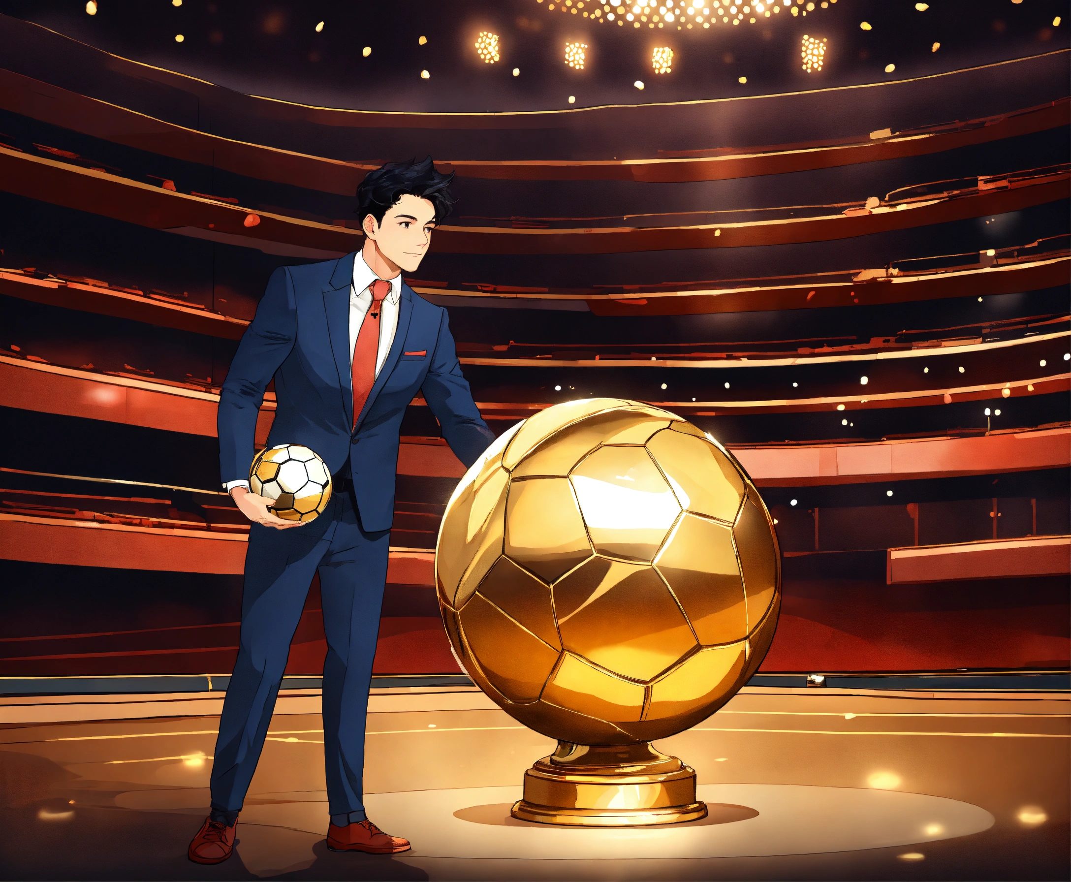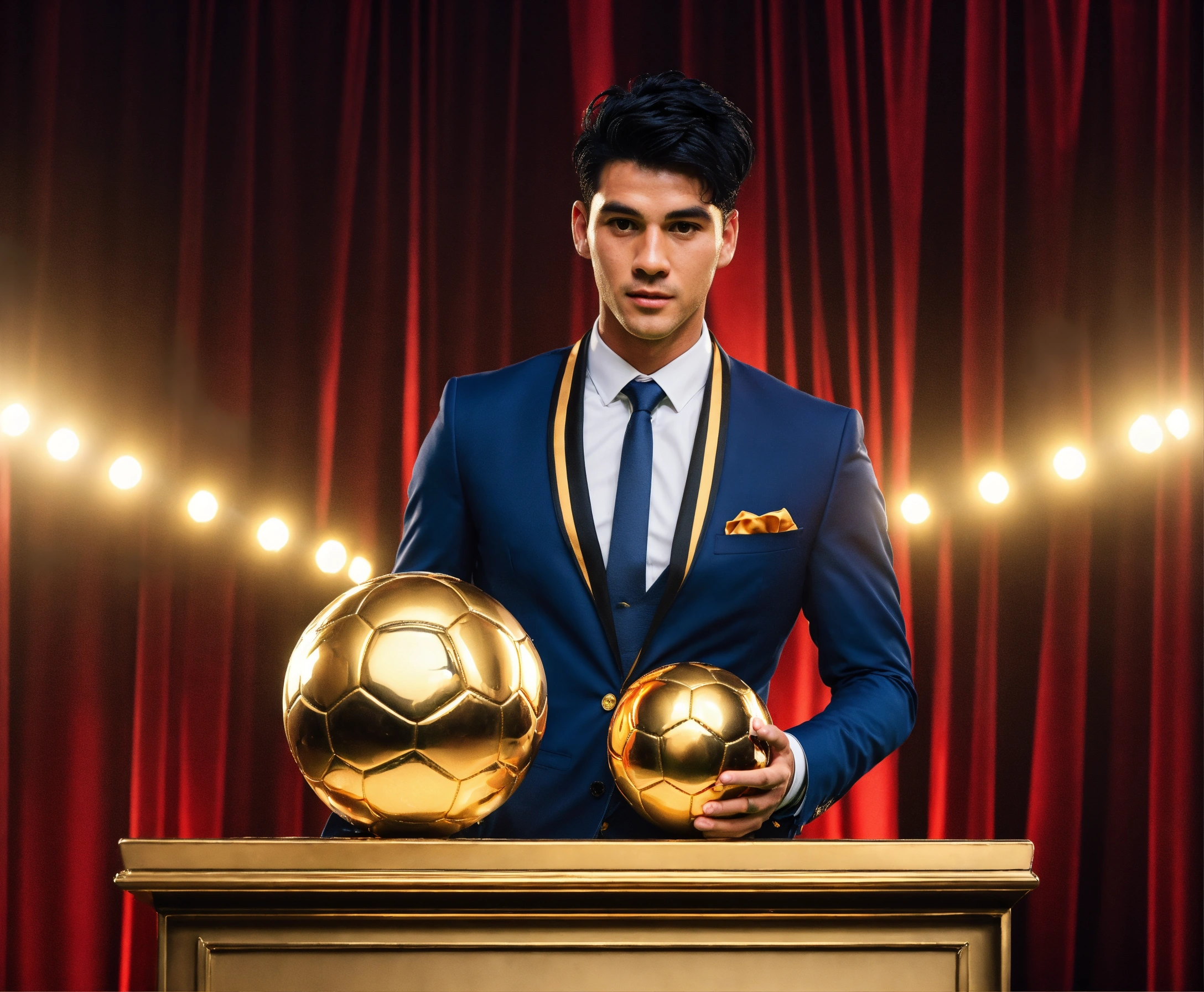 Awarding the golden ball to the best football player, on stage, half of the body is visible, a cute man in a suit, black hair