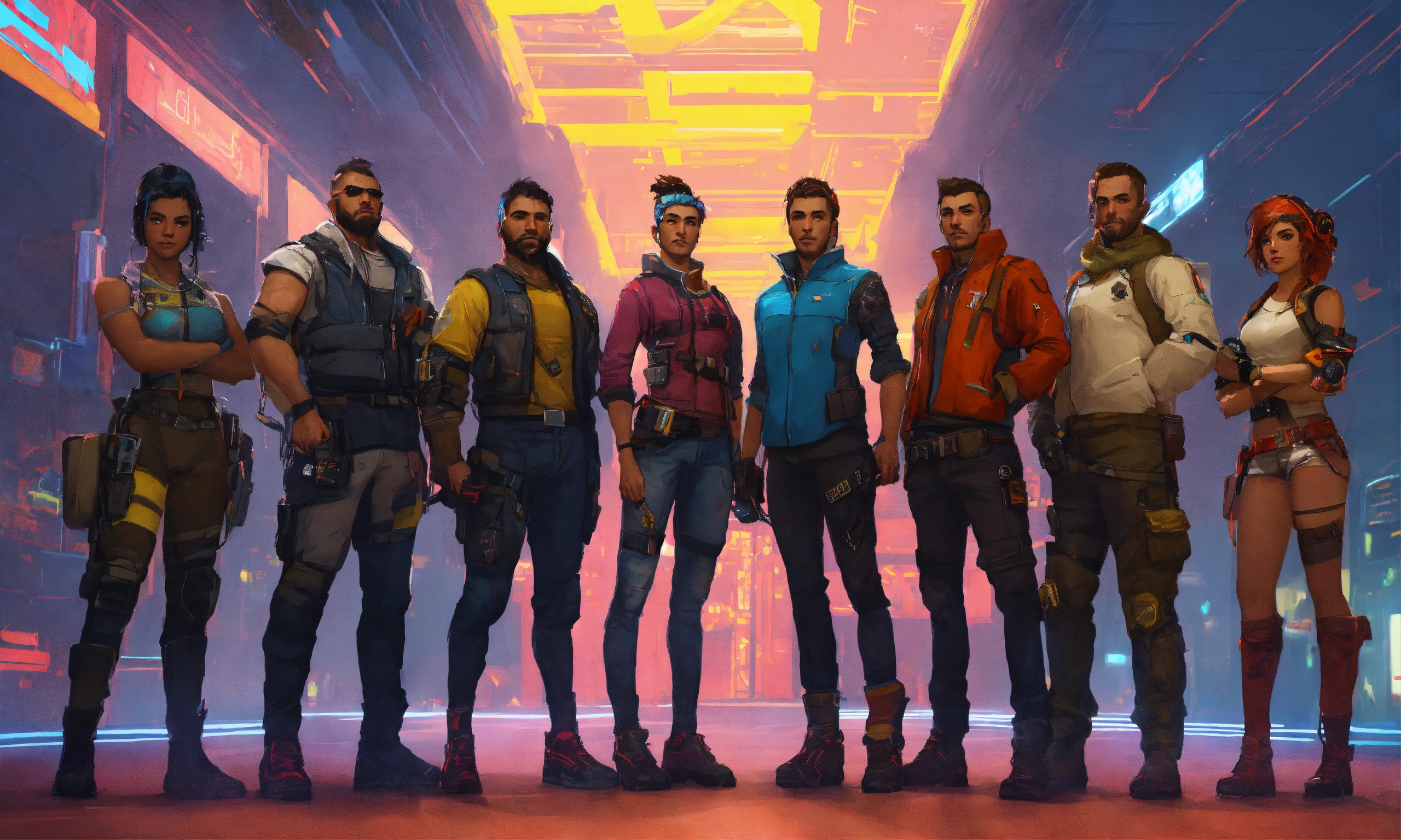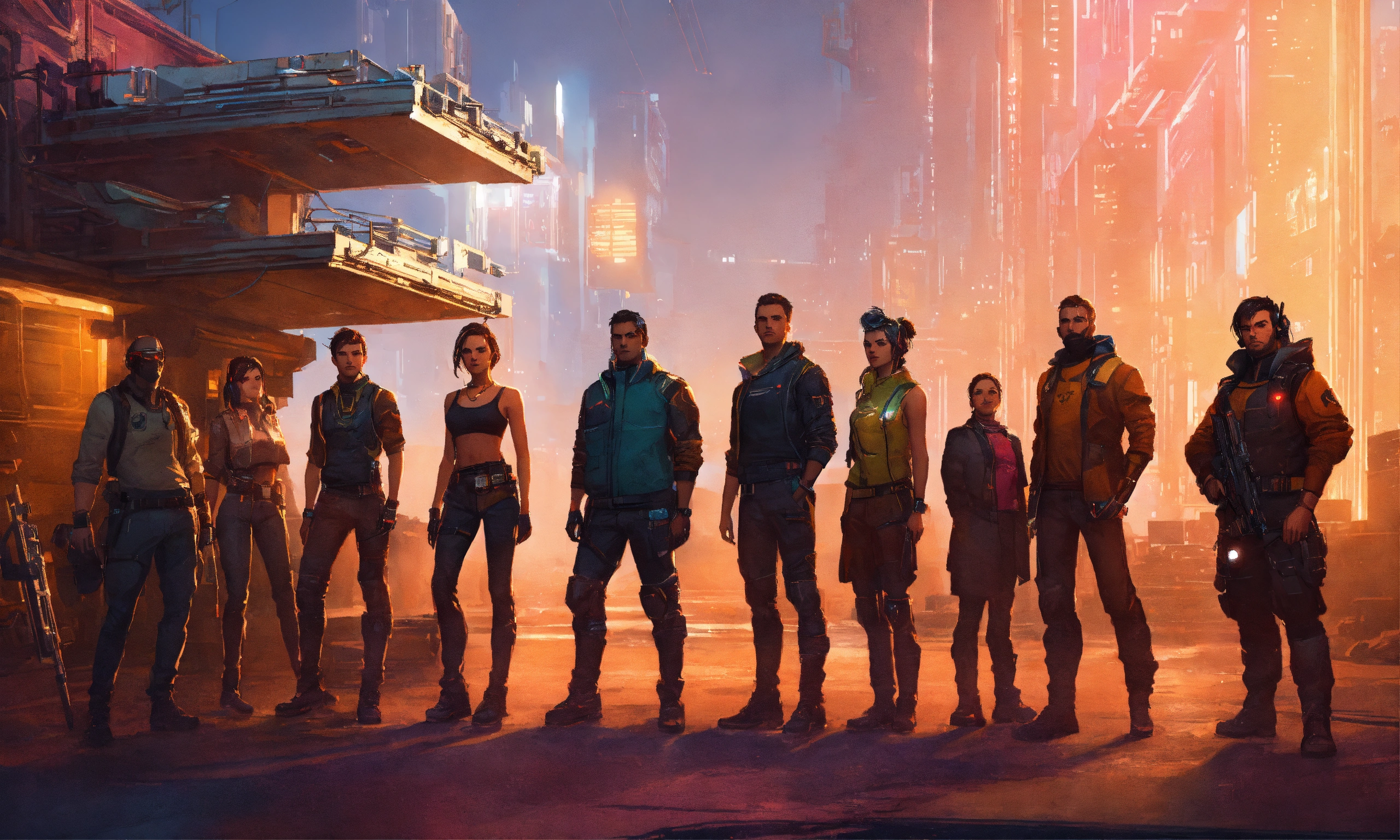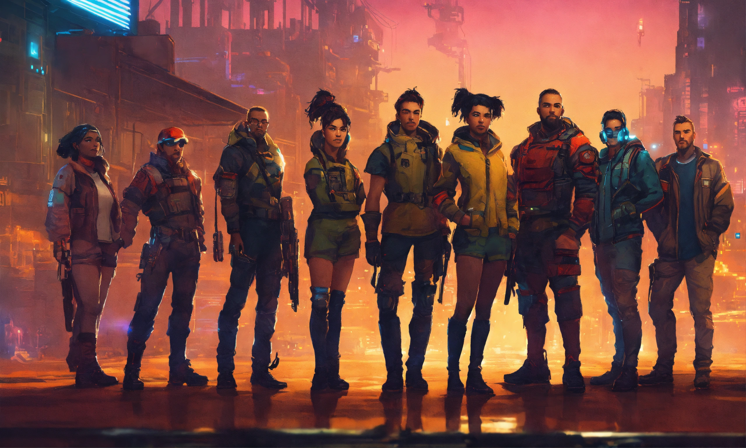 Indie dev team, characters, workforce, lineup, 8 people, diversity, future, cyber punk, greg rutkowski