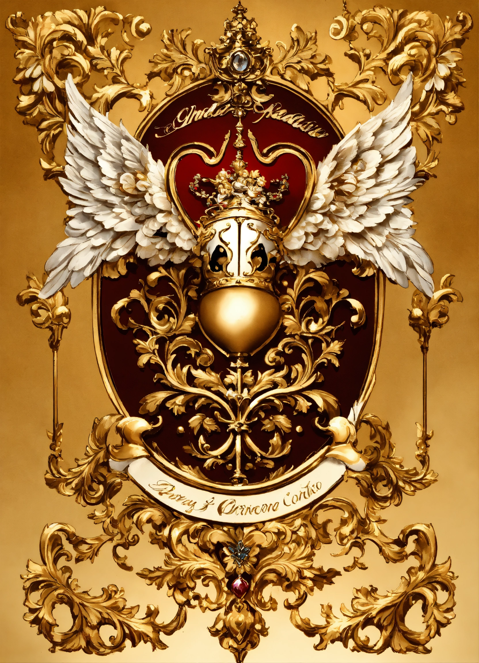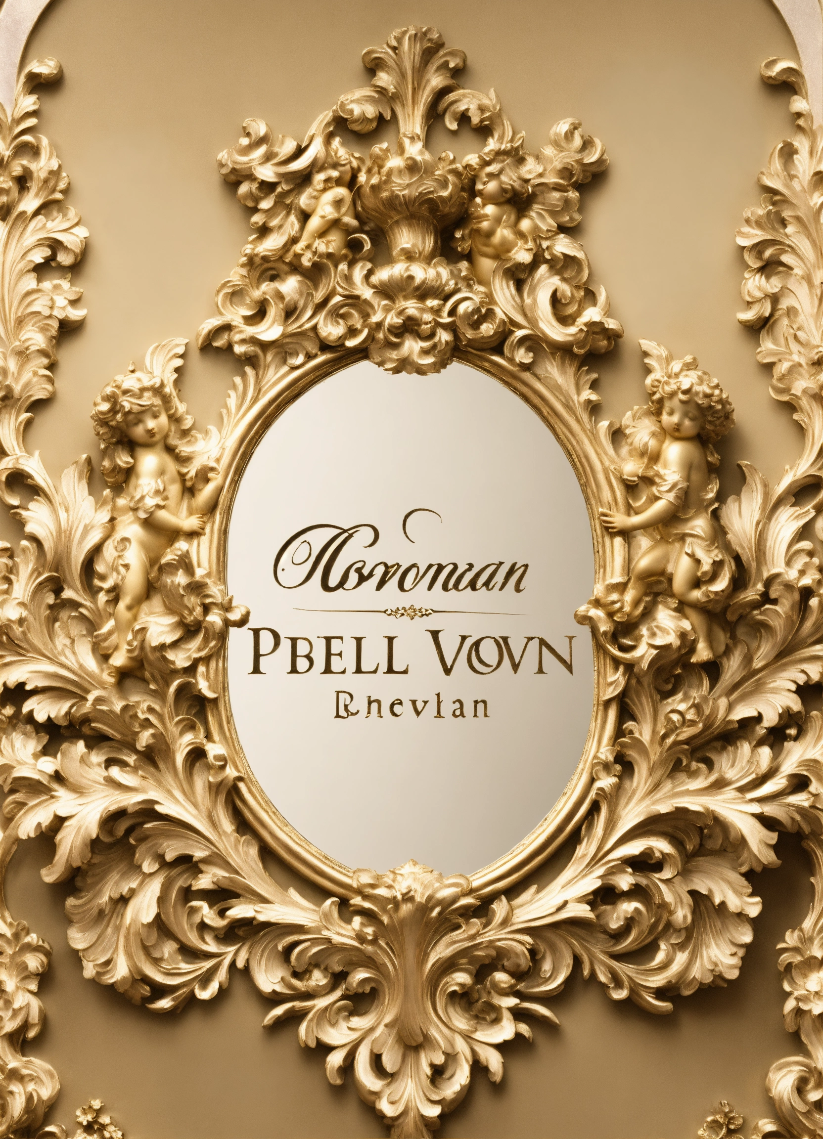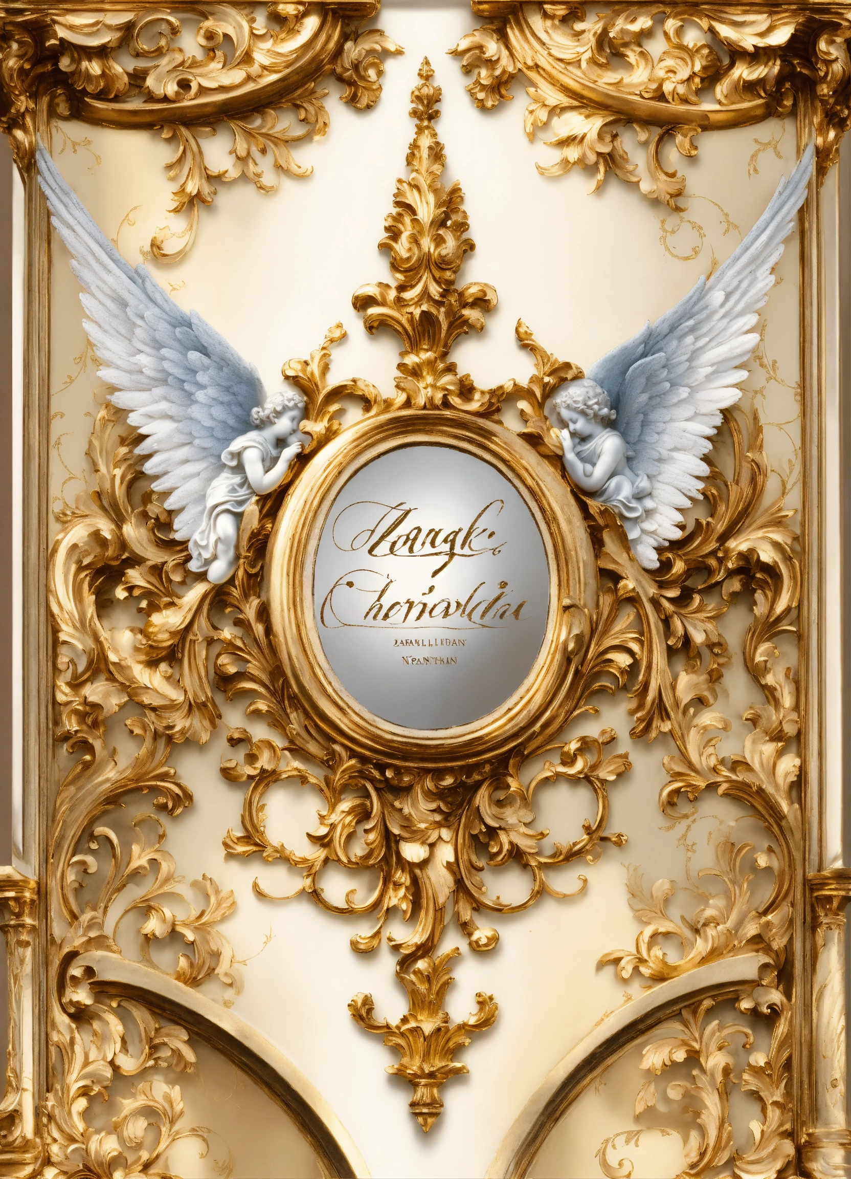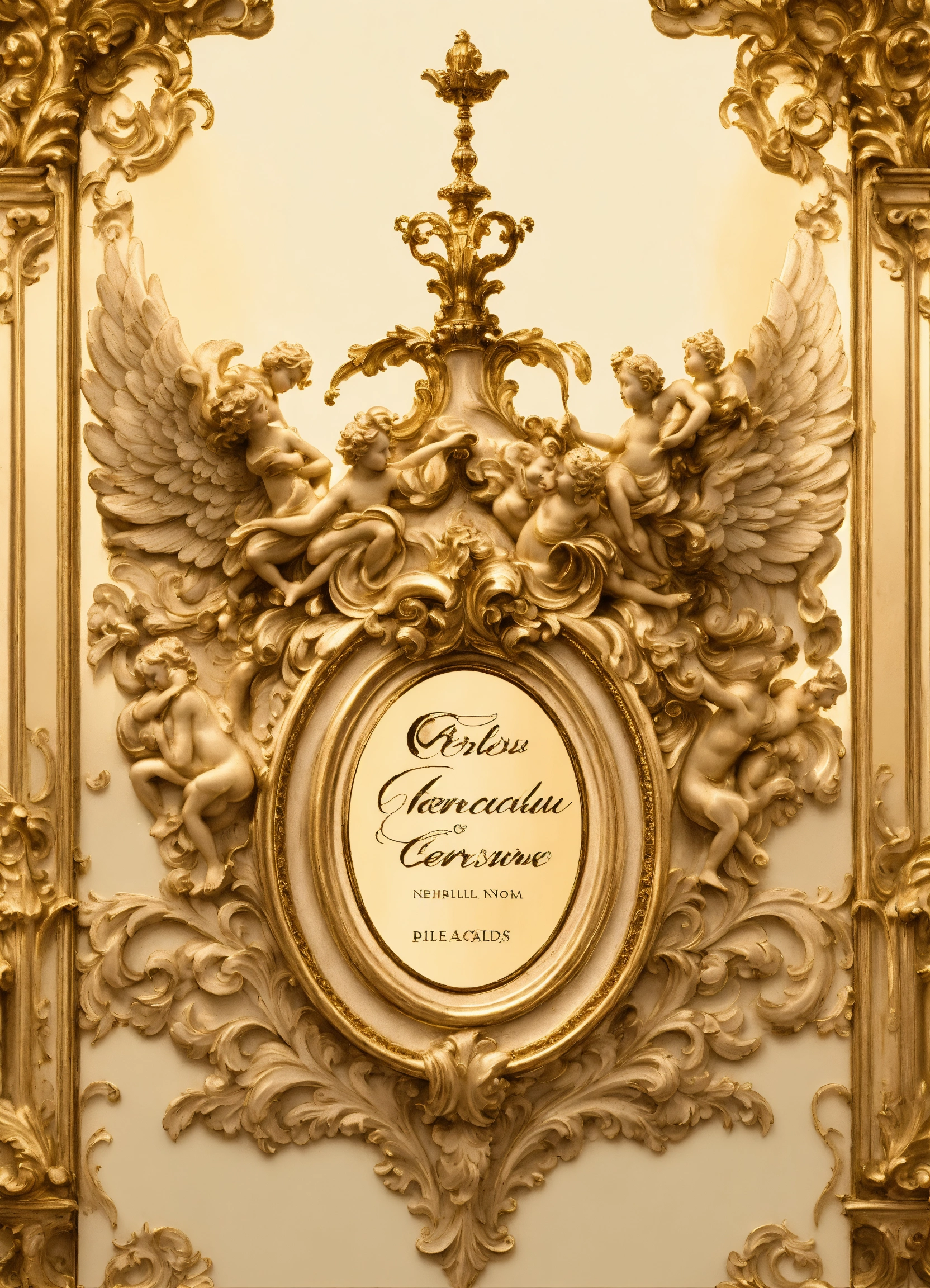Logo is bold, mirrored, baroque, versailles, rococo style. i’d like the calligraphy of this logo to be ornate, and match the design, pearlescent satin glittering ivory white background. angel cherubs flying around the norman style spires, beautiful, di como designs limited