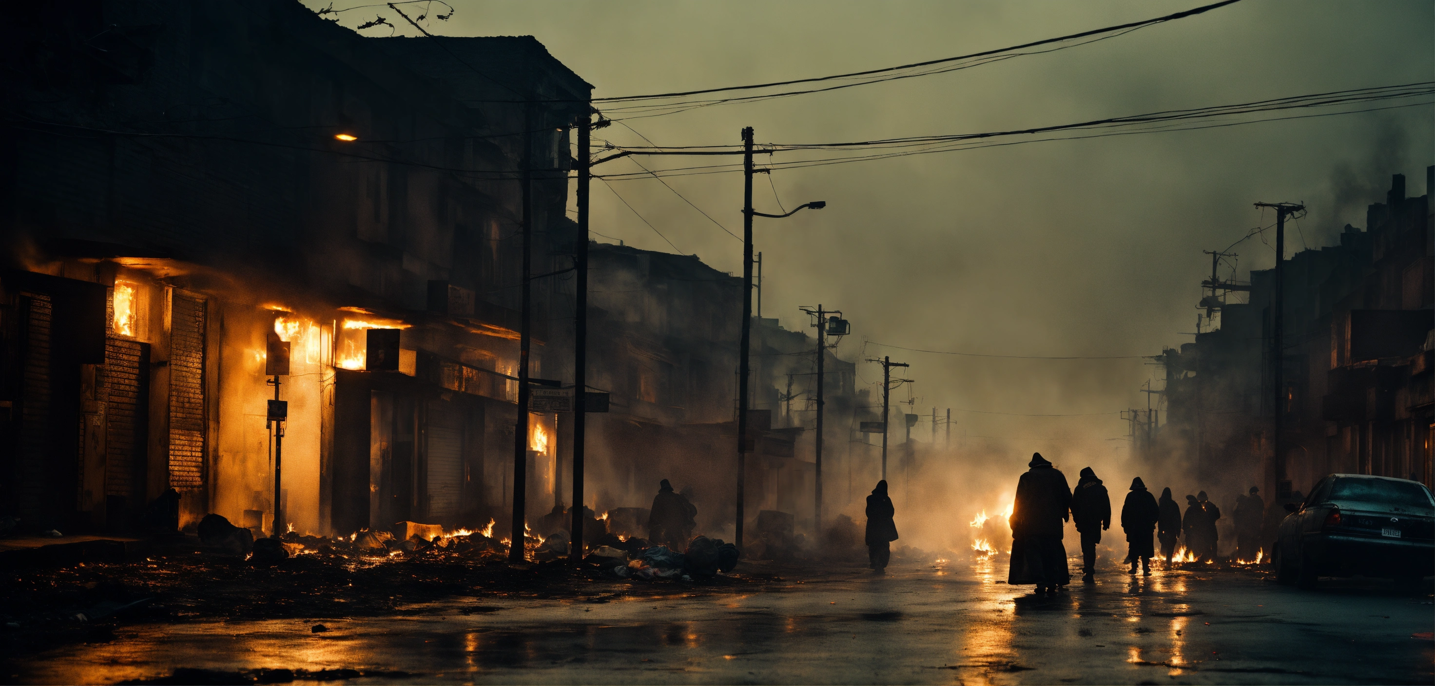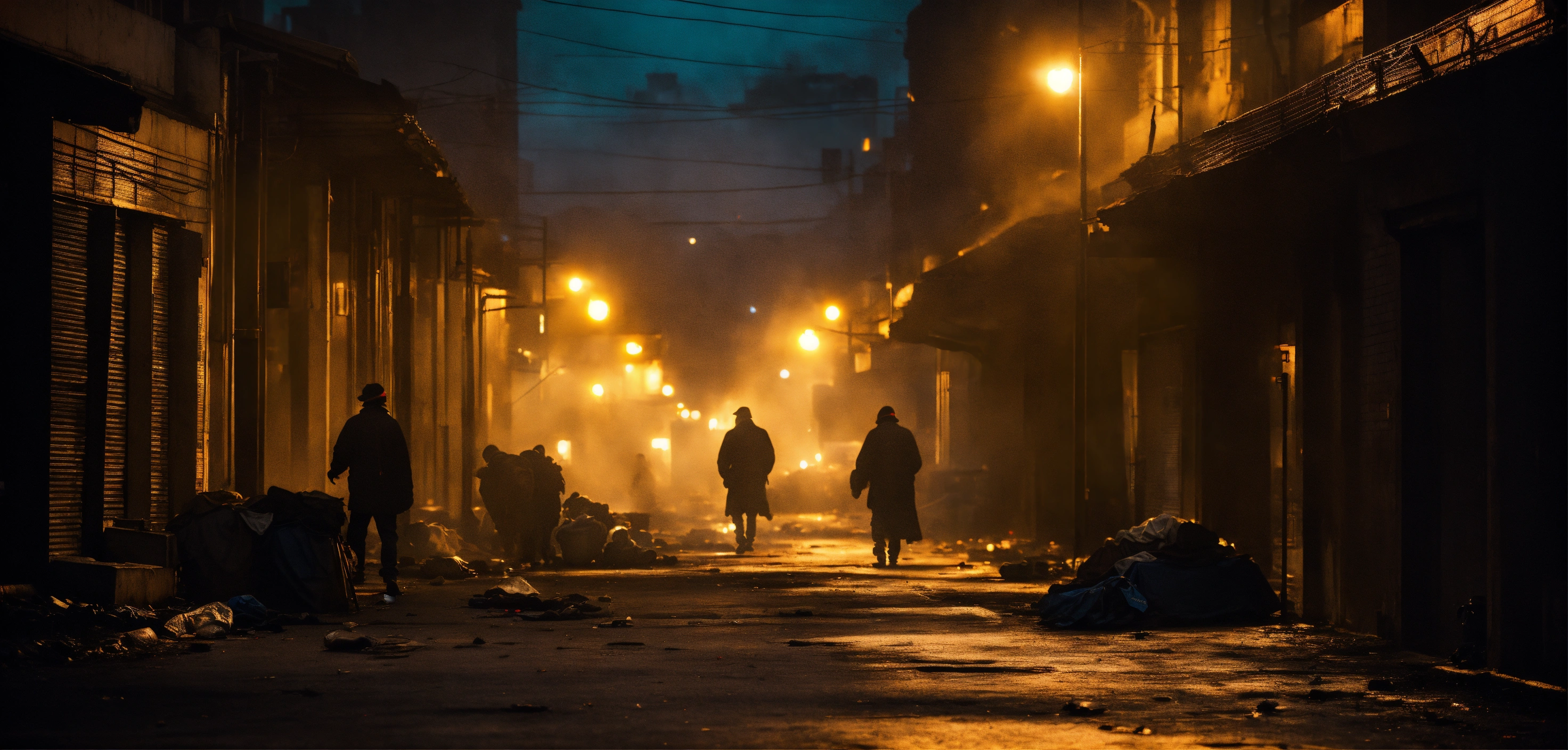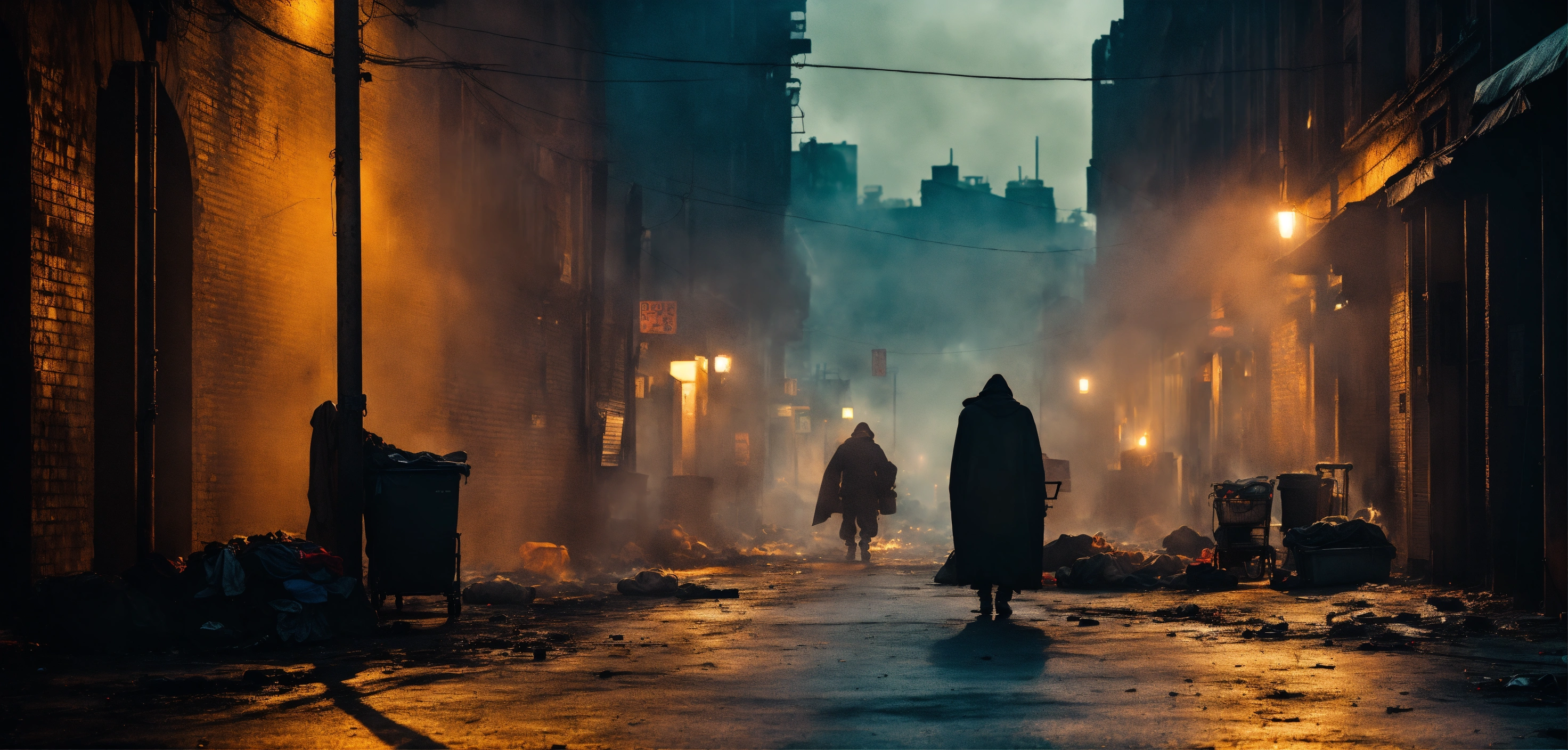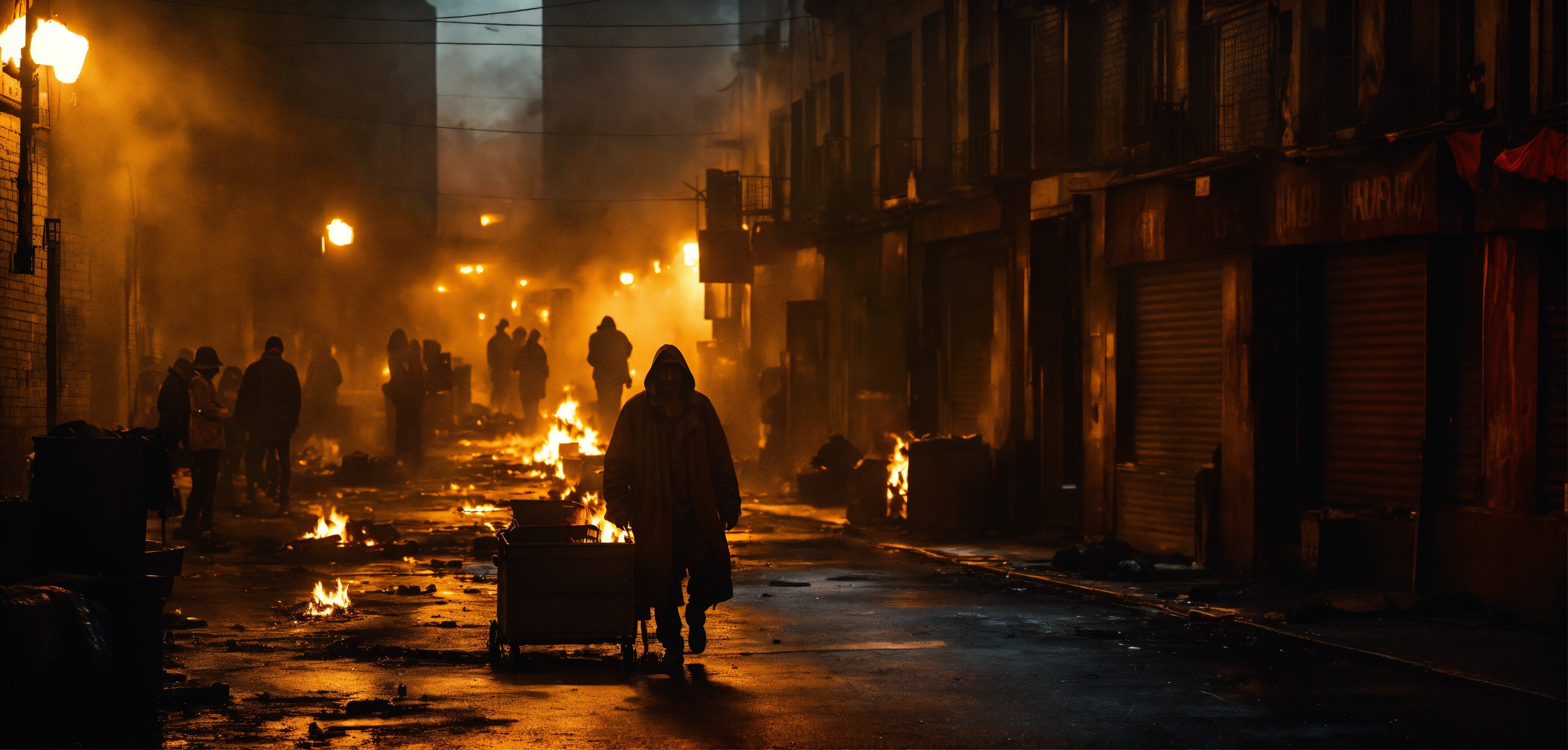 Cinematic look, backlit, heavy haze, dark urban dirty city side street, burning tin ton, homeless people, dim light, underworld vampire movie style