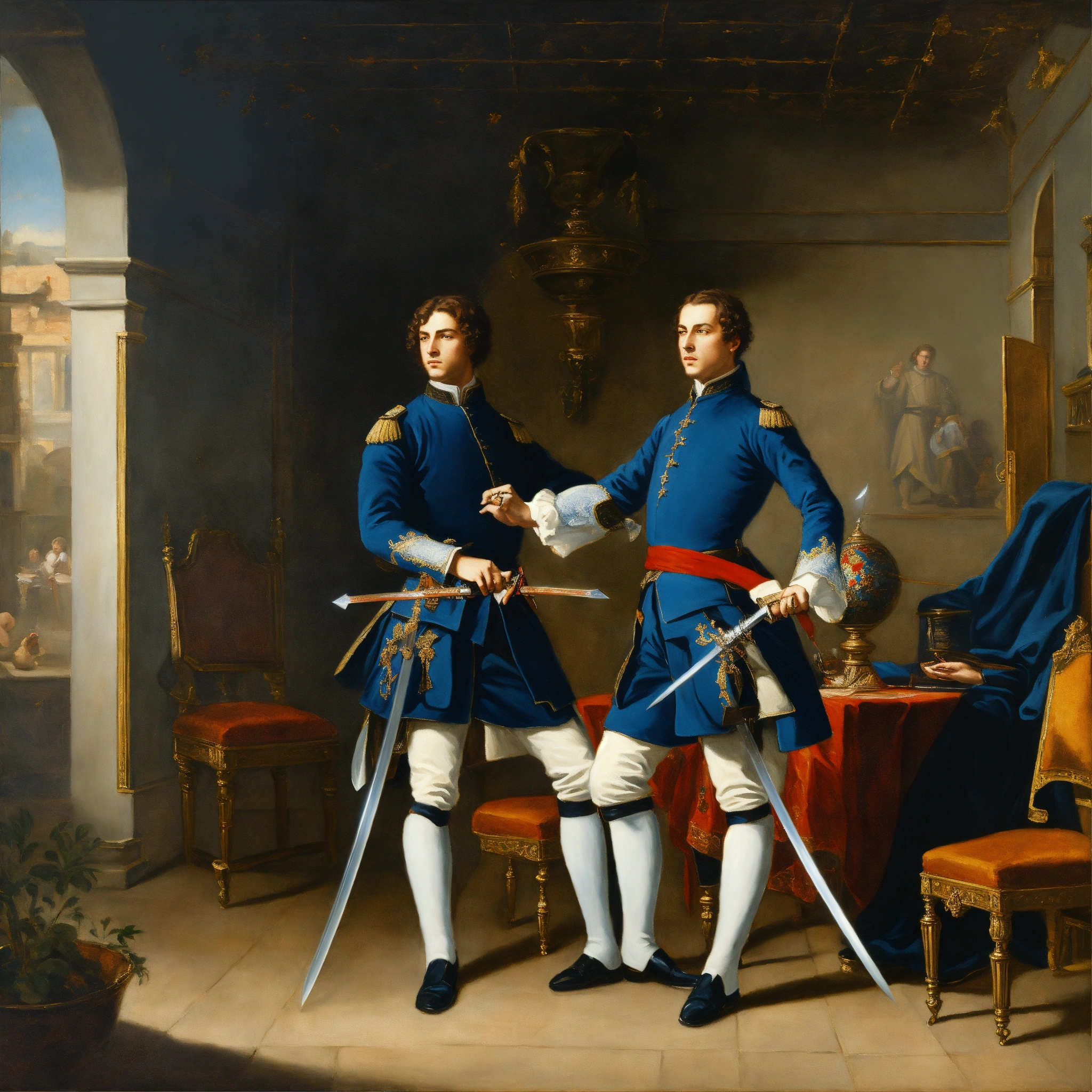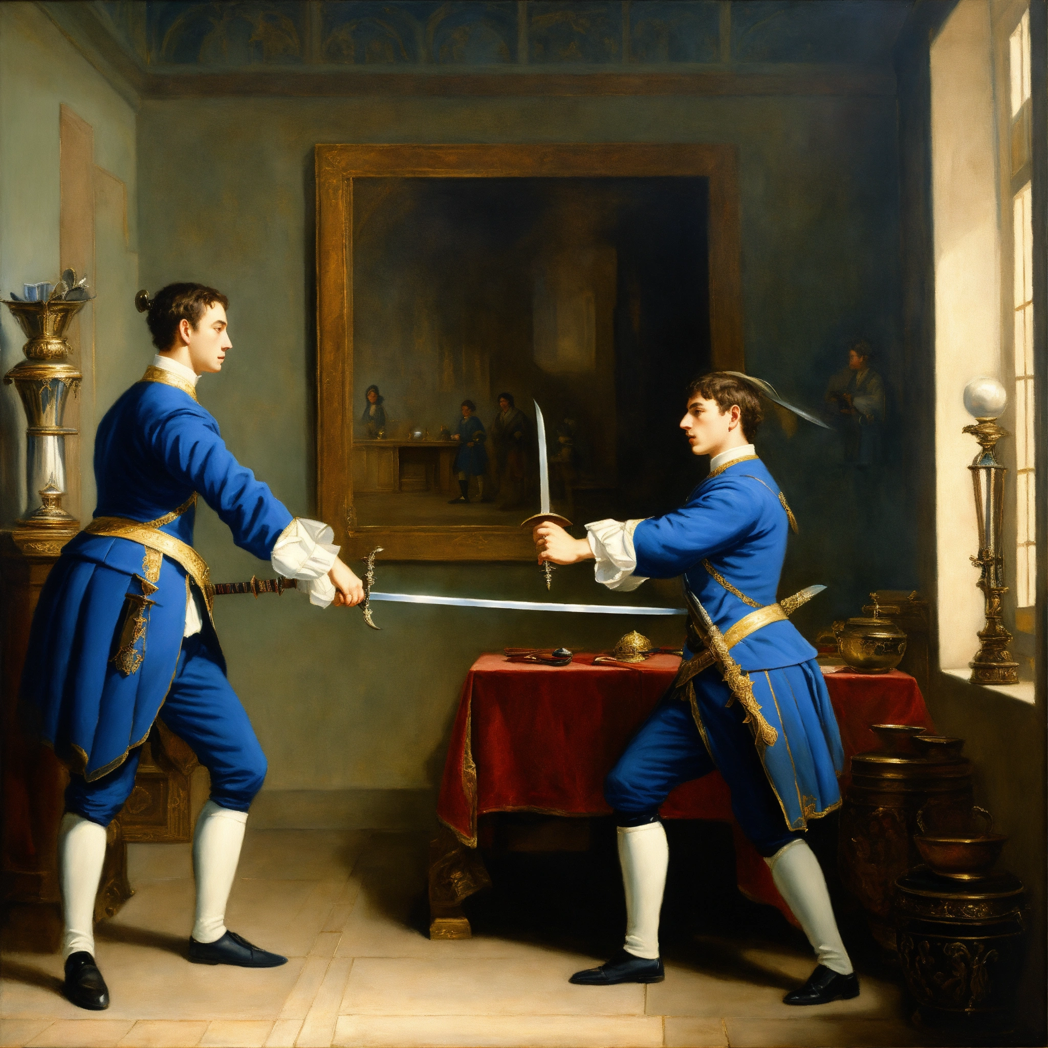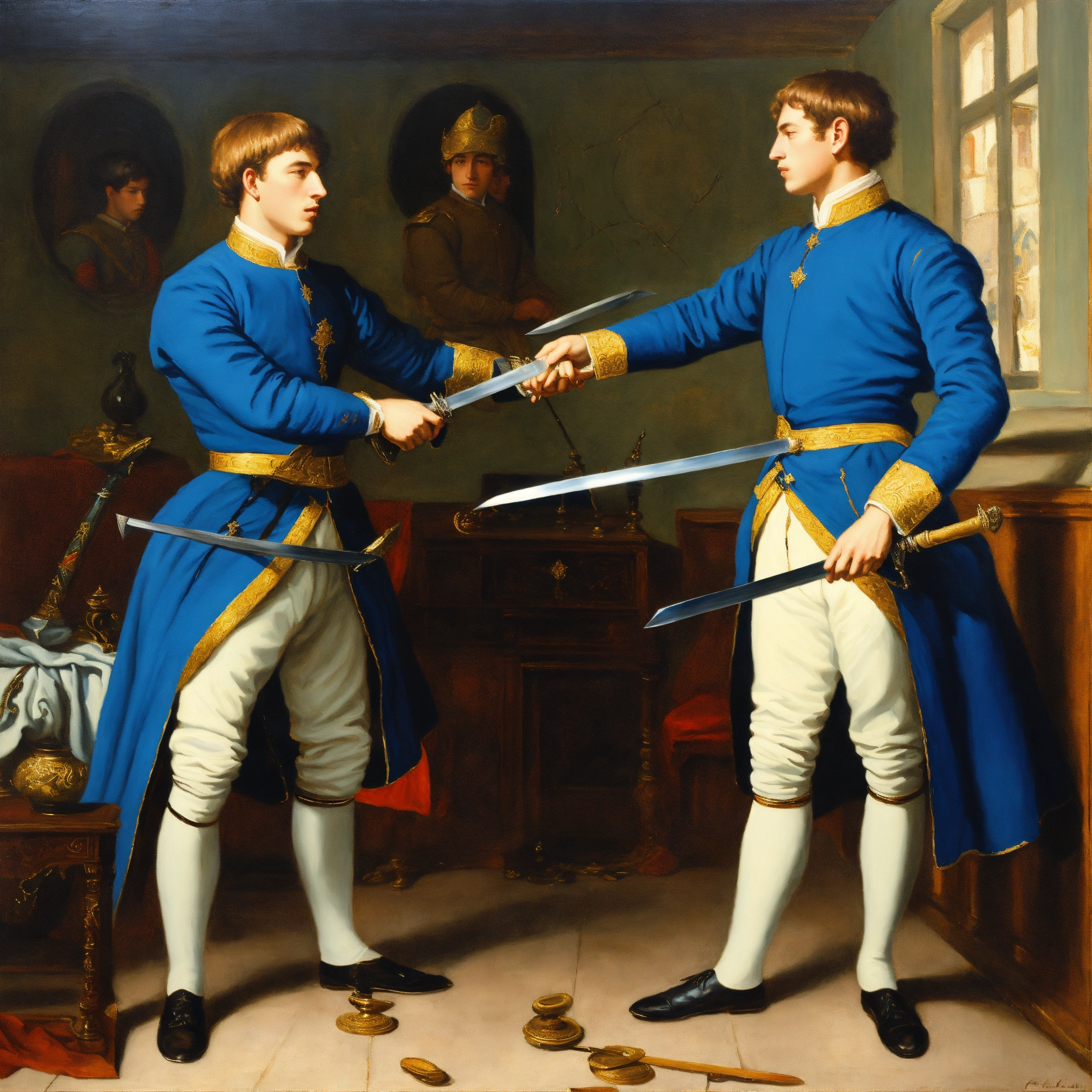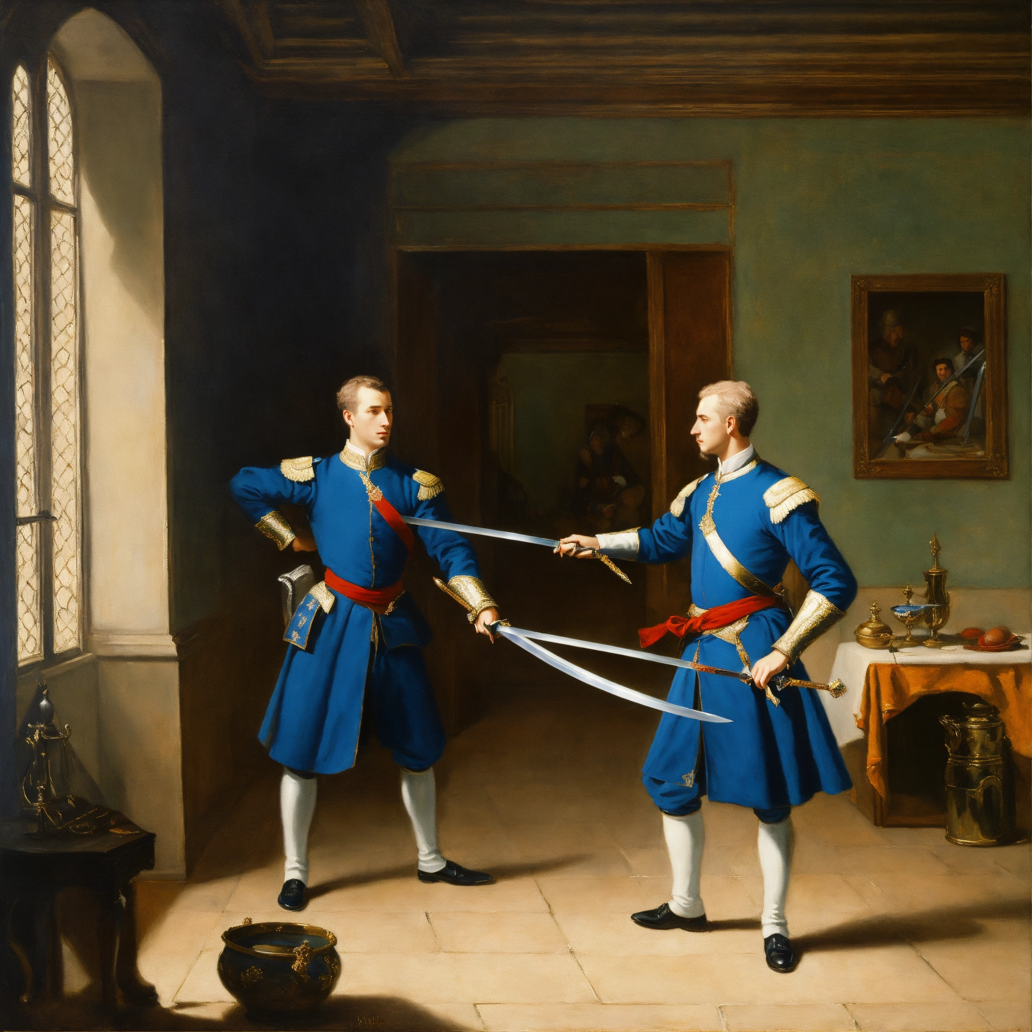Two young white nobles in blue uniforms dueling with swords in a little room oil painting