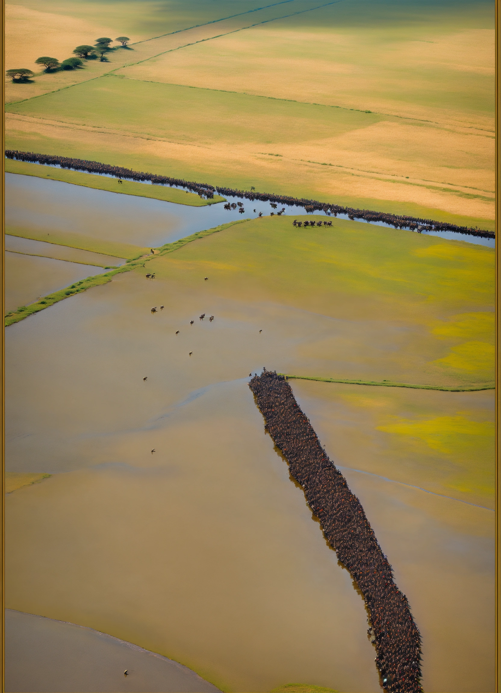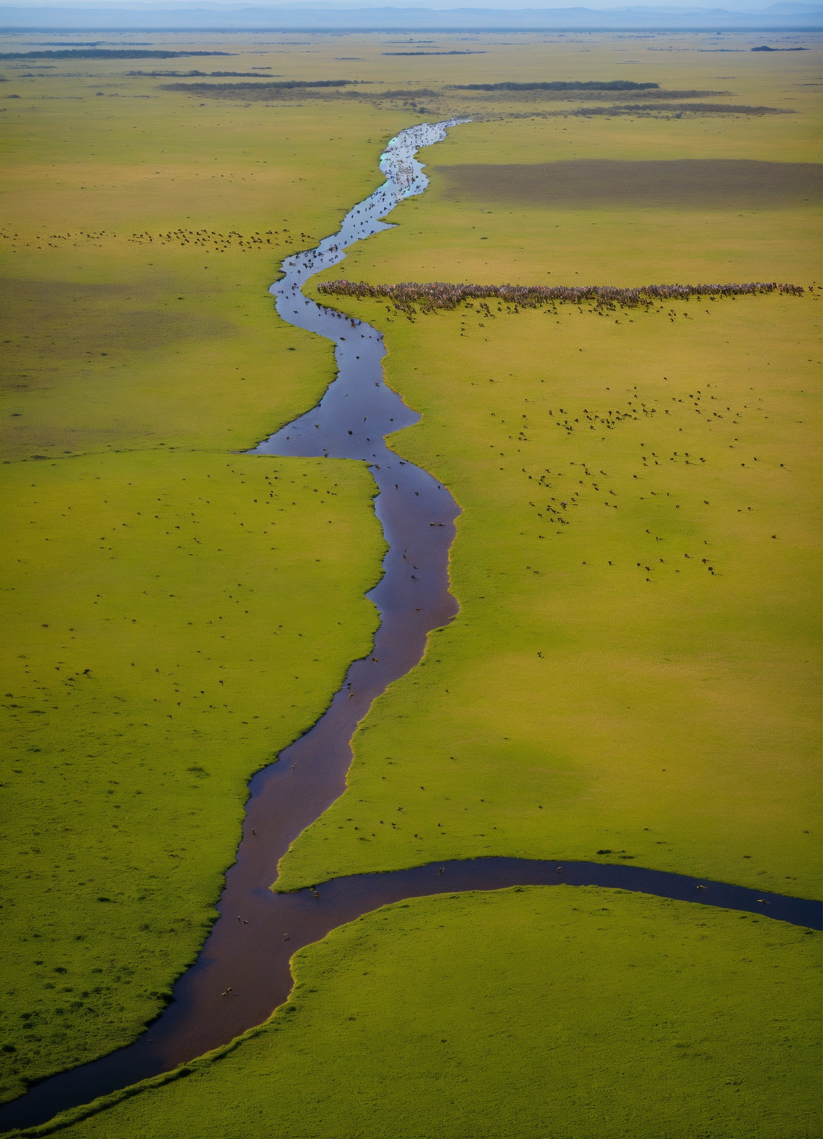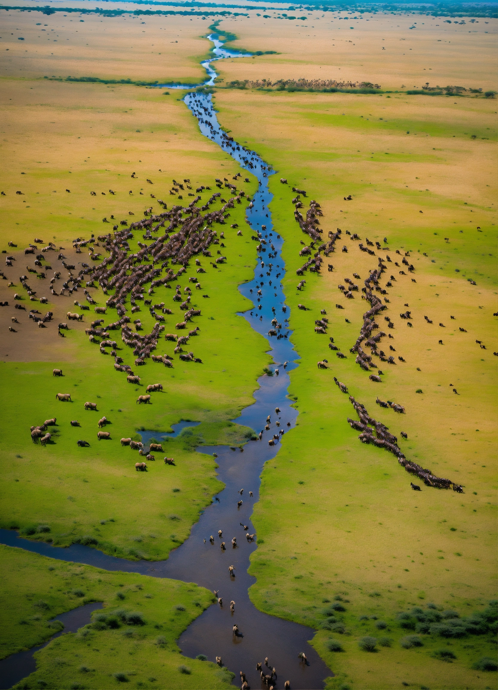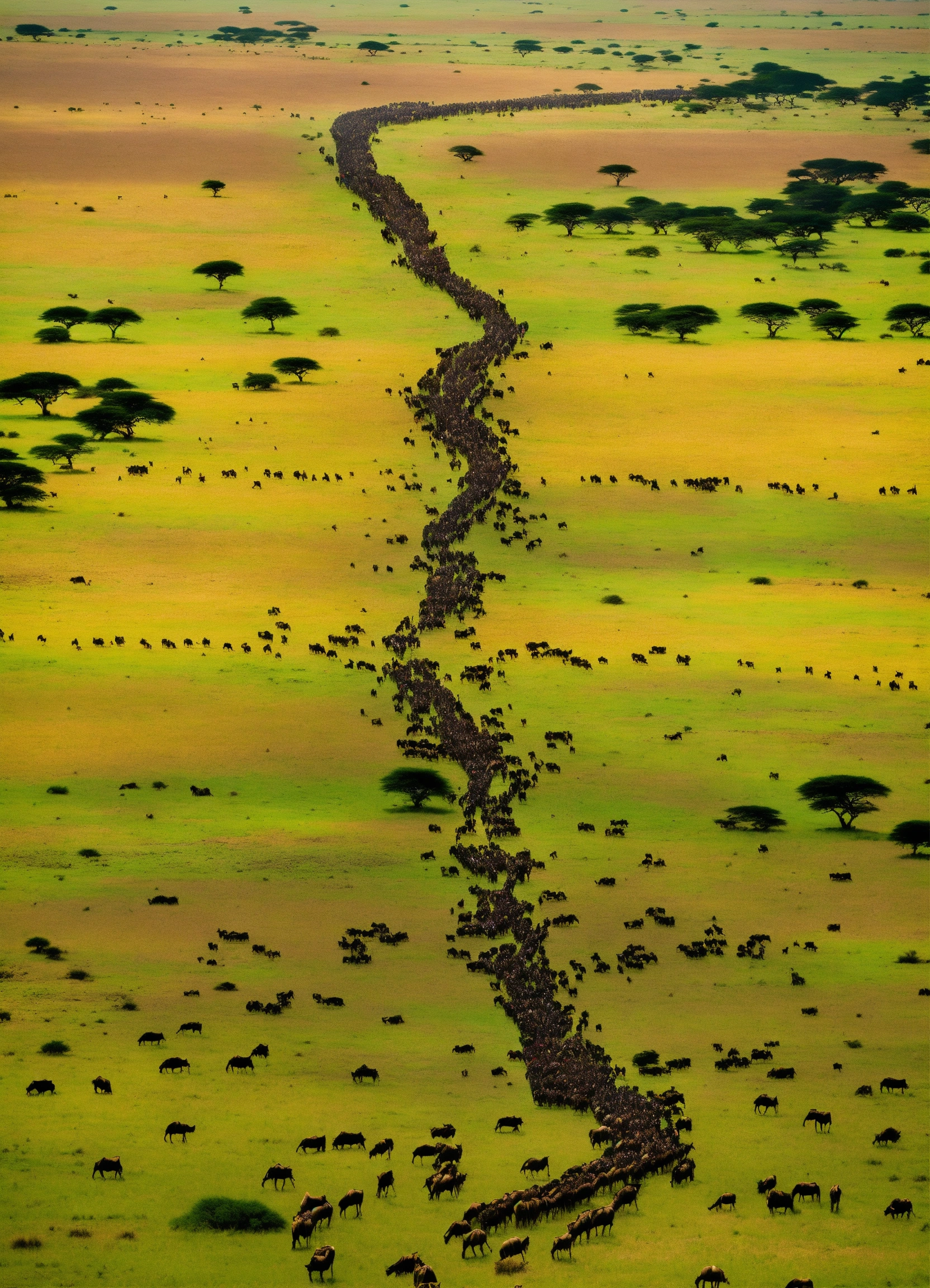 The migration of wild animals in serengeti, tanzania, as seen from above, is magnificent and incredible. the seemingly endless line of wildebeests stretches across the vast grasslands.