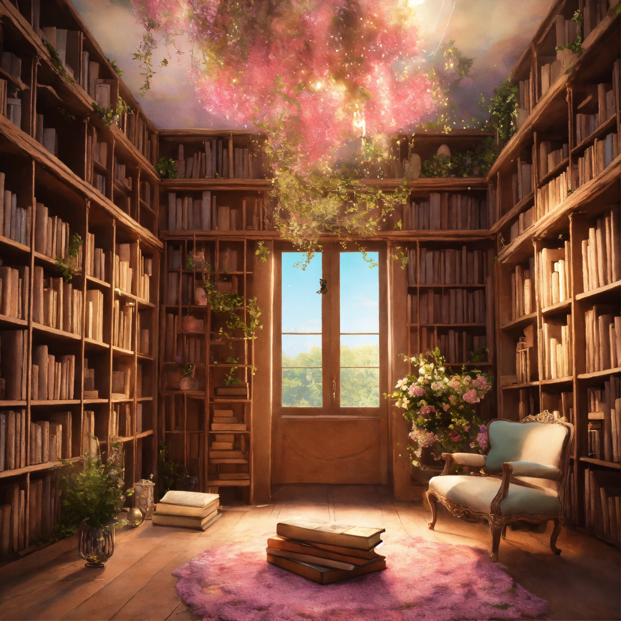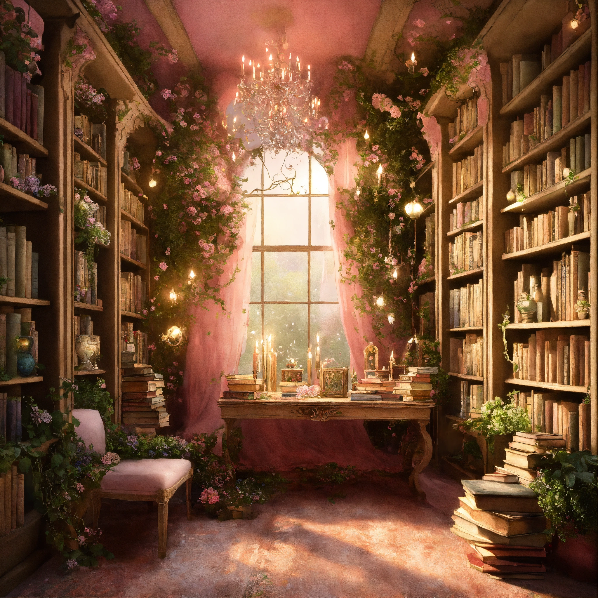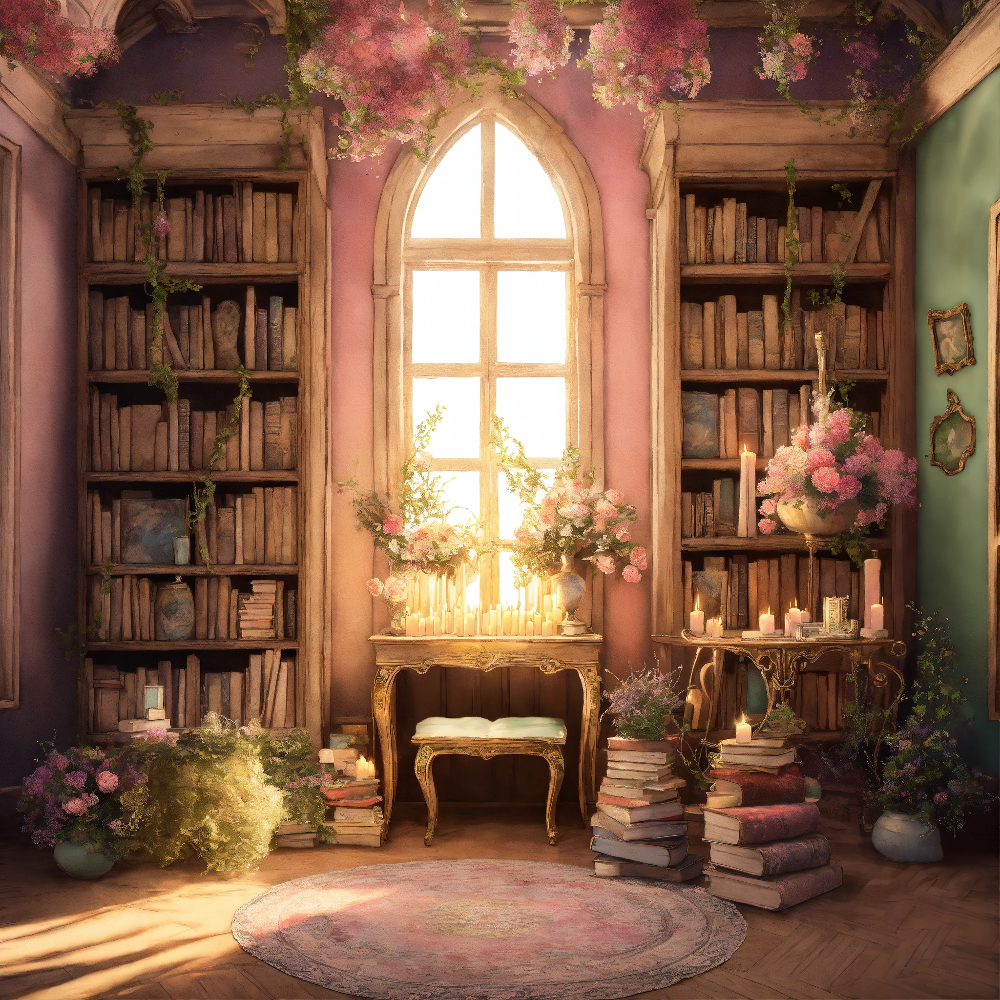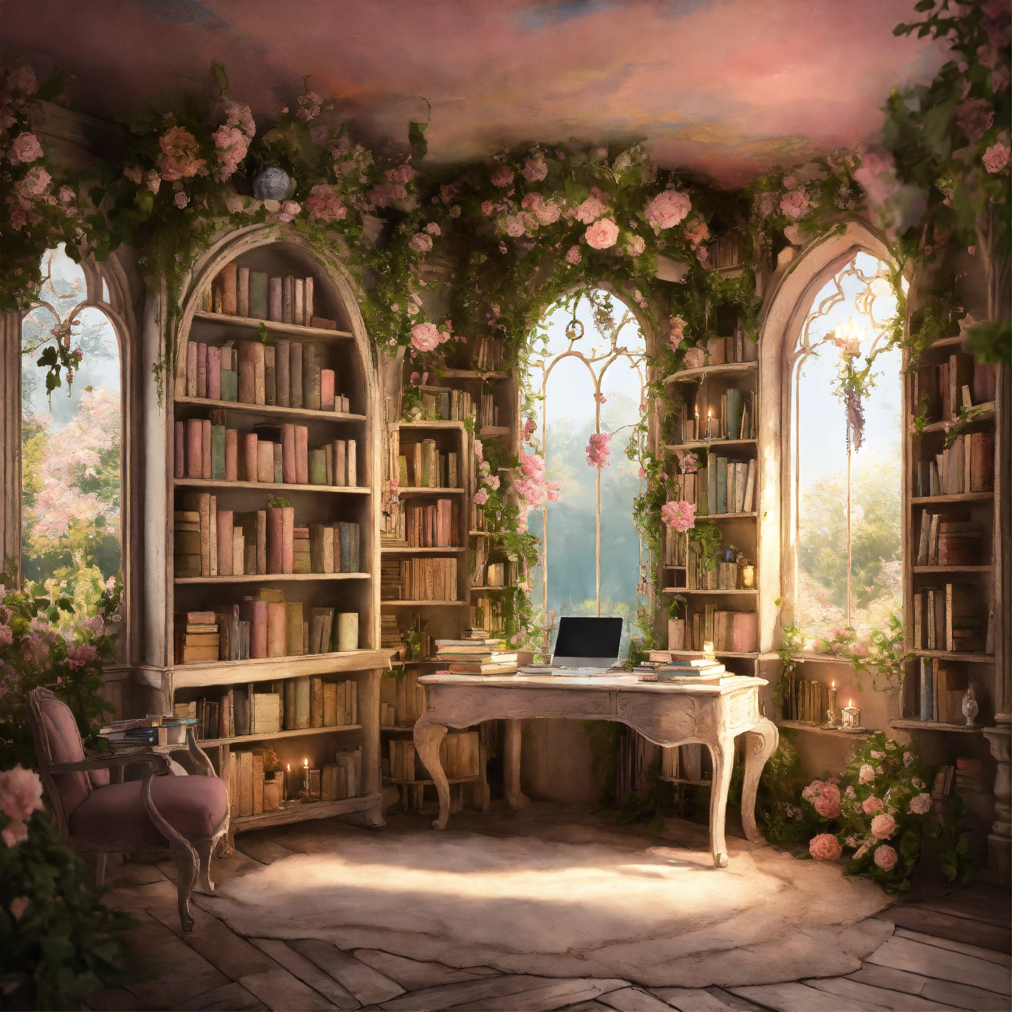 Shabby chic dreamy mist pastel junk journals the enchanted library describe a vast library that seems to extend endlessly, its shelves constructed from living vines, and filled with ancient, whispering books. floating candles and talking paintings adorn the walls. swirling magical fairytale abstract art style