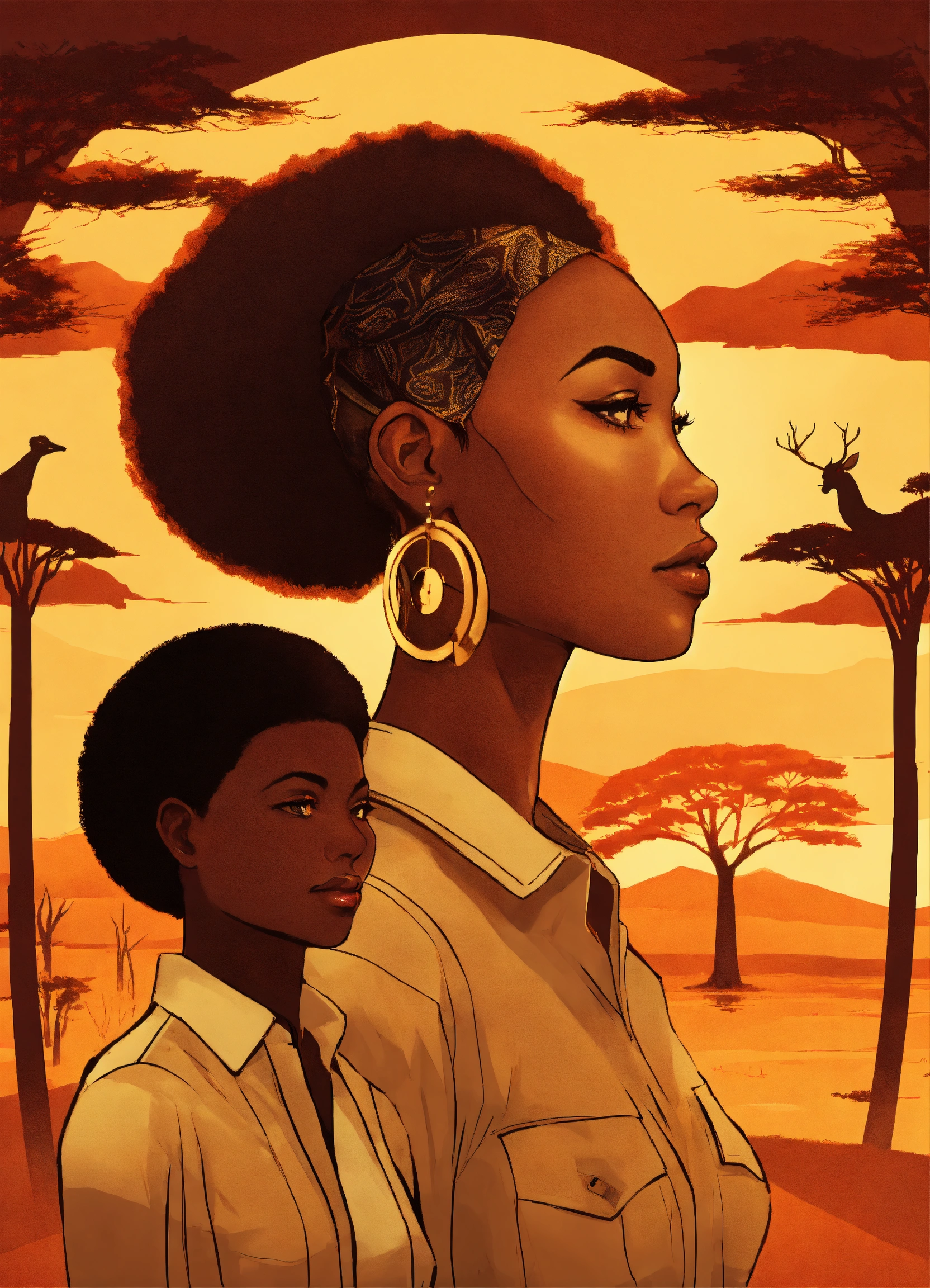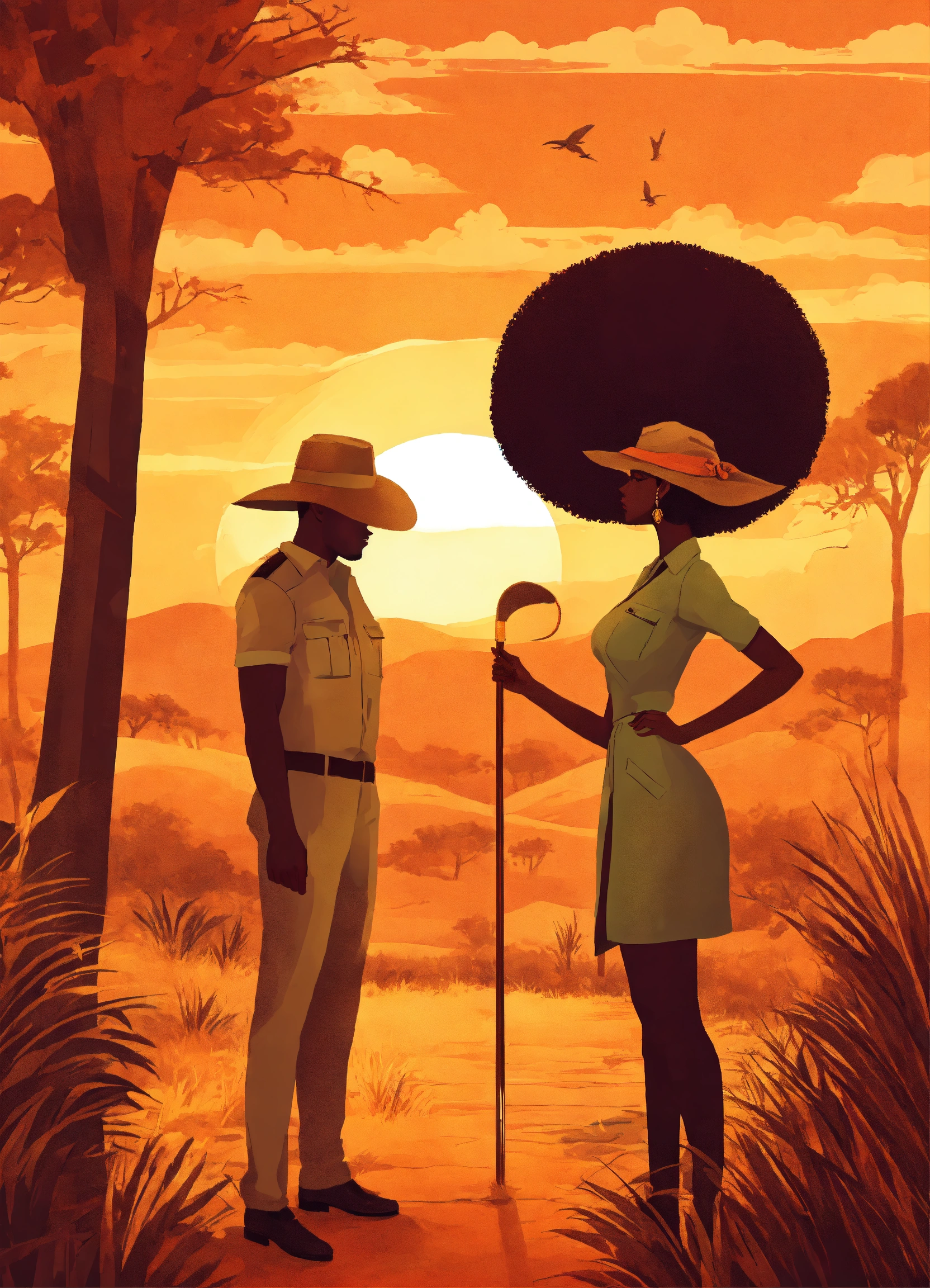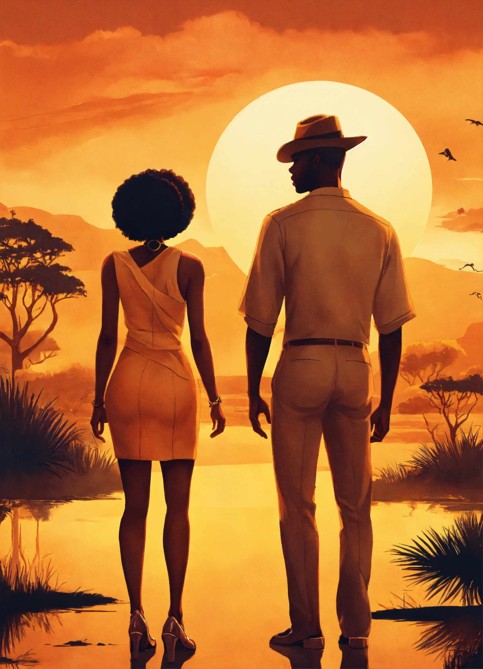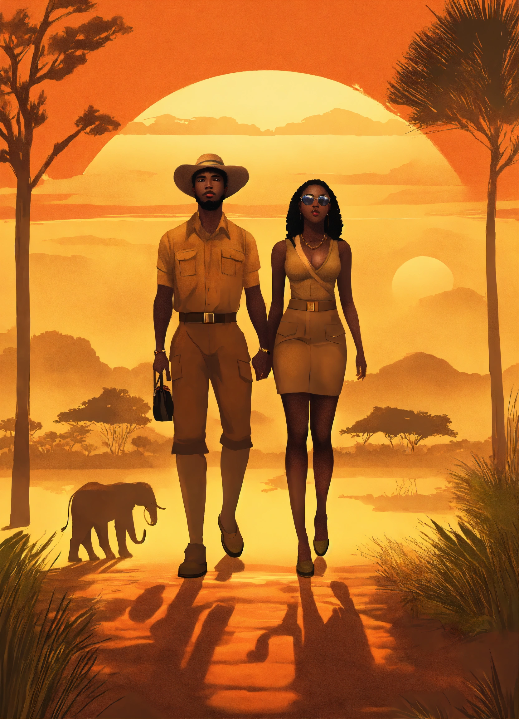Create an illustration of an optical illusion art style, portraying an african american woman and african american man in a safari