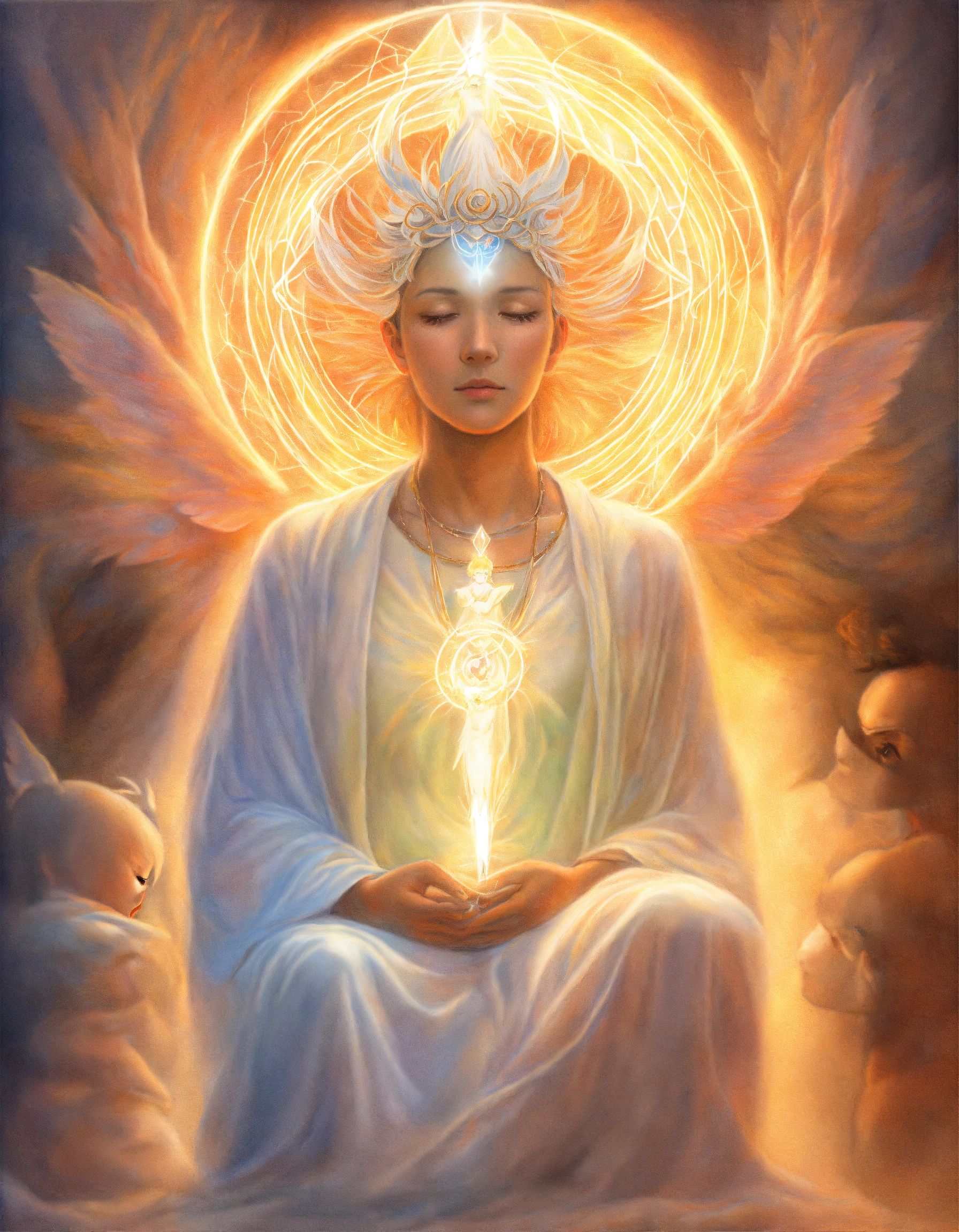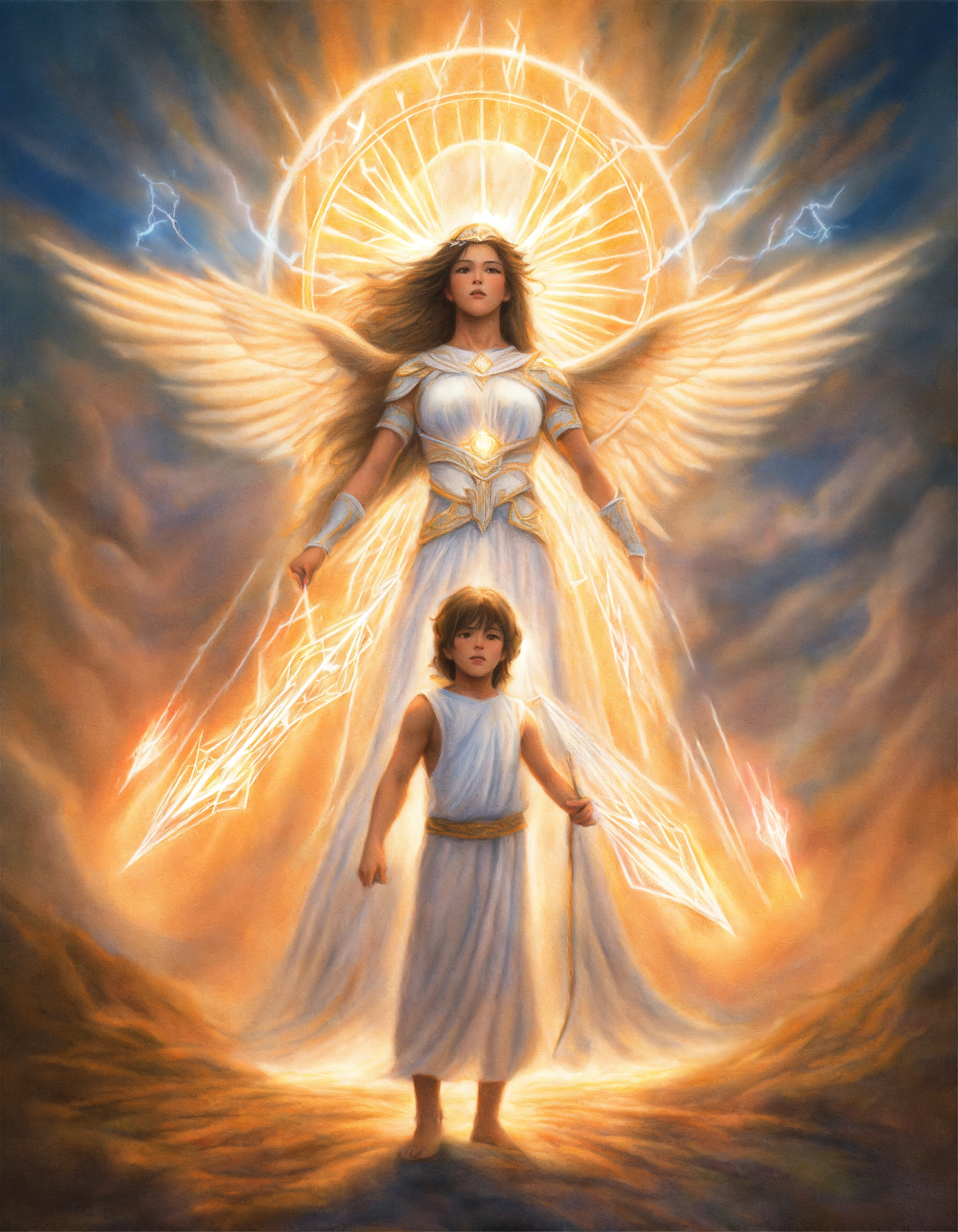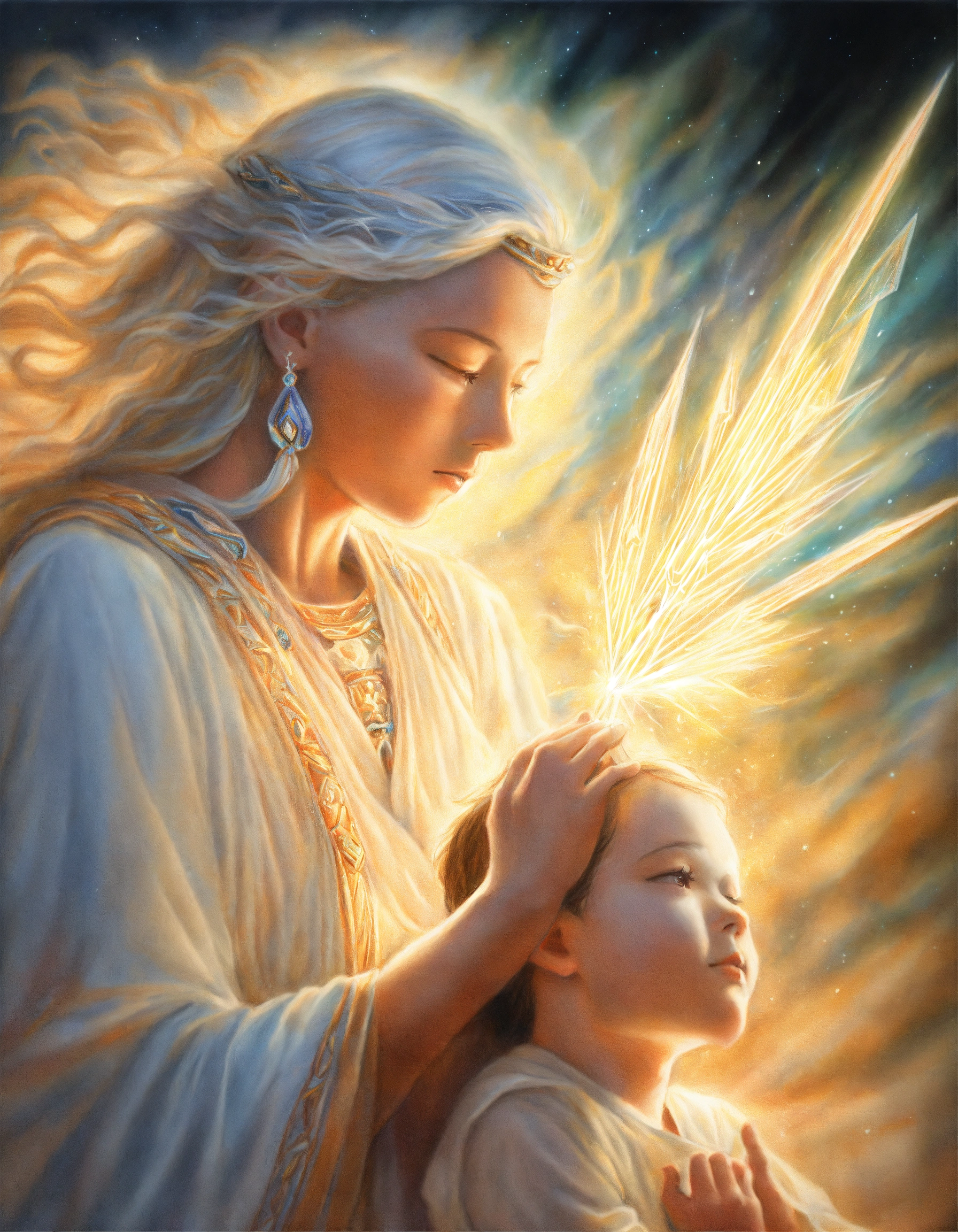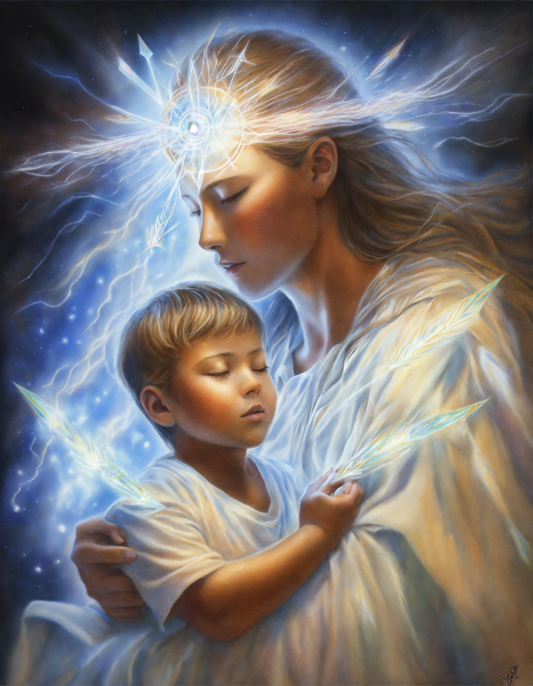 Realistic colored pencil illustration of an enlightened guardian spirit protecting a child, wearing white, whilst receiving attacks from transparent etheric arrows of energy. mother spirit defending son spirit.