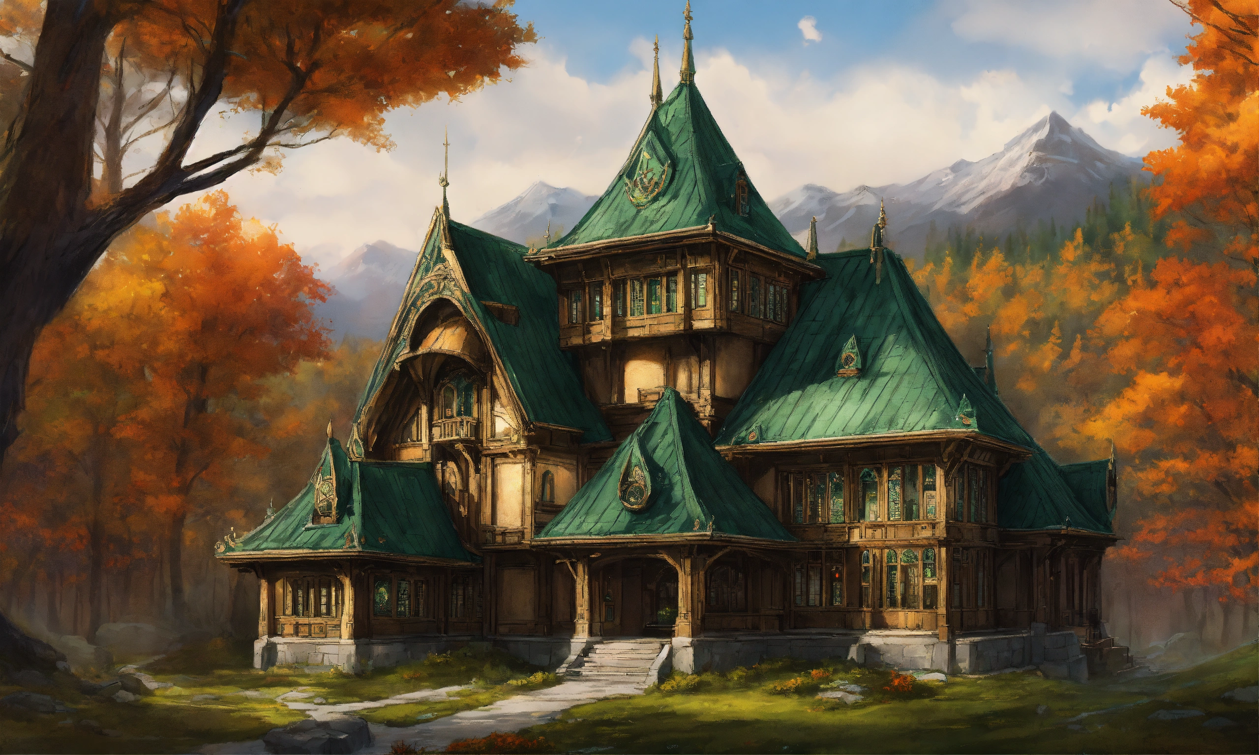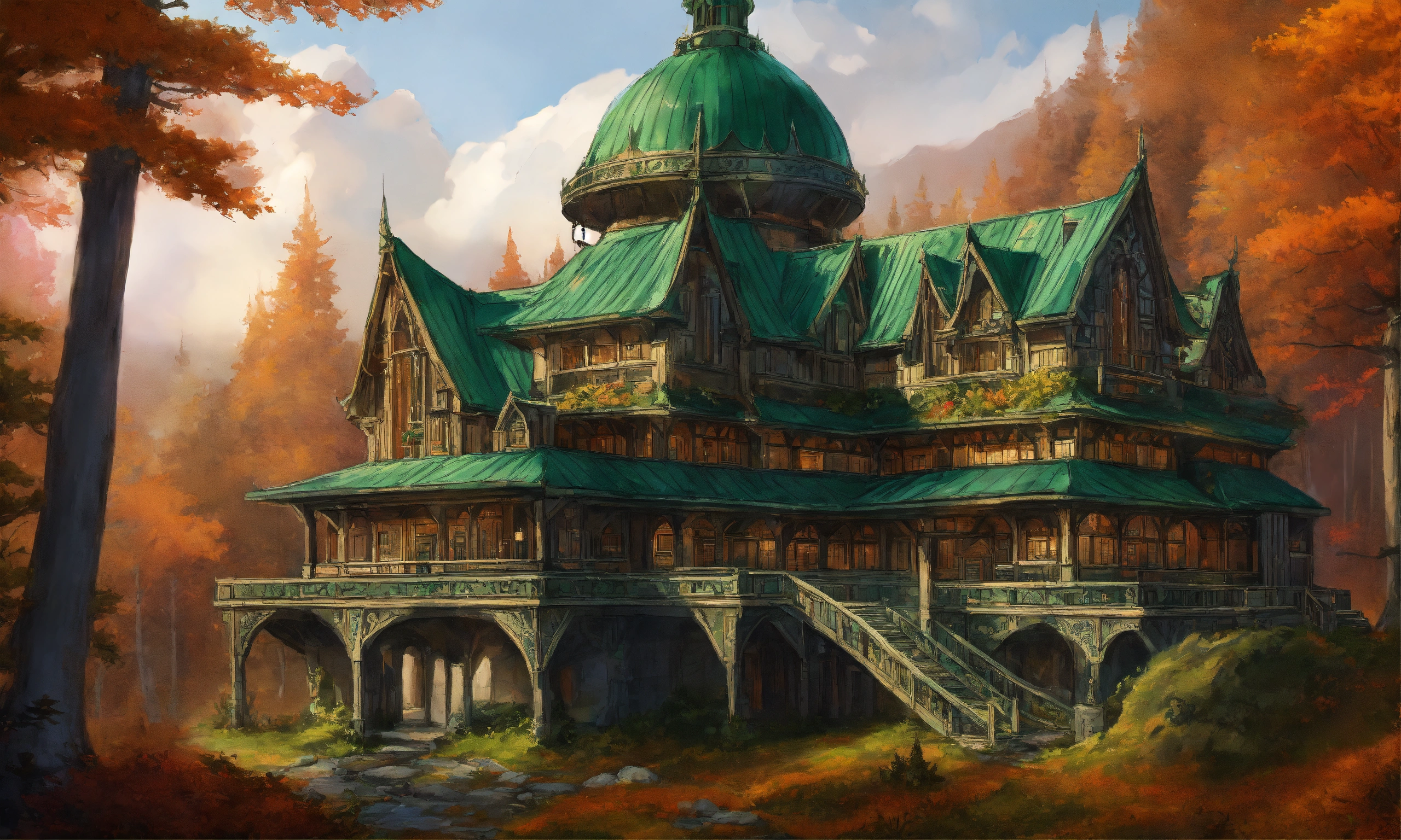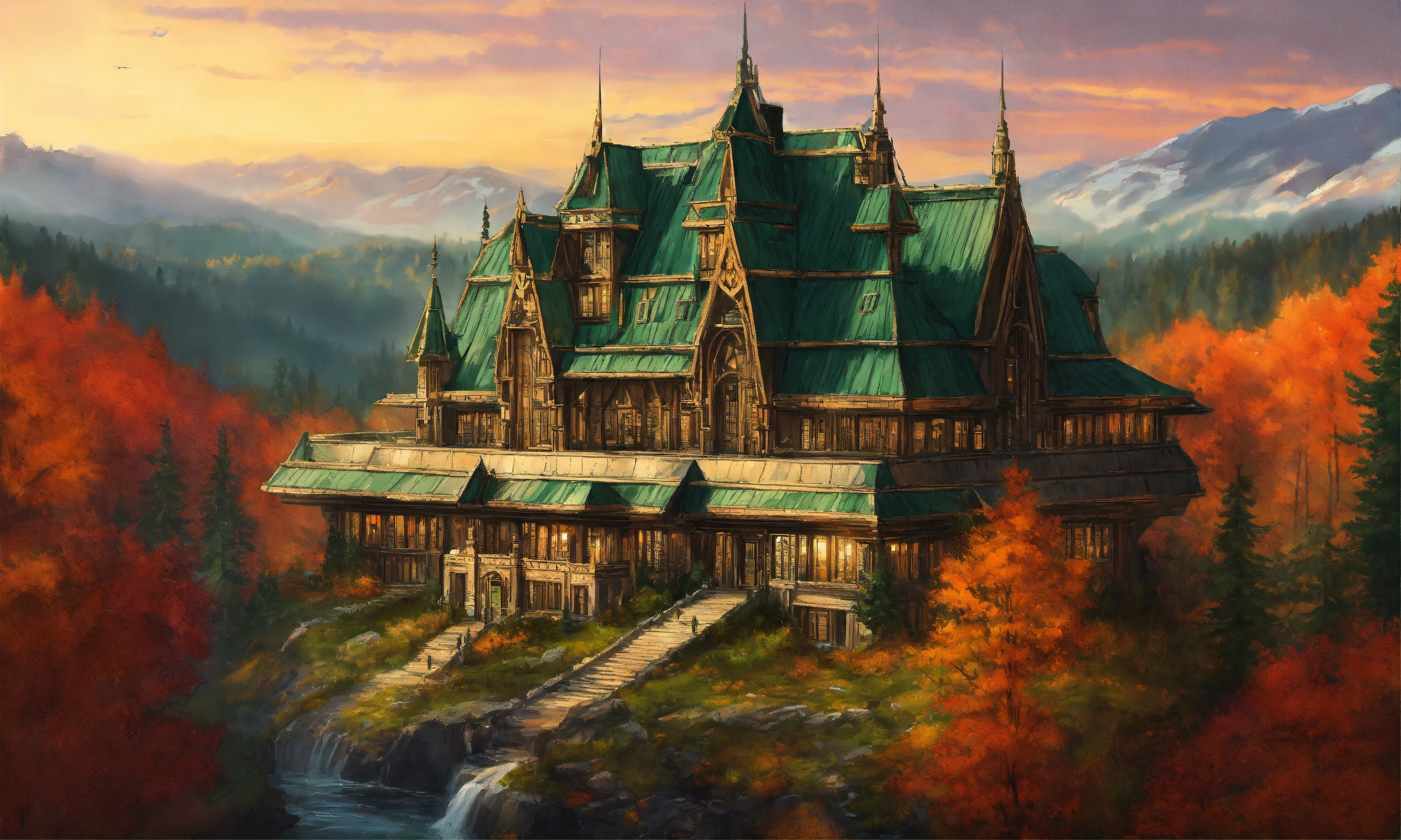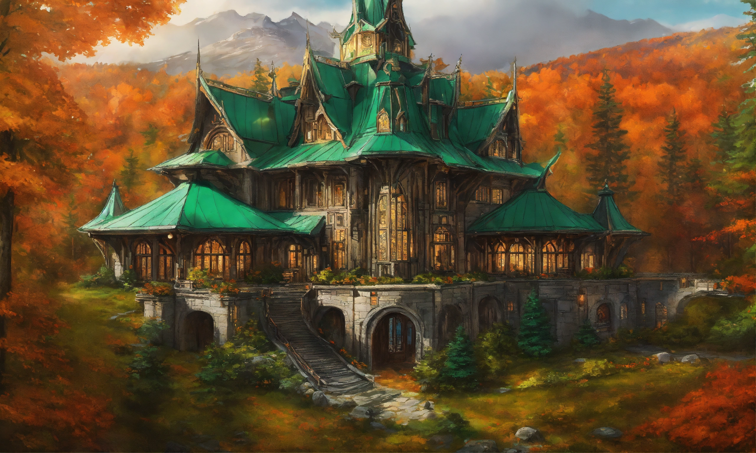 Drawing of the full image of a high elf sci fi palace with a dark green roof overlooking a pine forest in canada in the fall, elven architecture, immensely detailed