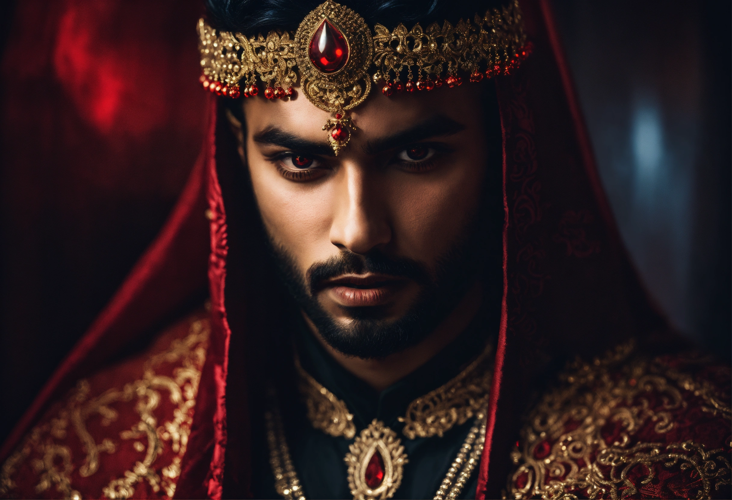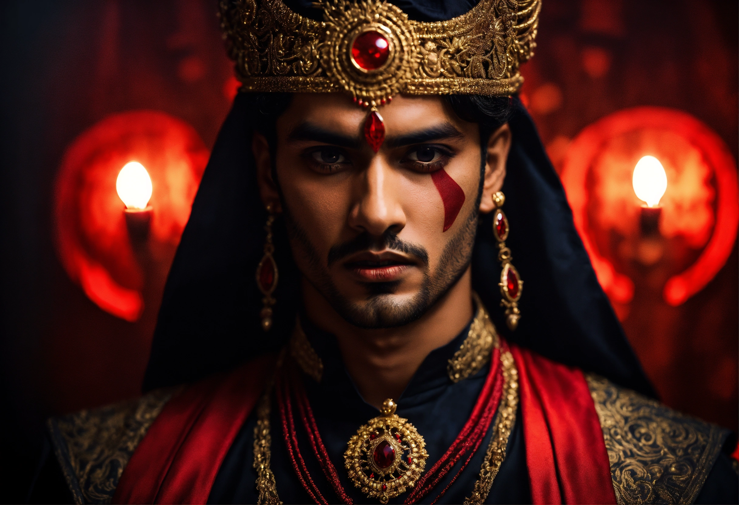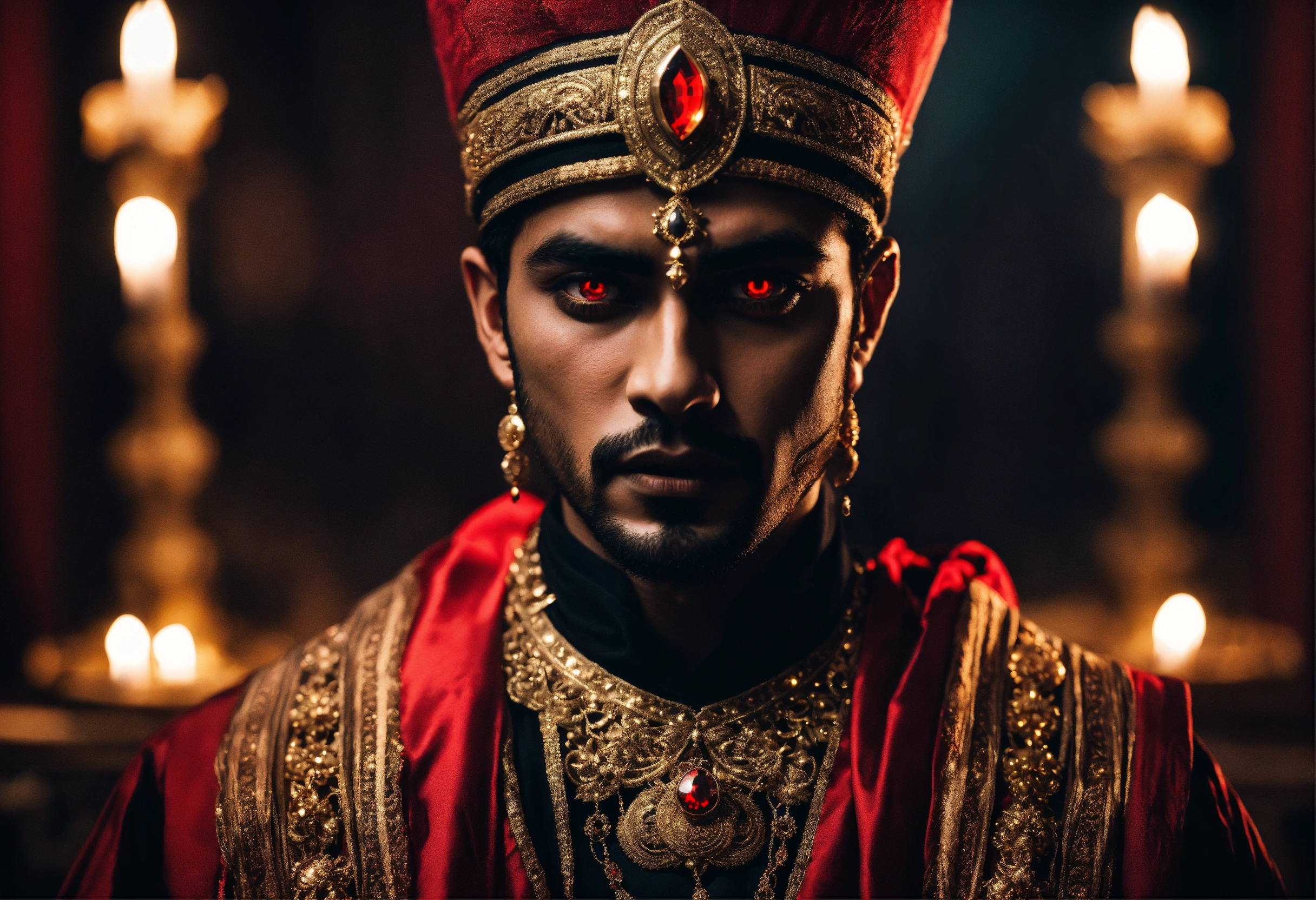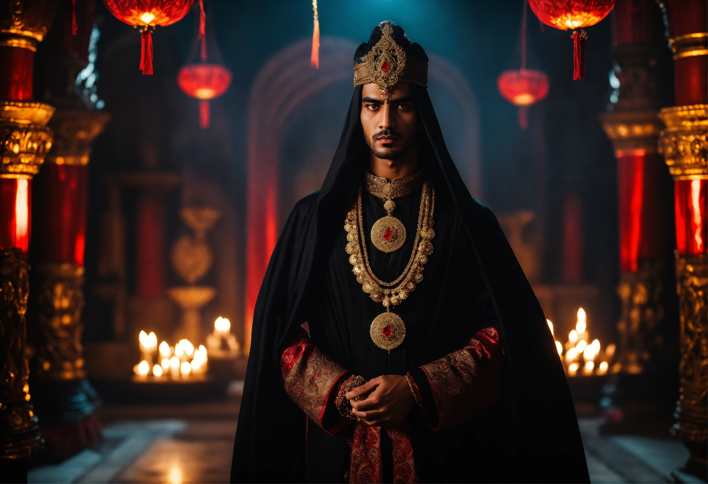 Dark, mysterious and dramatic headshot of a young handsome south asian evil sorcerer with glowing red hypnotic eyes wearing black ceremonial robes and ornate jewellery in a sinister occult temple