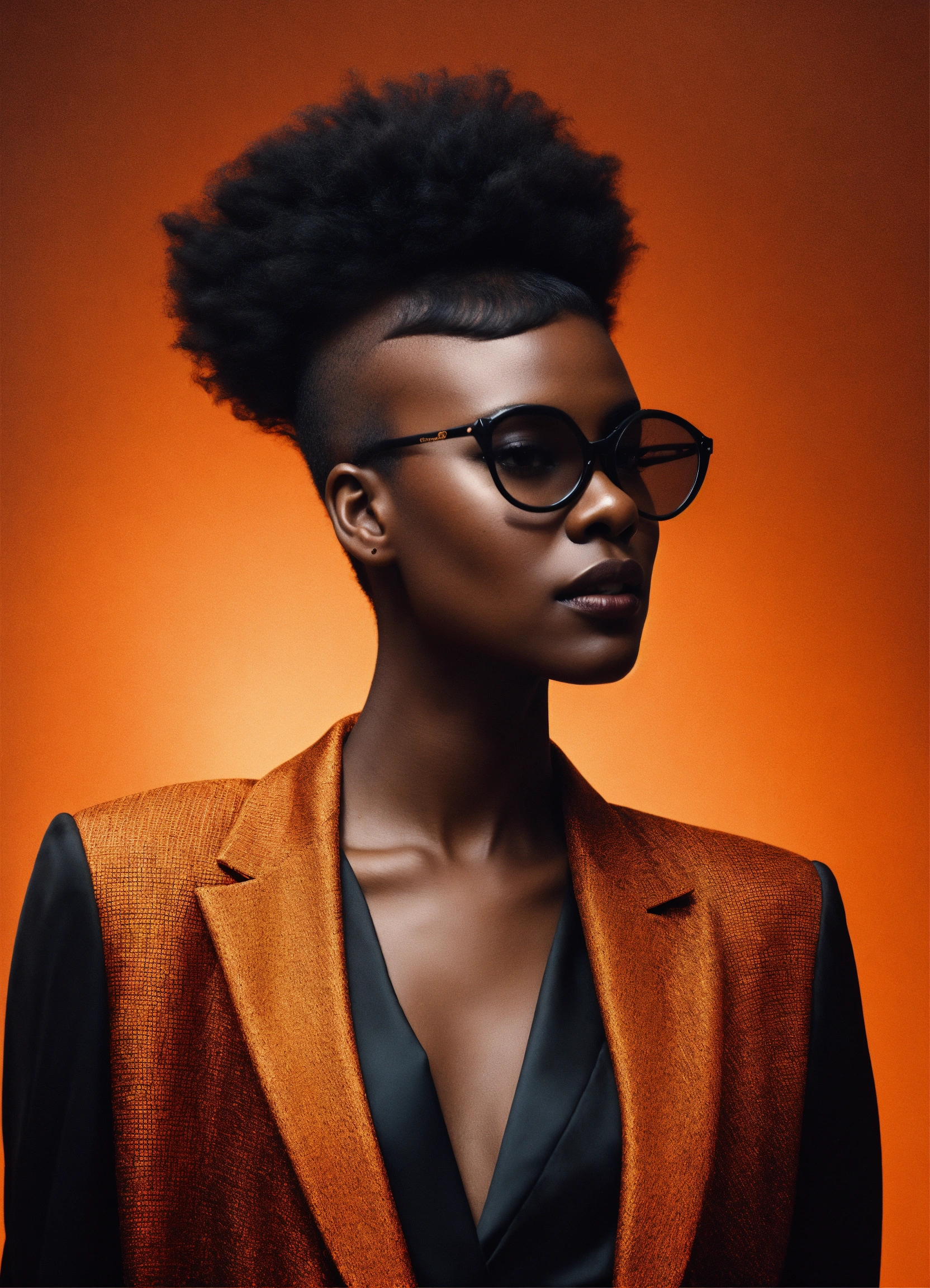 Portrait of a carmel complexion size 9 black woman by flora borsi, style by flora borsi, bold, bright coolers, mohawk haircut, ((flora borsi))