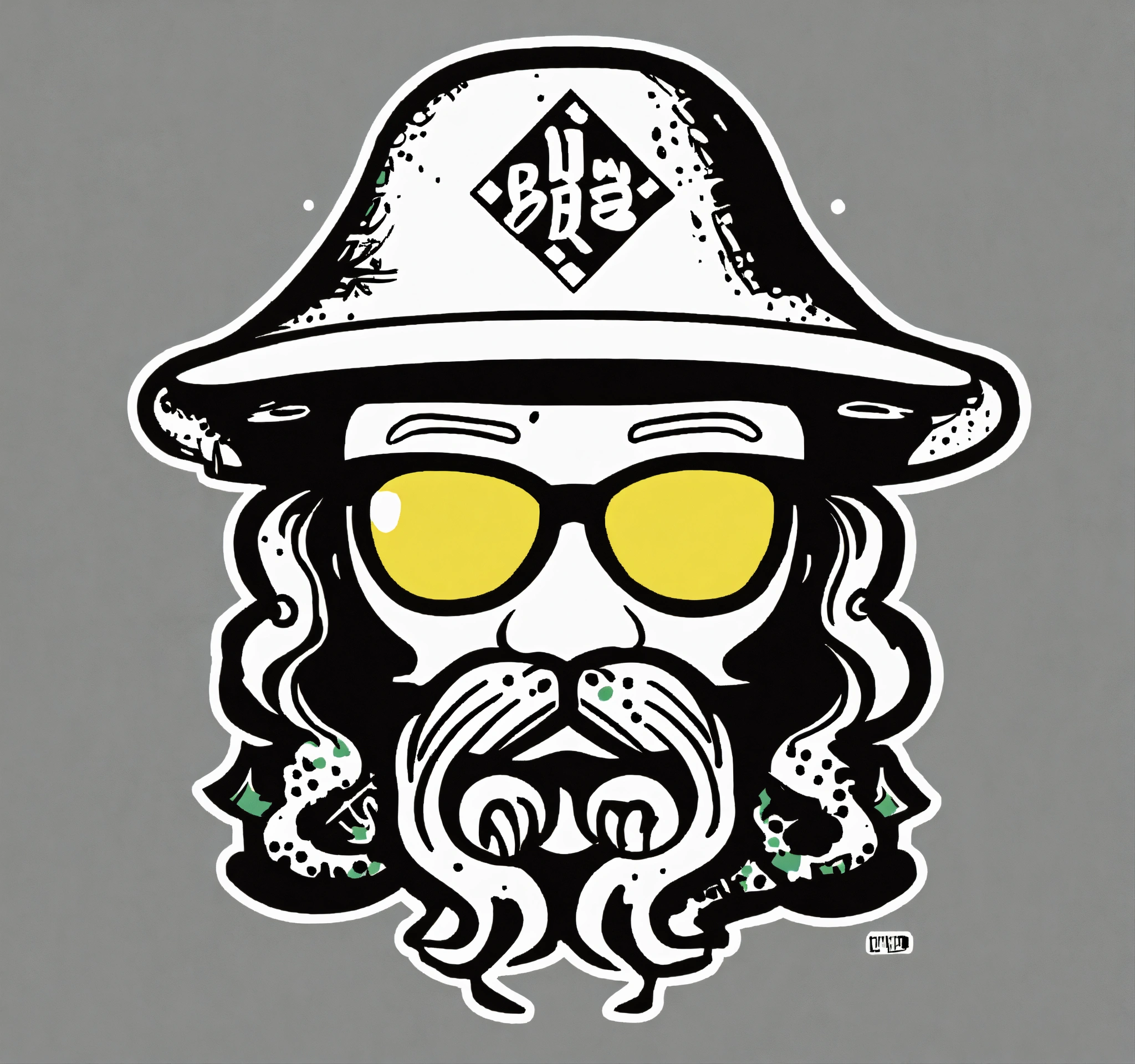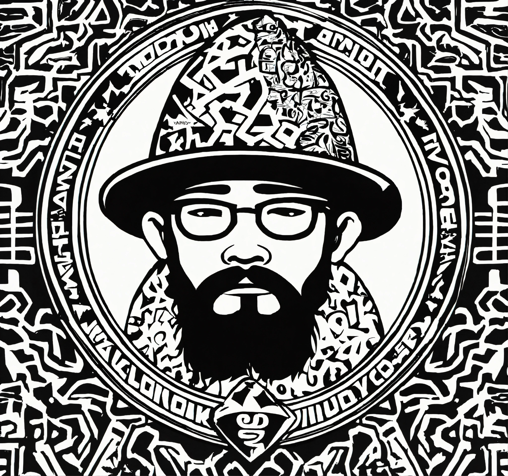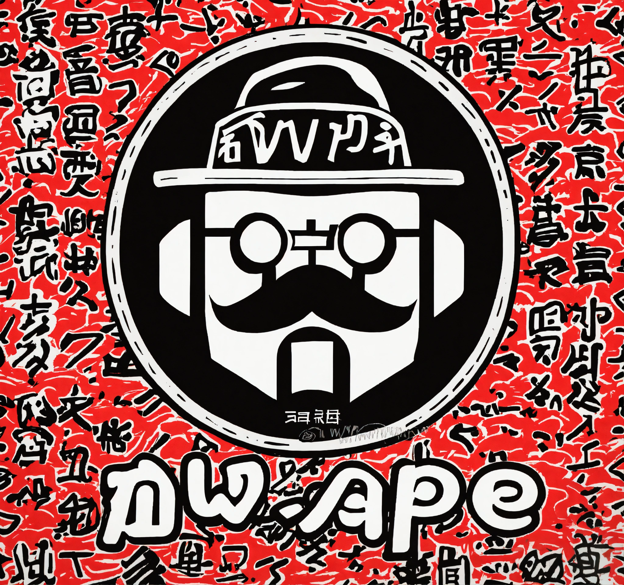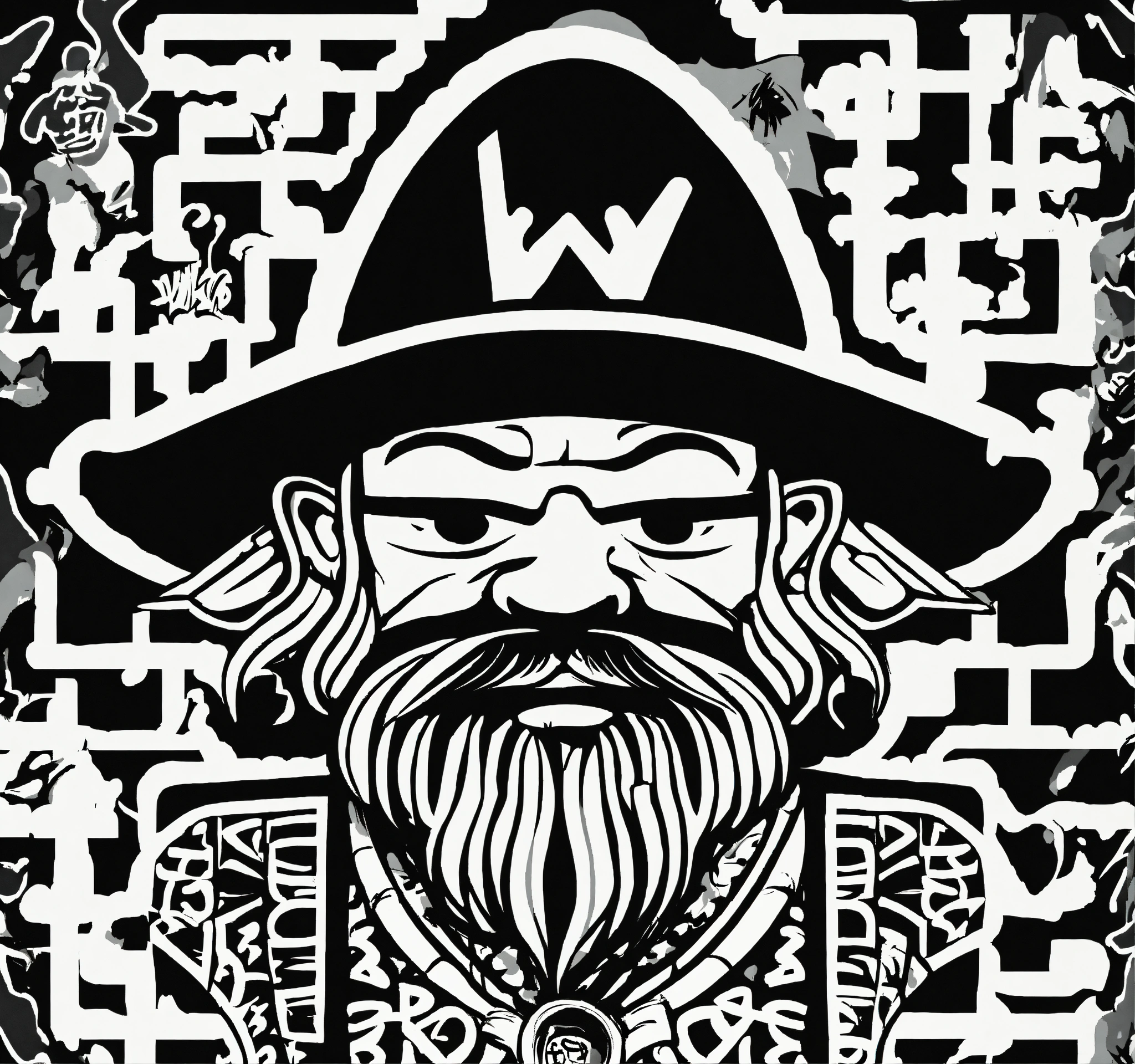 Keith harring style japanese bape graffiti cartoon logo design of the "wizard", nigo boondock's inspired flat vector, fashion company logo, andy warhol style, color black and white, white background.