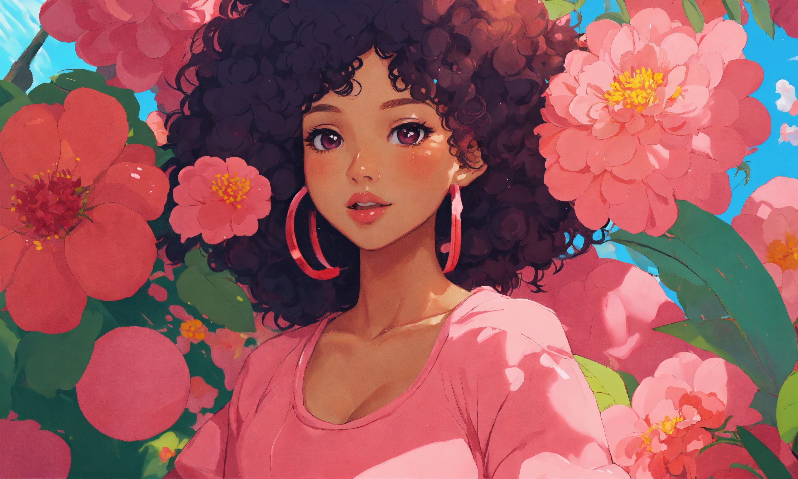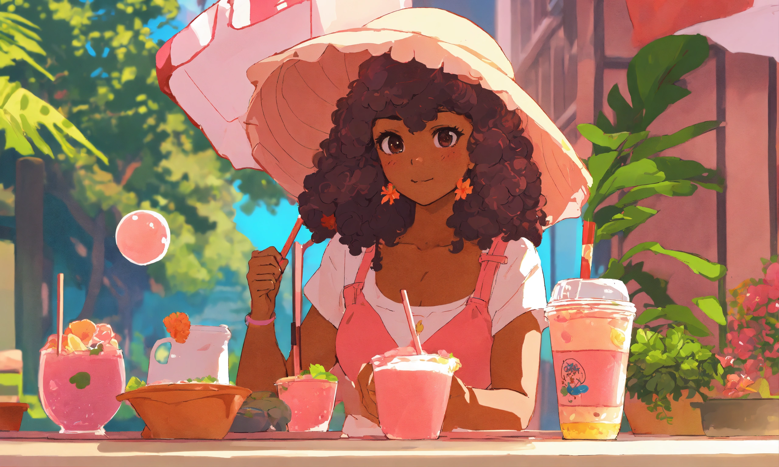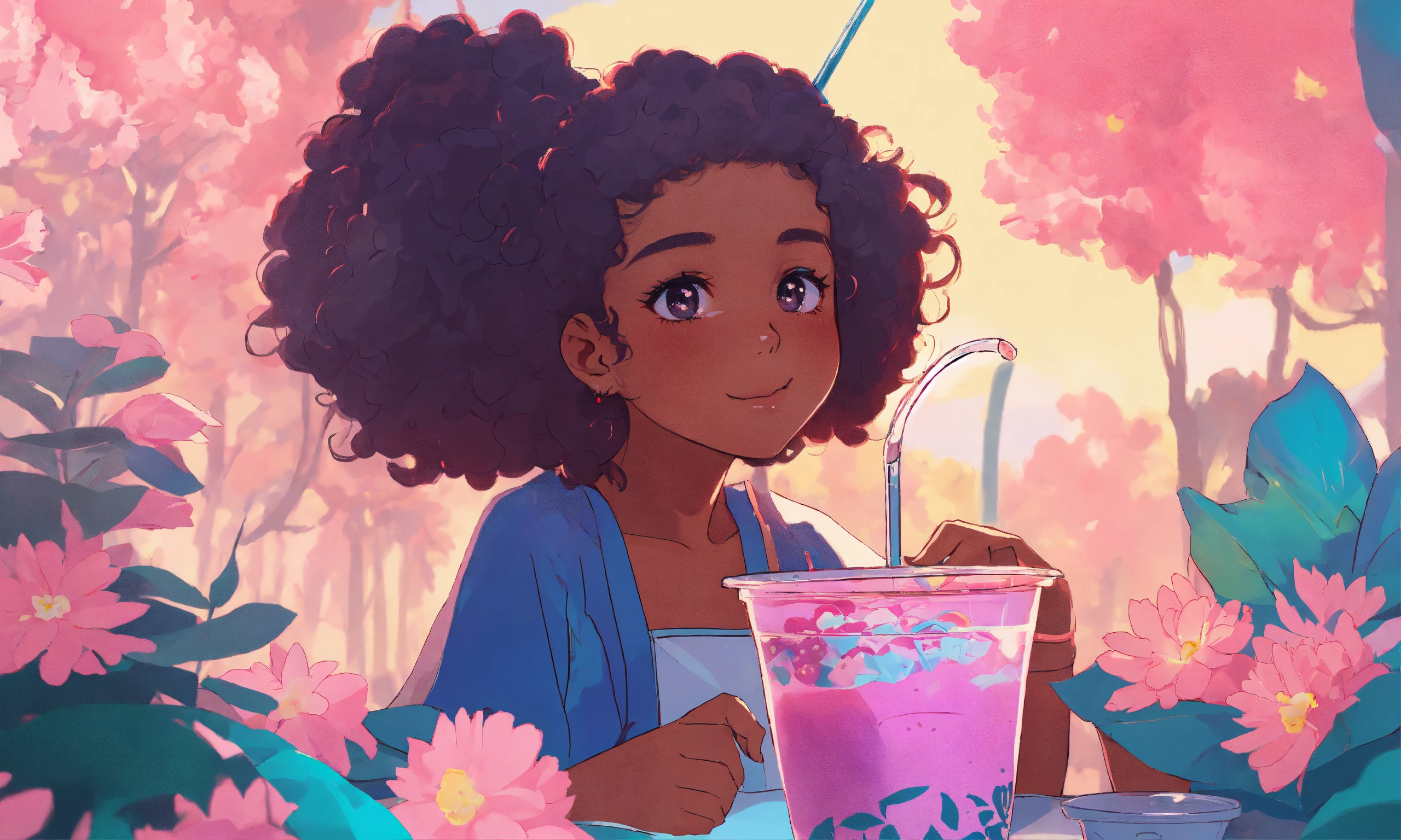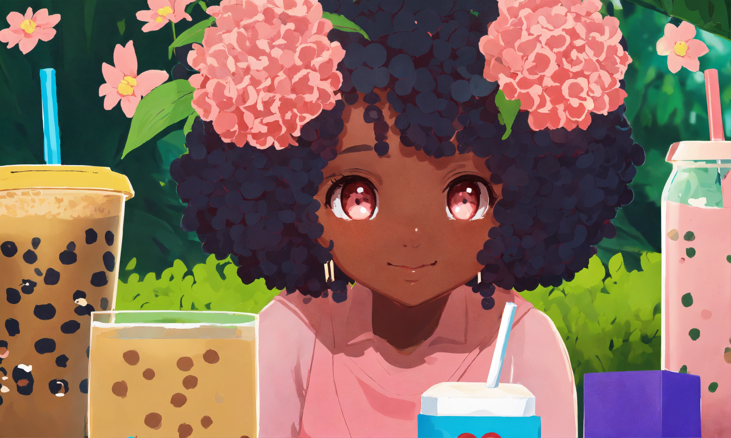 Bubble tea vector, love, adorable, pink fowers, bubble tea, milk tea, island girl, tropical, exotic flowers, bubble tea, bubble tea, cute girl, curly hair, cute waifu, afro, rosy cheeks, coral pink, girlie, style of laurie greasley, studio ghibli, akira toriyama, james gilleard, genshin impact, trending pixiv fanbox, acrylic palette knife, 4k, vibrant colors, devinart, trending on artstation, low details.