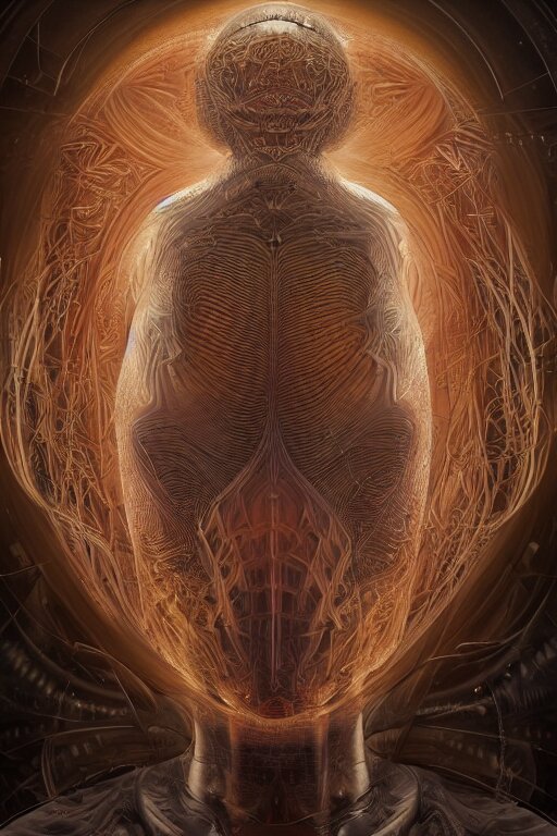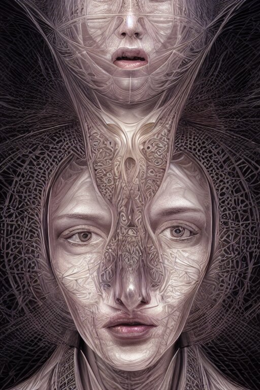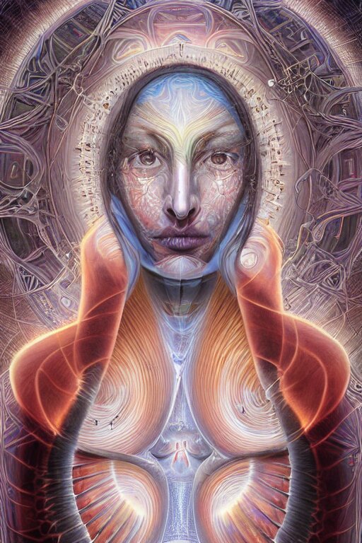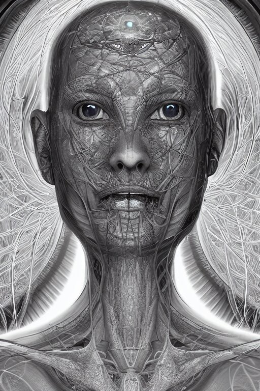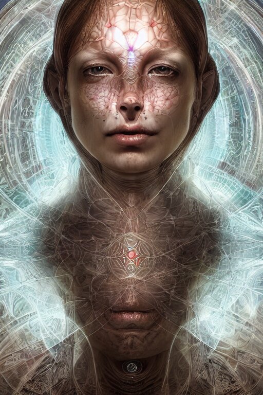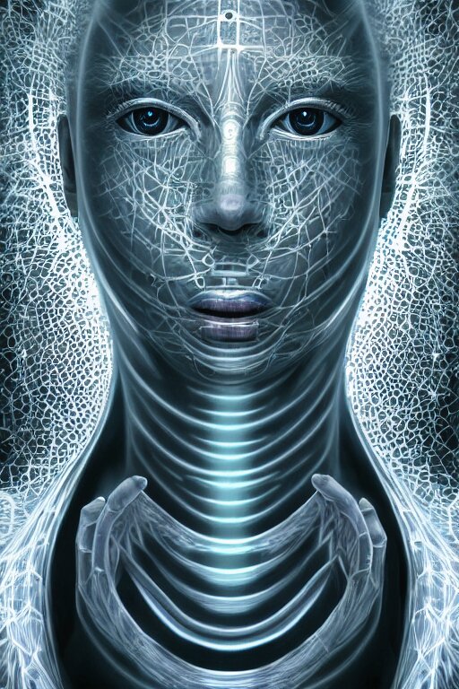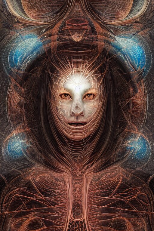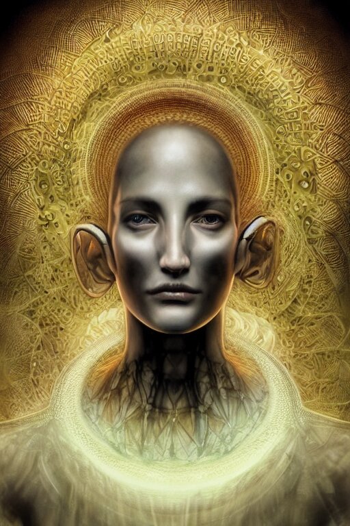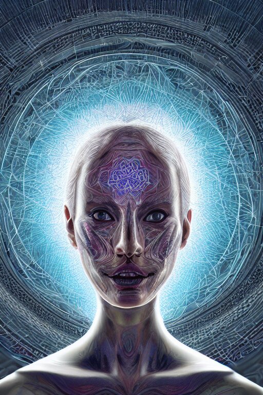 Cinematic portrait of an ai. centered, uncut, unzoom, symmetry. charachter illustration. dmt entity manifestation. surreal render, ultra realistic, zenith view. made by hakan hisim feat cameron gray and alex grey. polished. inspired by patricio clarey, heidi taillefer scifi painter glenn brown. slightly decorated with sacred geometry and fractals. extremely ornated. artstation, cgsociety, unreal engine, ray tracing, detailed illustration, hd, 4k, digital art, overdetailed art. intricate omnious visionary concept art, shamanic arts ayahuasca trip illustration. extremely psychedelic. dslr, tiltshift, dof. 64megapixel. complementing colors. remixed by lyzergium.art feat binx.ly and machine.delusions. zerg aesthetics. trending on artstation, deviantart