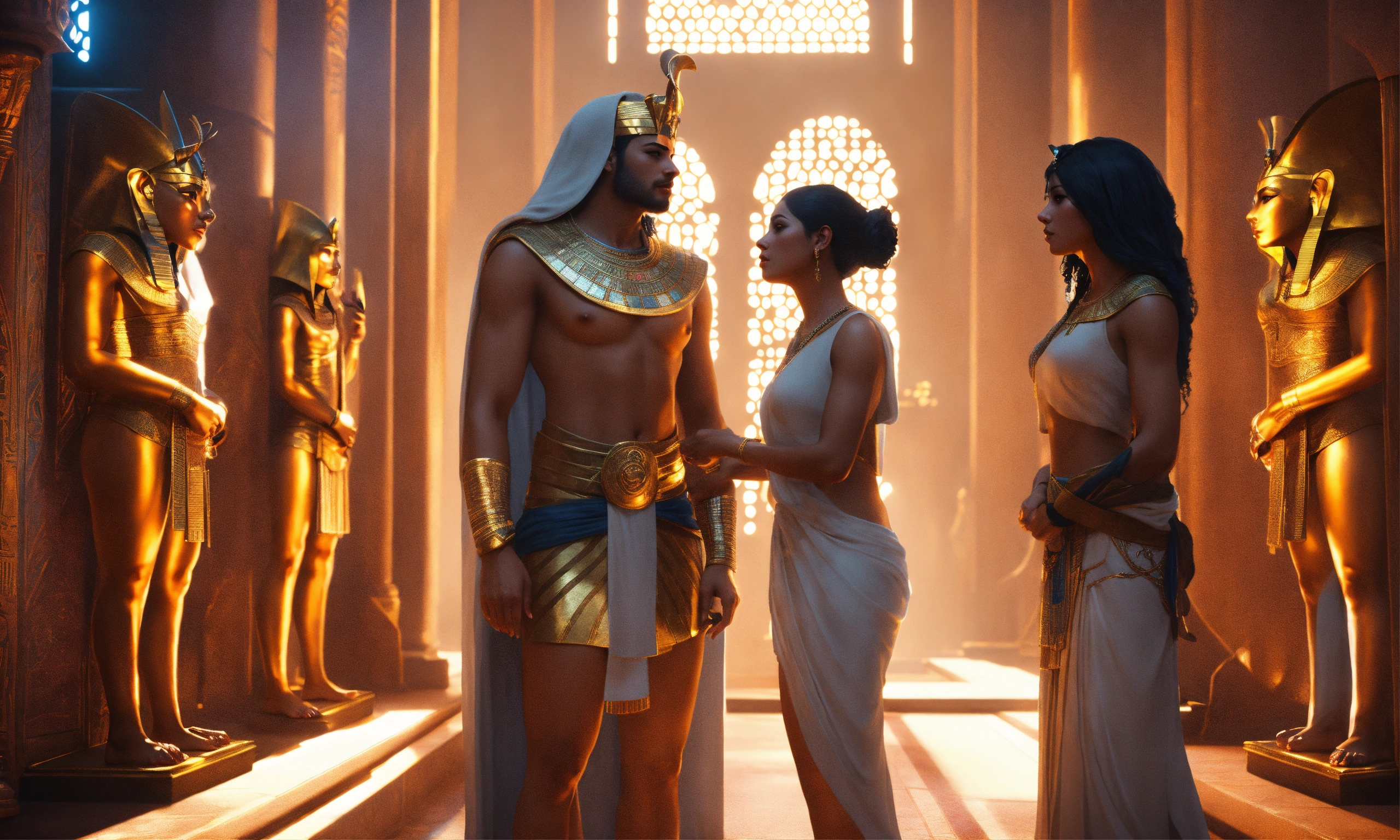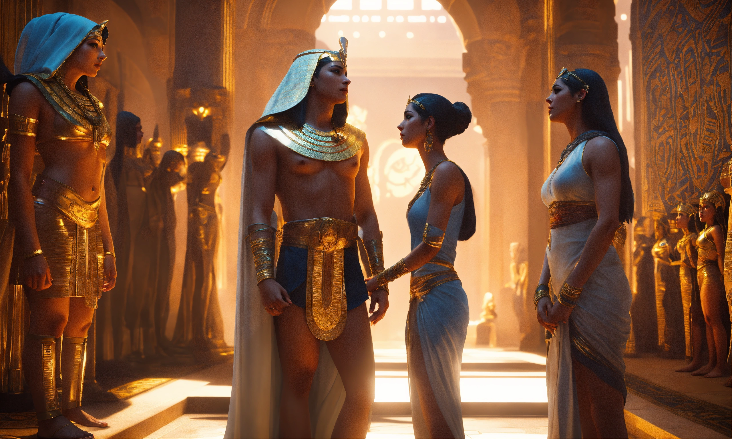 Pharaoh of ancient egypt talking to two women who are bowing at his feet, cinematic lighting, complex, elegant, super highly detailed, art station, concept art, smooth, sharp focus, no blur, no dof, extreme illustration, unreal engine 5, photorealism, hd quality, 8k resolution, cinema 4d, 3d, beautiful, delicate, art by artgerm and greg rutkowski and alphonse mucha and loish and wlop
