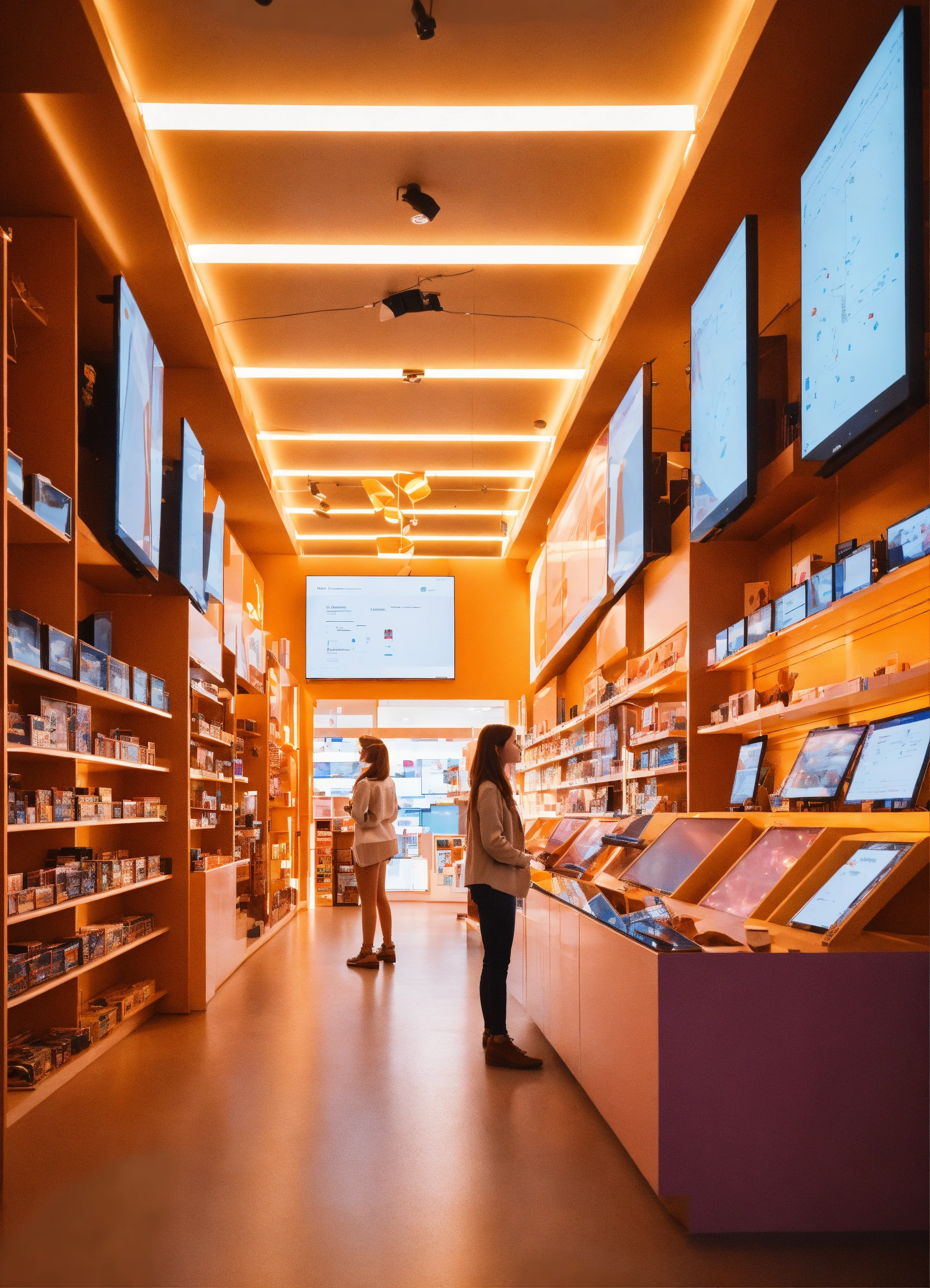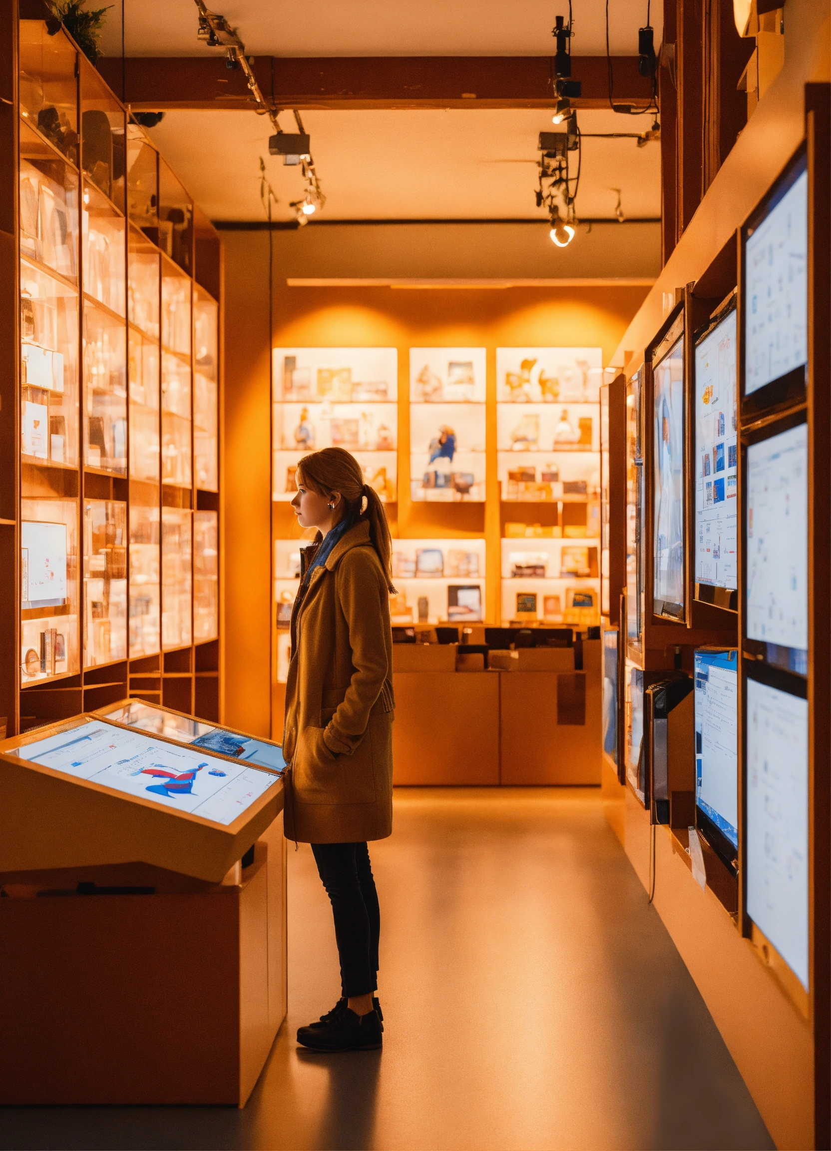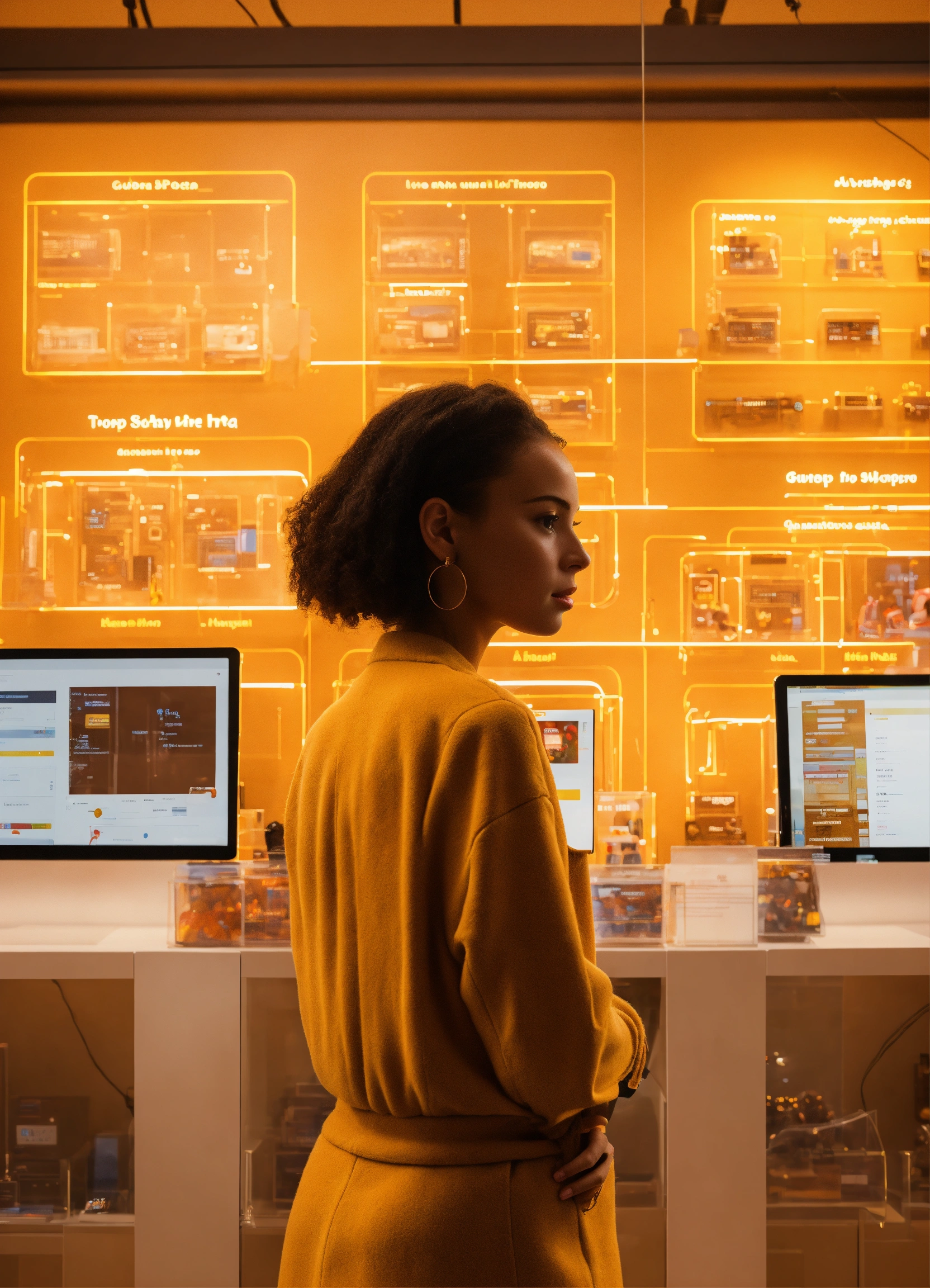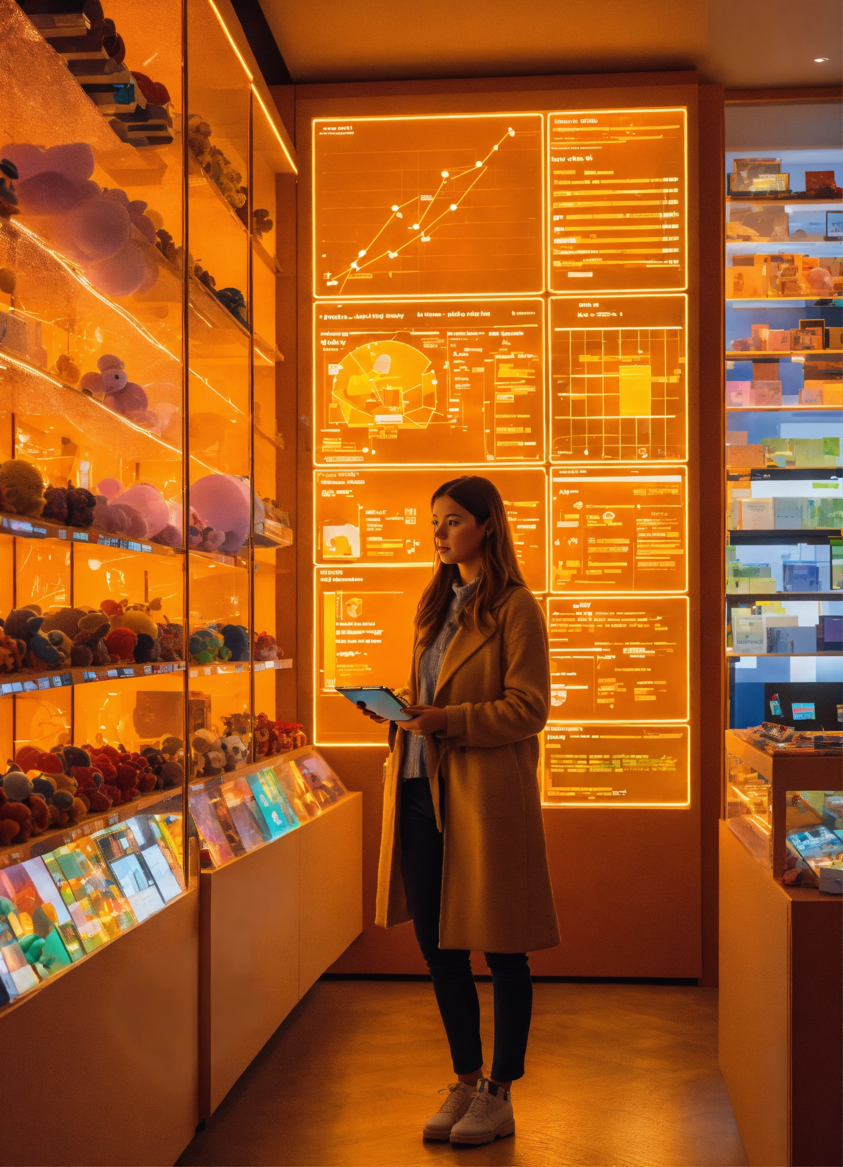 Portrait of a woman in a cutting-edge toy shop with lots of screens on the wall with data diagrams assisting customers, amber hue, the shop offers live customer support