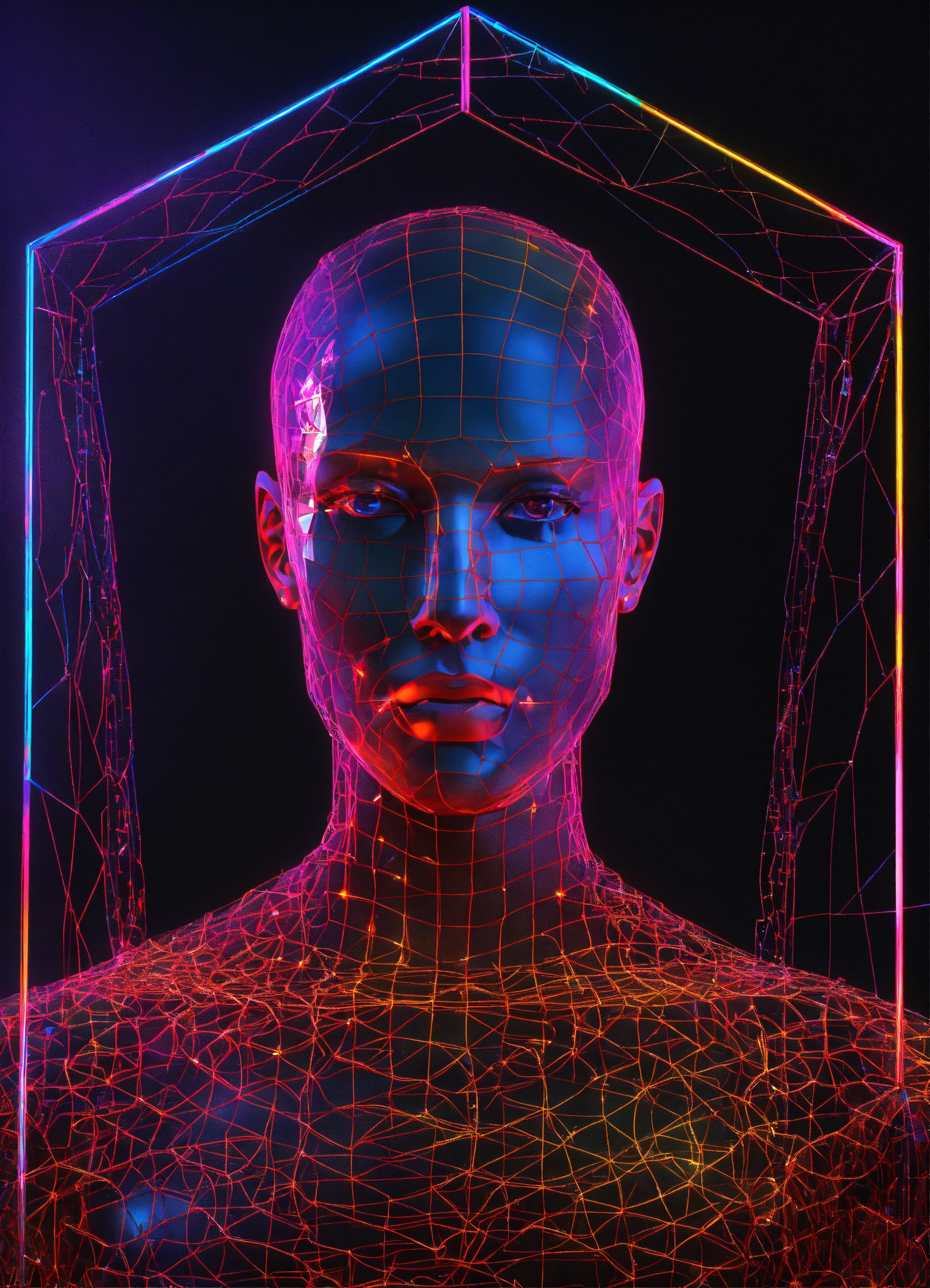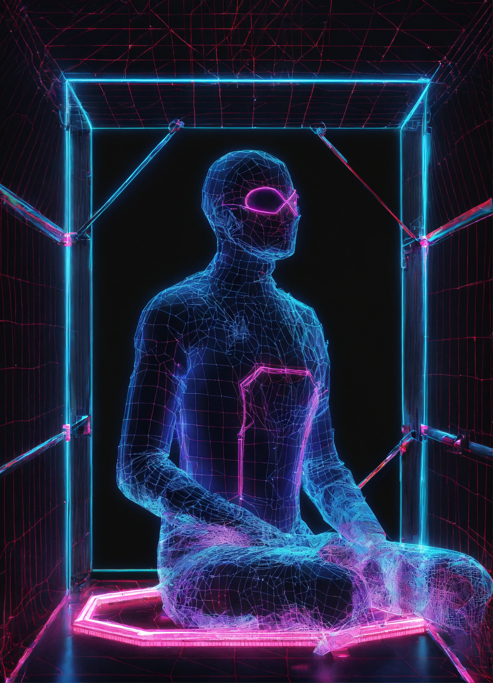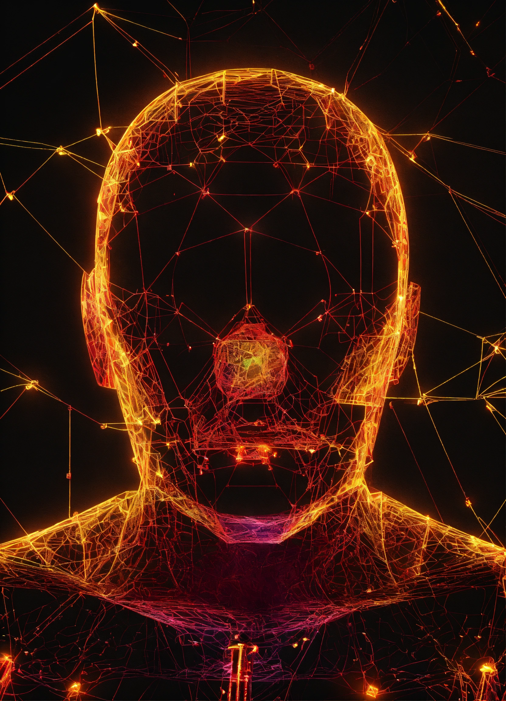 Digital transparent wire neon frame human polygon with small spiders 3d style on black net