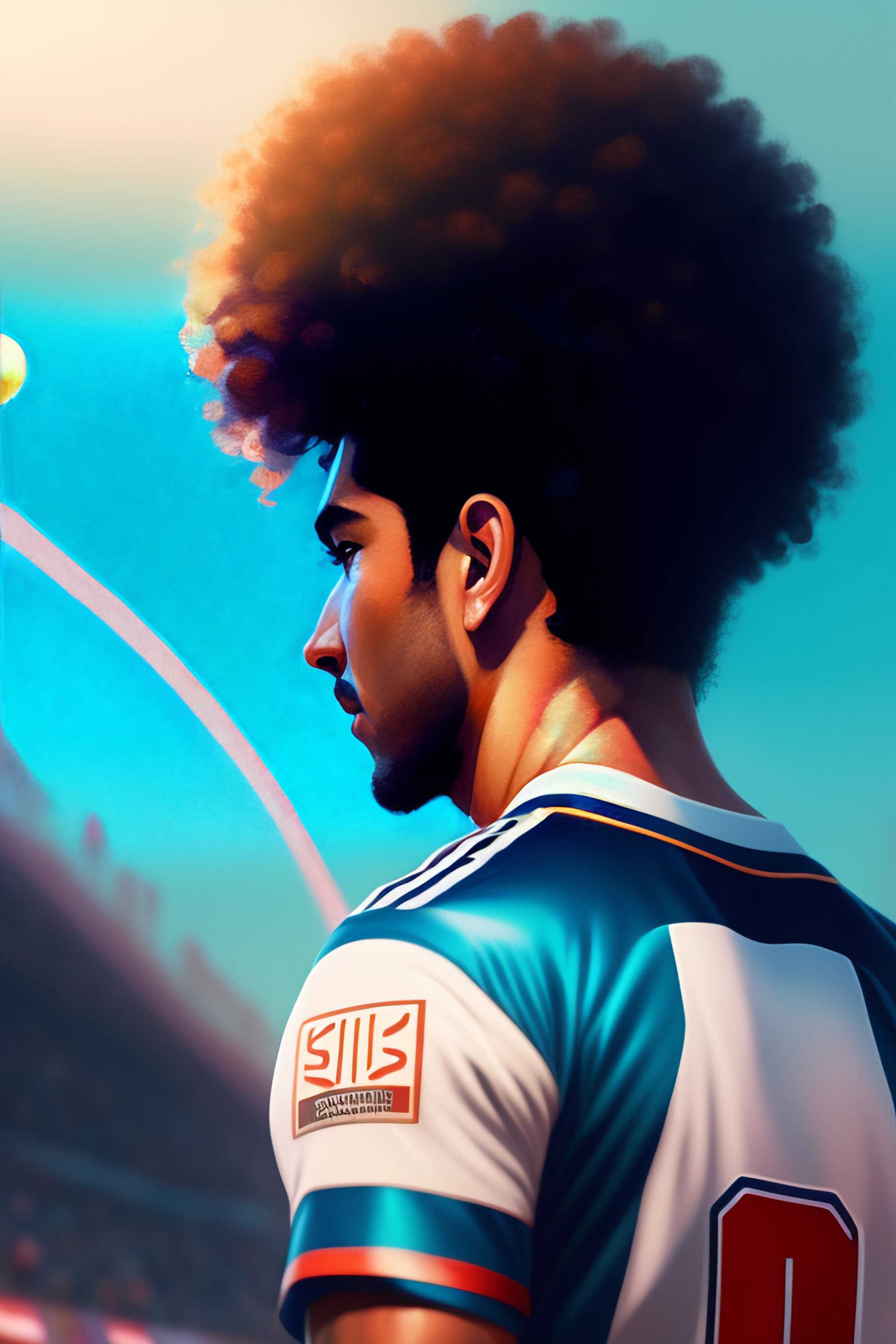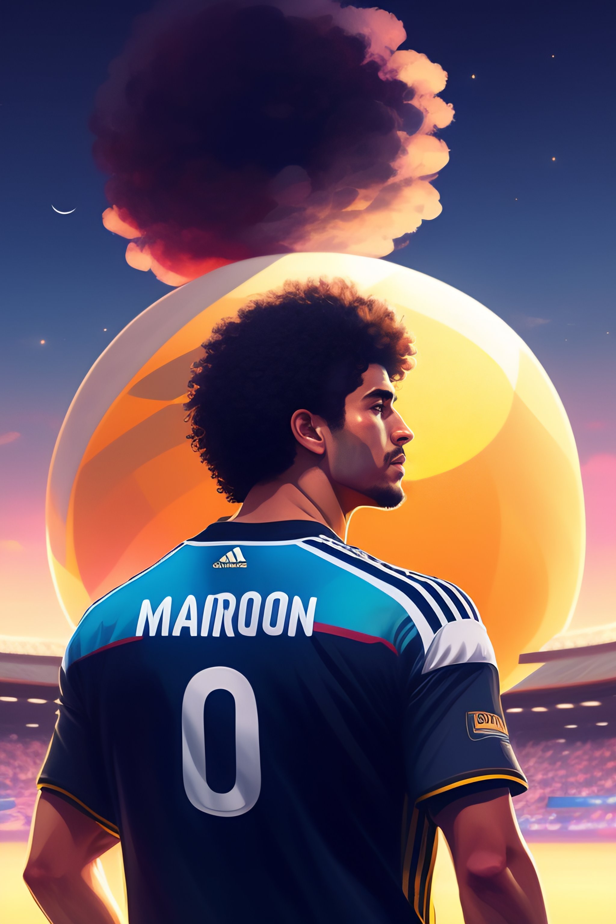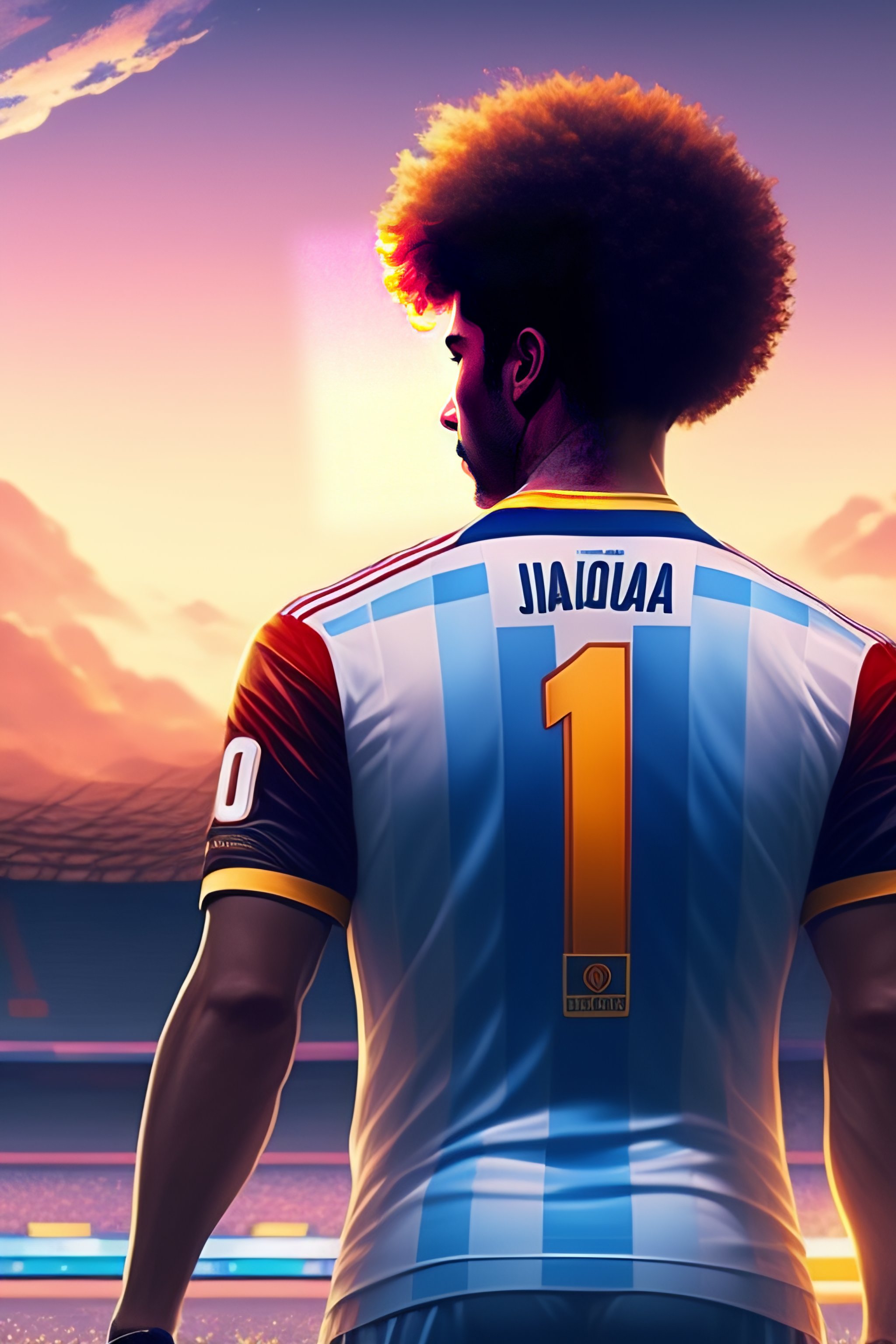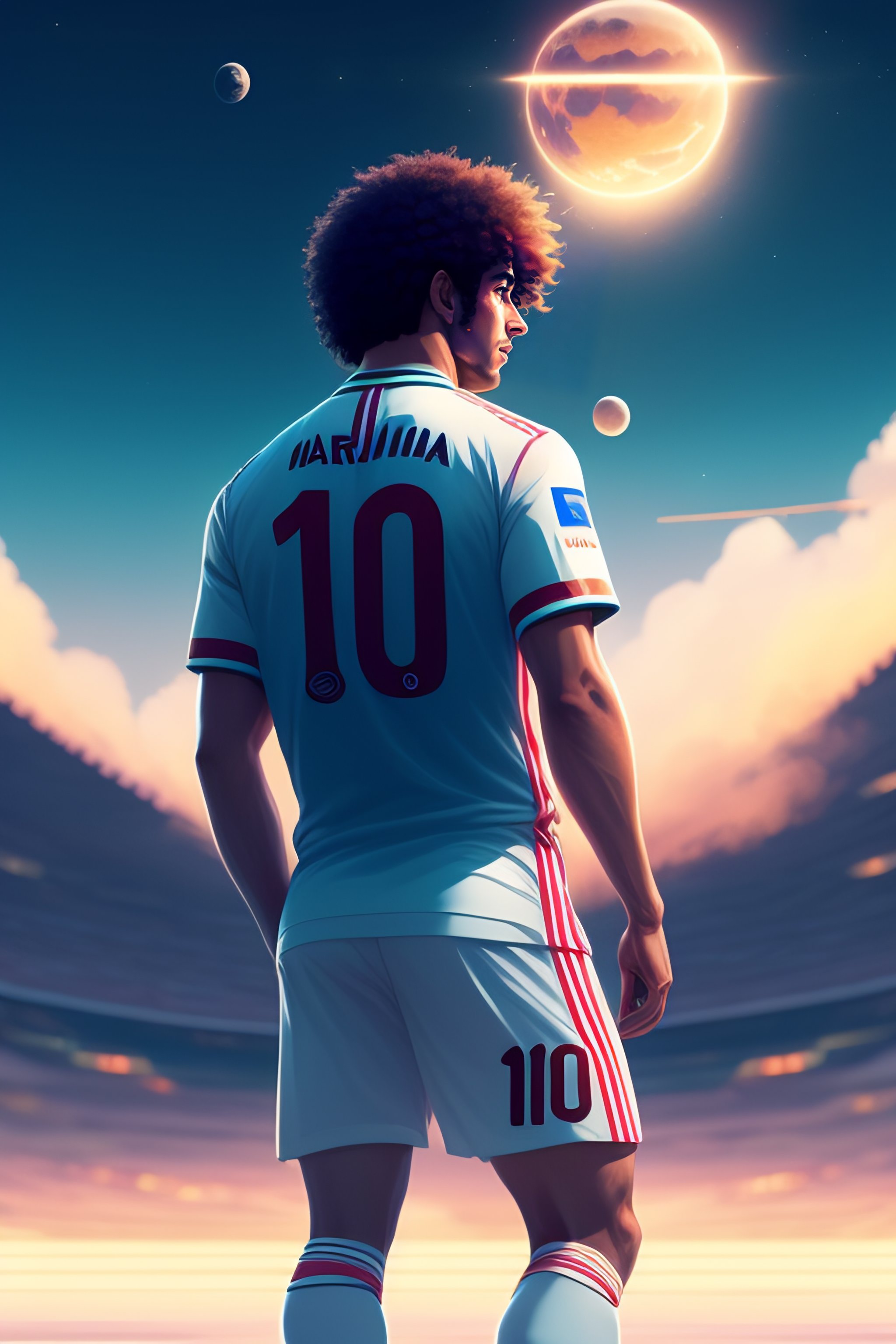 Back of a argentine footballer of maradona with curly hair wearing 10 argentine team jersey playing football, backdrop of dawn, saturn in the background, illustration, concept art, anime, key visual, trending pixiv fanbox by wlop and greg rutkowski and makoto shinkai and mamoru hosada and studio ghibli