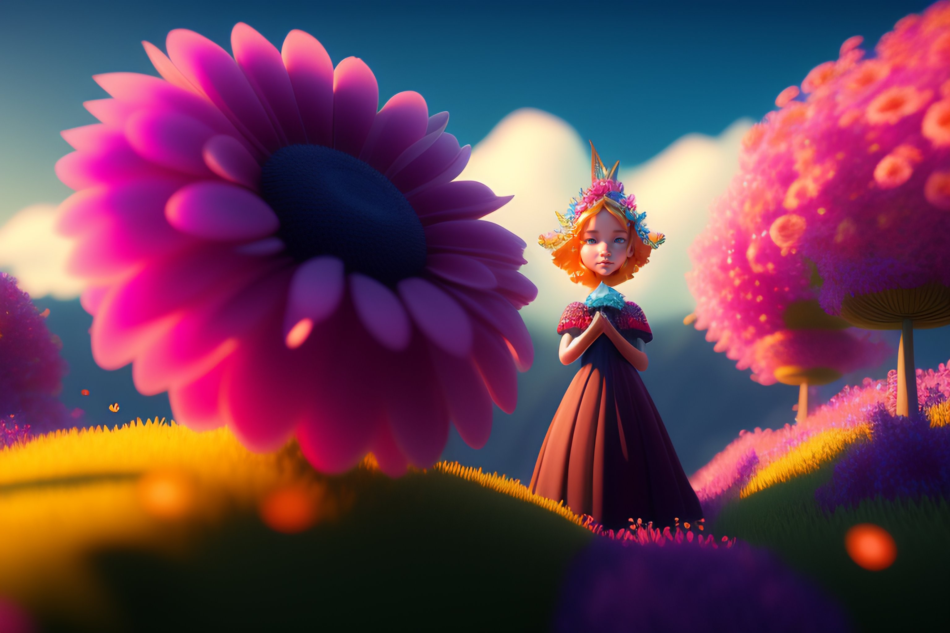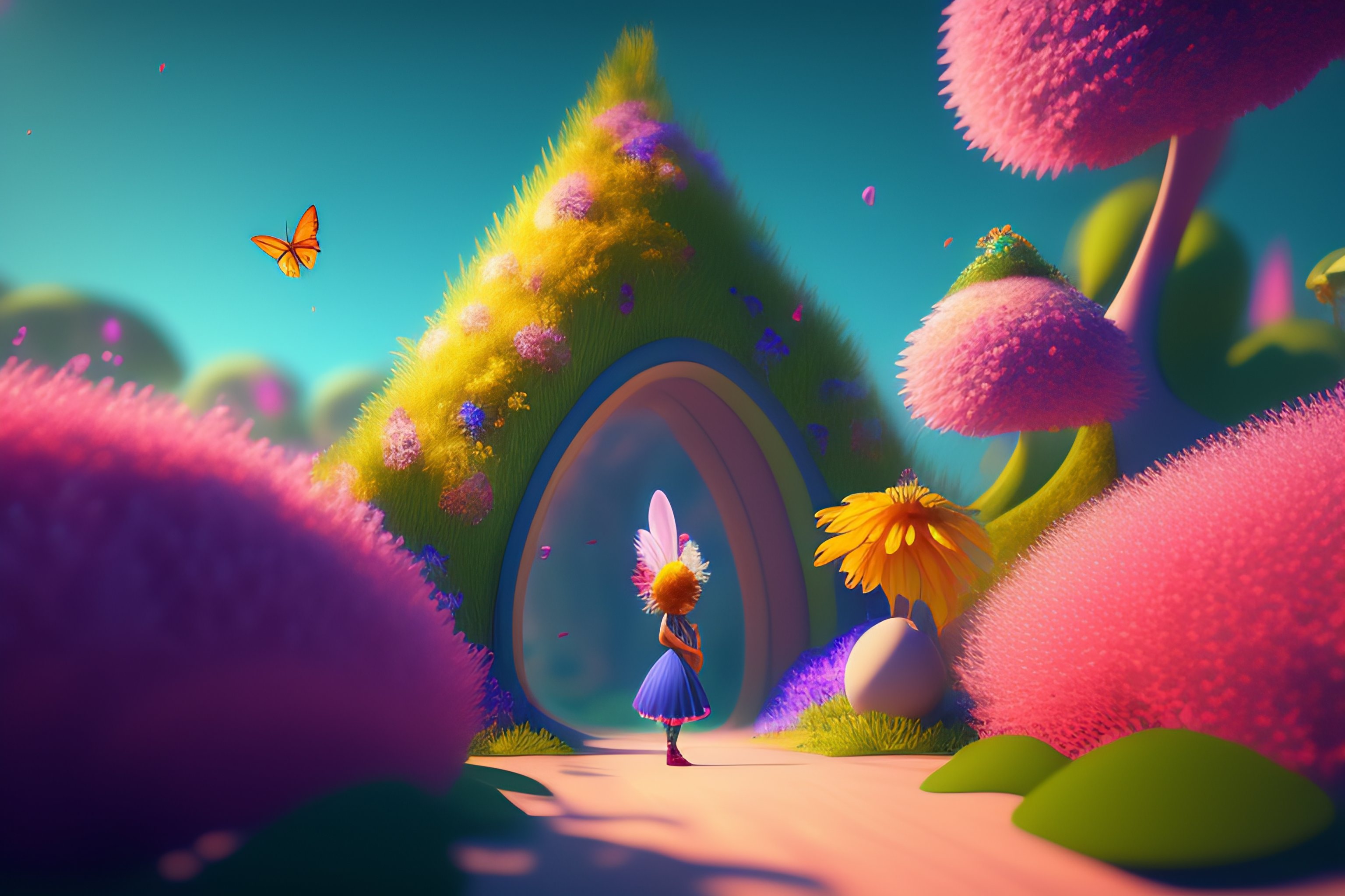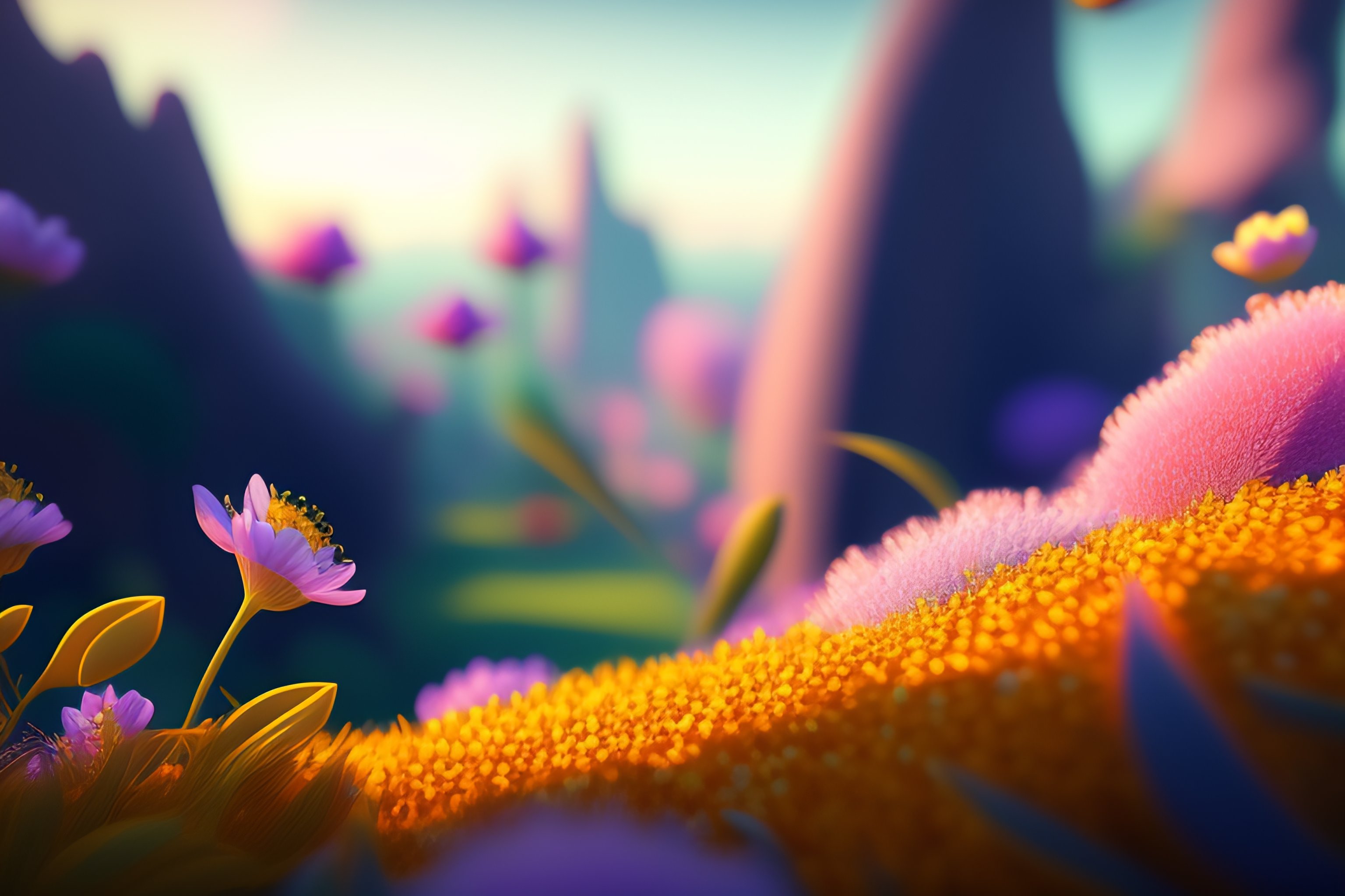 First person perspective digital illustration of a whimsical fairy smelling a flower, by eyvind earle, dr. seuss:1|flowers by dr. seuss, petals blowing in the breeze, colorful rolling hills of beautiful flowers, wide angle panoramic by industrial light and magic, viewed from eye level:0.9|fantasy, cinematic:0.9|unreal engine, octane, final render, deviantart, artstation, artstation hq, behance, hd, 16k resolution:0.8