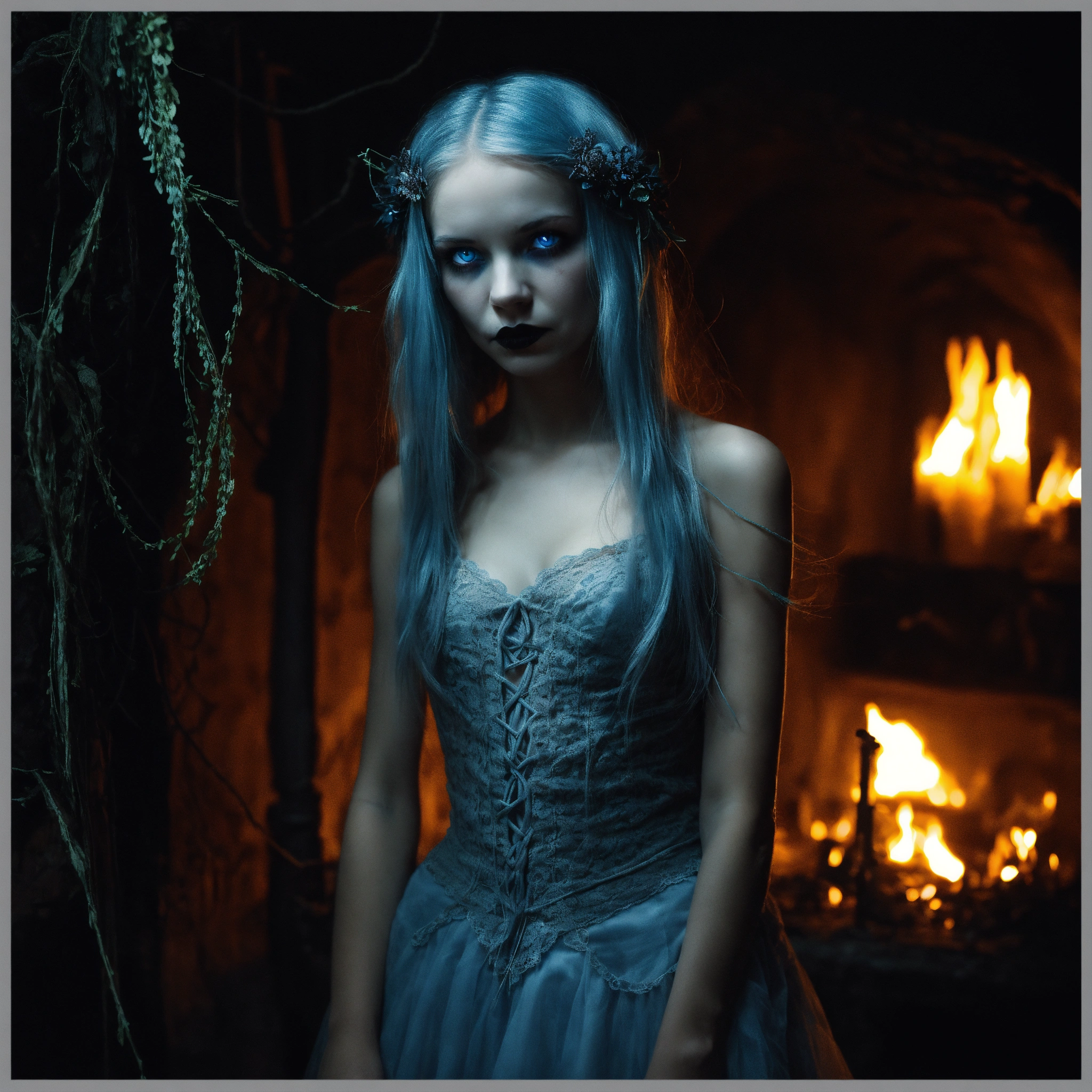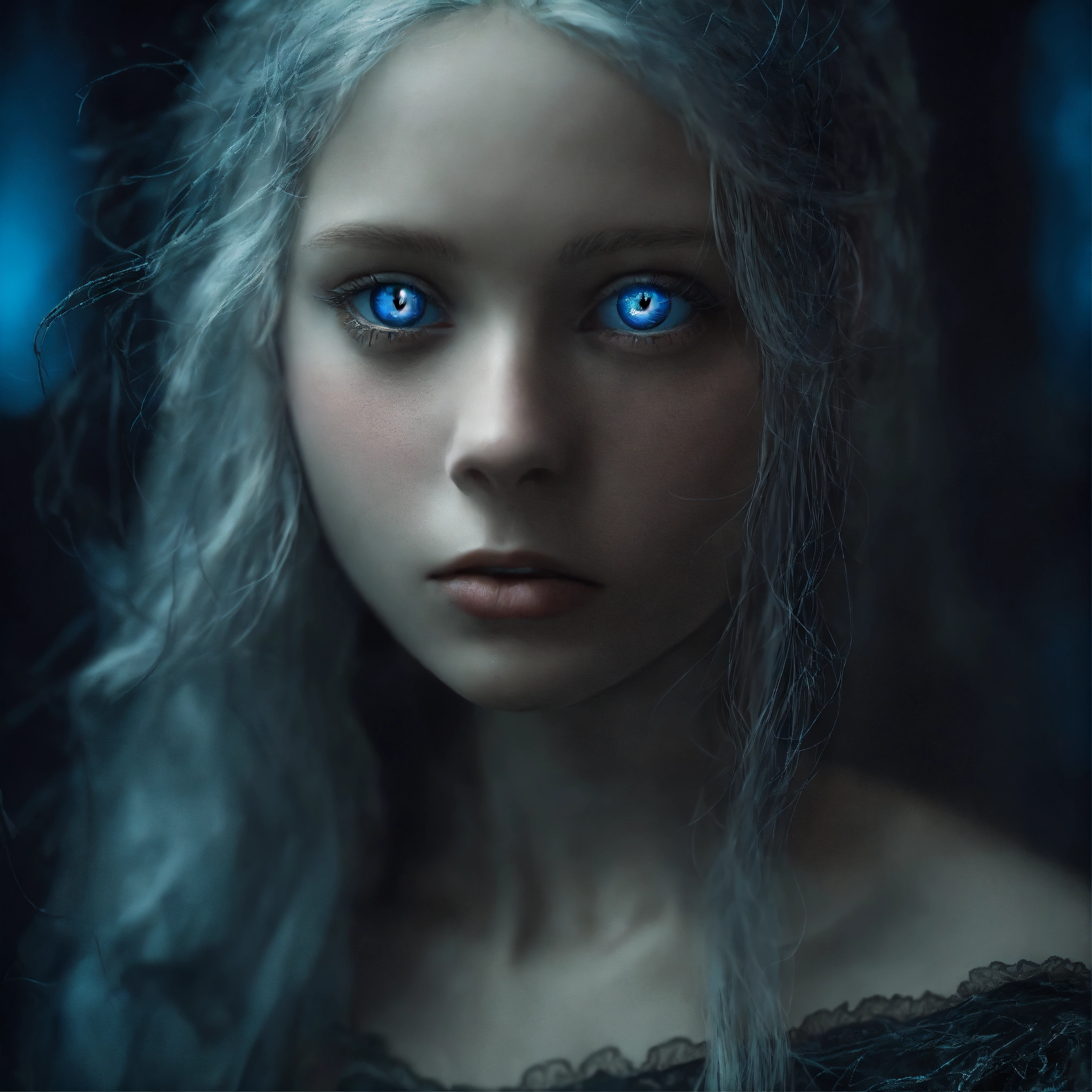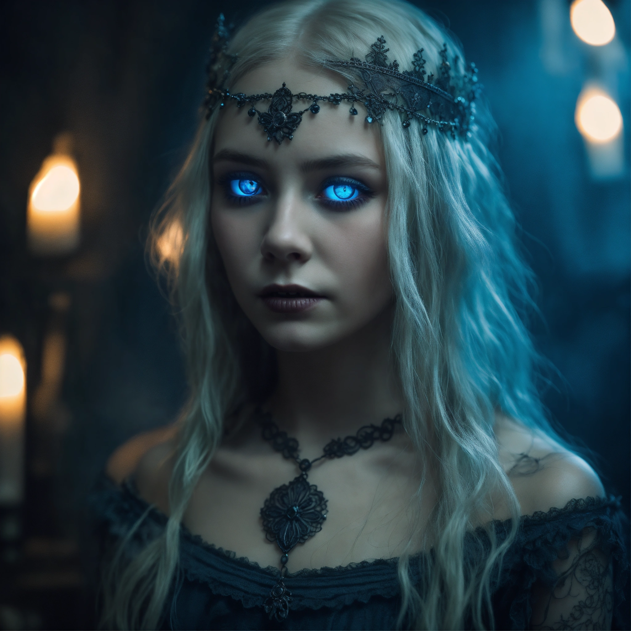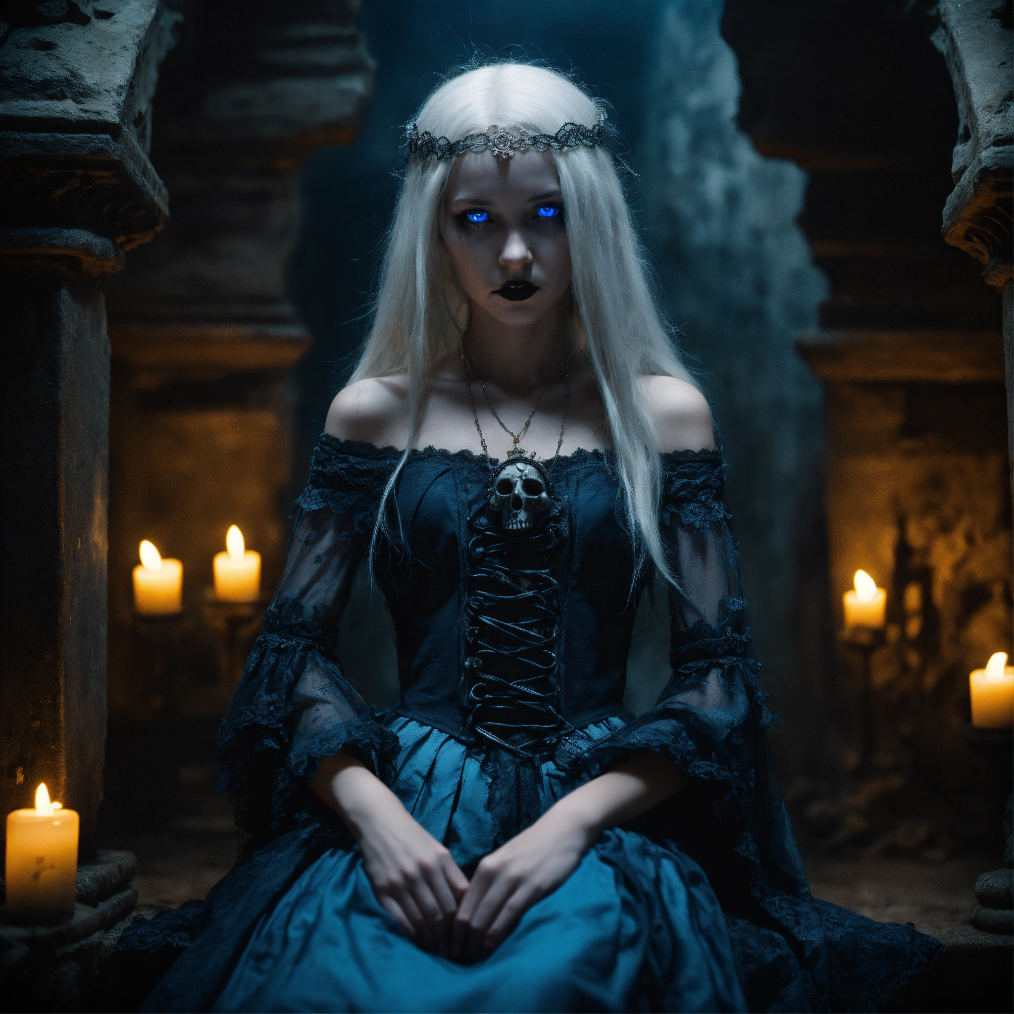 Body portrait, twelve year old childish female goth necromancer, very skinny and emaciated with long silverwhite hair and alabaster skin pale as a corpse and glowing blue eyes is overcome by darkness in a gloomy crypt, slim face, innocent looking, off-the-shoulder lace cropped corsett and skirt, lightly clad, childlike, juvenile, graceful, wispy, glowing blue eyes, ghostly, dead, evil, demonic, undead, darkness, grotesque, mysterious, dark, cold ambient lighting, focus on face, extremely detailed, fantasy, medieval setting