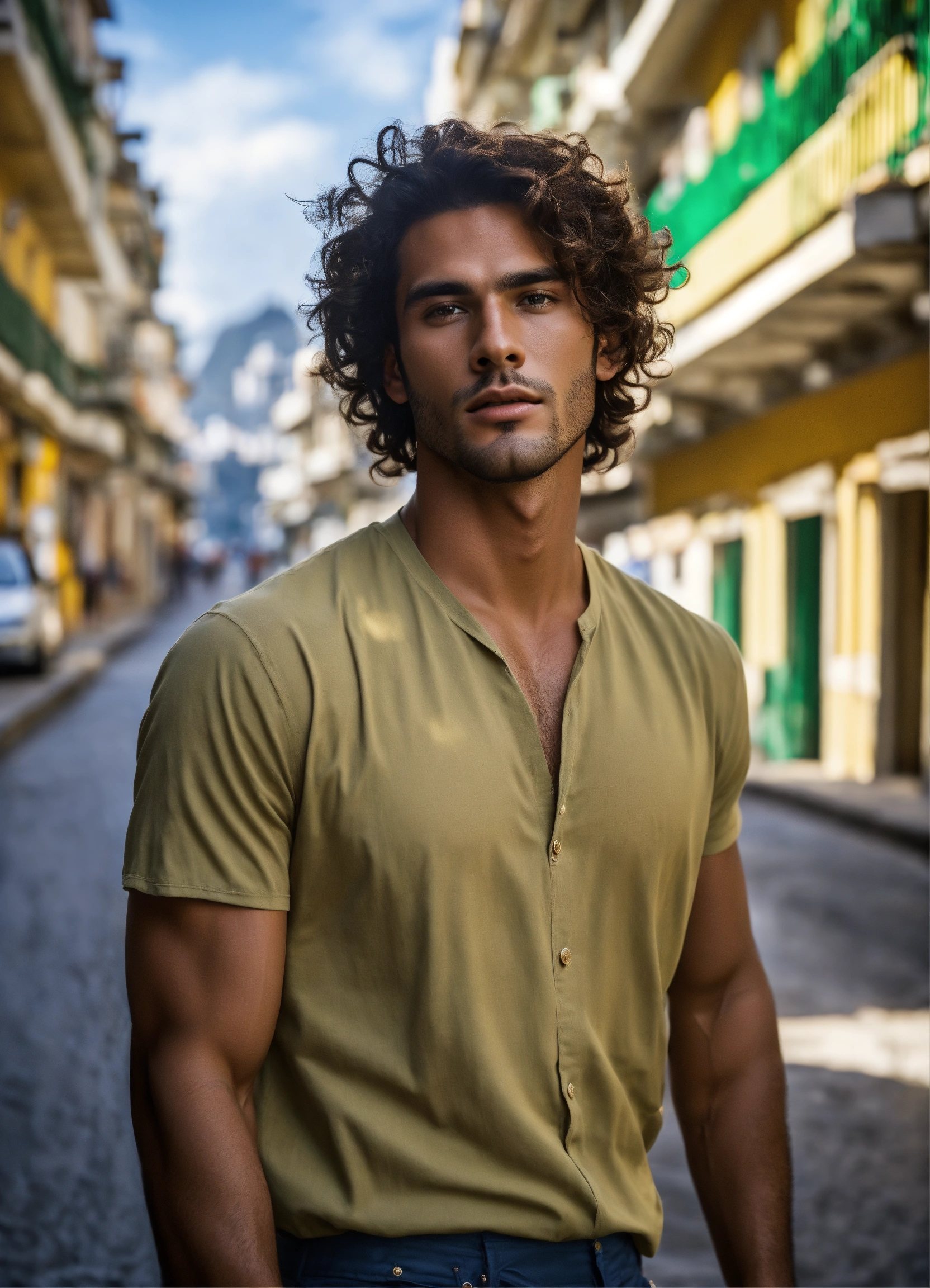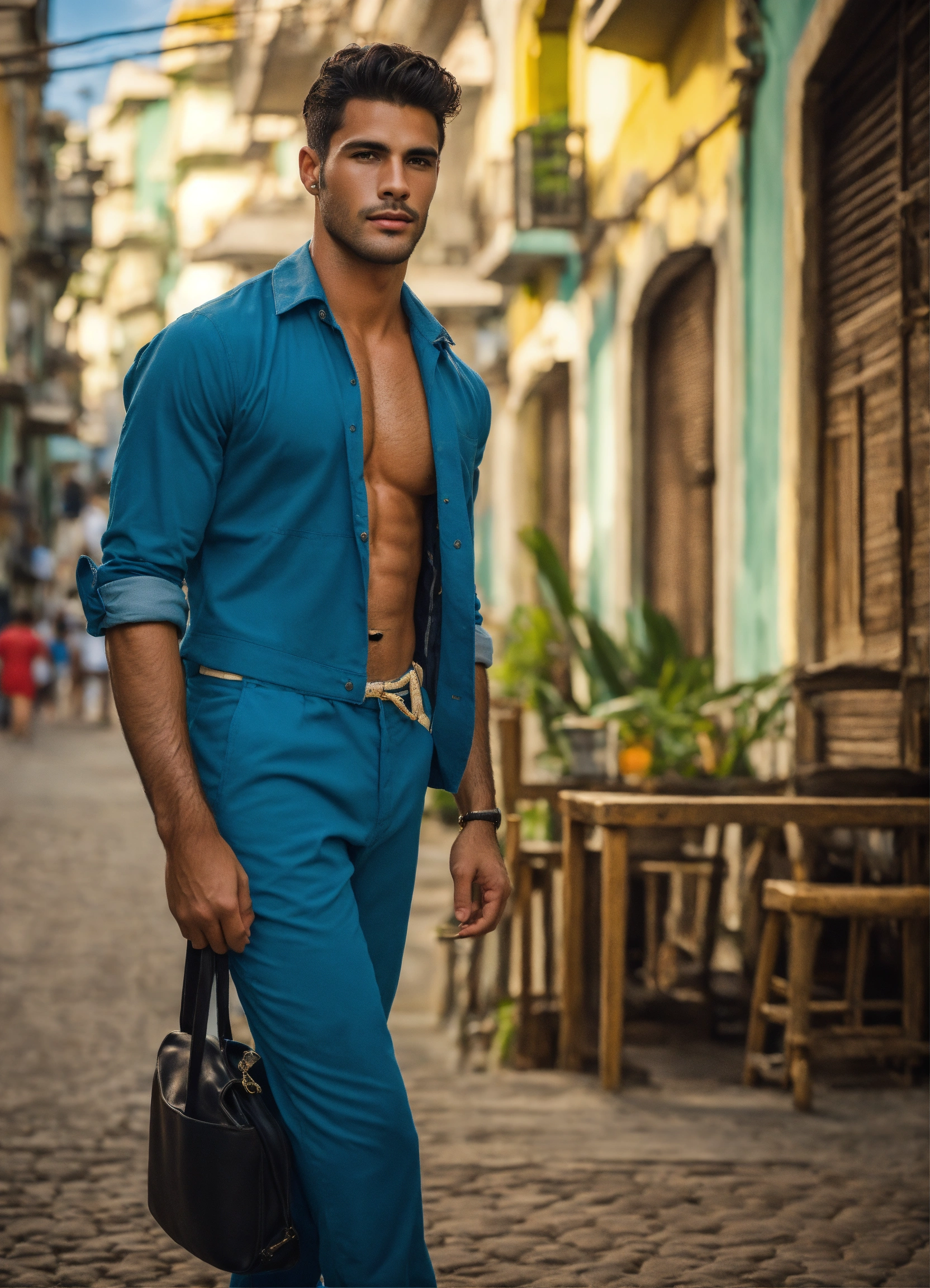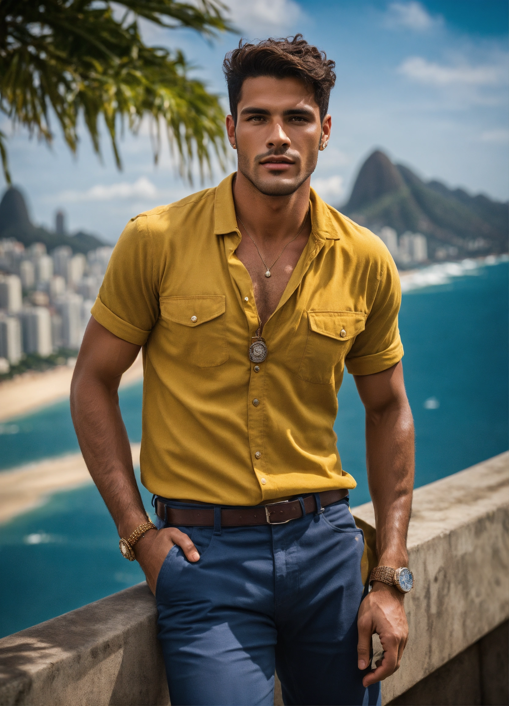 Photo essay of handsome male brazilian model, forties years, vintage background in rio de janeiro, professional photo, 8k, ultra detailed