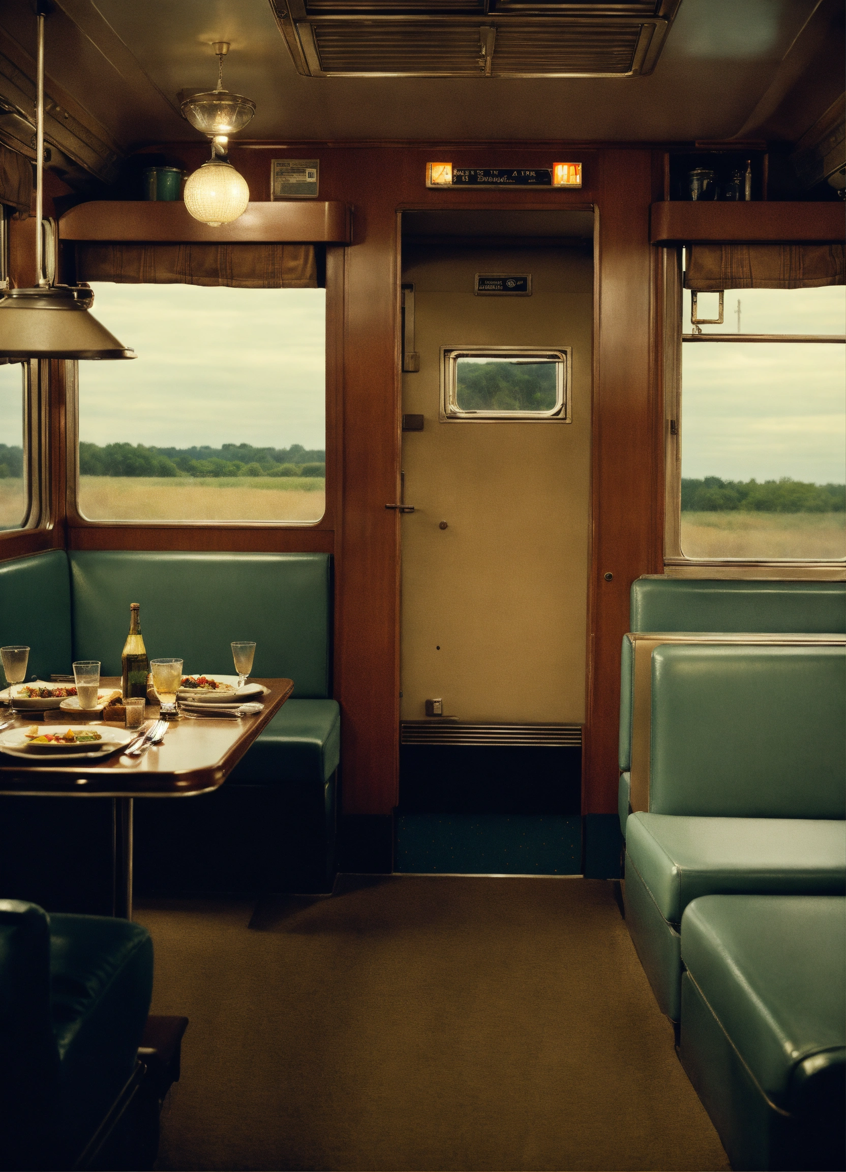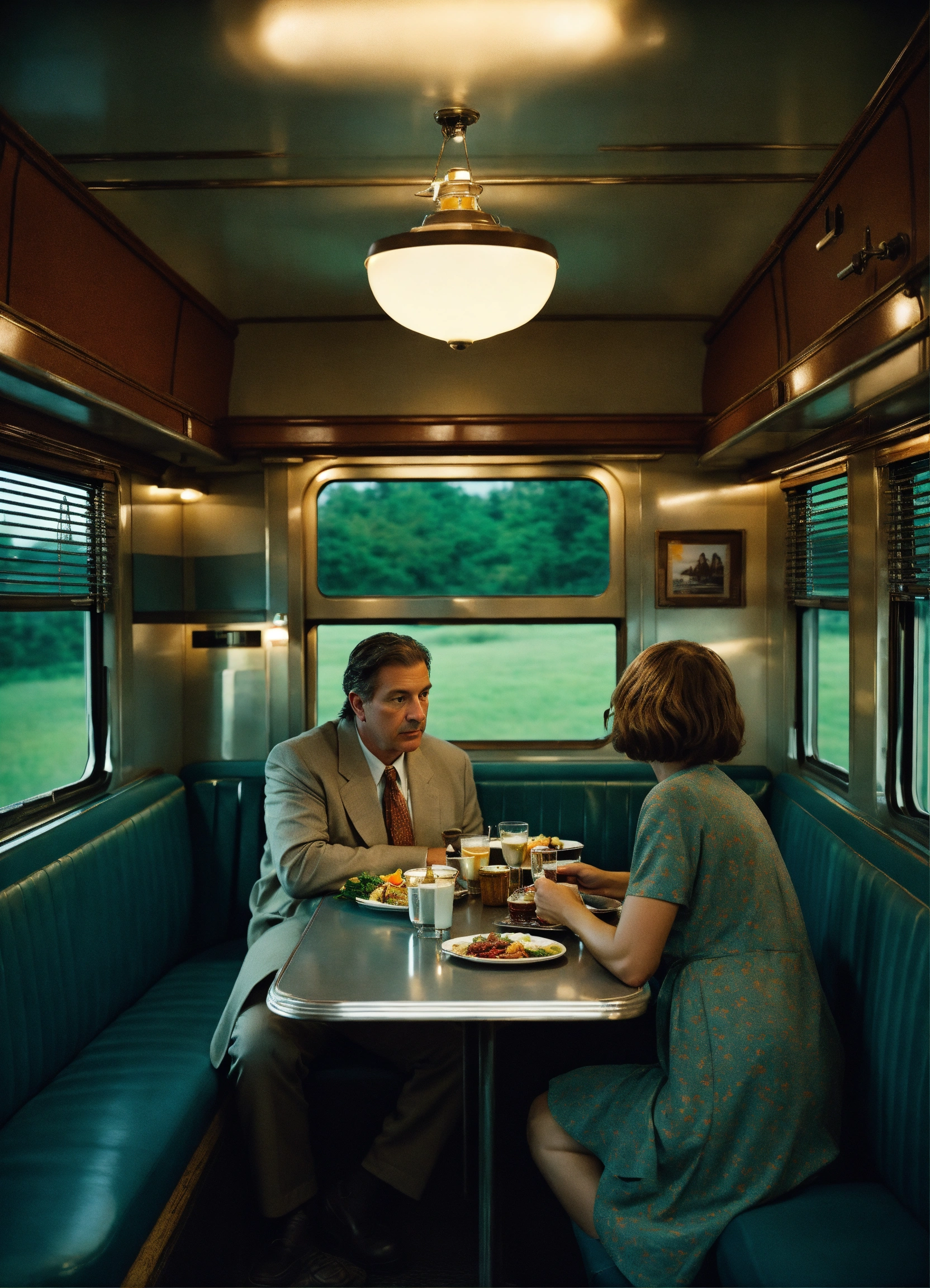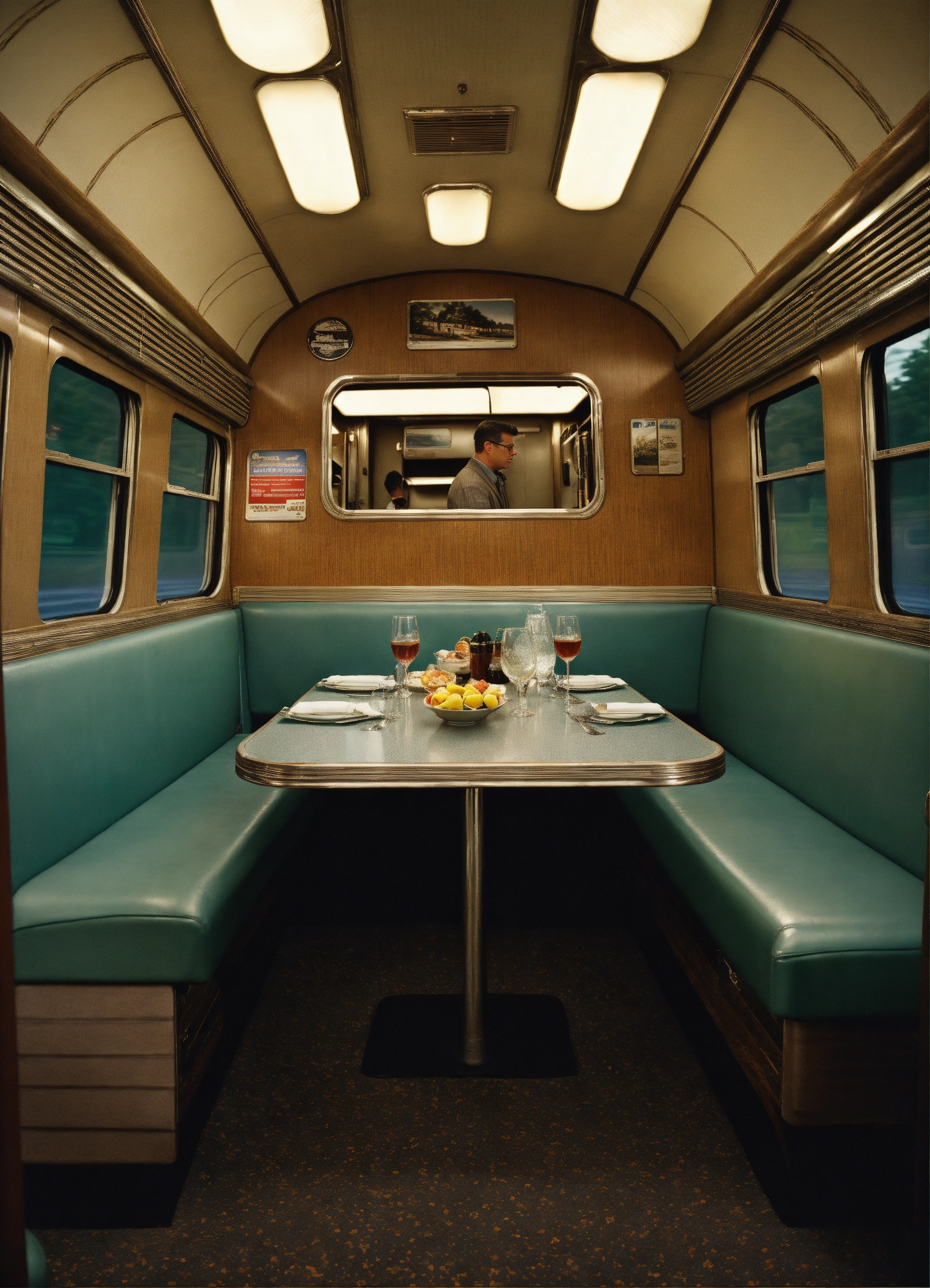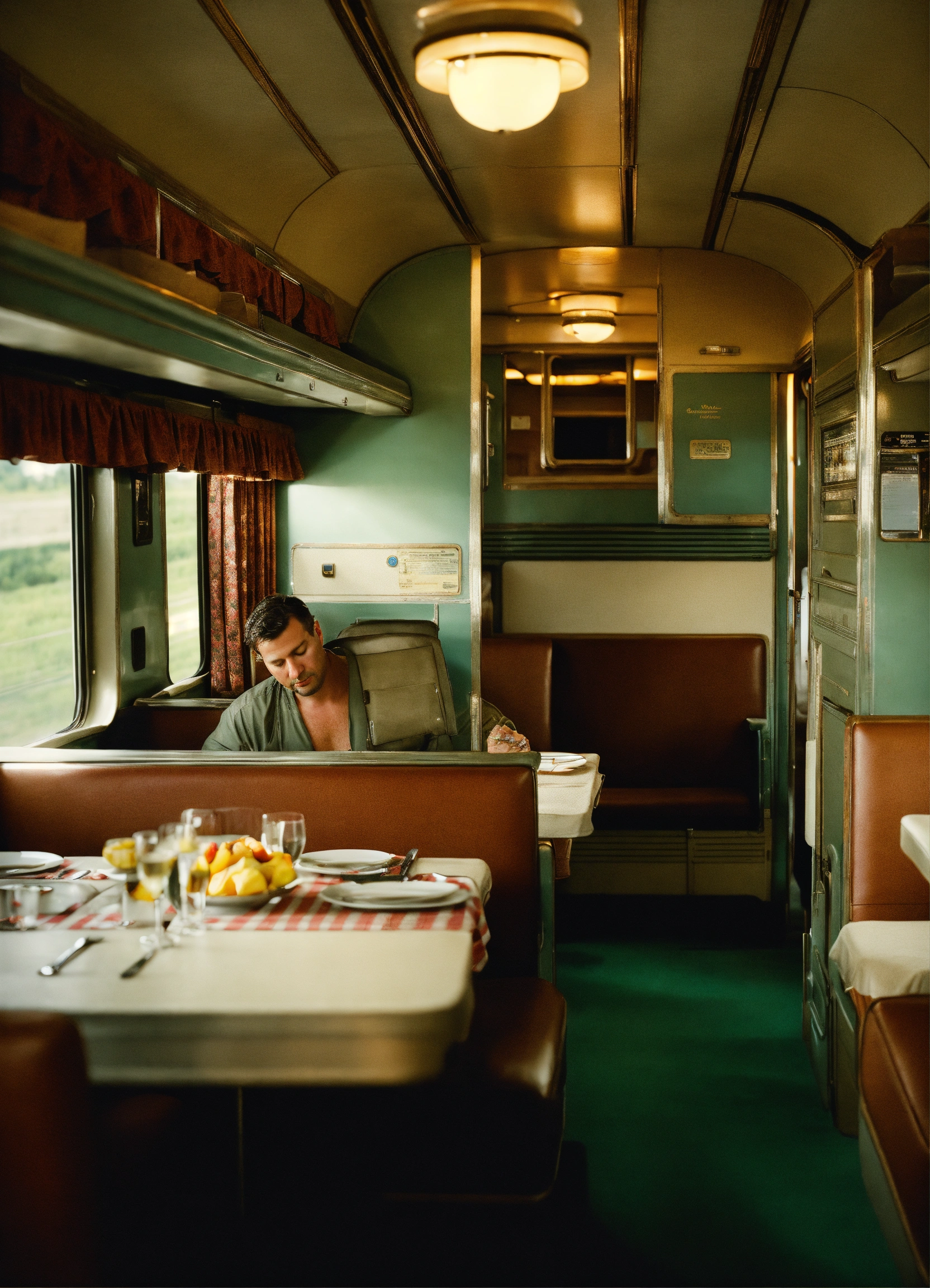 Vintage amtrak train dining car man back back realistic photography gregory crewdson style