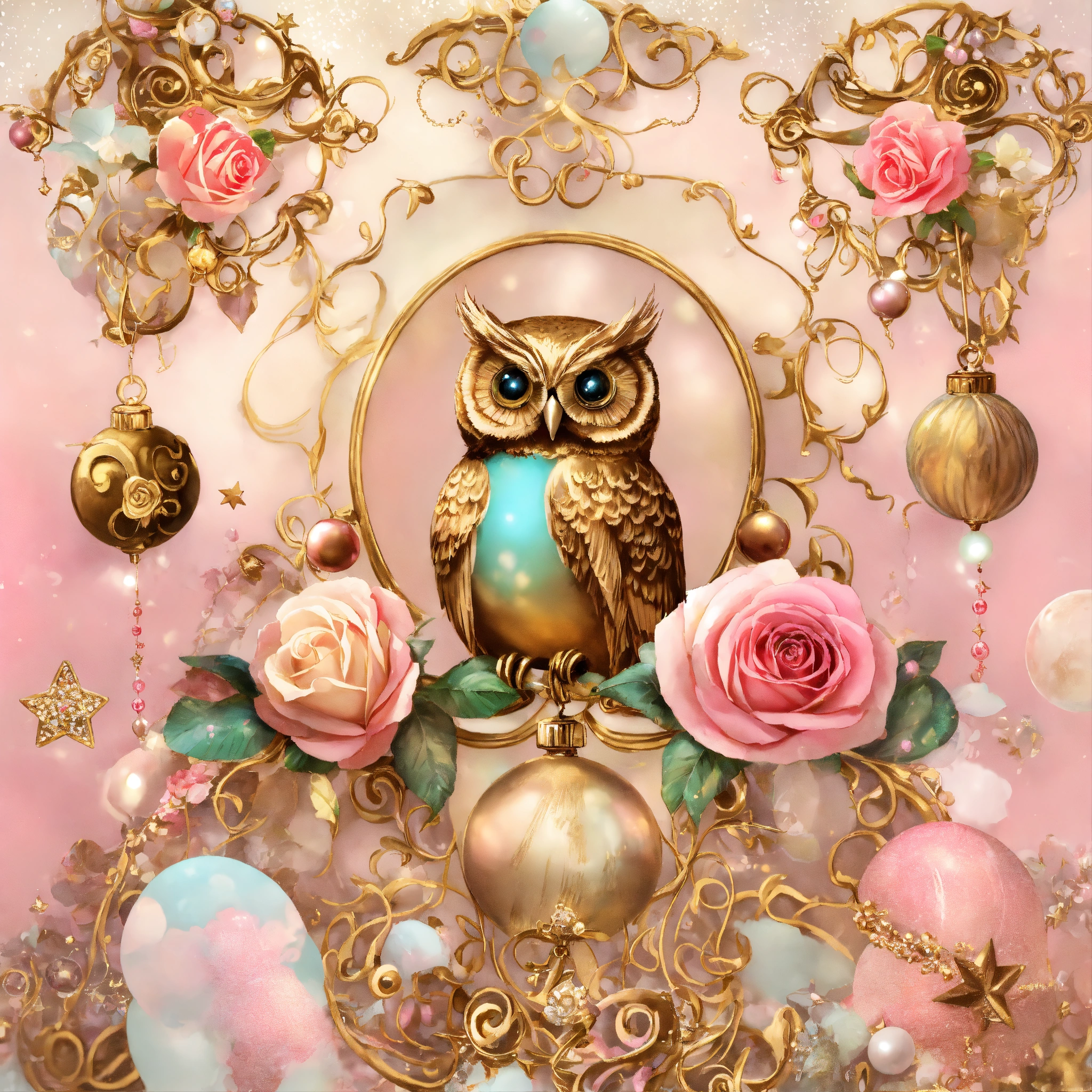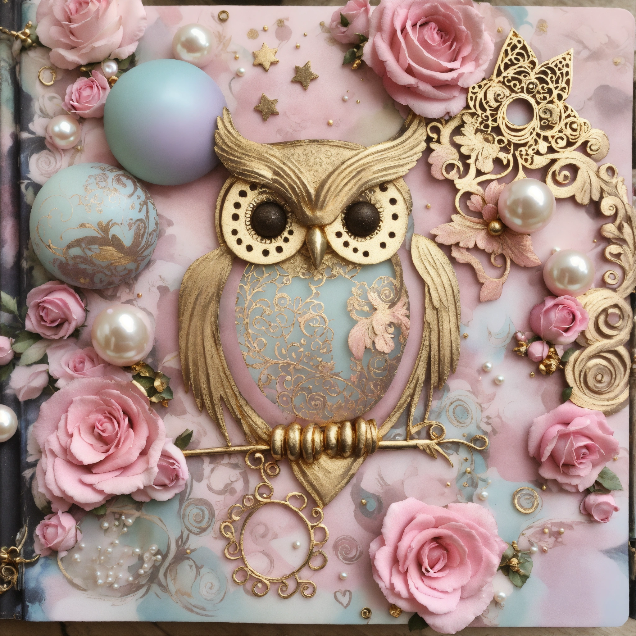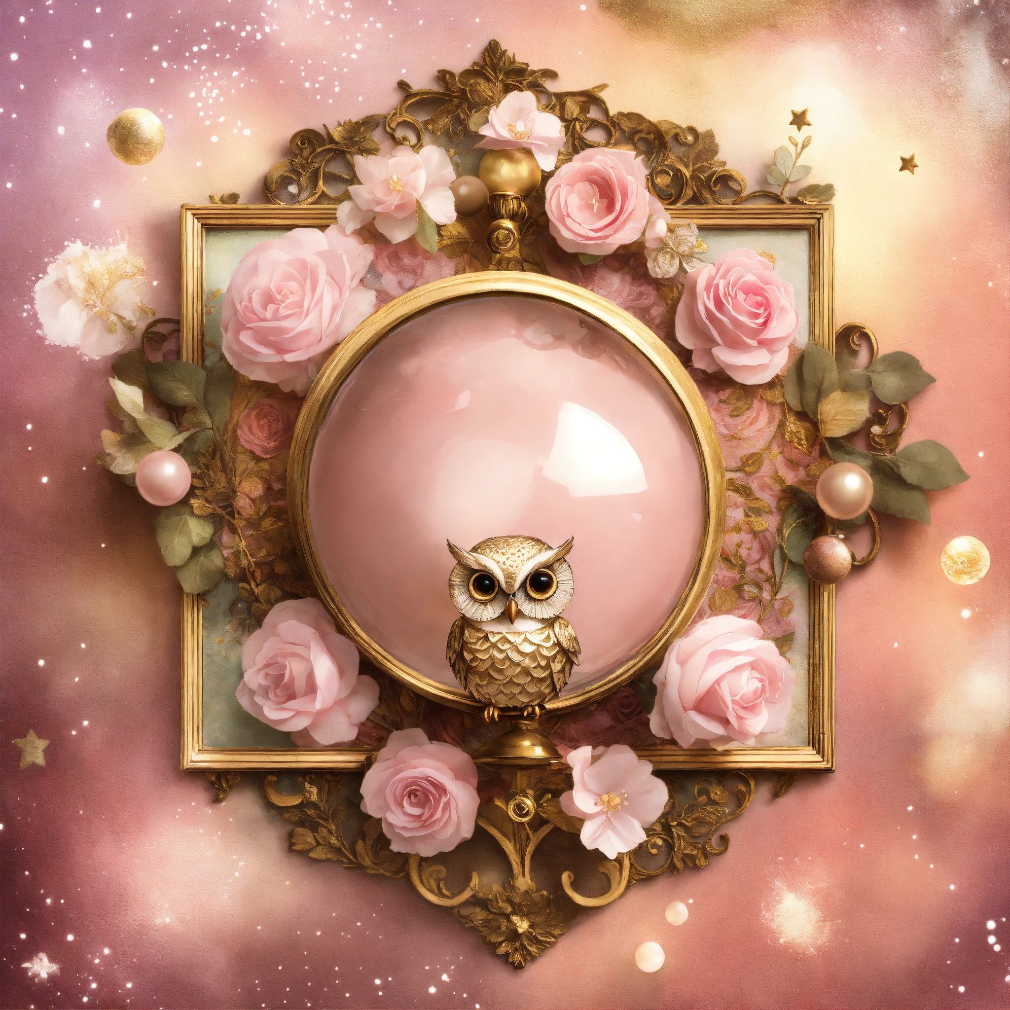 Shabby chic dreamy mist orbs pastel junk journals baby pink, gold, brown, owl, tatoo, metallic, swirls, roses, stars, pearls swirling magical fairytale abstract art style