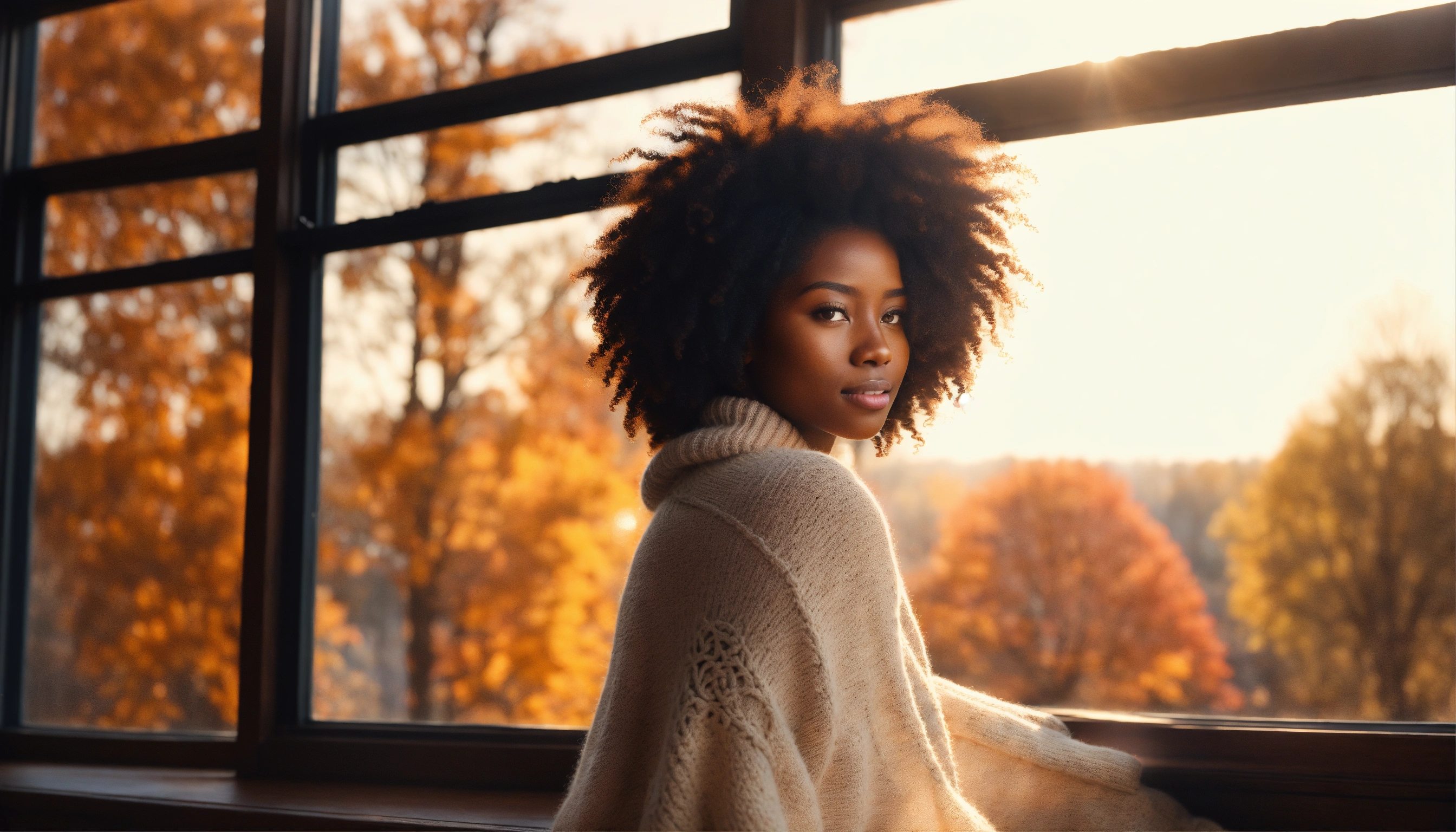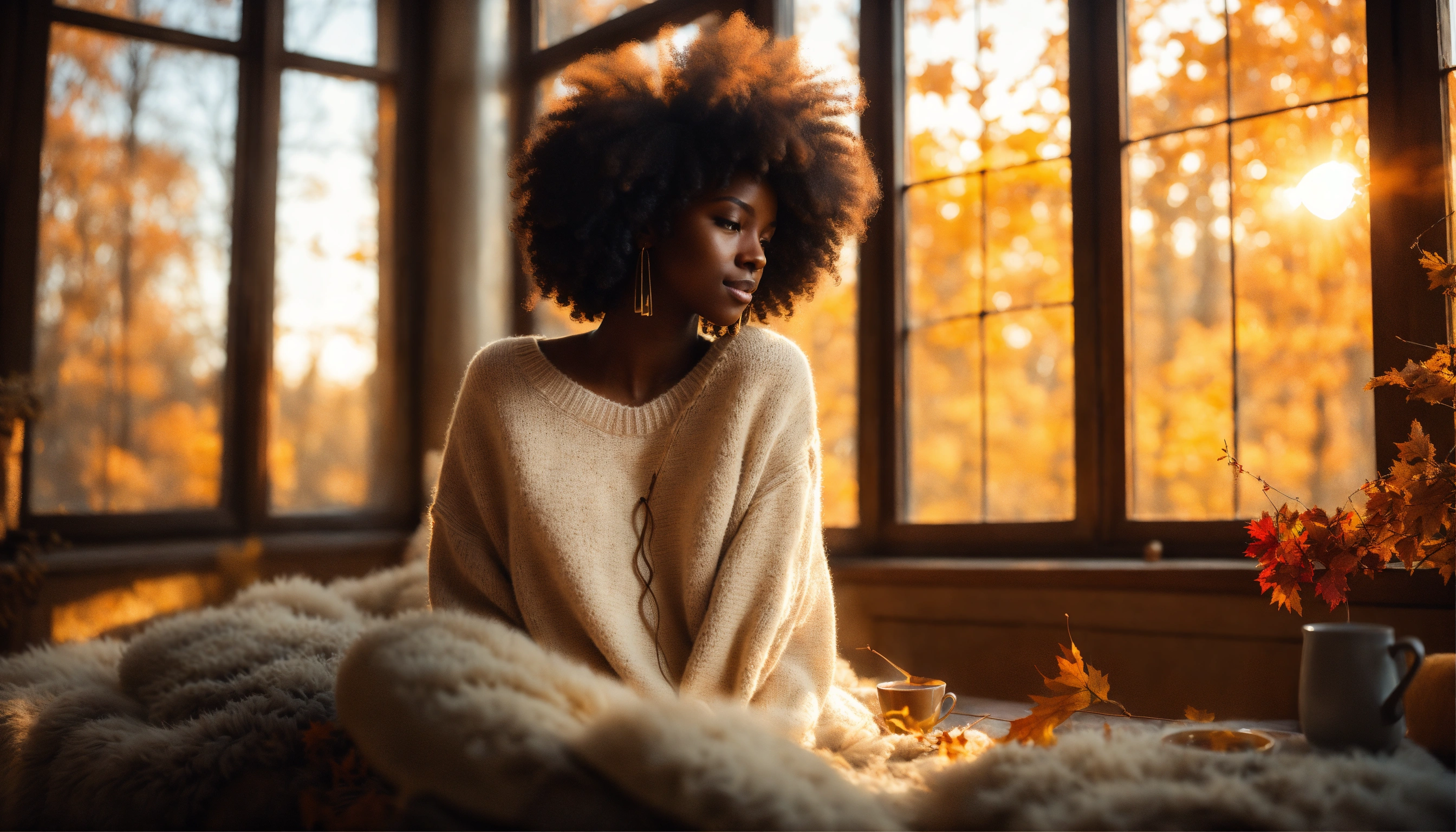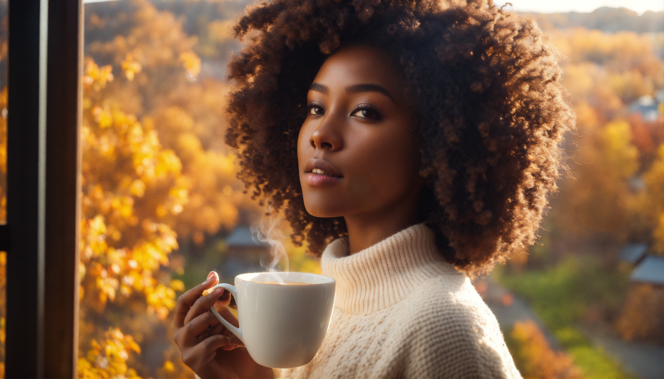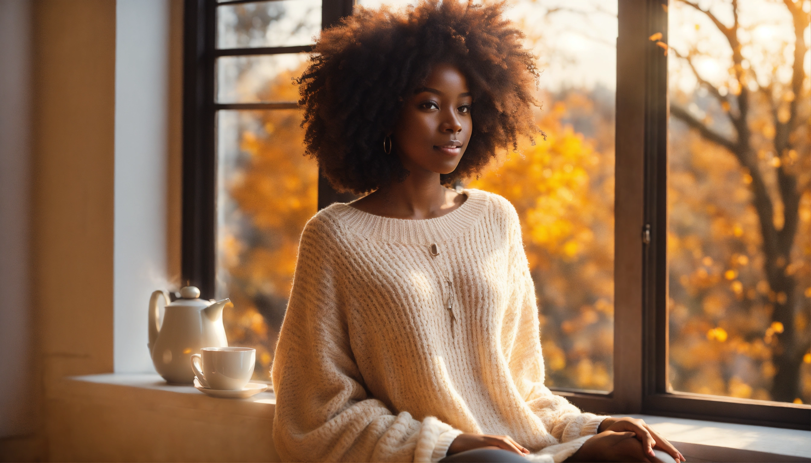 Wide-angle shot, beautiful melanated woman, dark skinned, pleased, white oversized sweater, bright, with afro hair with loose curls. the sun, the autumn trees, massive loft window, fall, cozy feminine living room, steaming tea, fantastic beauty. curls. ultra-detailed dreamlike, photography 8k ultra hd, resolution image, translucent and ethereal.
