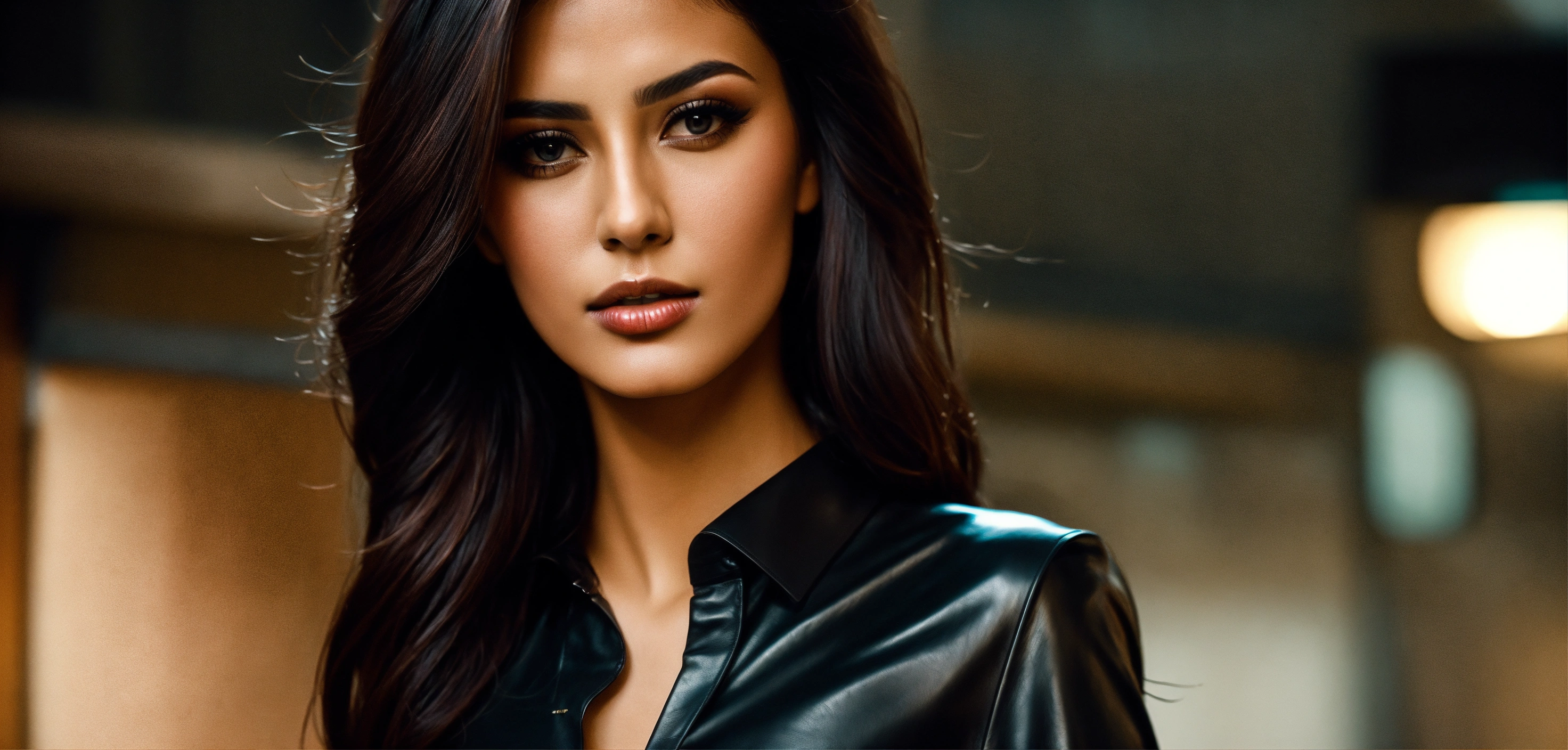 Cinematic look, stunning arab seductress women fashion model, black leather business shirt, black leather skirt