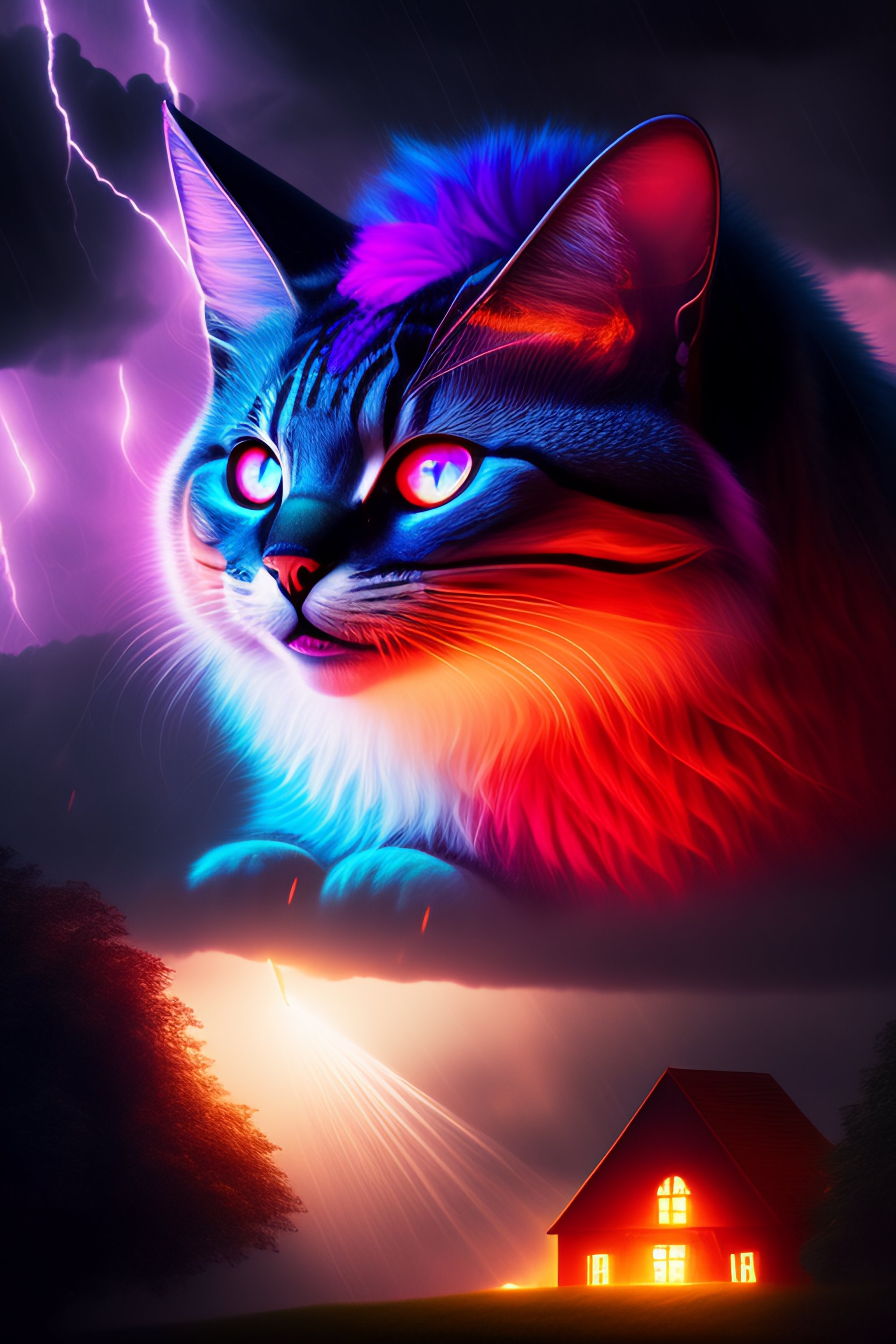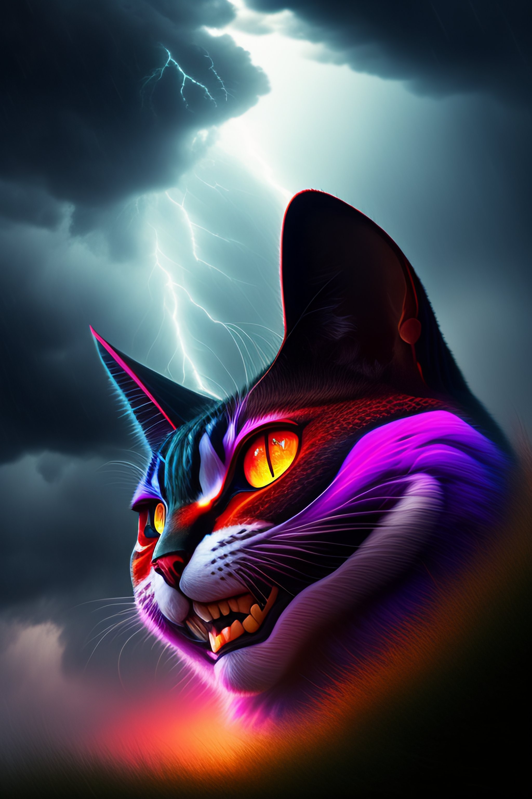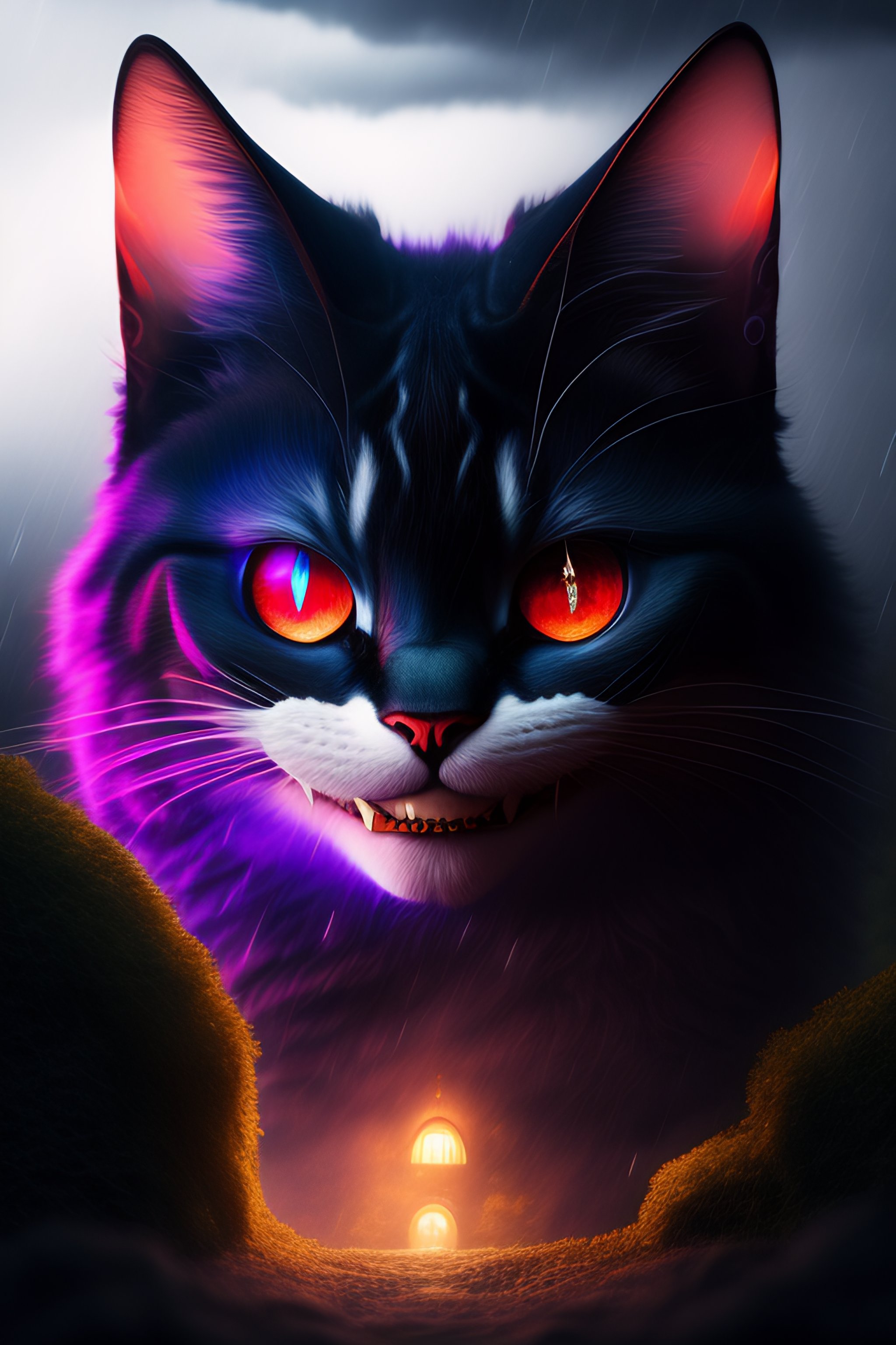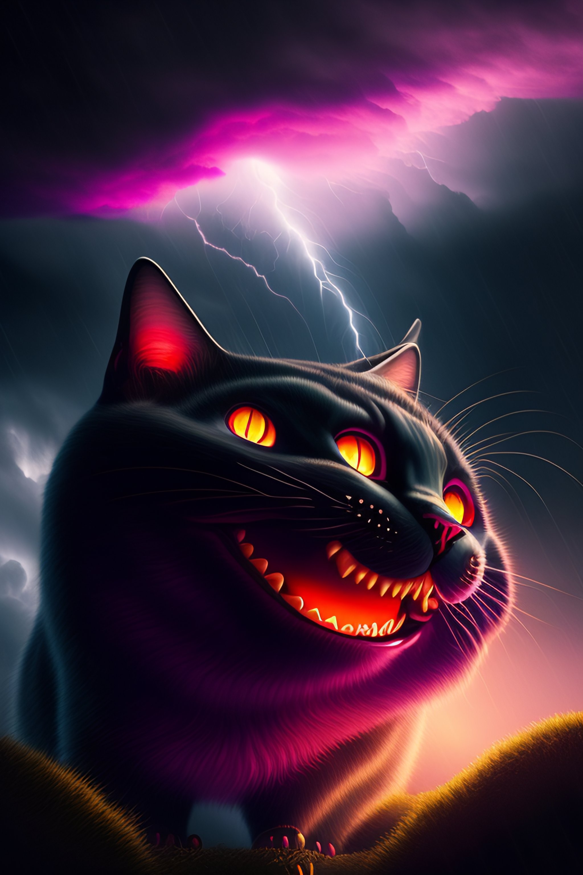 Cheshire cat's smile and shining red eyes in front of the dark thunderstorm