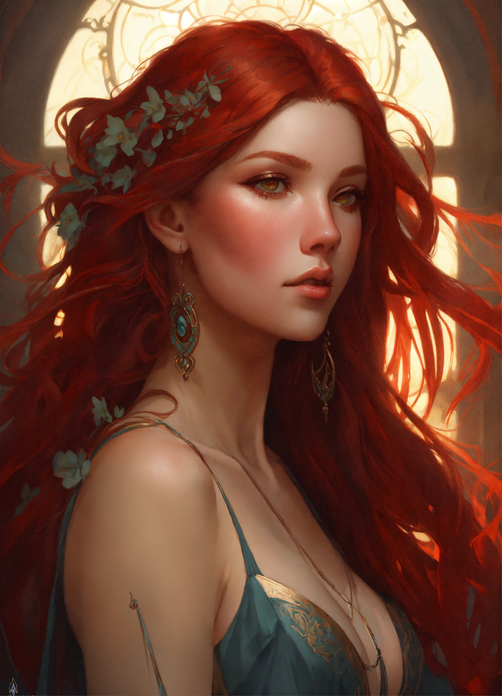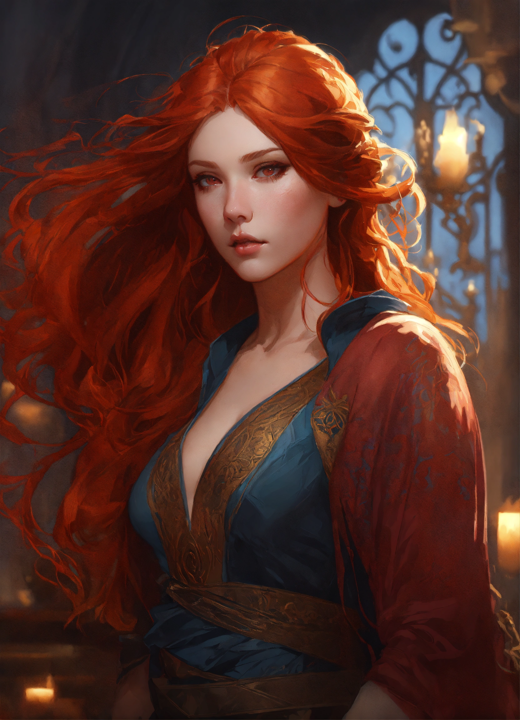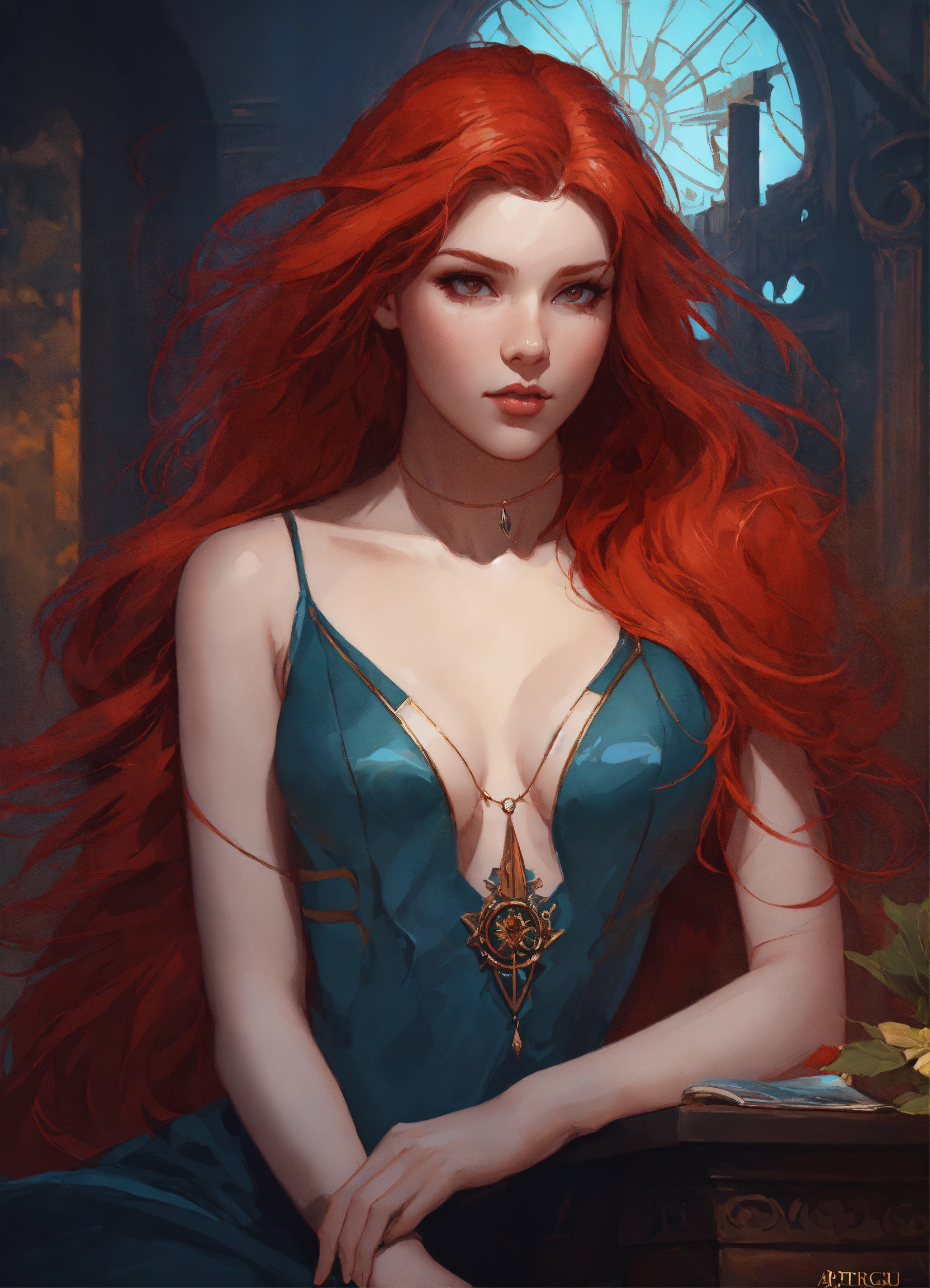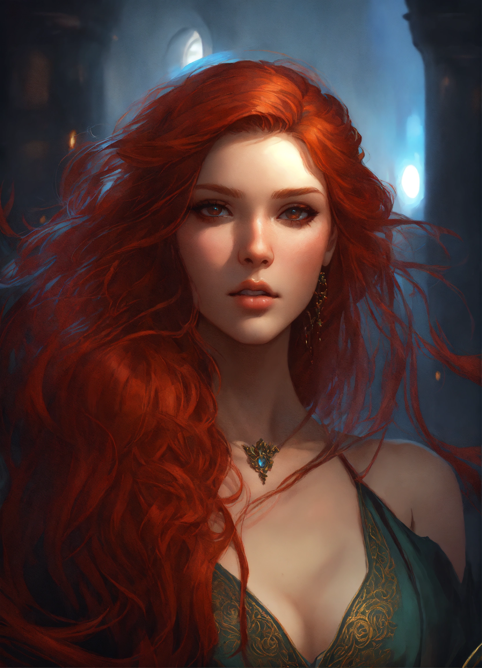 Beautiful, red hair, sorceress, long hair, dark pin-up style hair, dark light night, intricate, sharp focus, illustration, highly detailed, digital painting, concept art, matte, art by wlop and artgerm and greg rutkowski and alphonse mucha, masterpiece