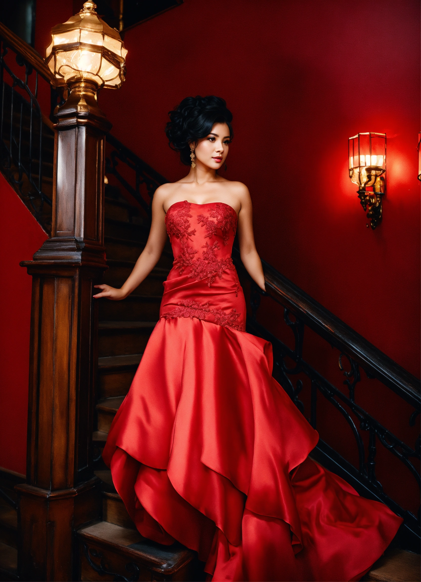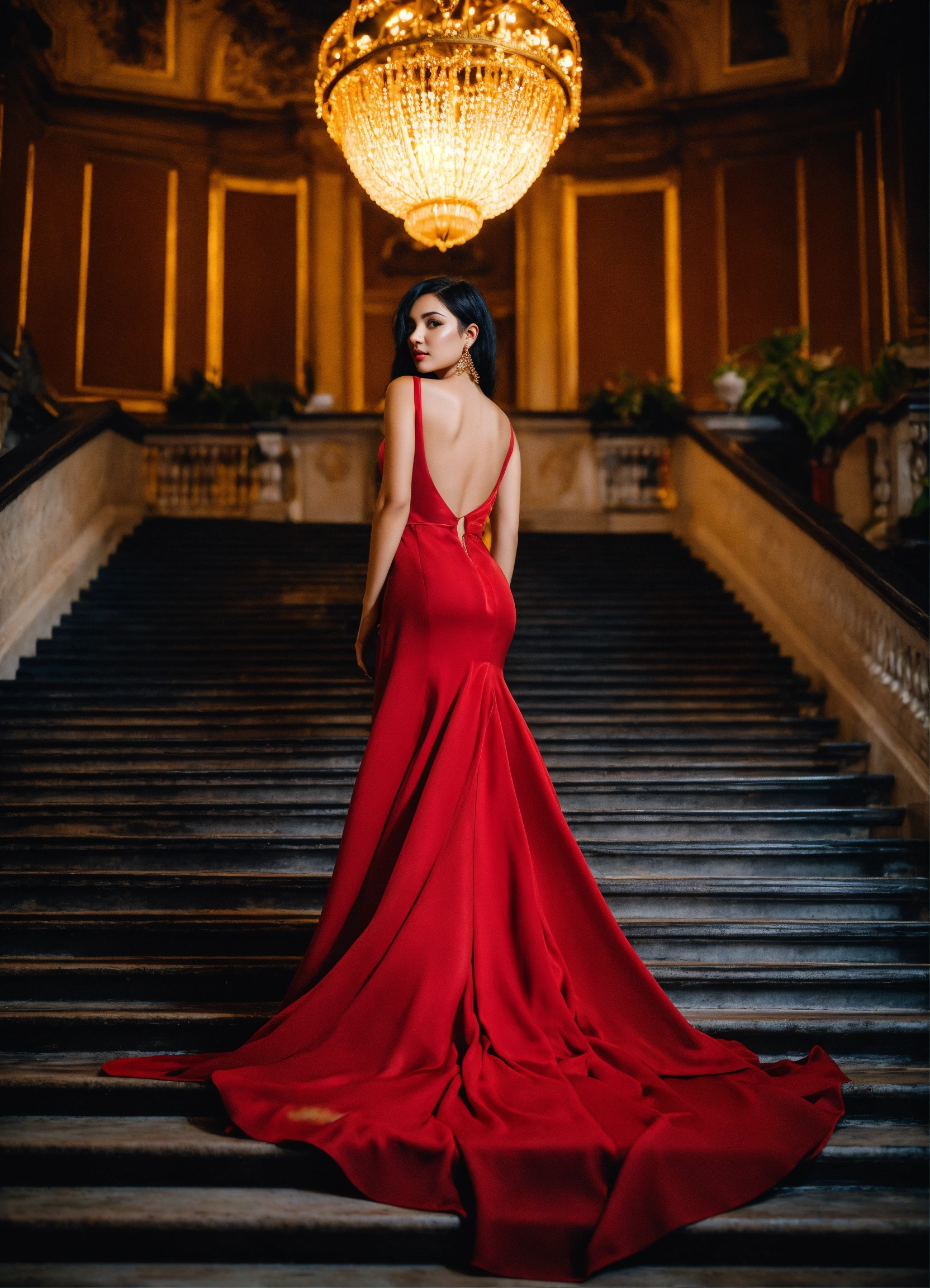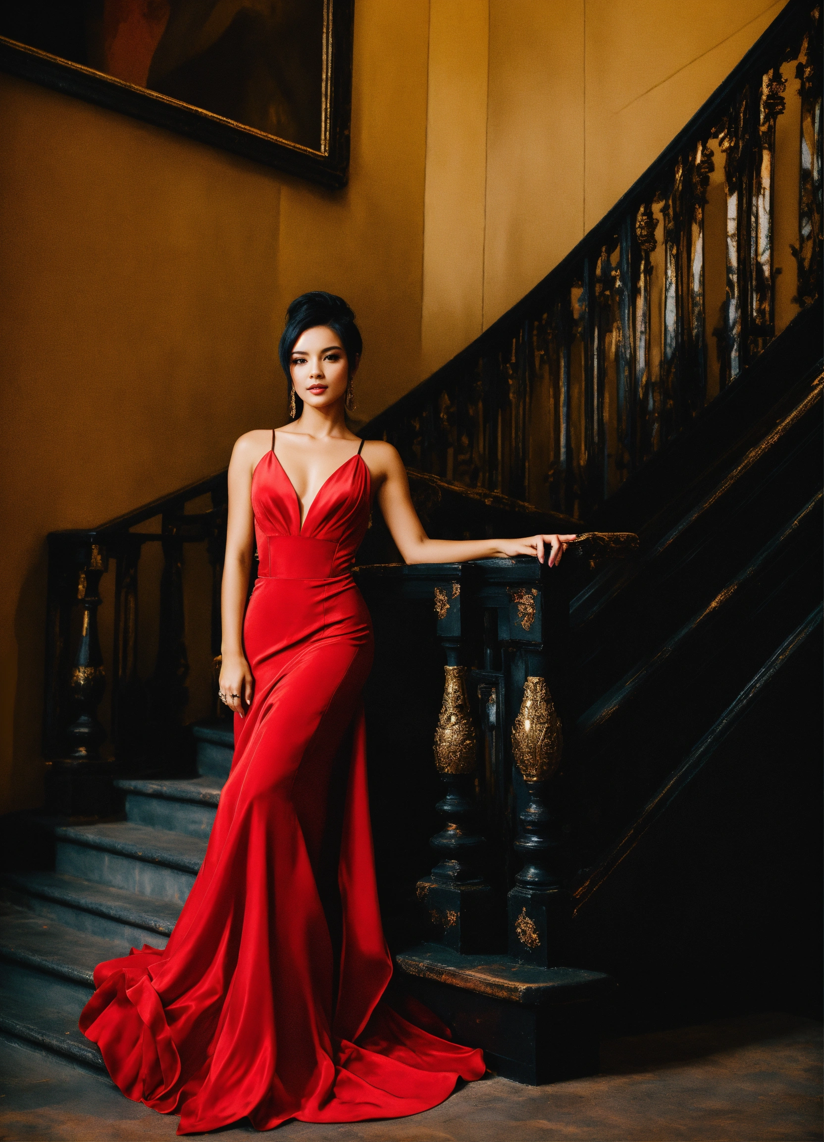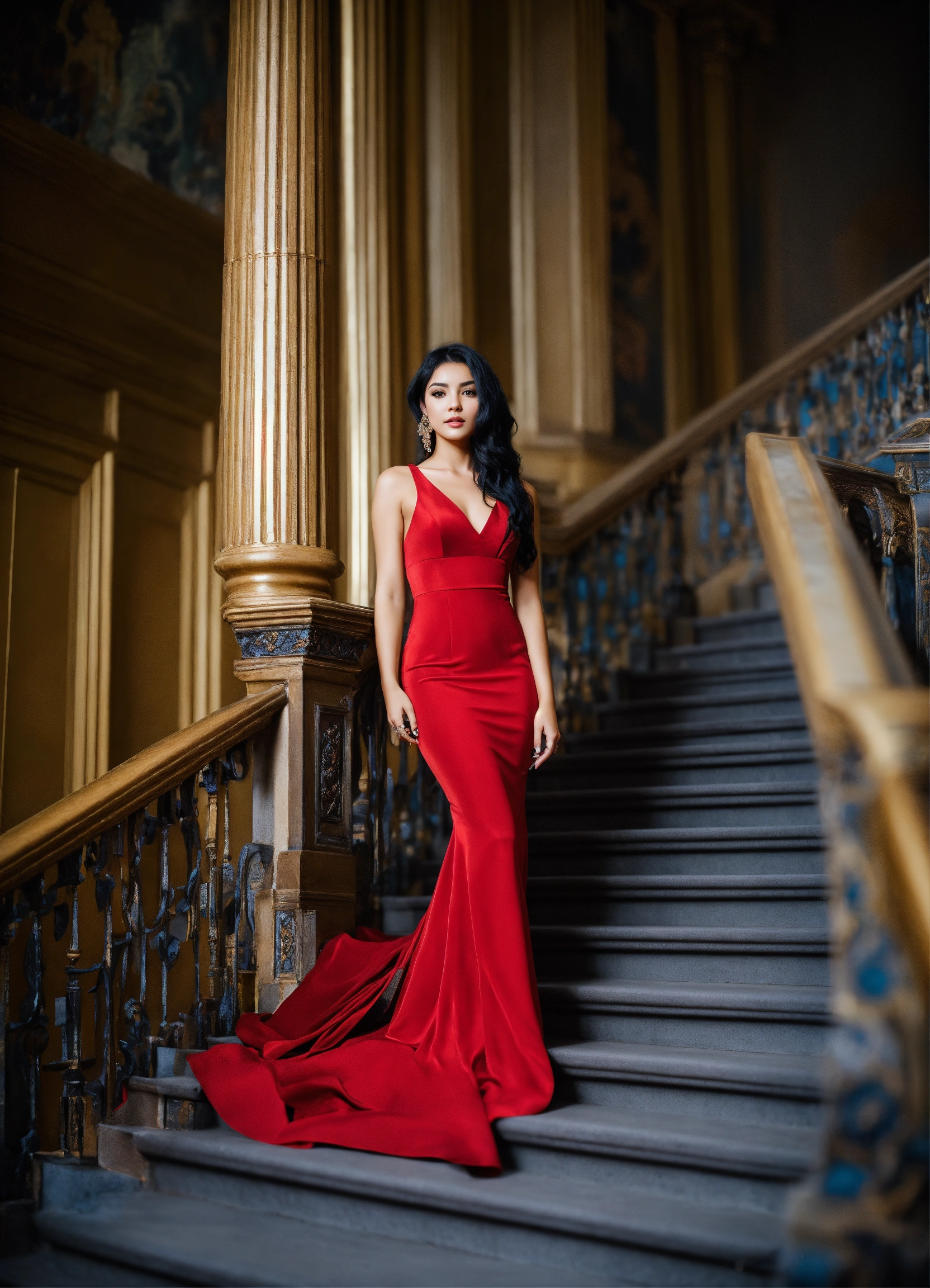 Beautiful woman with black hair on staircase wearing a red gown looking at the camera