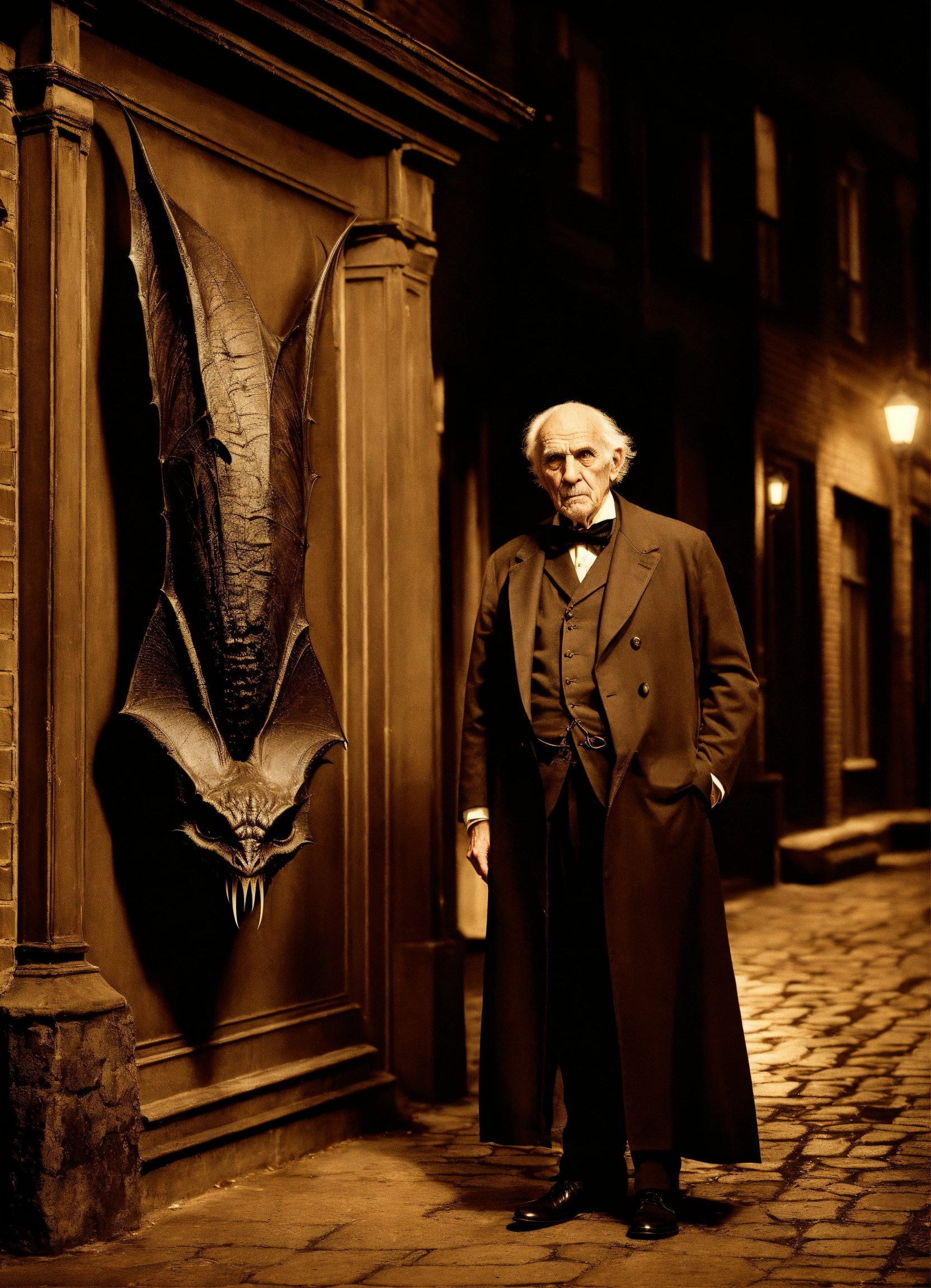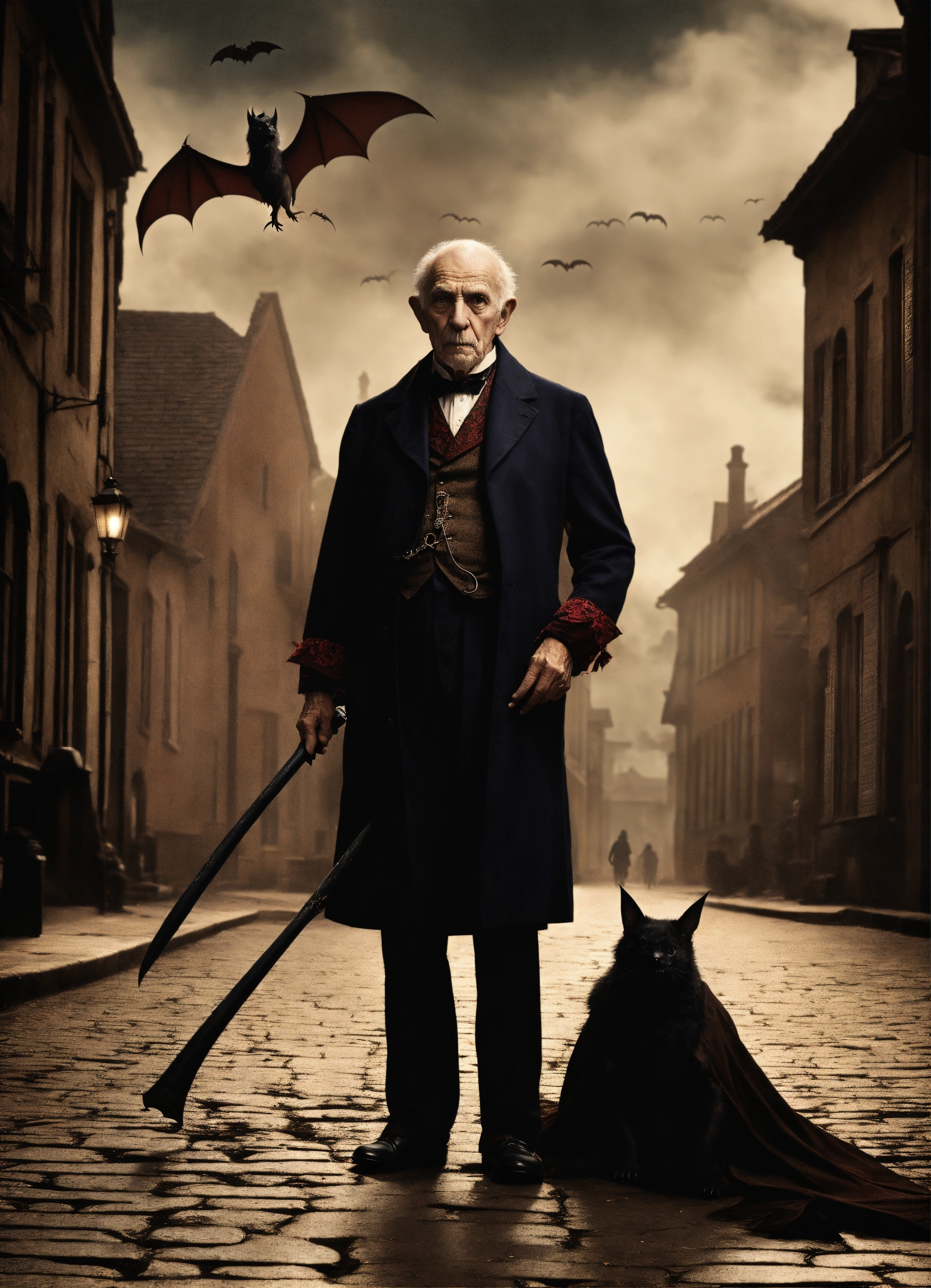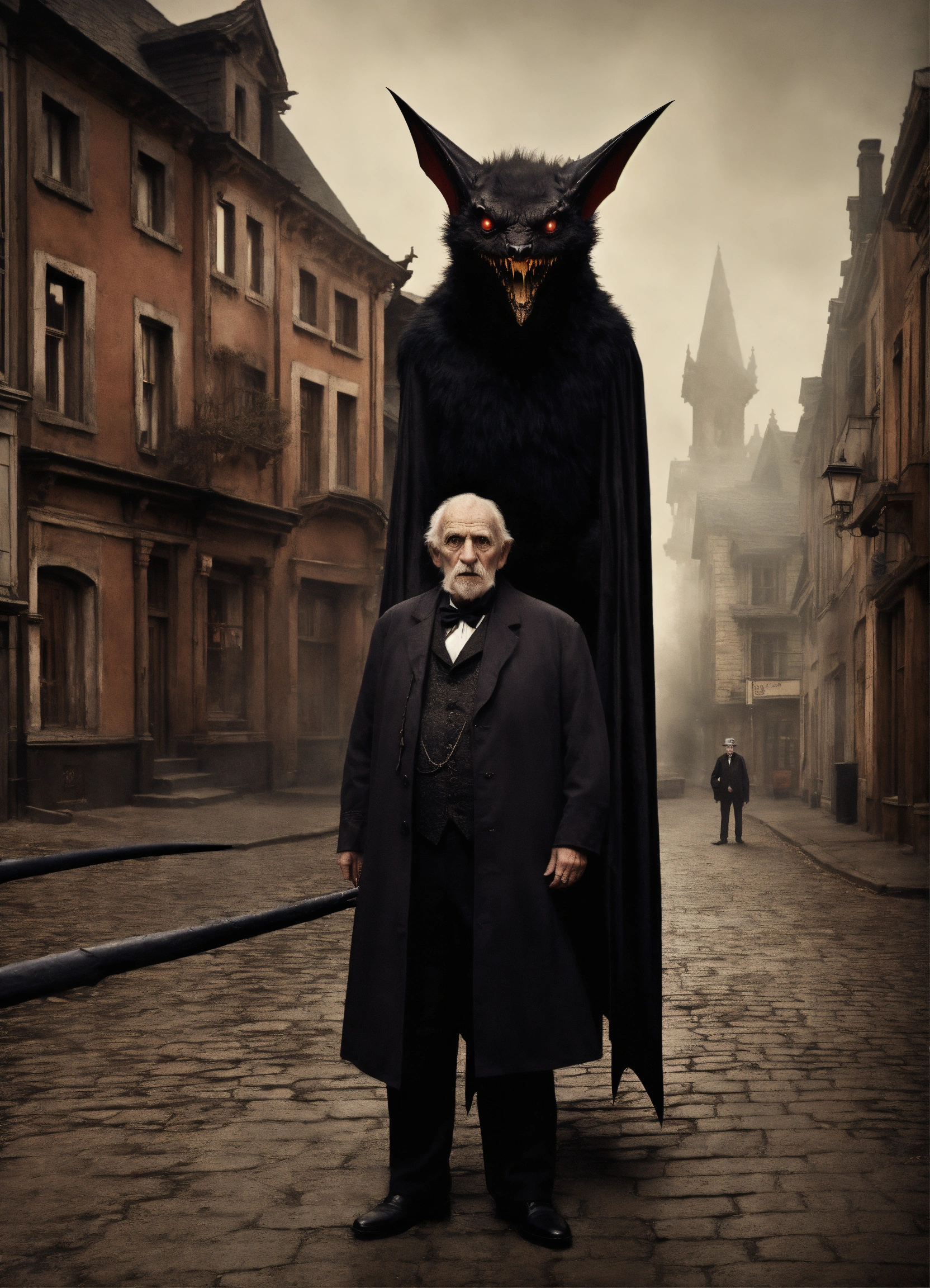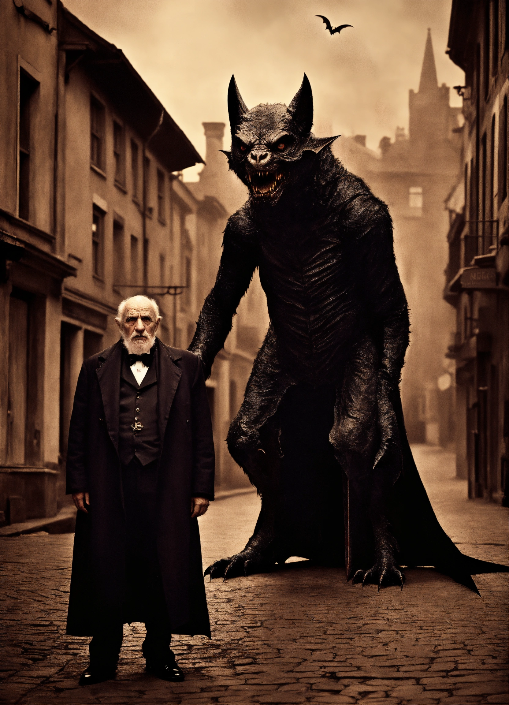Old vampire man standing next to a giant bat monster, in a old town street, in the style of contemporary vintage photography, necronomicon illustrations, tabletop photography, 1890, hyperrealistic animal portraits, ghostly presence, whirring contrivances
