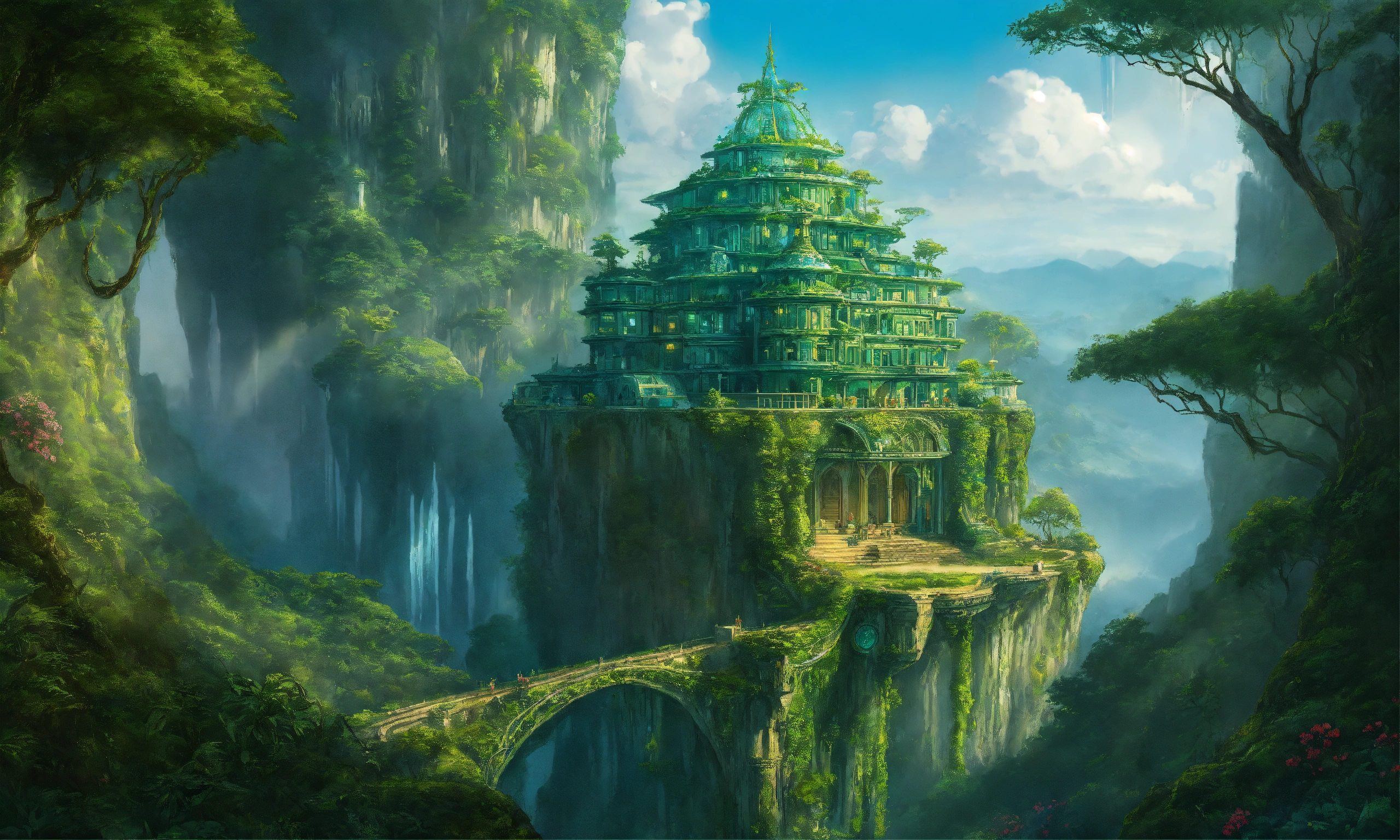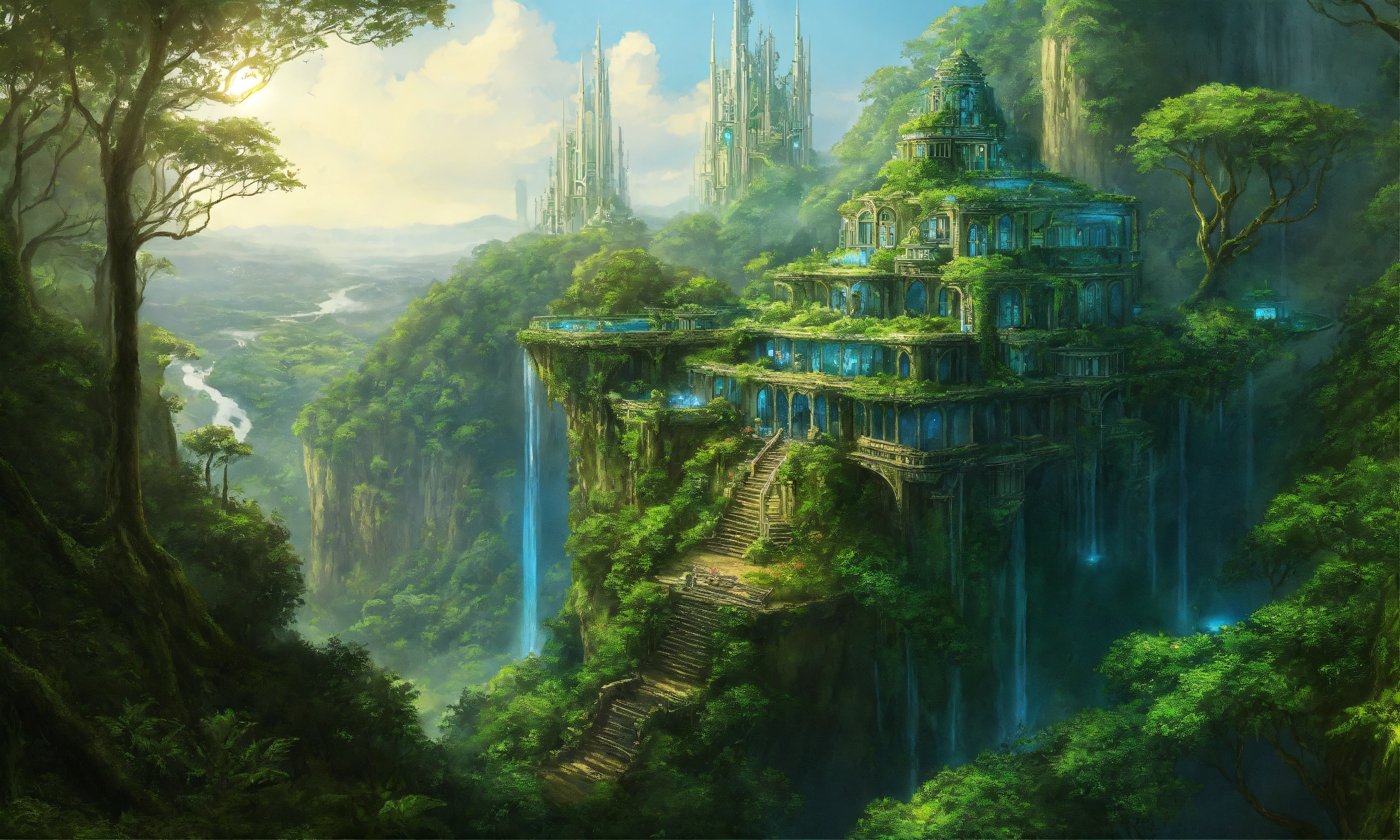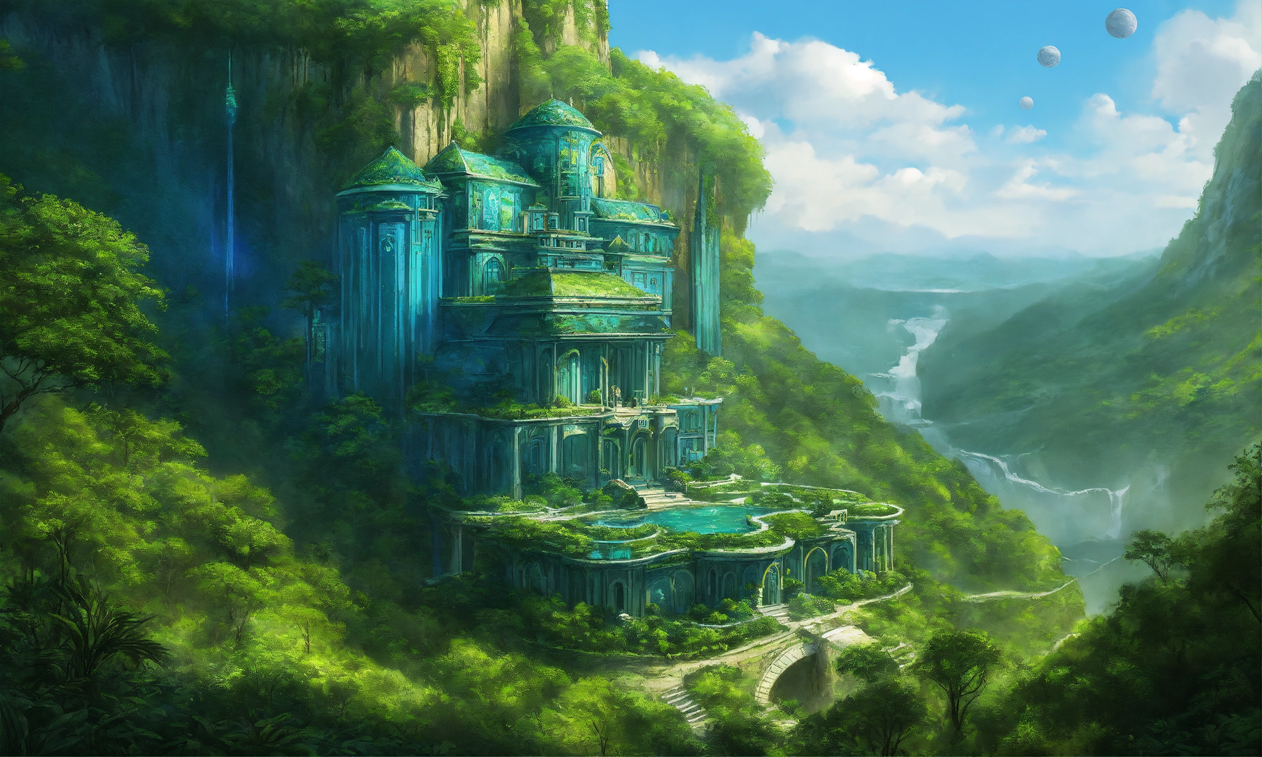 Drawing of an elegant blue and green sci fi palace on cliff overlooking a lush rainforest, elven architecture, immensely detailed