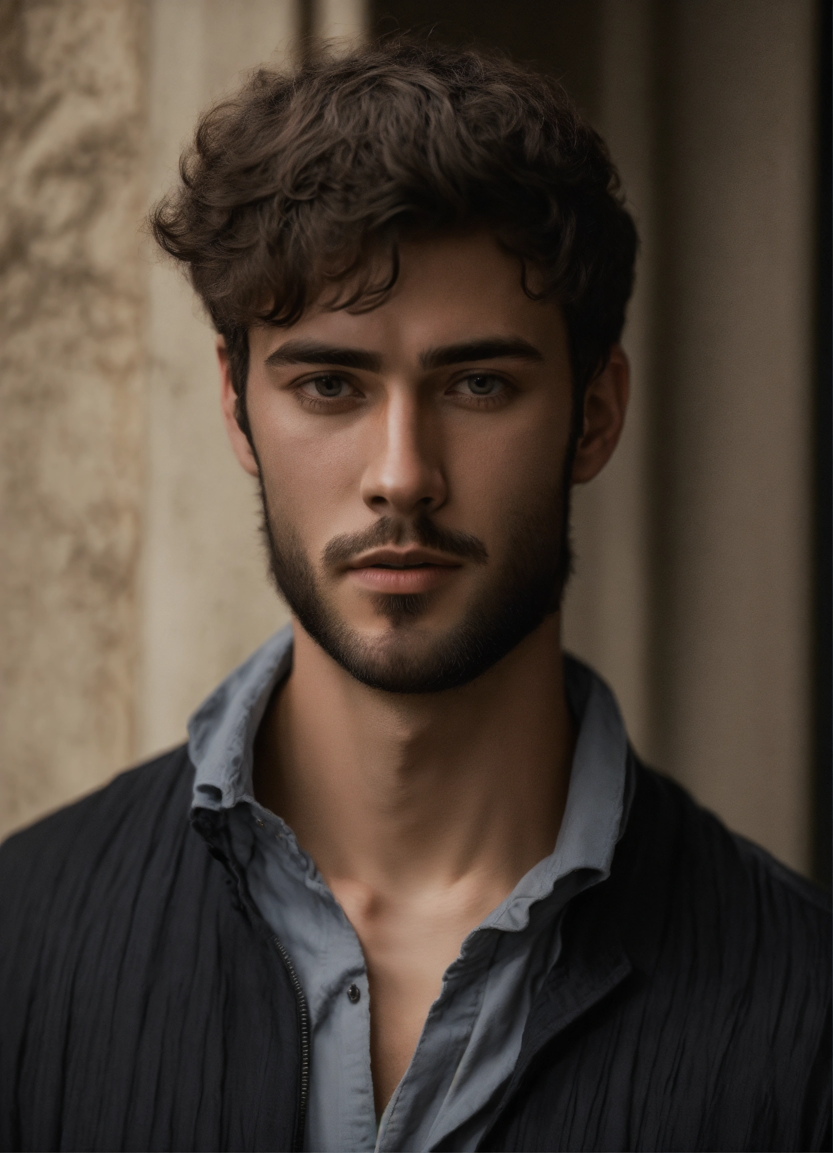 Image de profil, statut romain d'aristote très beau, athlétique, charismatique, virile, humeur charismatique, fond noir tout pastel, regard redoutable, statut gris clair
