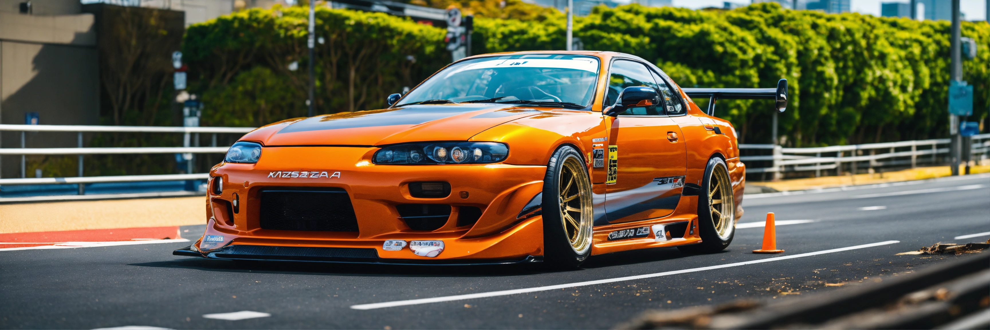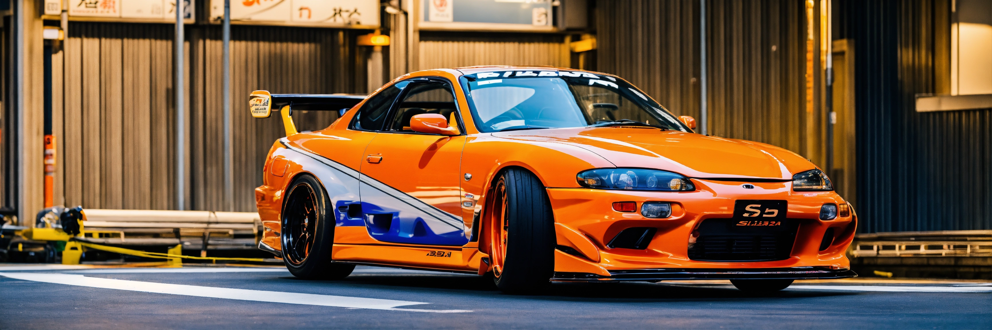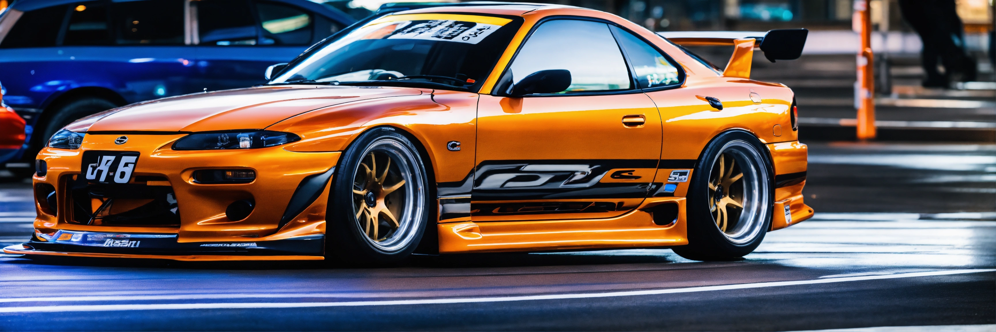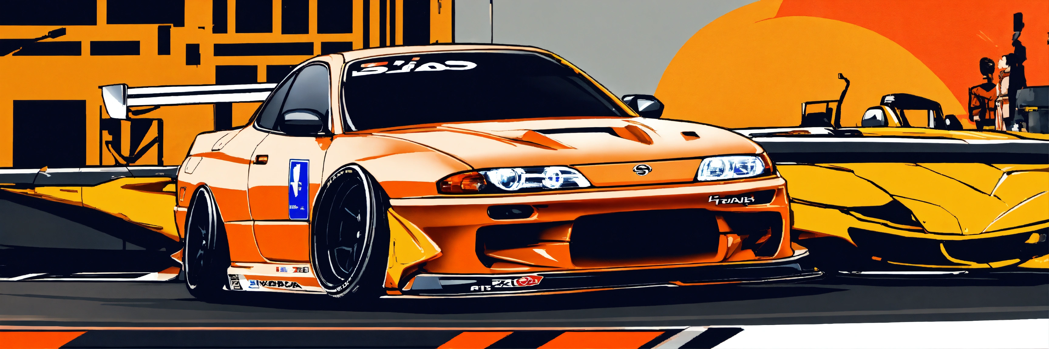 A colorful orange nissan silvia s15 with a spoiler racing a white mazda rx7 in tokyo