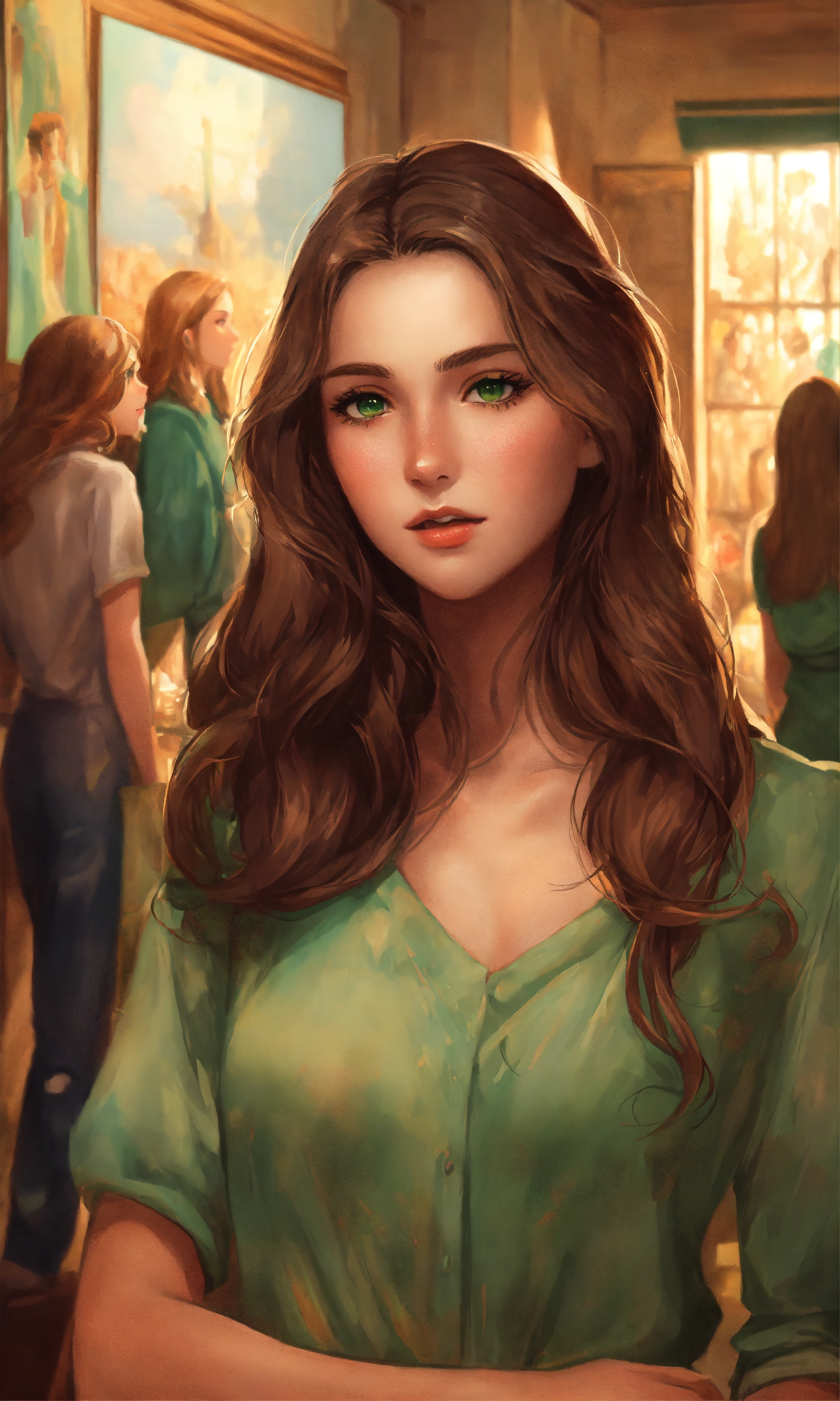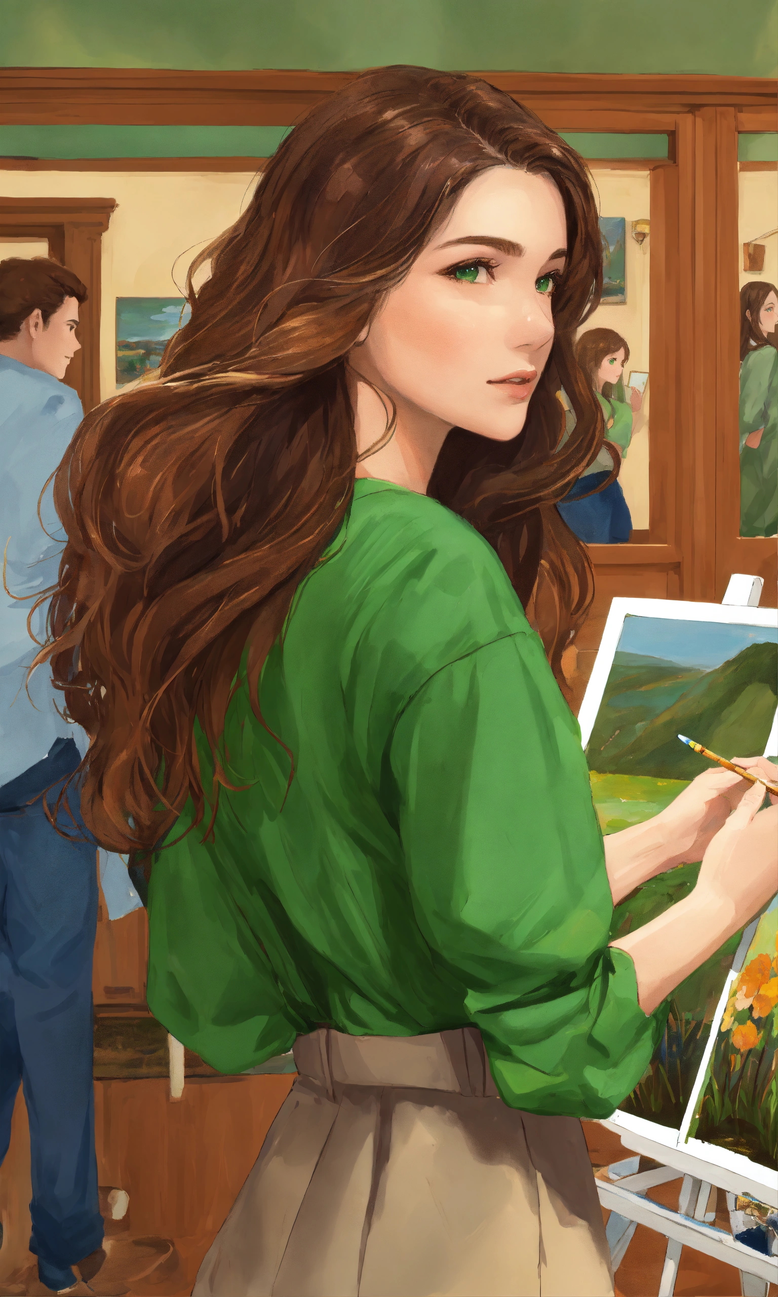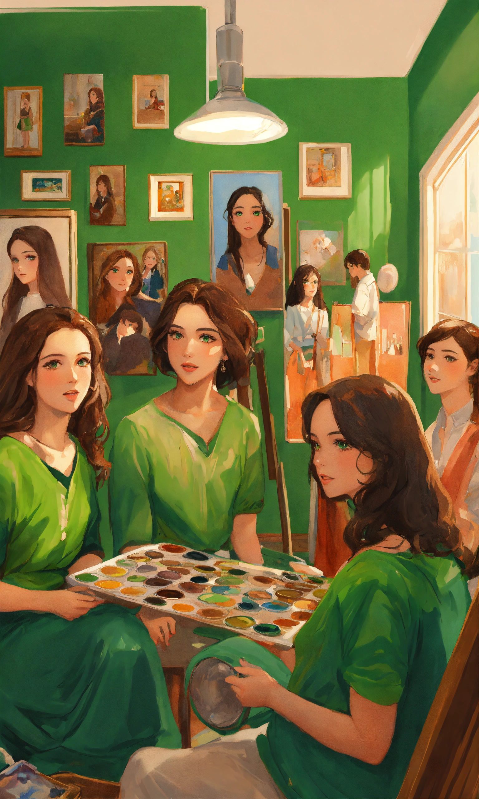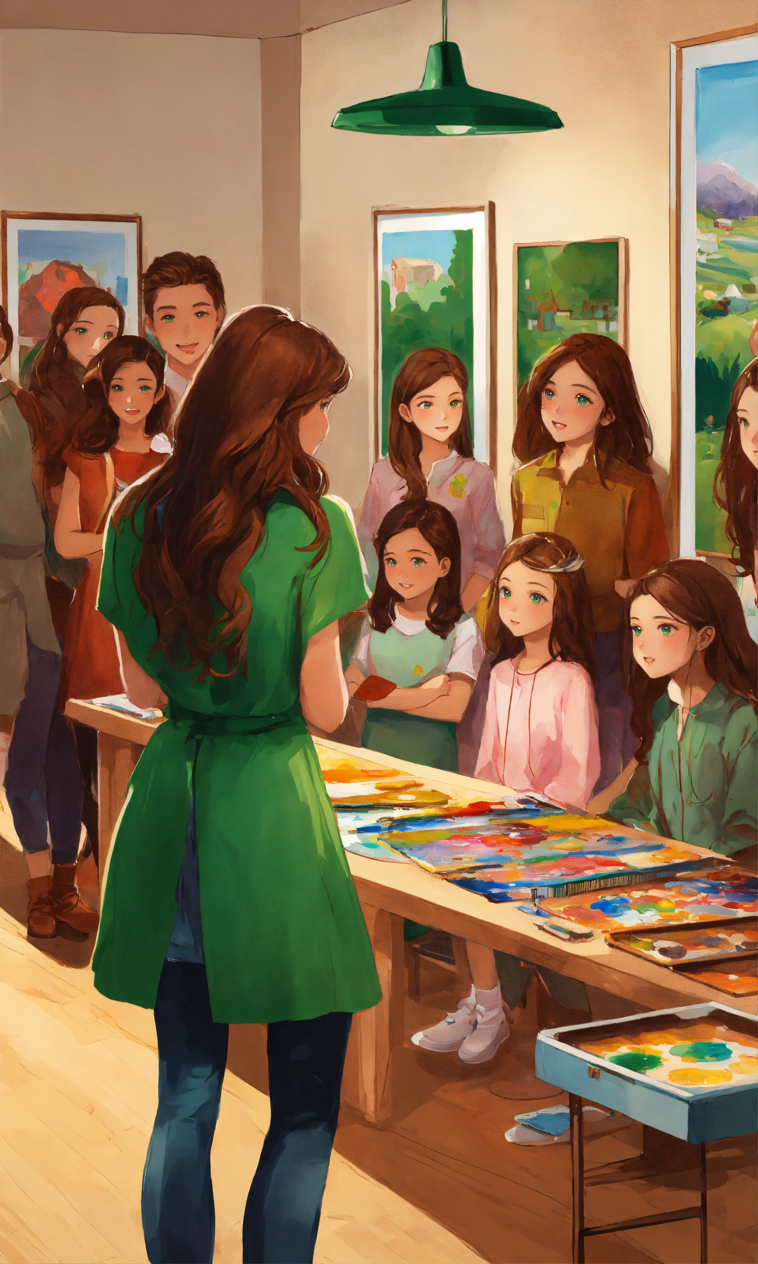 Illustration of in a view show contest, other people and girl who had long brown hair, green eyes, and a fair complexion. showing them their painting. show whole room of other people