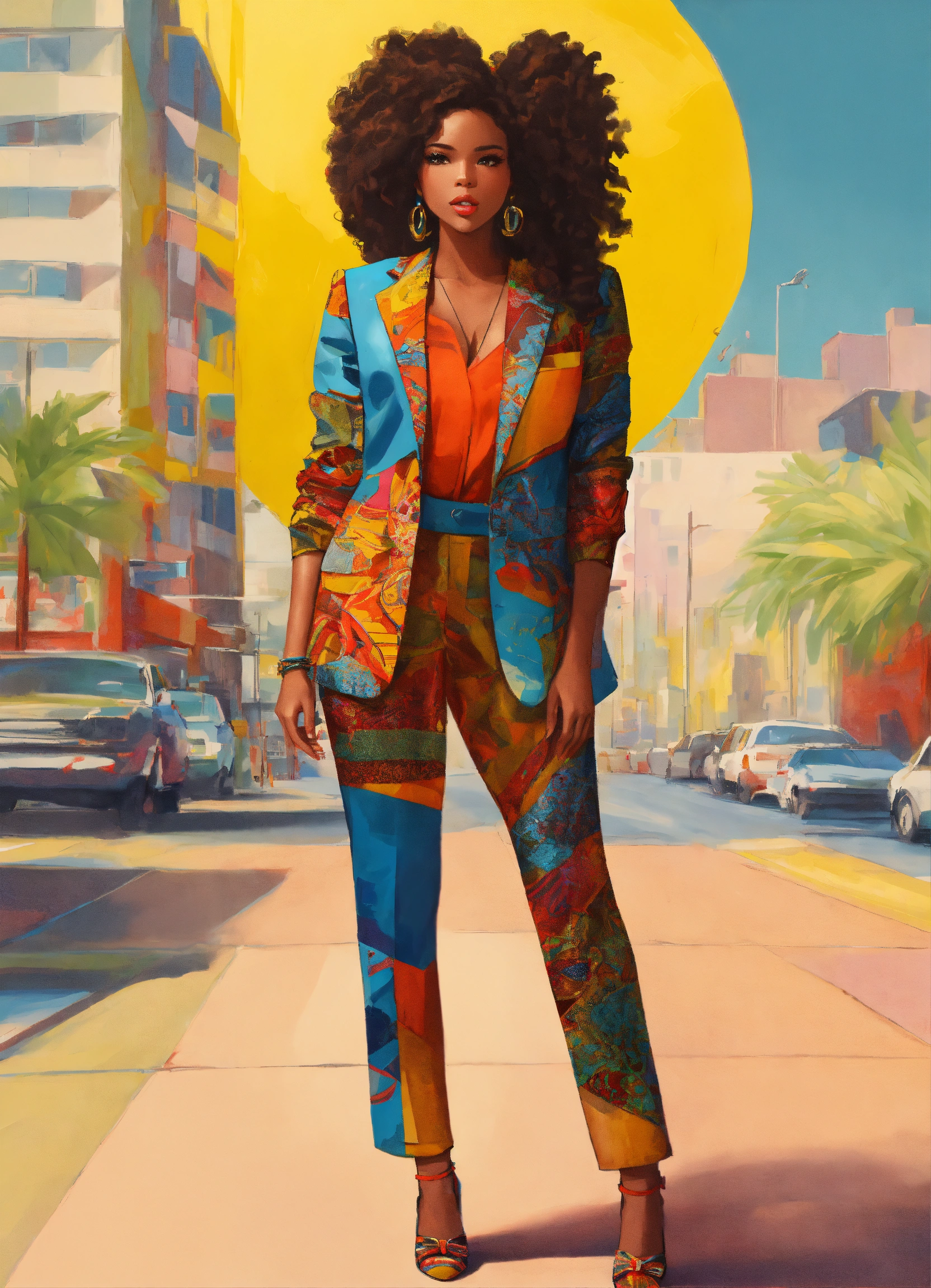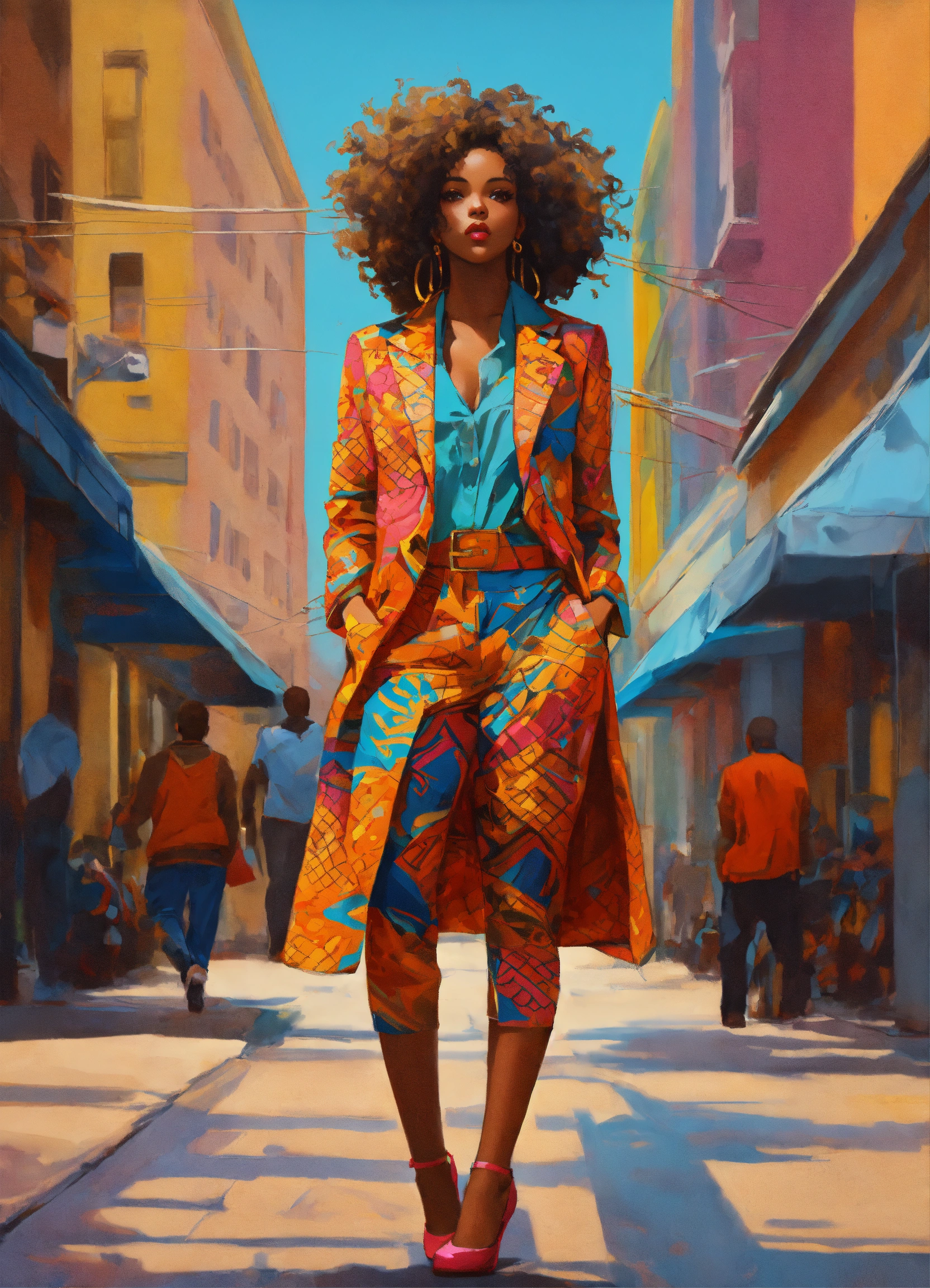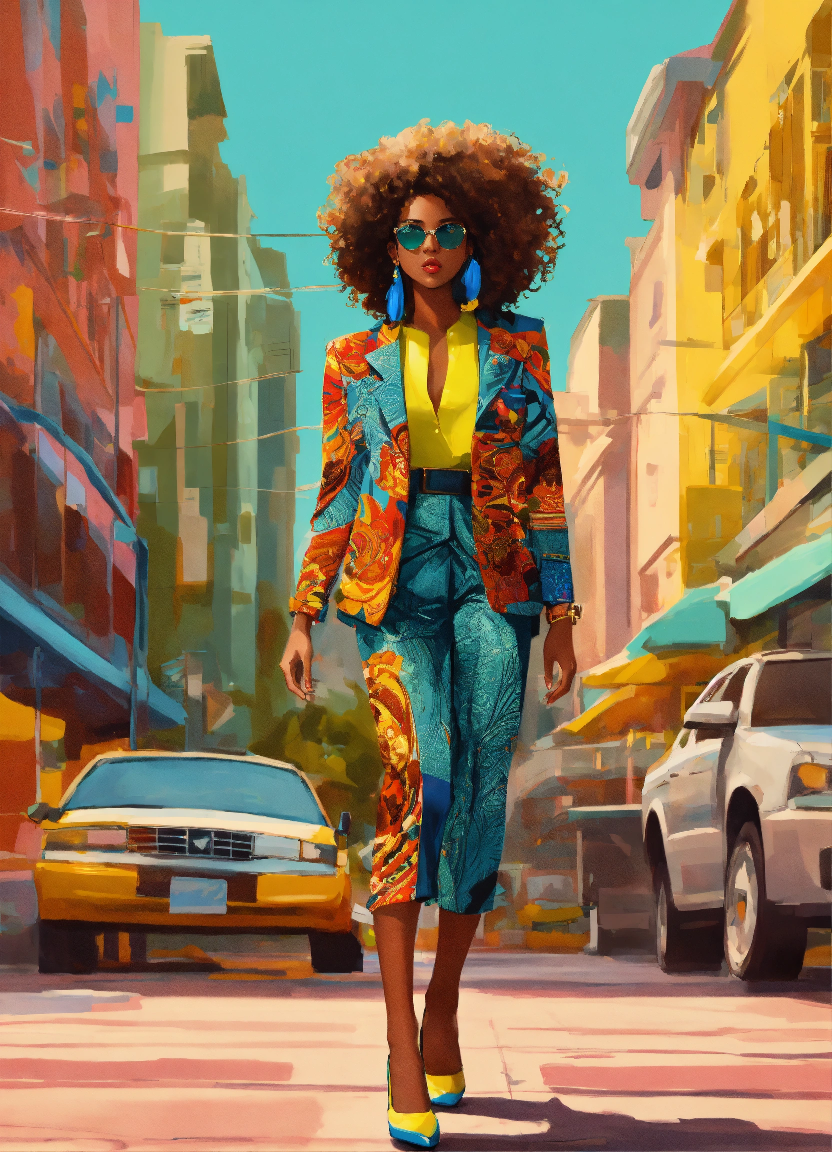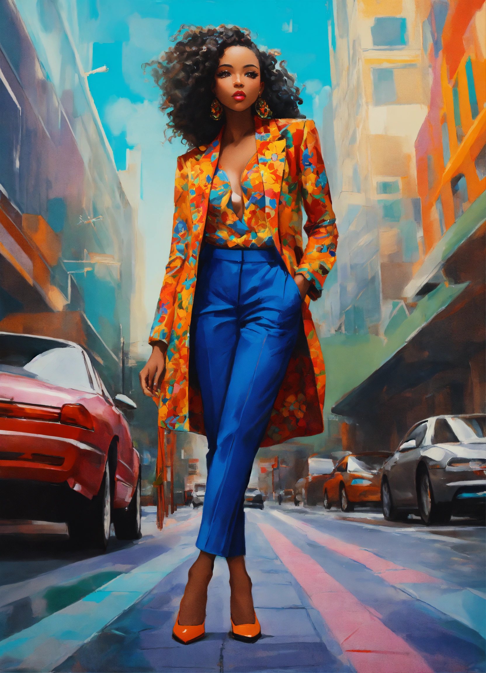Captivating full body standing pose of a light complexion african-american woman with long curls. the woman should exude a bold, eclectic, and modern fashion style. she is wearing a vibrant patterned suit with unique accessories and statement shoes. the artwork should be ultra hd, utilizing a color palette of vibrant and contrasting colors to create a visually dynamic composition. employ the digital painting technique to add intricate details and a sense of movement to the image, while maintaining a balanced and visually engaging composition. place the woman in an urban cityscape. --ar 916 --niji 5 --style scenic --s 1000