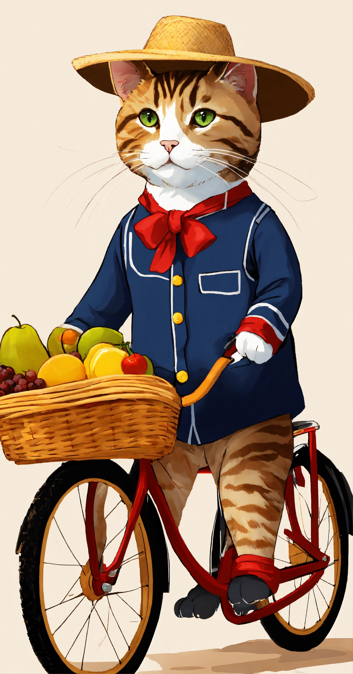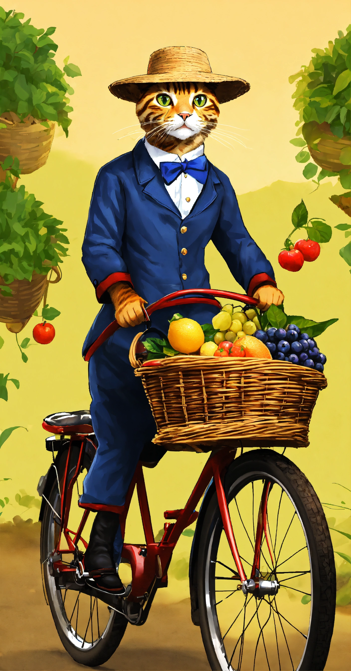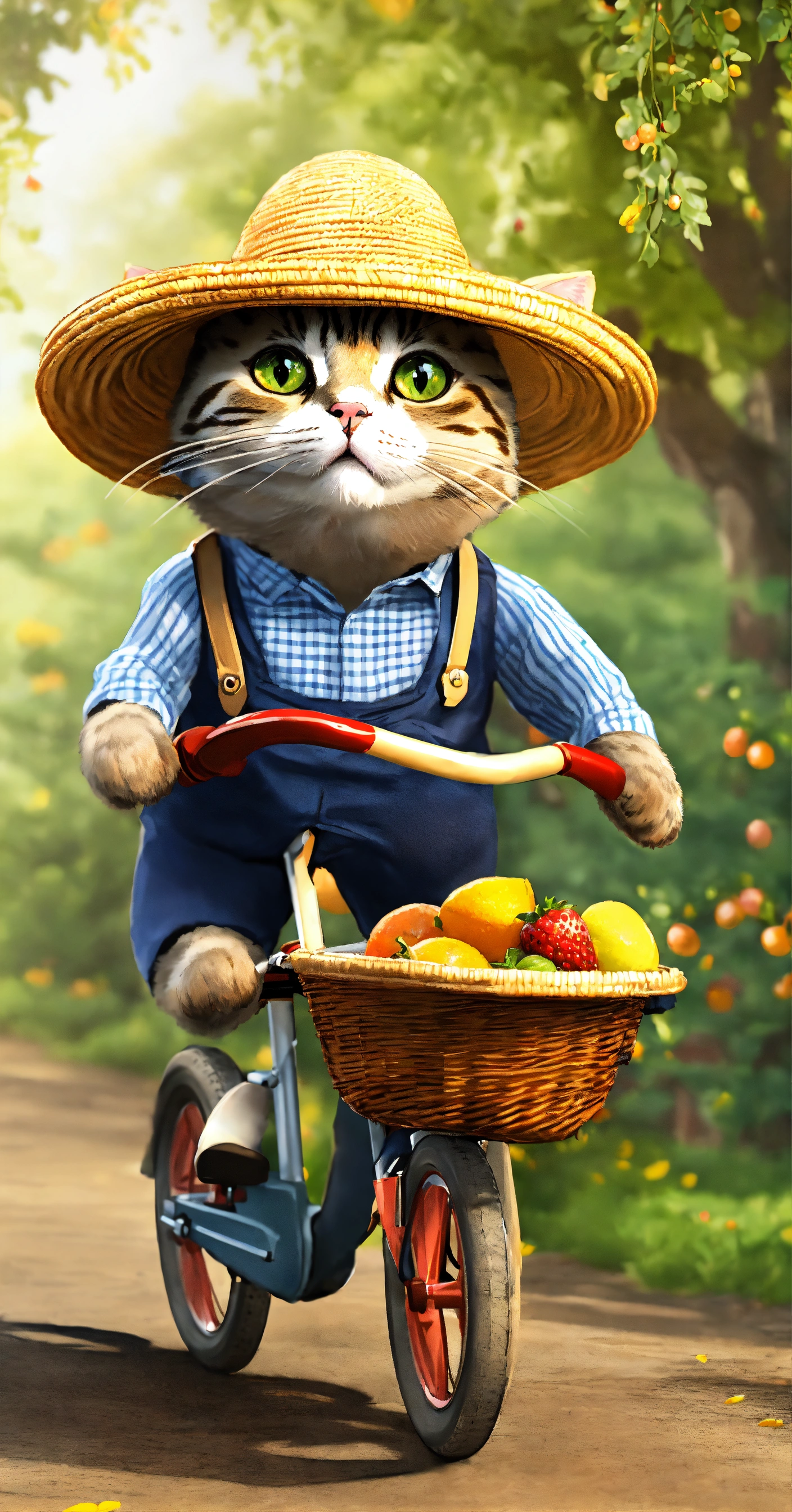 Generate an image of a cat dressed as a farmer, riding a bicycle with a straw hat, long-sleeved shirt, and carrying a basket of fruits.