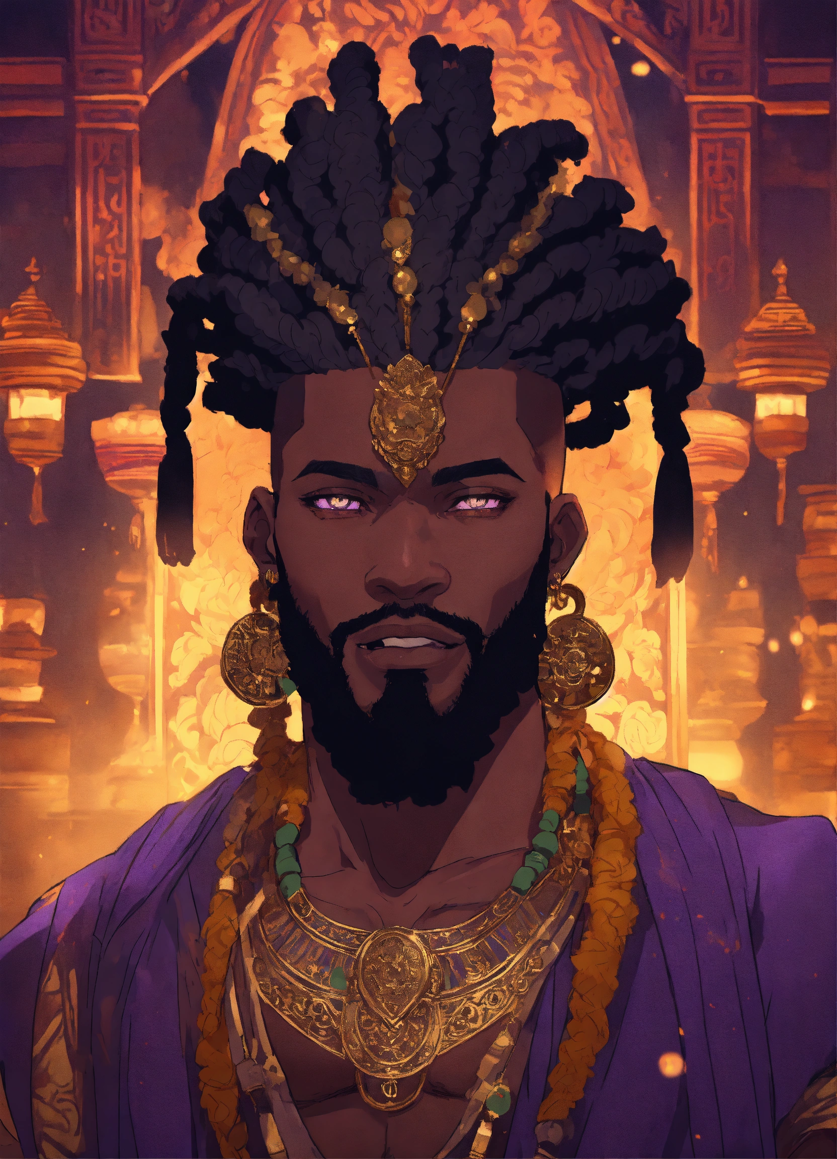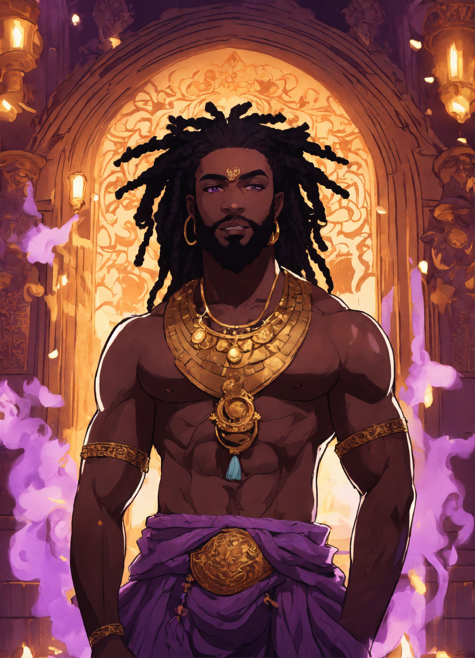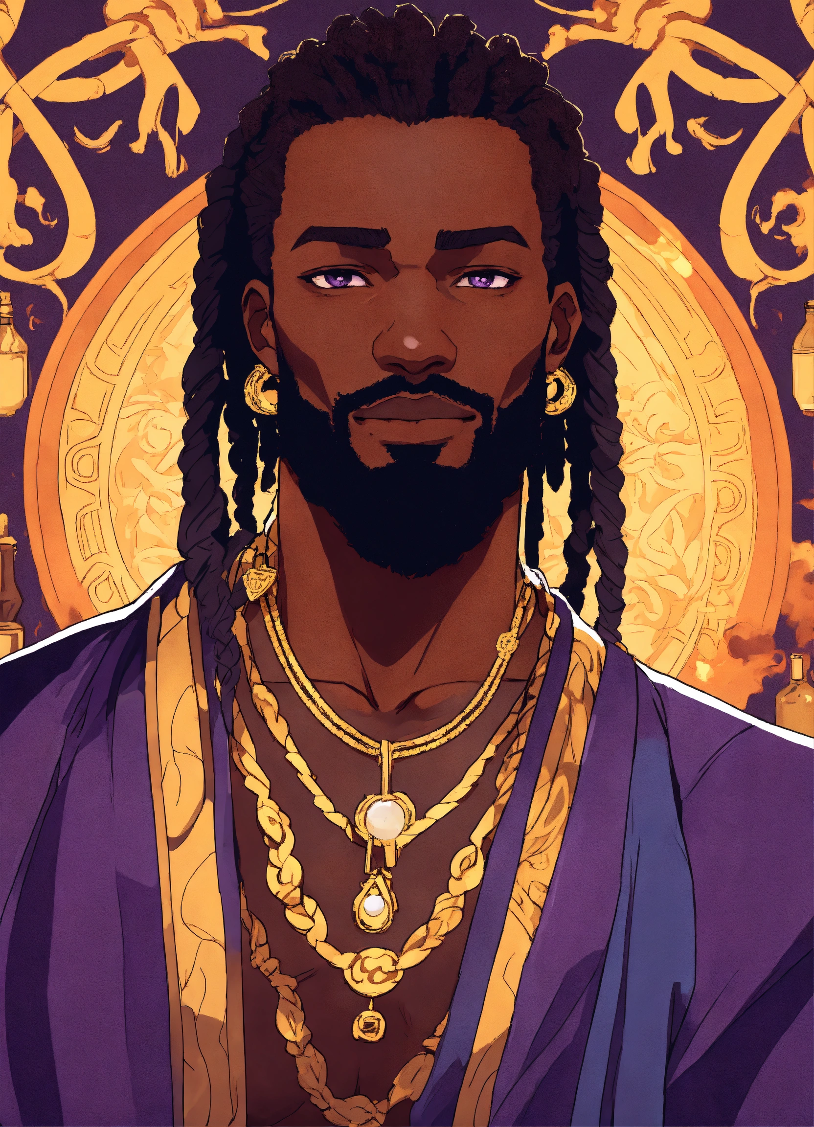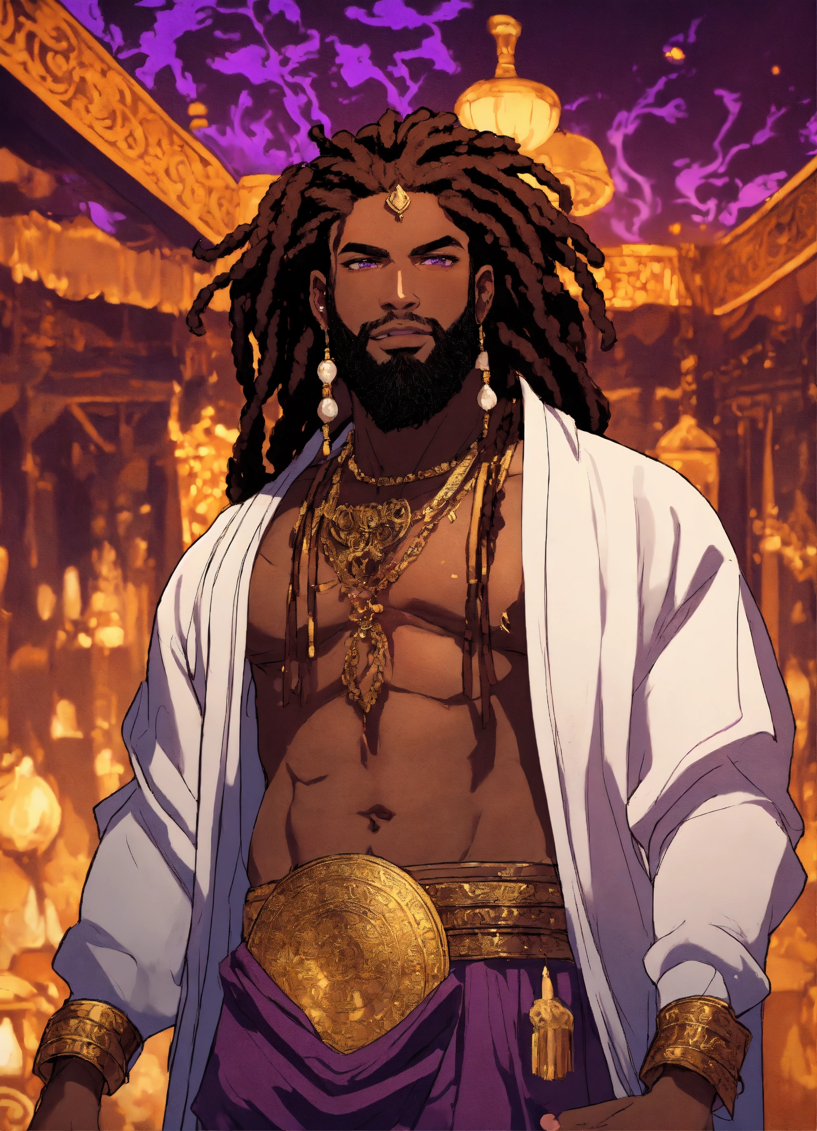 A dark-skinned black man with ornate dreadlocks piercing deep purple eyes broad shouldered muscular low cut beard devious smirk black, purple, gold, white color pallete surrounded by ghosts, parties, alcohol, smoking, and general merrymaking. anime artstyle, detailed, 9th century middle eastern attire