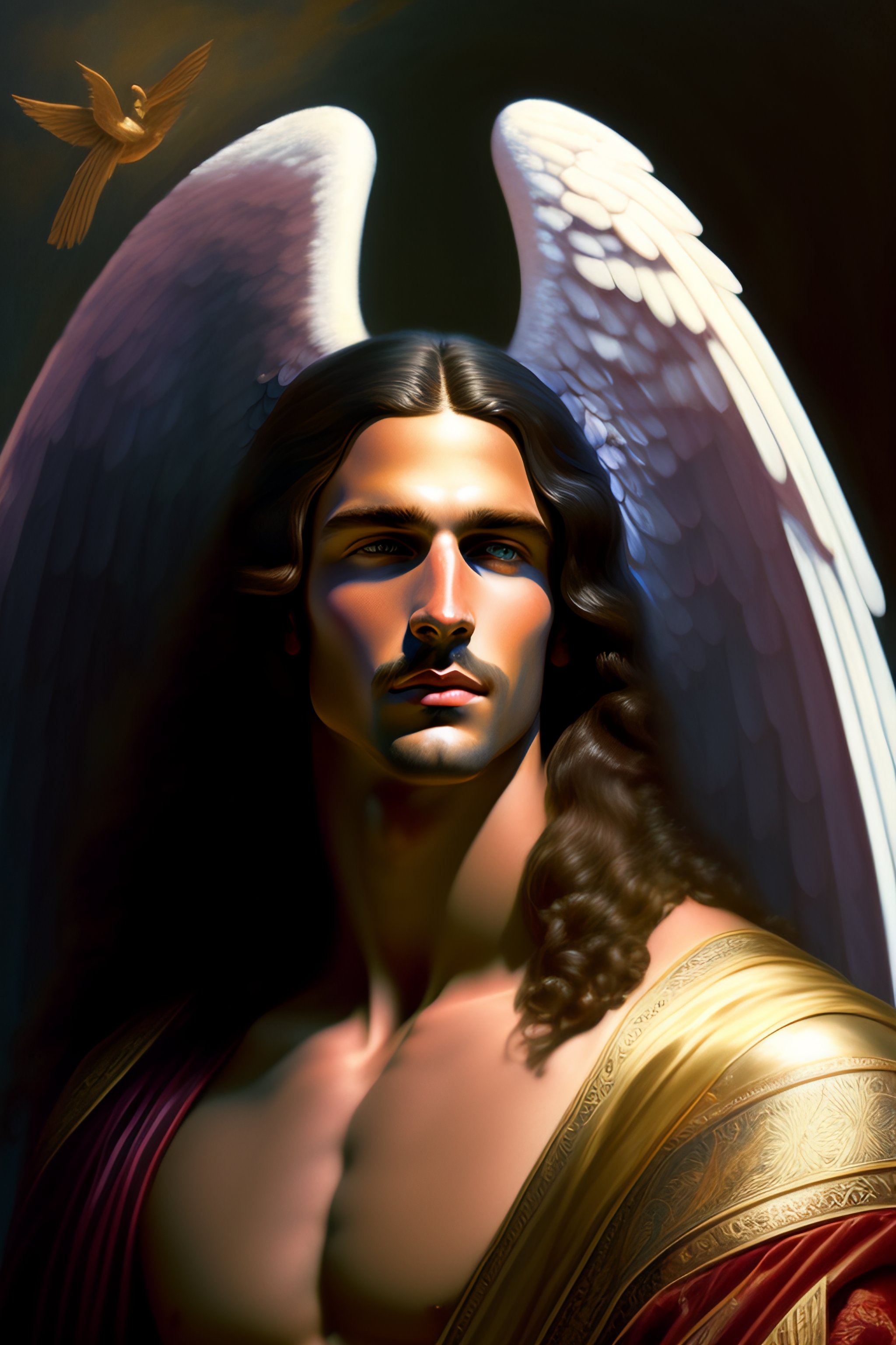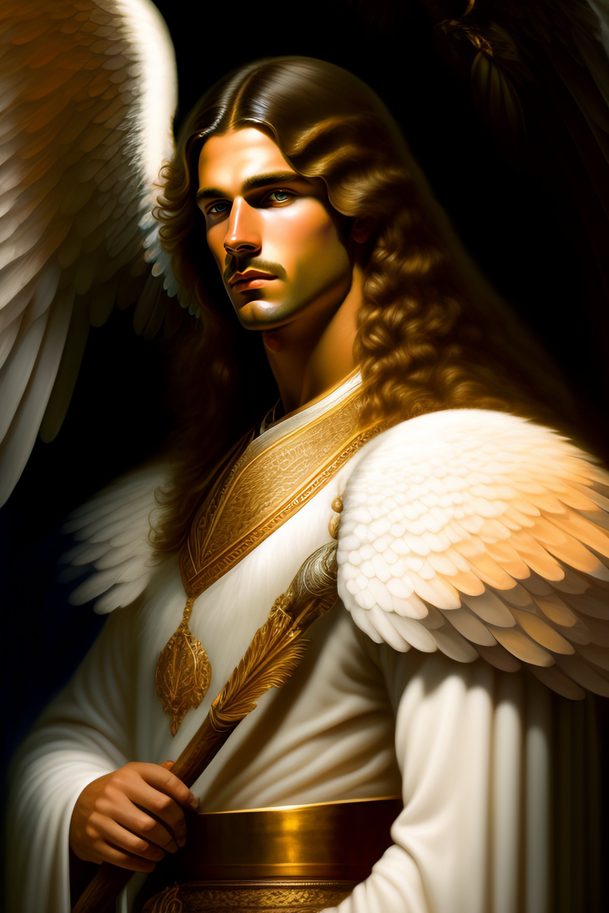 Portrait of a handsome male guardian angel, majestic, long hair, long wings, holding staff, fine art portrait painting, strong light