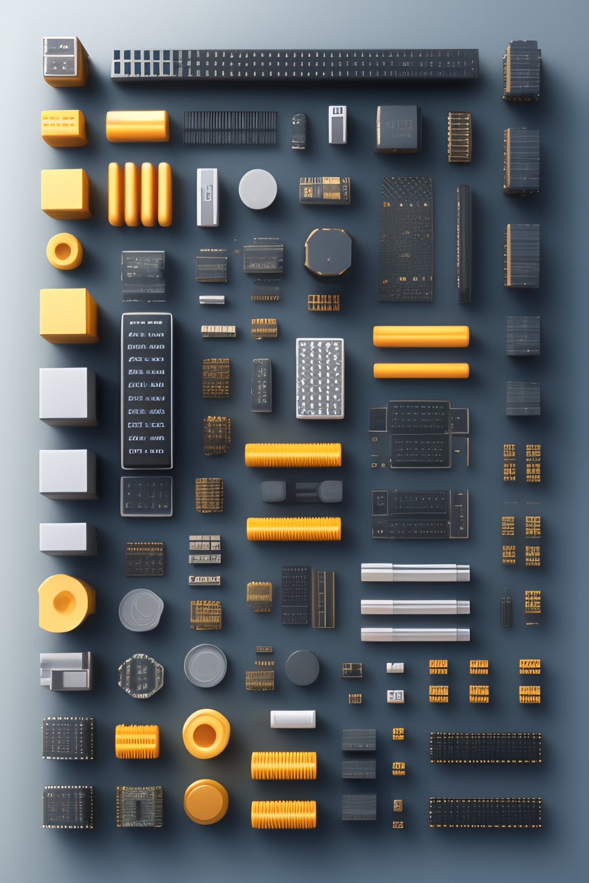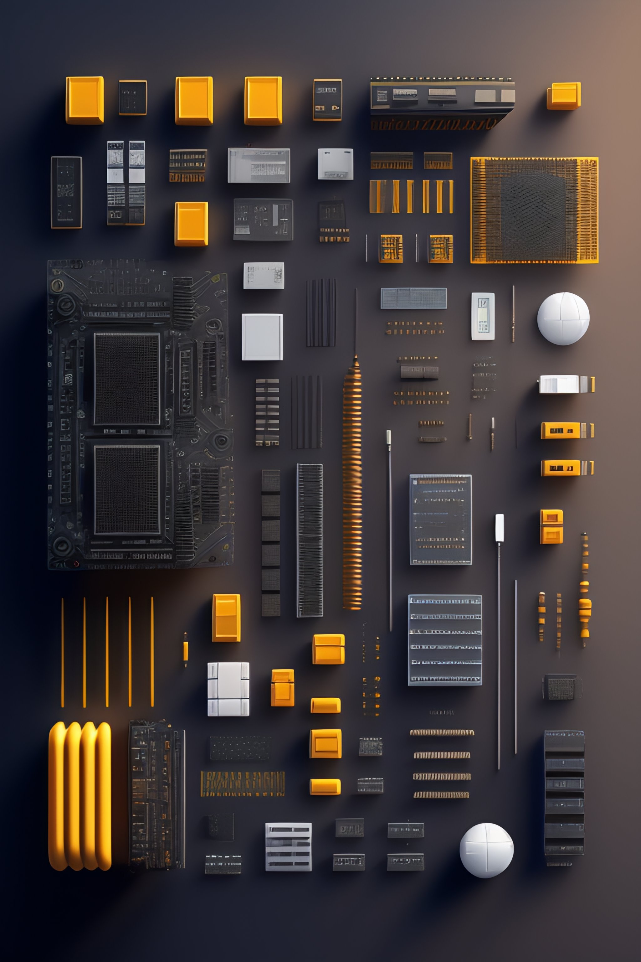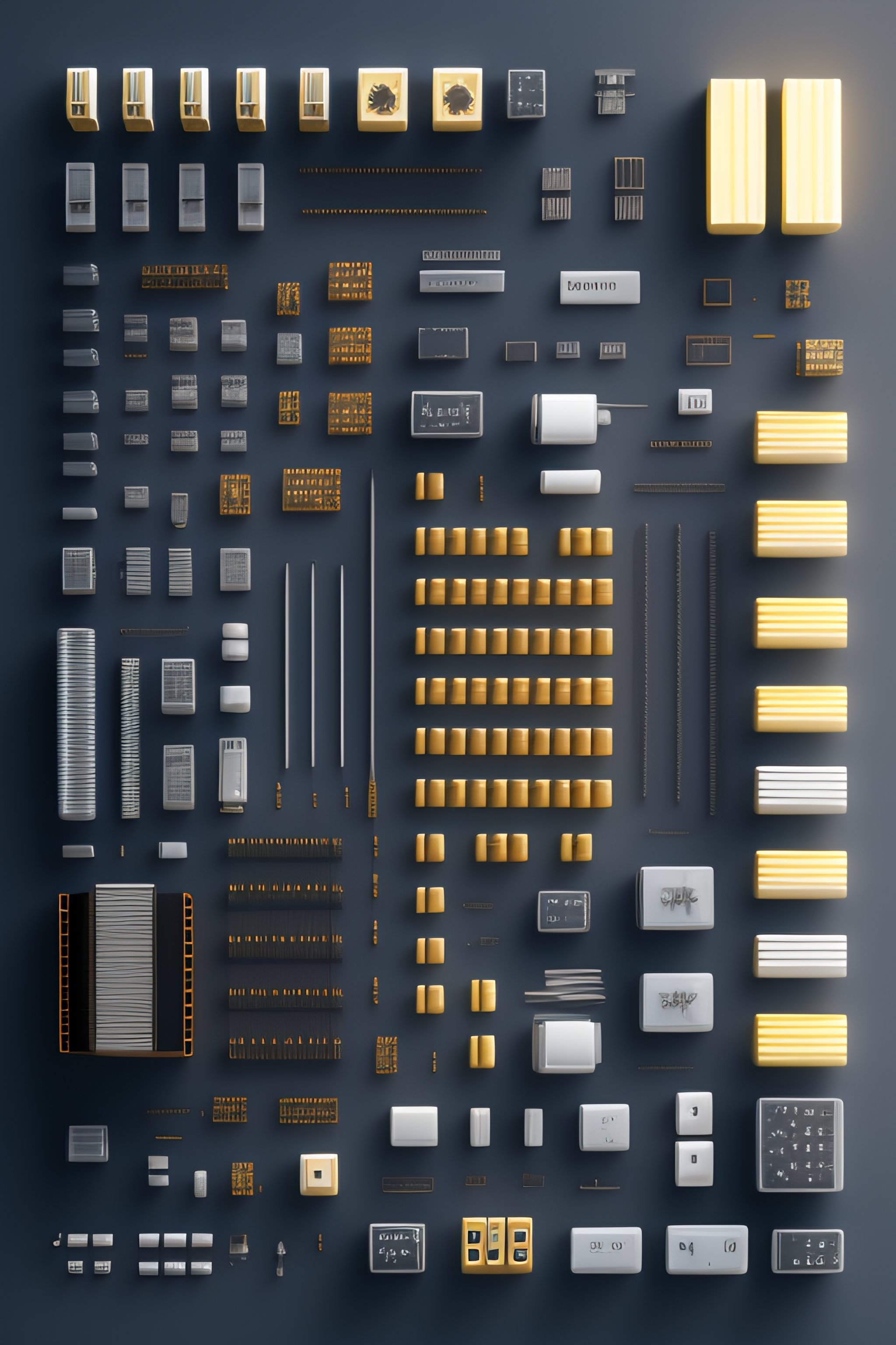 Electronic parts, knolling, knolling layout, deconstruction, highly detailed, depth, many parts, lumen render, 8k