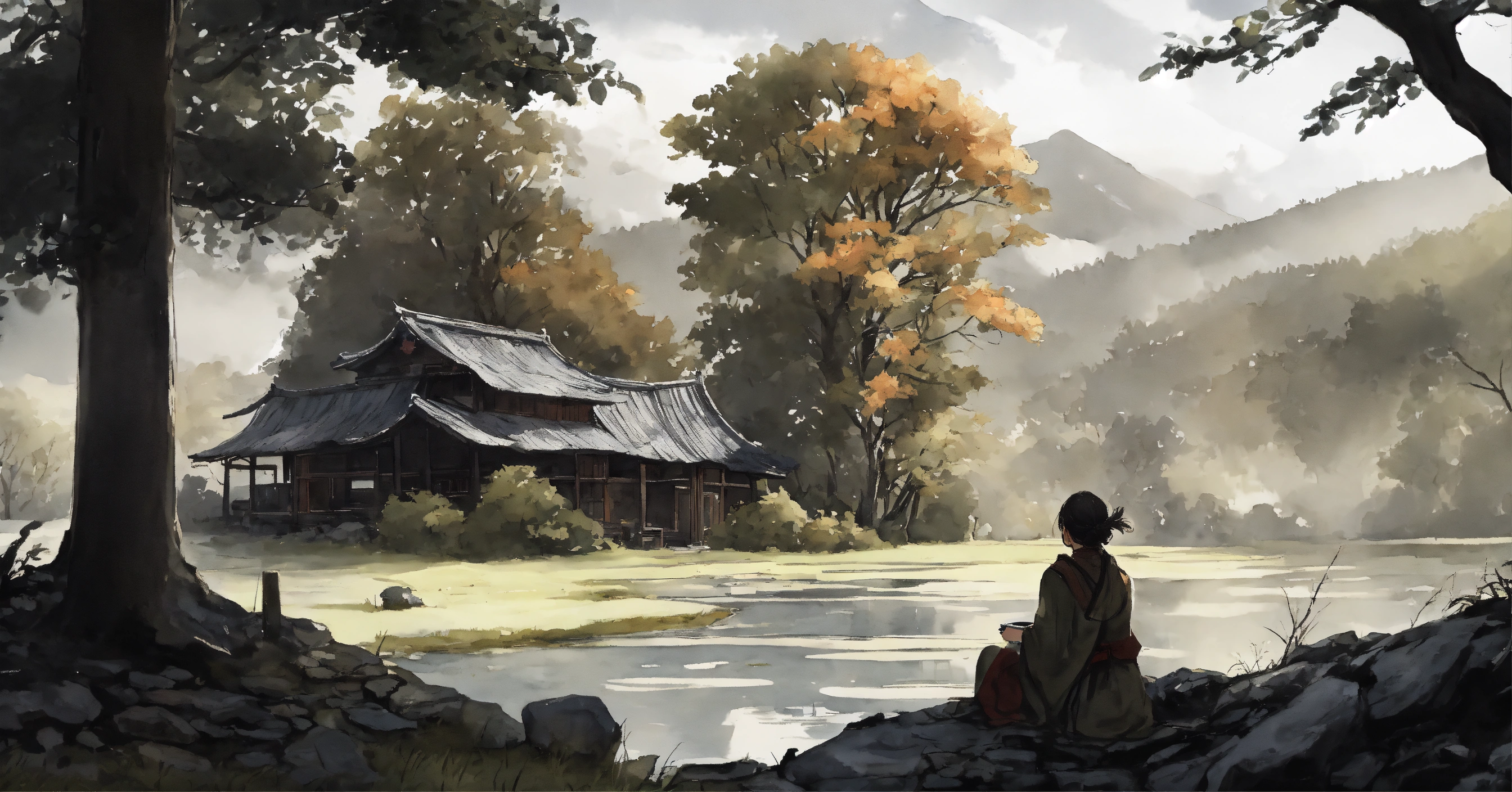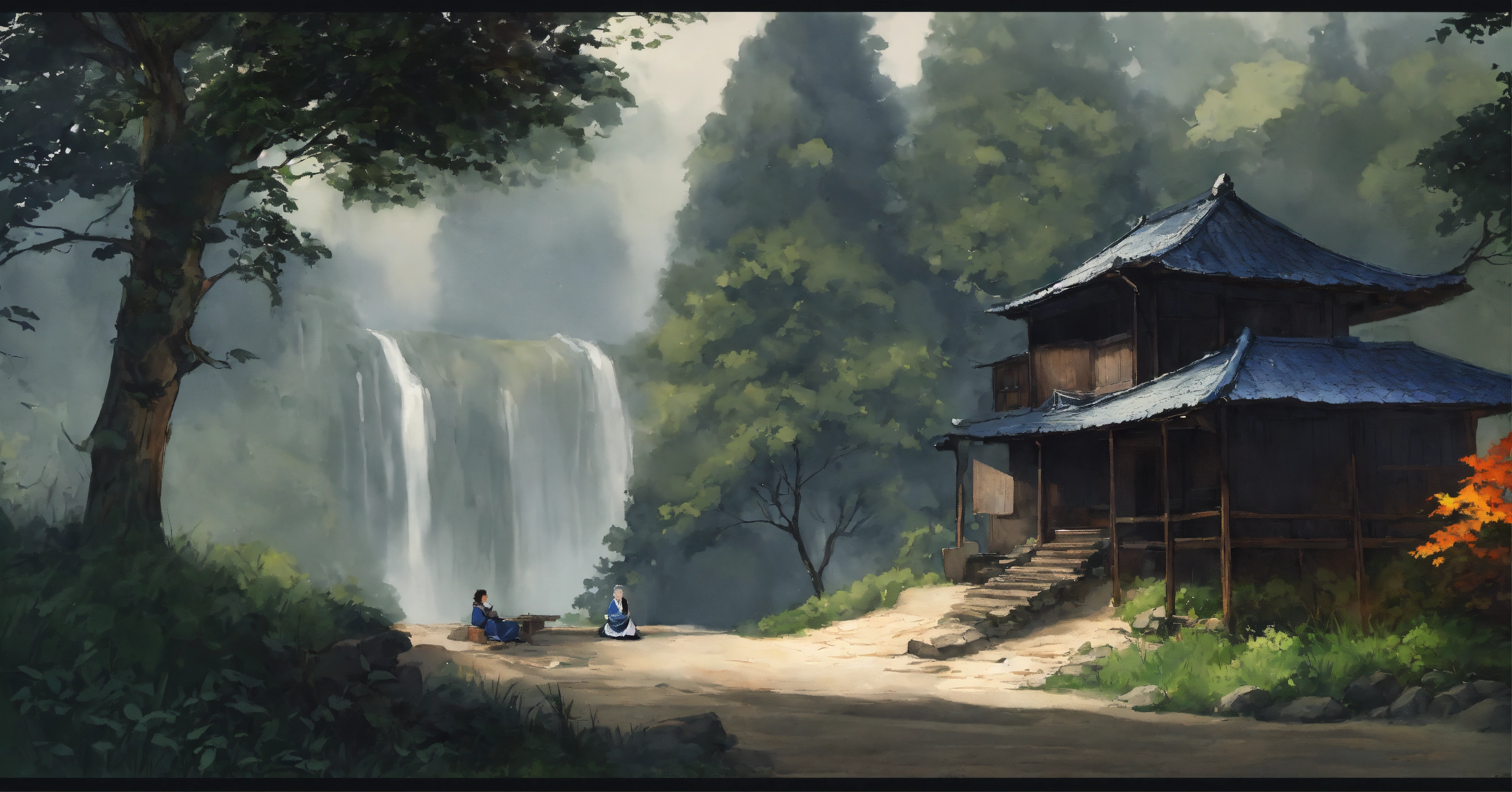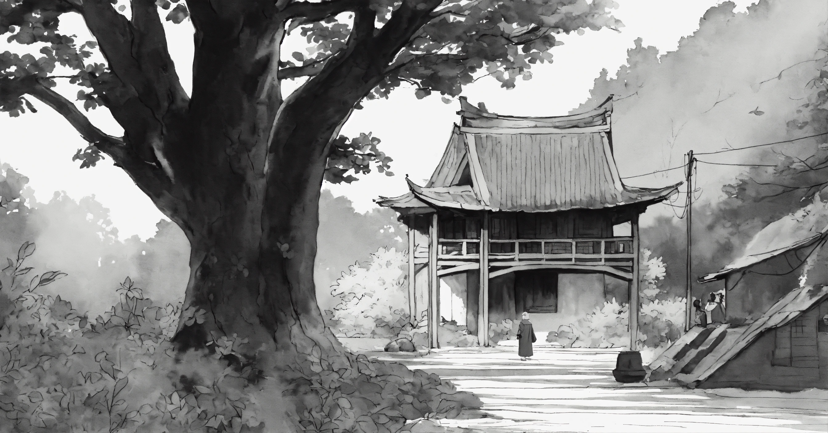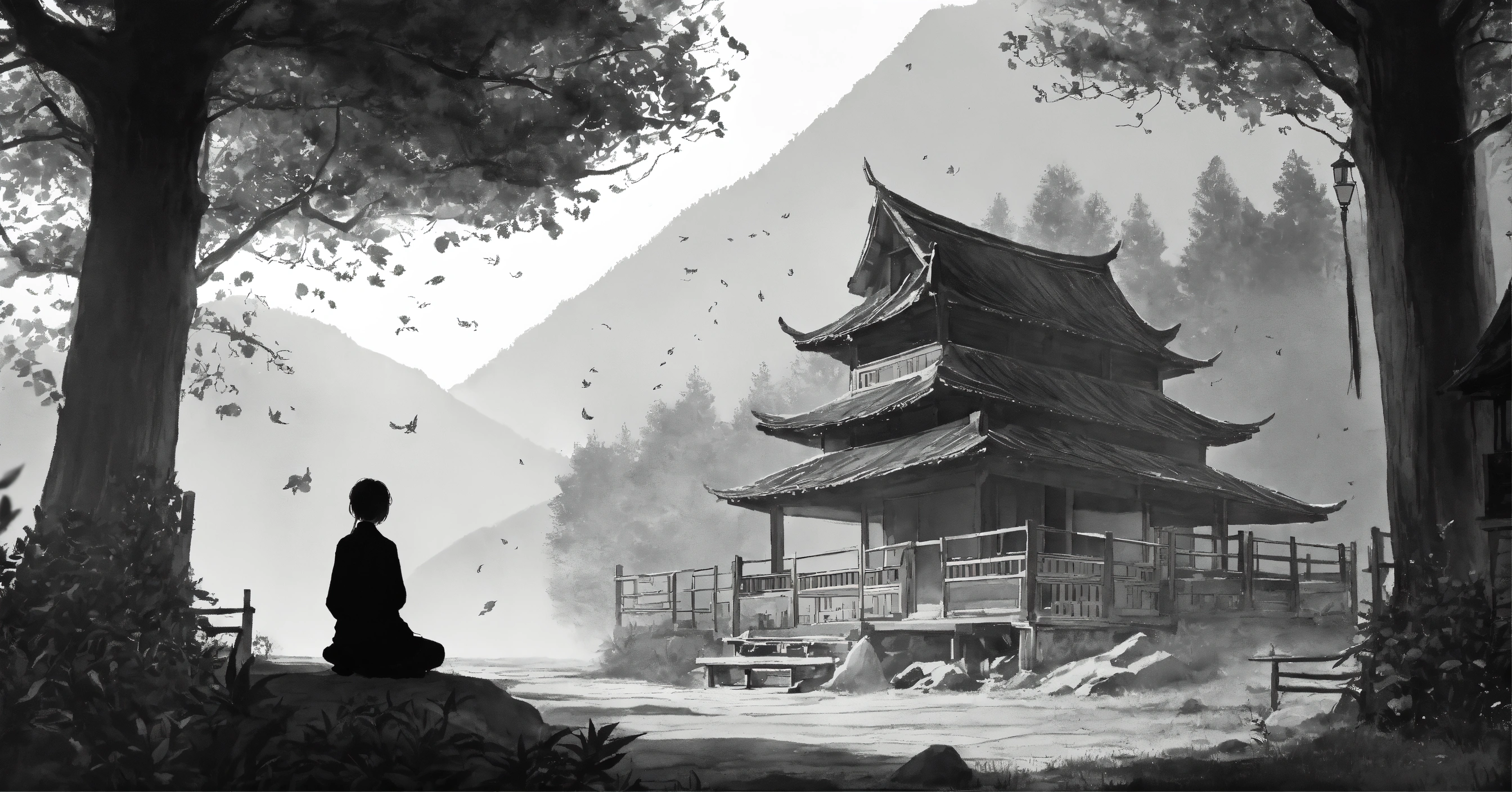 Create a black and white watercolor illustration capturing the essence of a story set in a picturesque village surrounded by vast forests. in the center, depict an old monk named palden sitting meditatively beneath a towering maple tree, its leaves brilliantly colored but shown in grayscale, some gently falling to the ground. nearby, a young girl named tsering stands, initially with a hint of sadness, but gradually shifting to a look of realization as she observes the leaves. the falling leaves should appear as if they're dancing in the wind, celebrating their cycle of life. the overall mood should be serene, emphasizing the beauty of change and the cycles of life. the background should hint at the expansive forest and the quaintness of the village. this image should evoke feelings of acceptance, the transient nature of life, and the beauty in endings and new beginnings.