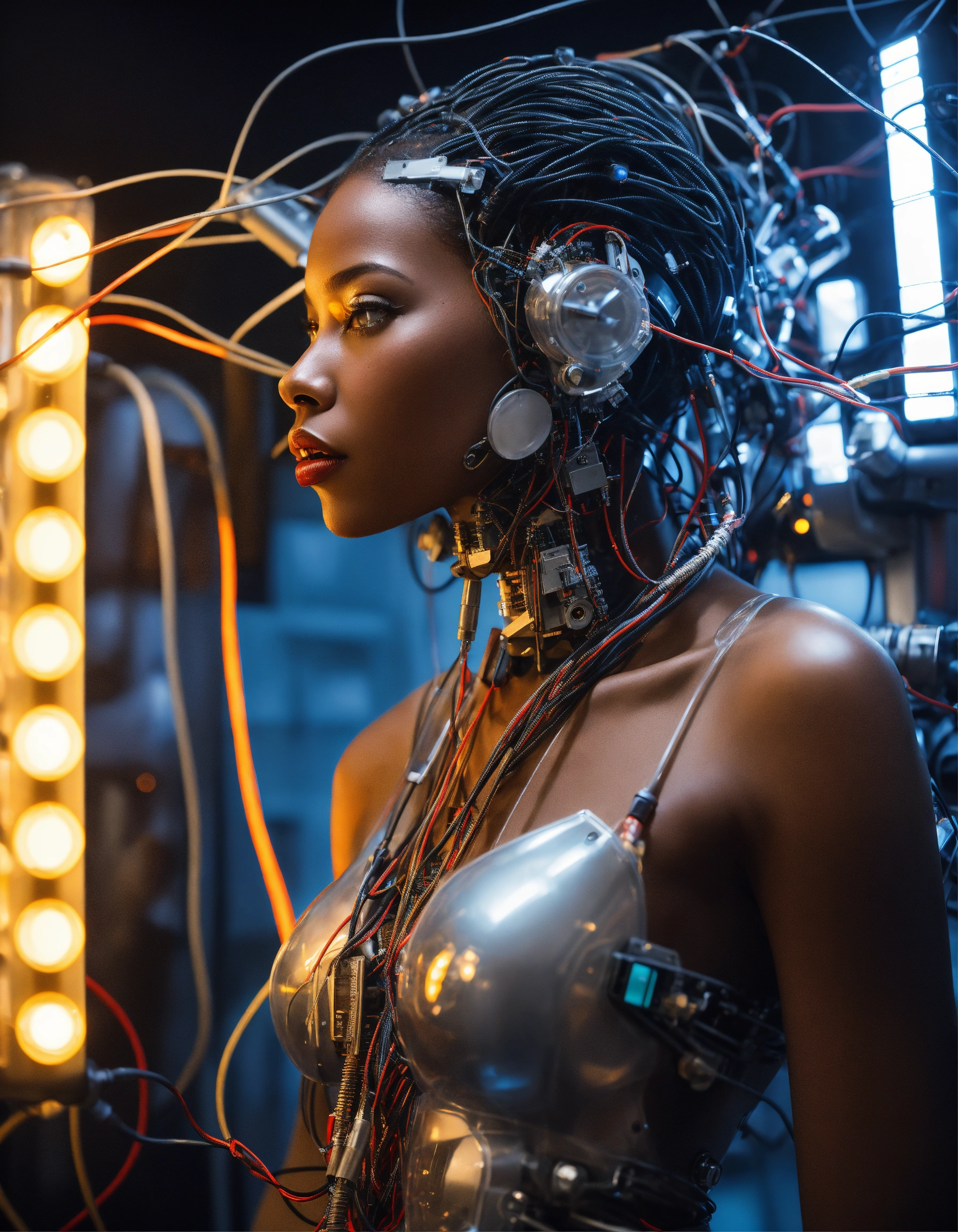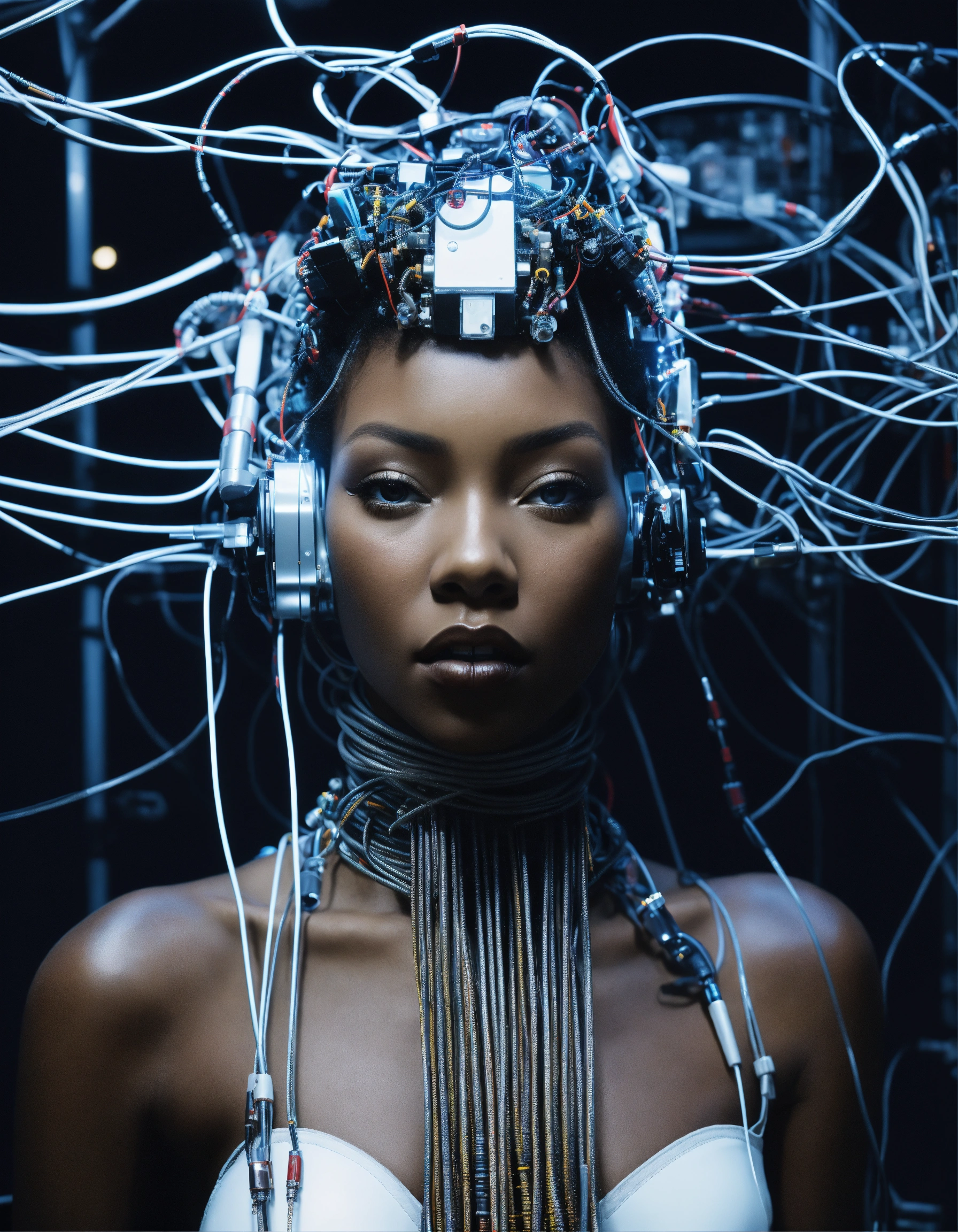 Portrait photography, in front of cables and wires, a black cyborg woman head, connected by cables, twisted cables and wires and led, an attractive transparent white plexiglass body punk plc robots with silver motor head, with ray guns, 80 degree view, art by sergio lopez, natalie shau, james jean and salvador dali