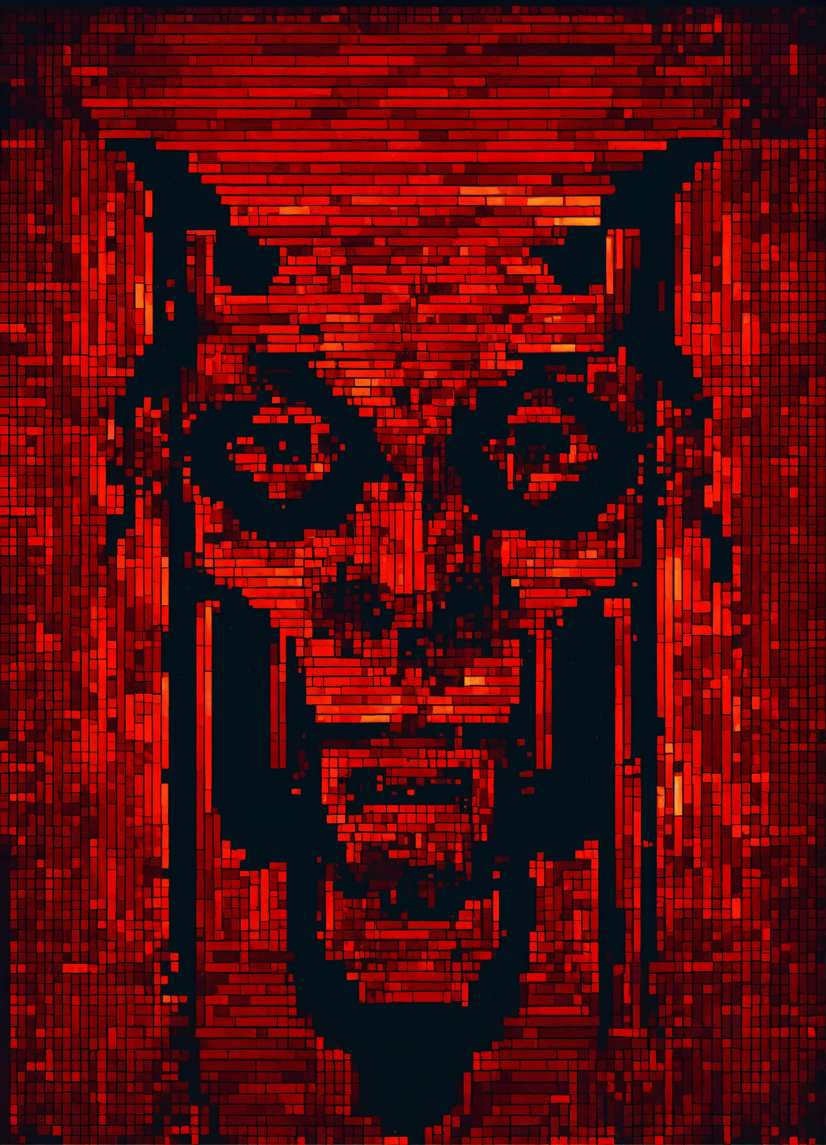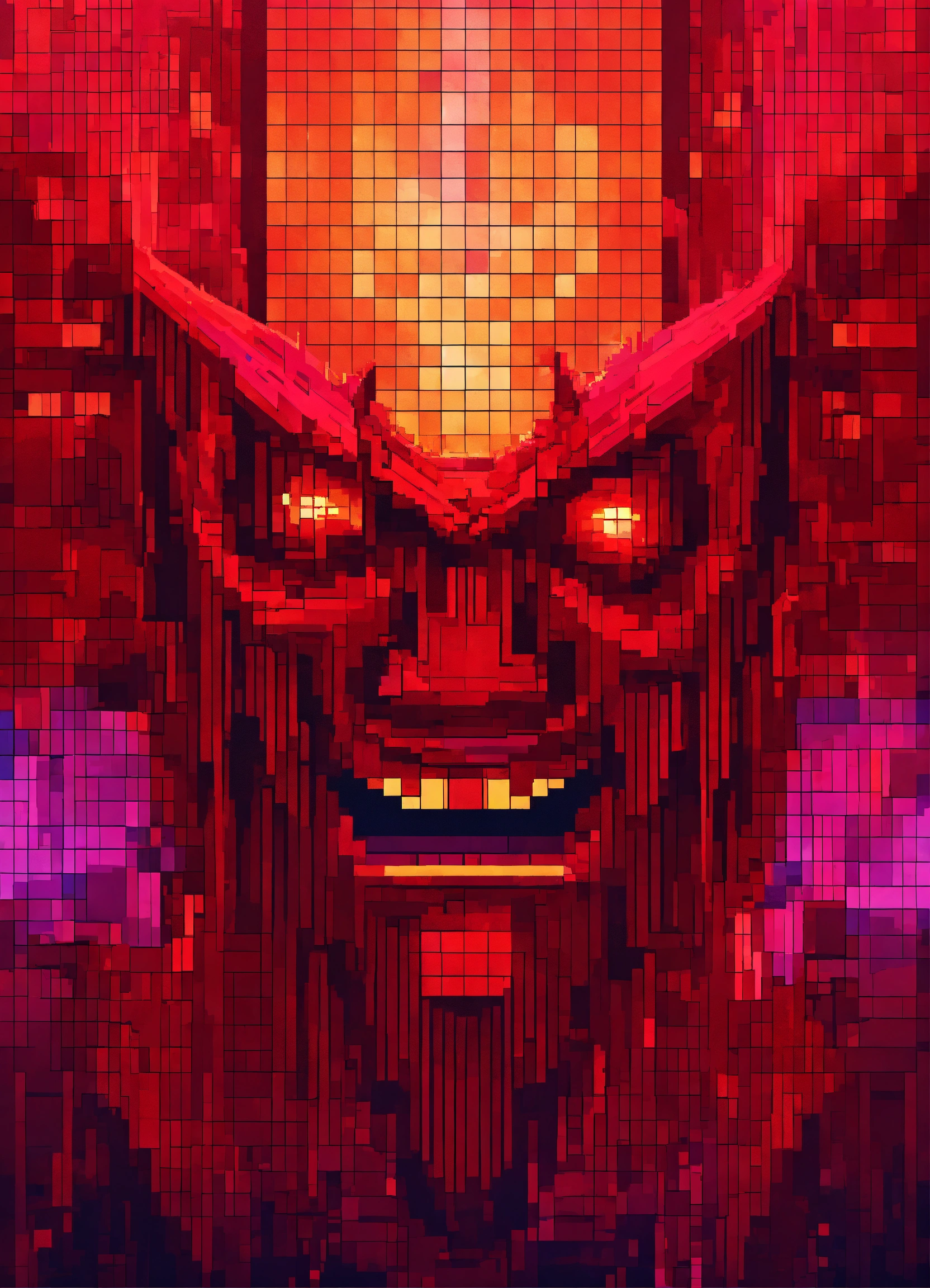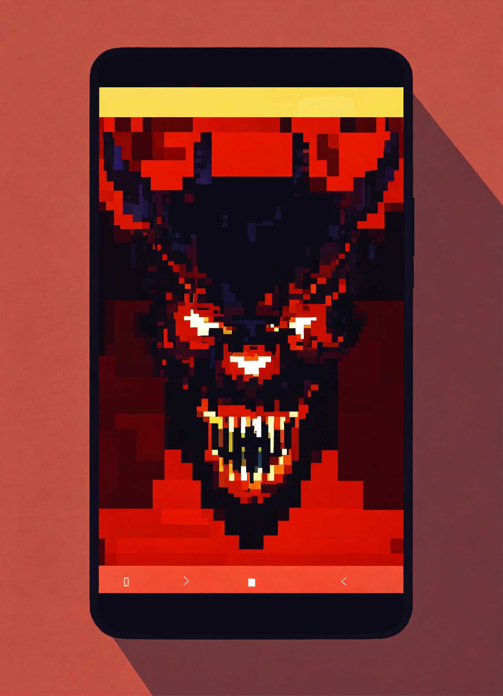 Satan half into upside down into smart phone screen weeping verry abstract pixel style